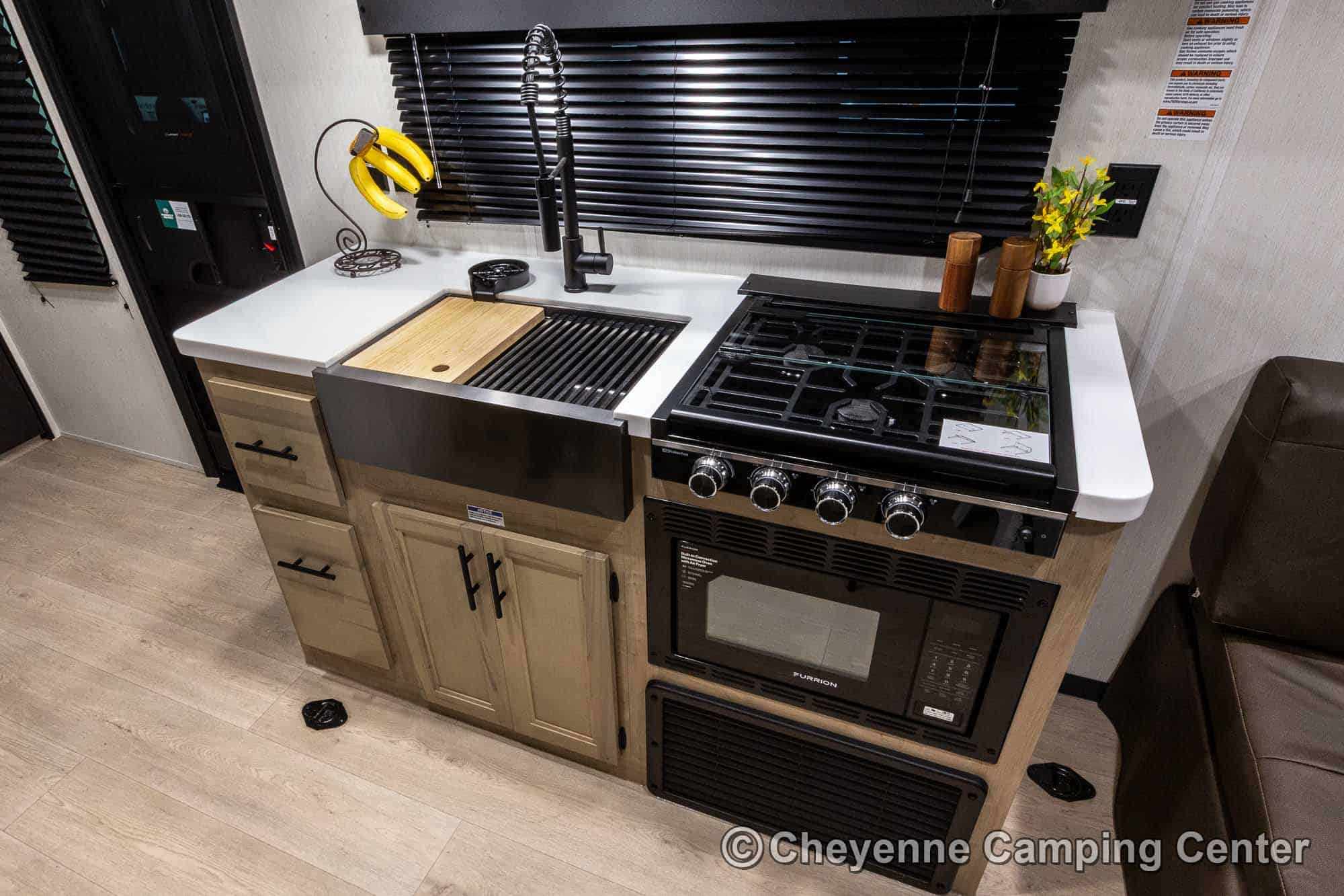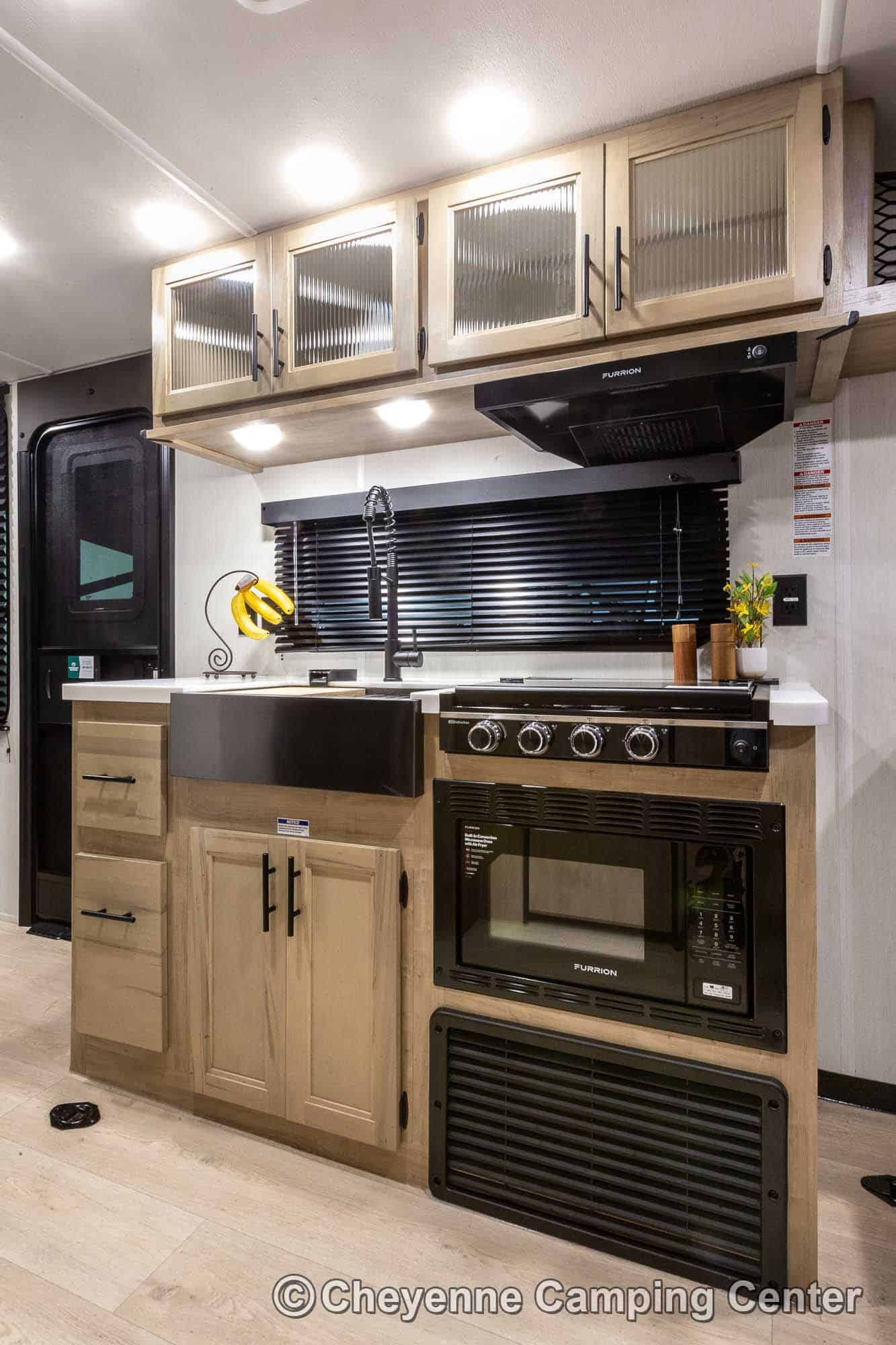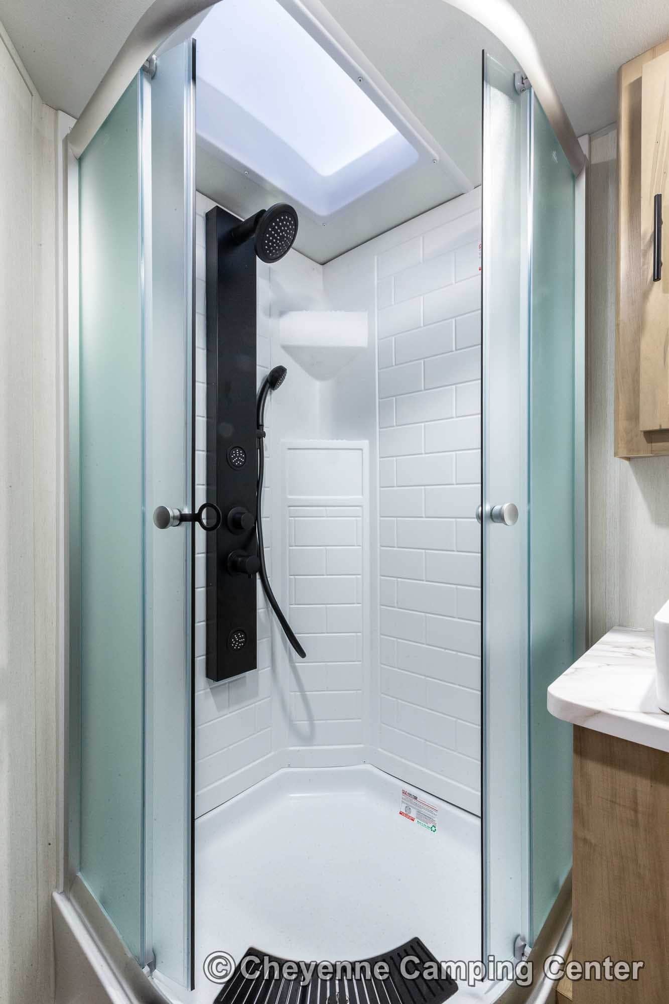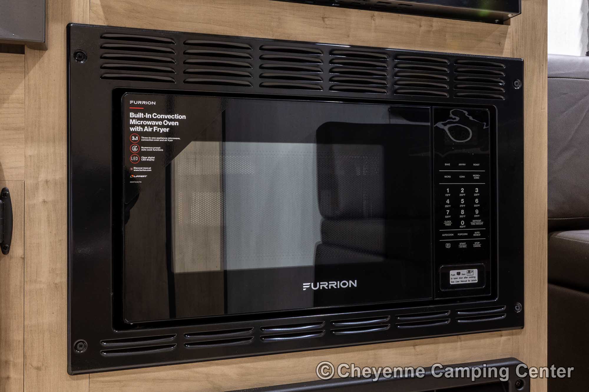 Inside, you’ll find pleated window shades, a microwave/convection oven with air fryer, a large pantry, 10 cu. ft. refrigerator, and a full bath with shower, foot-flush toilet, and premium vent fan. It’s also equipped with a Bluetooth receiver and TV hookups and comes with a one-year manufacturer’s warranty and one year of complimentary roadside assistance.