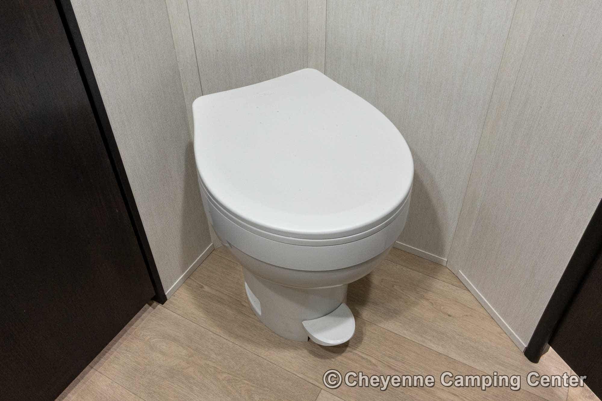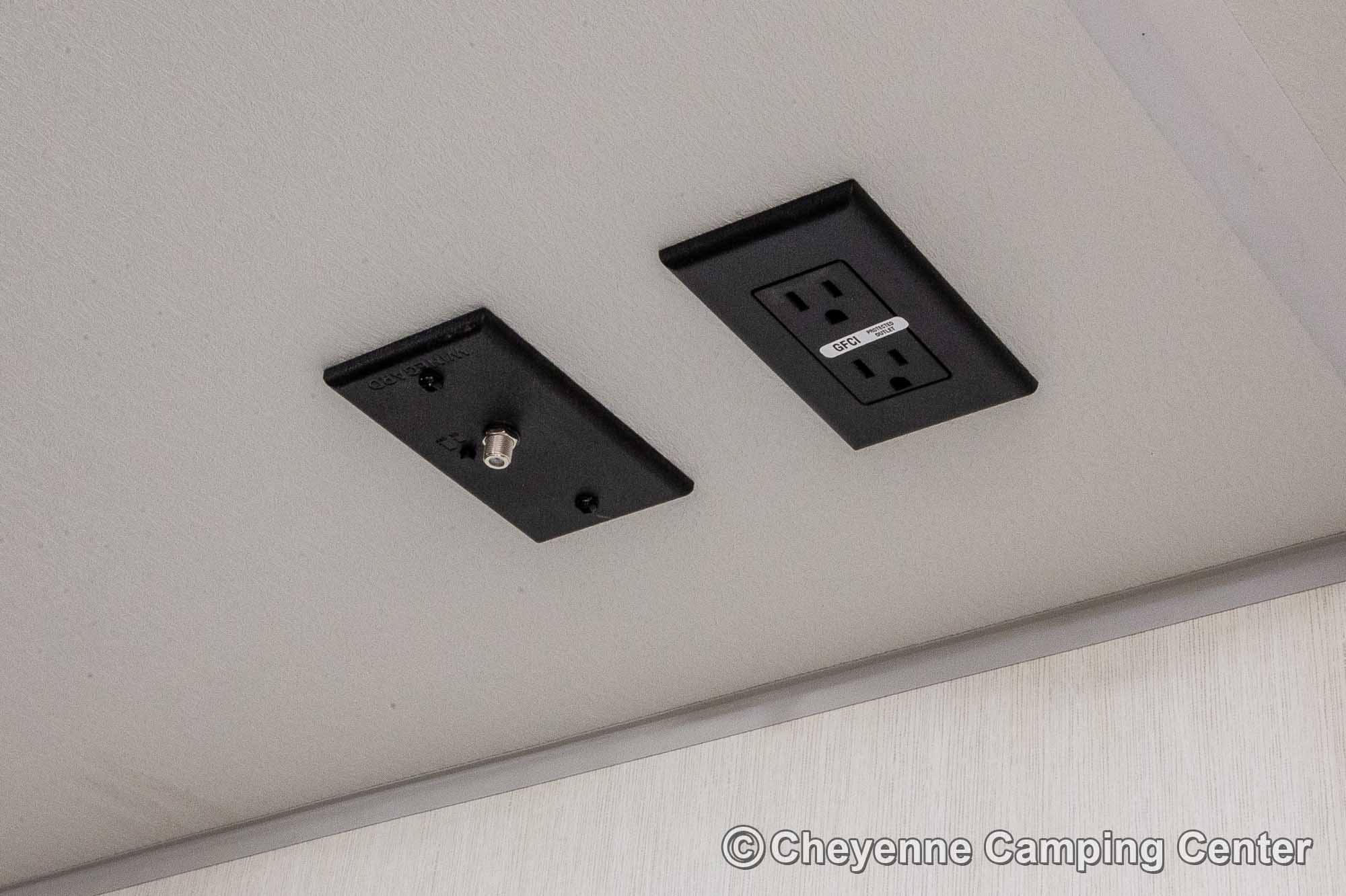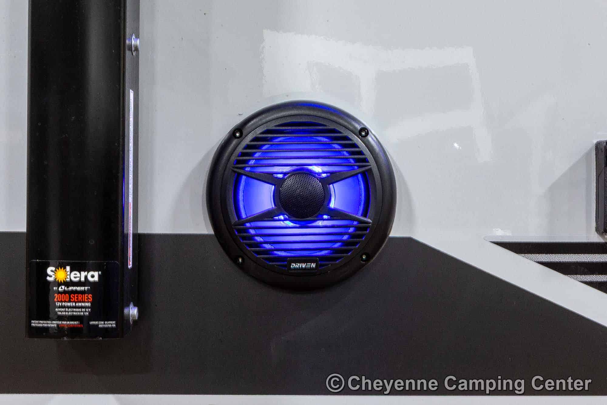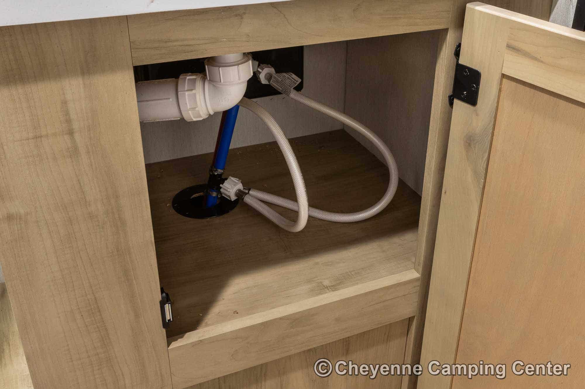 Inside, you’ll find pleated window shades, a microwave/convection oven with air fryer, a large pantry, 10 cu. ft. refrigerator, and a full bath with shower, foot-flush toilet, and premium vent fan. It’s also equipped with a Bluetooth receiver and TV hookups and comes with a one-year manufacturer’s warranty and one year of complimentary roadside assistance.