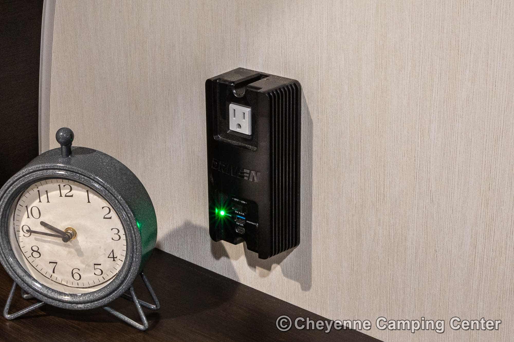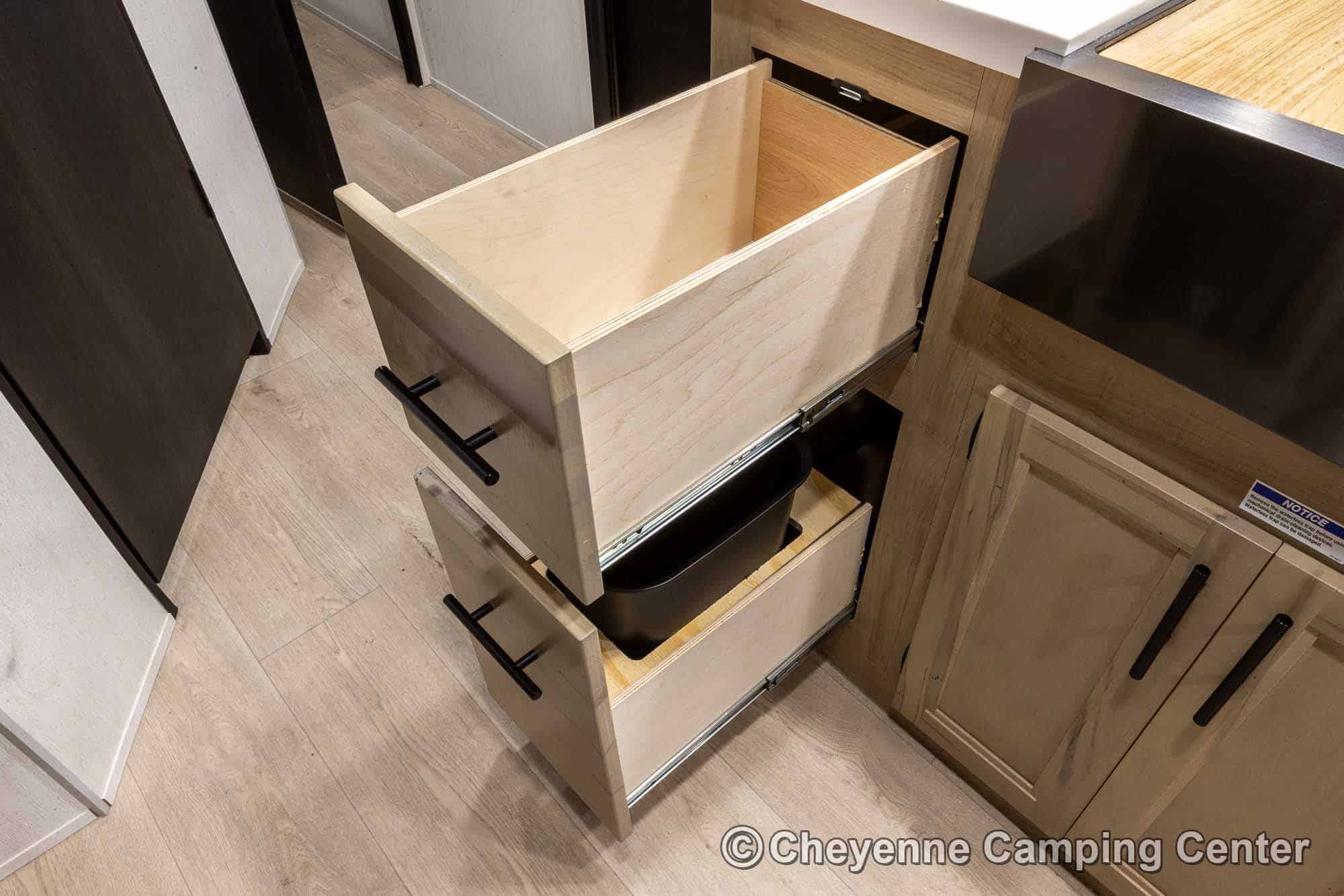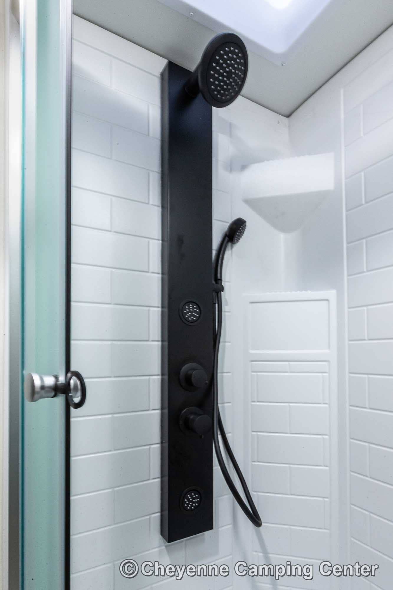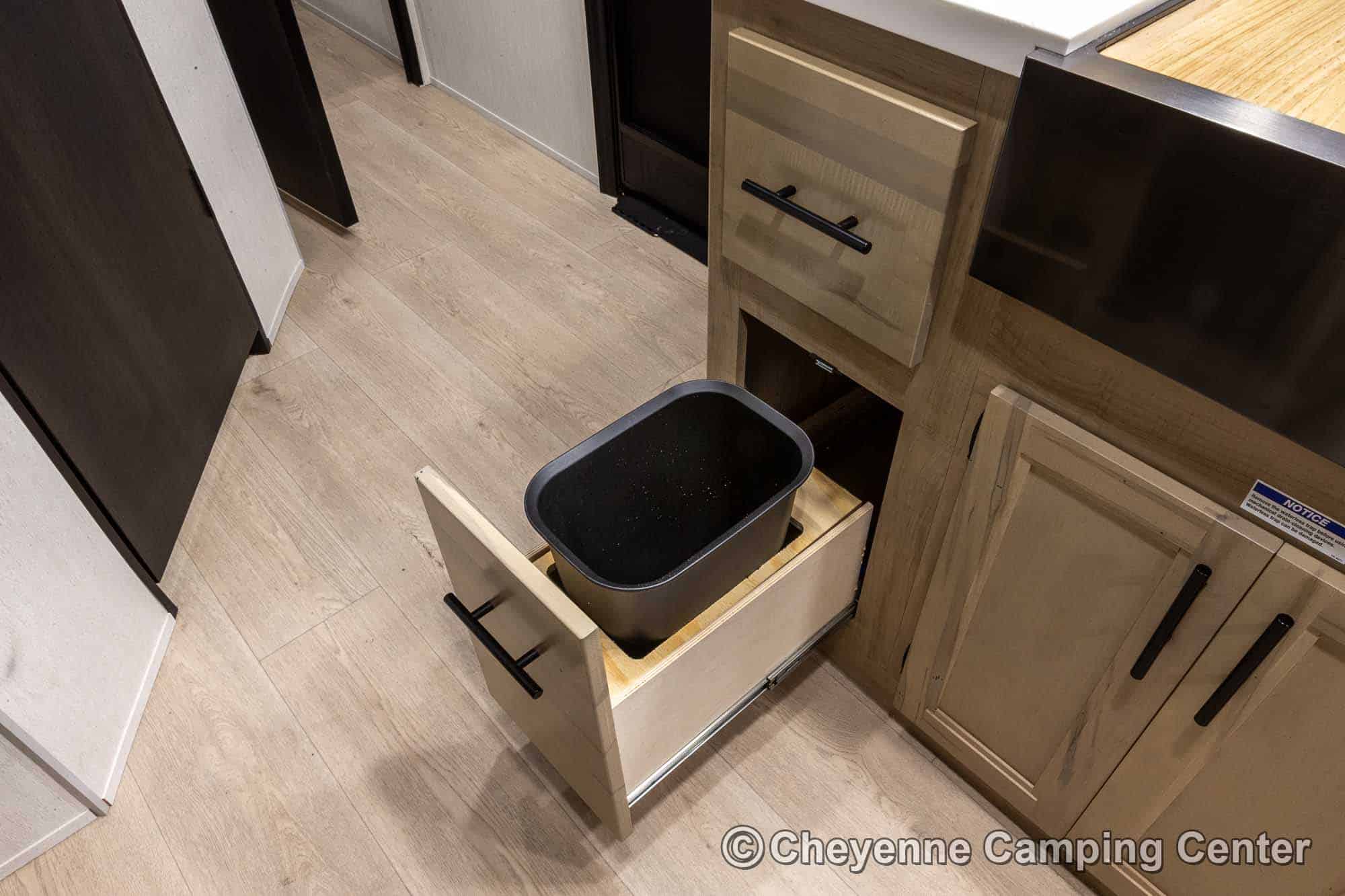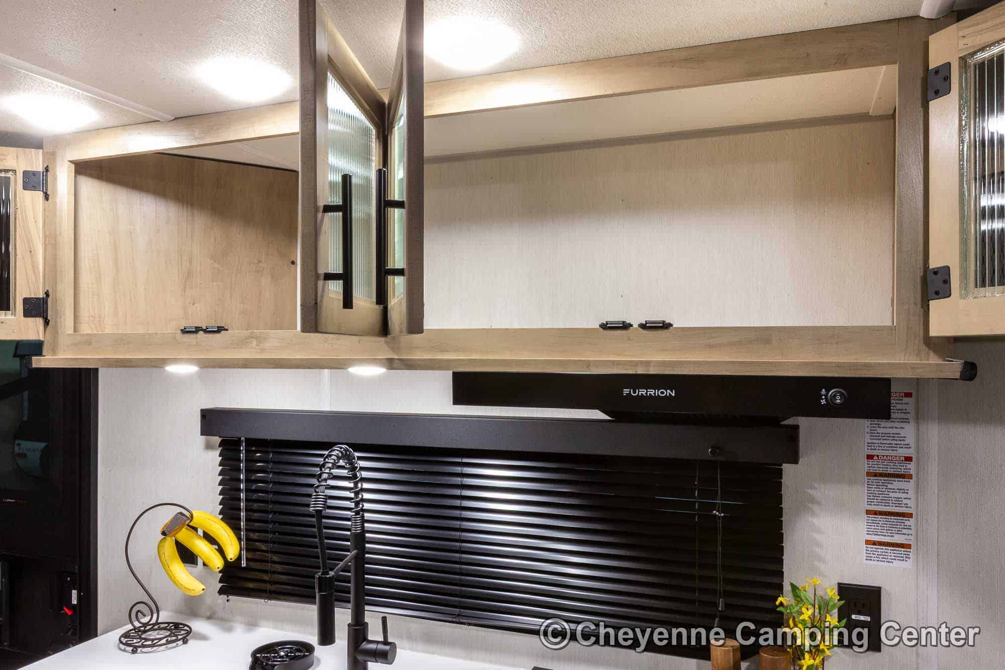 Inside, you’ll find pleated window shades, a microwave/convection oven with air fryer, a large pantry, 10 cu. ft. refrigerator, and a full bath with shower, foot-flush toilet, and premium vent fan. It’s also equipped with a Bluetooth receiver and TV hookups and comes with a one-year manufacturer’s warranty and one year of complimentary roadside assistance.