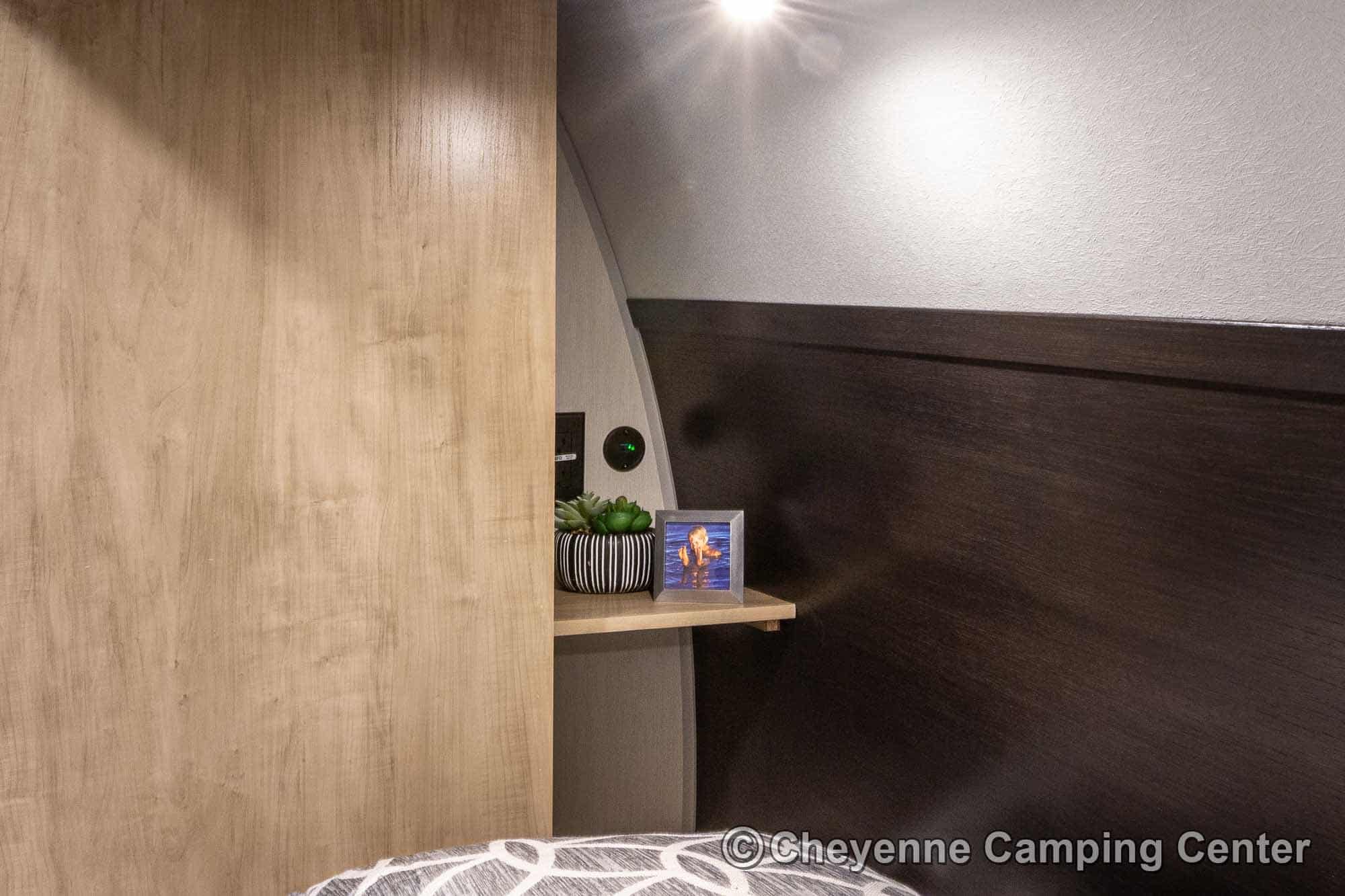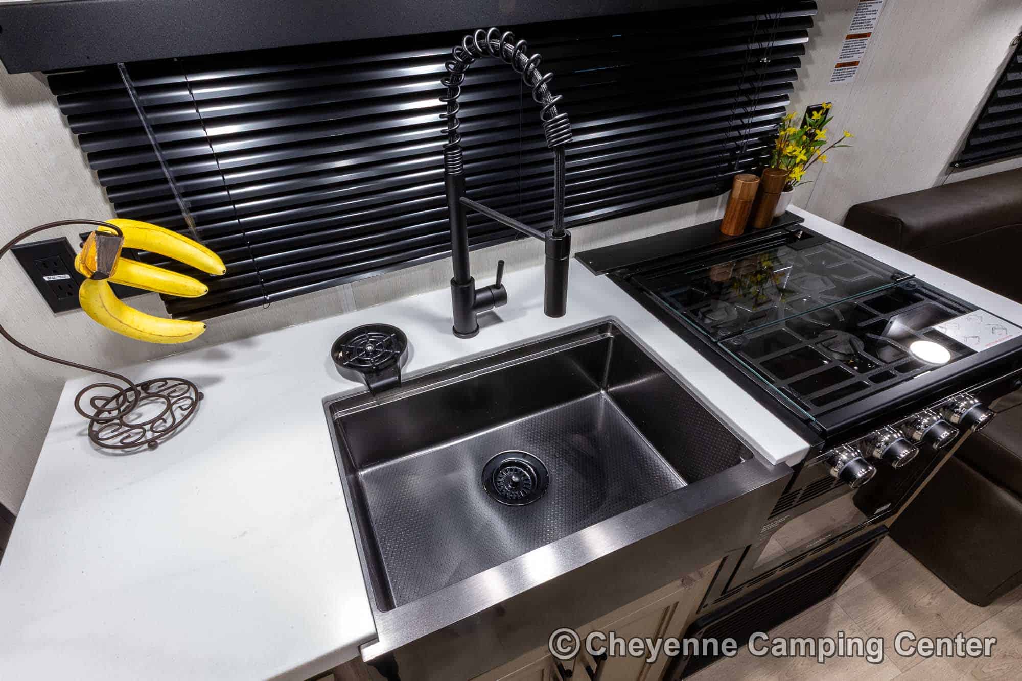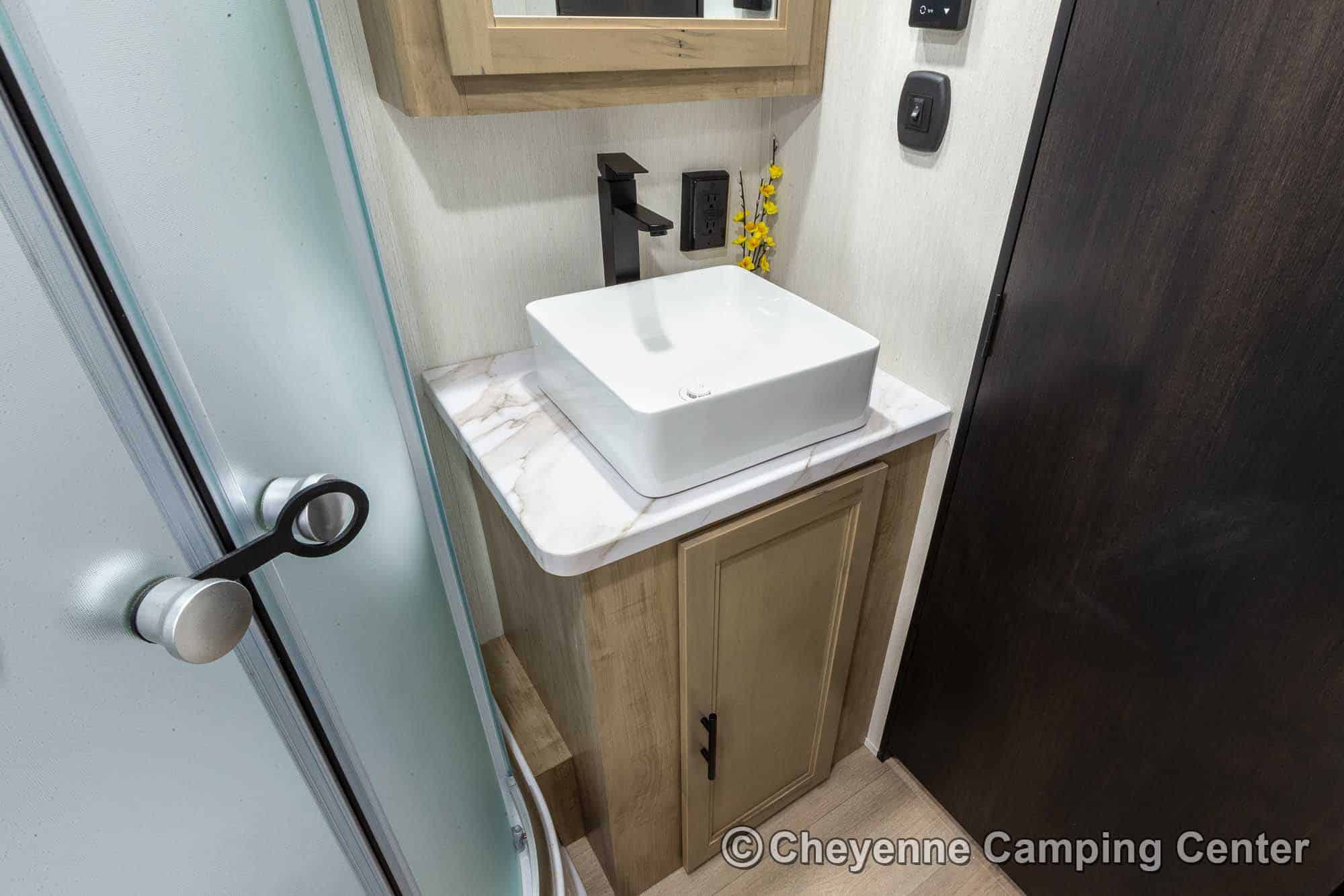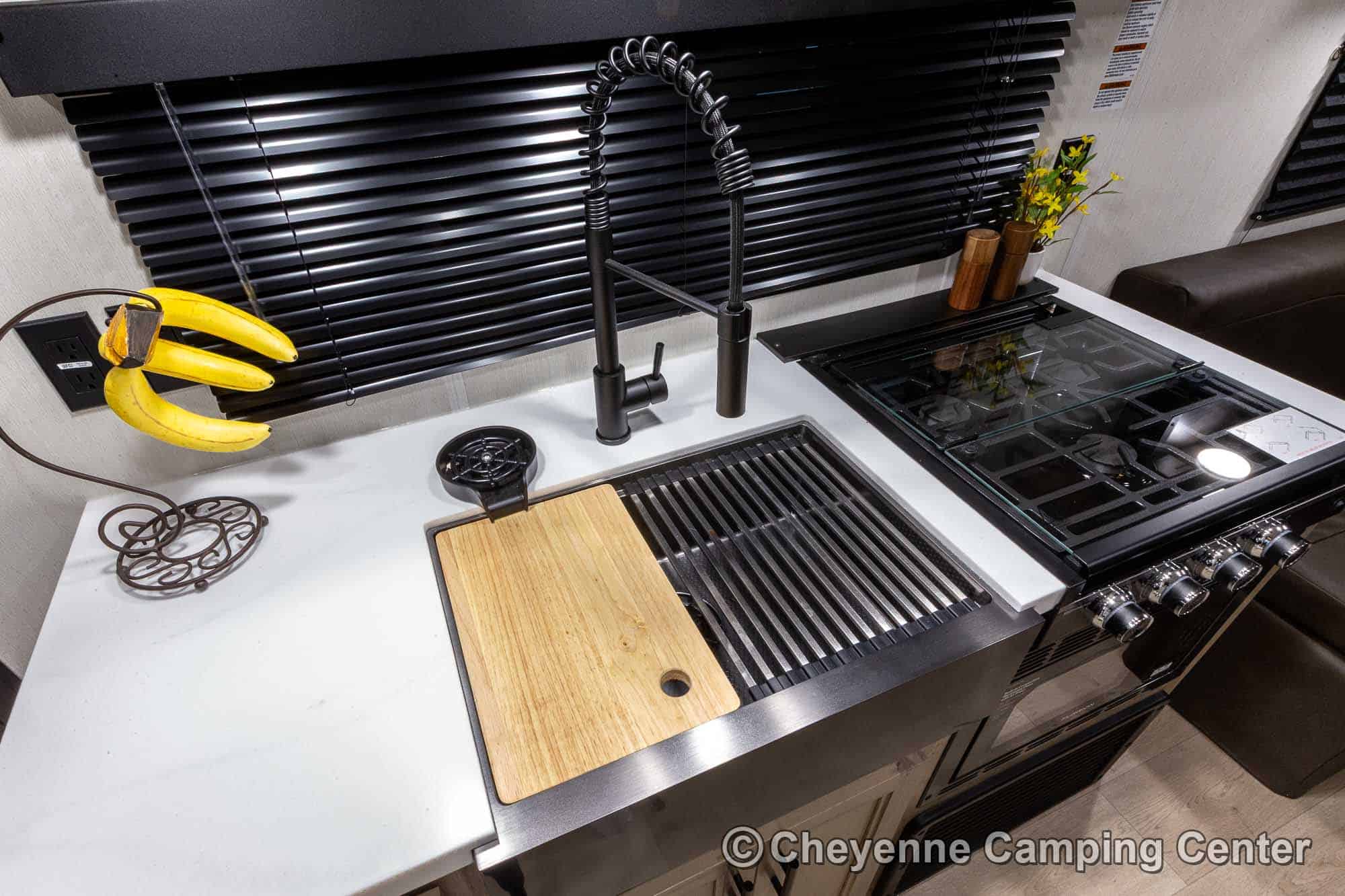 Inside, you’ll find pleated window shades, a microwave/convection oven with air fryer, a large pantry, 10 cu. ft. refrigerator, and a full bath with shower, foot-flush toilet, and premium vent fan. It’s also equipped with a Bluetooth receiver and TV hookups and comes with a one-year manufacturer’s warranty and one year of complimentary roadside assistance.
