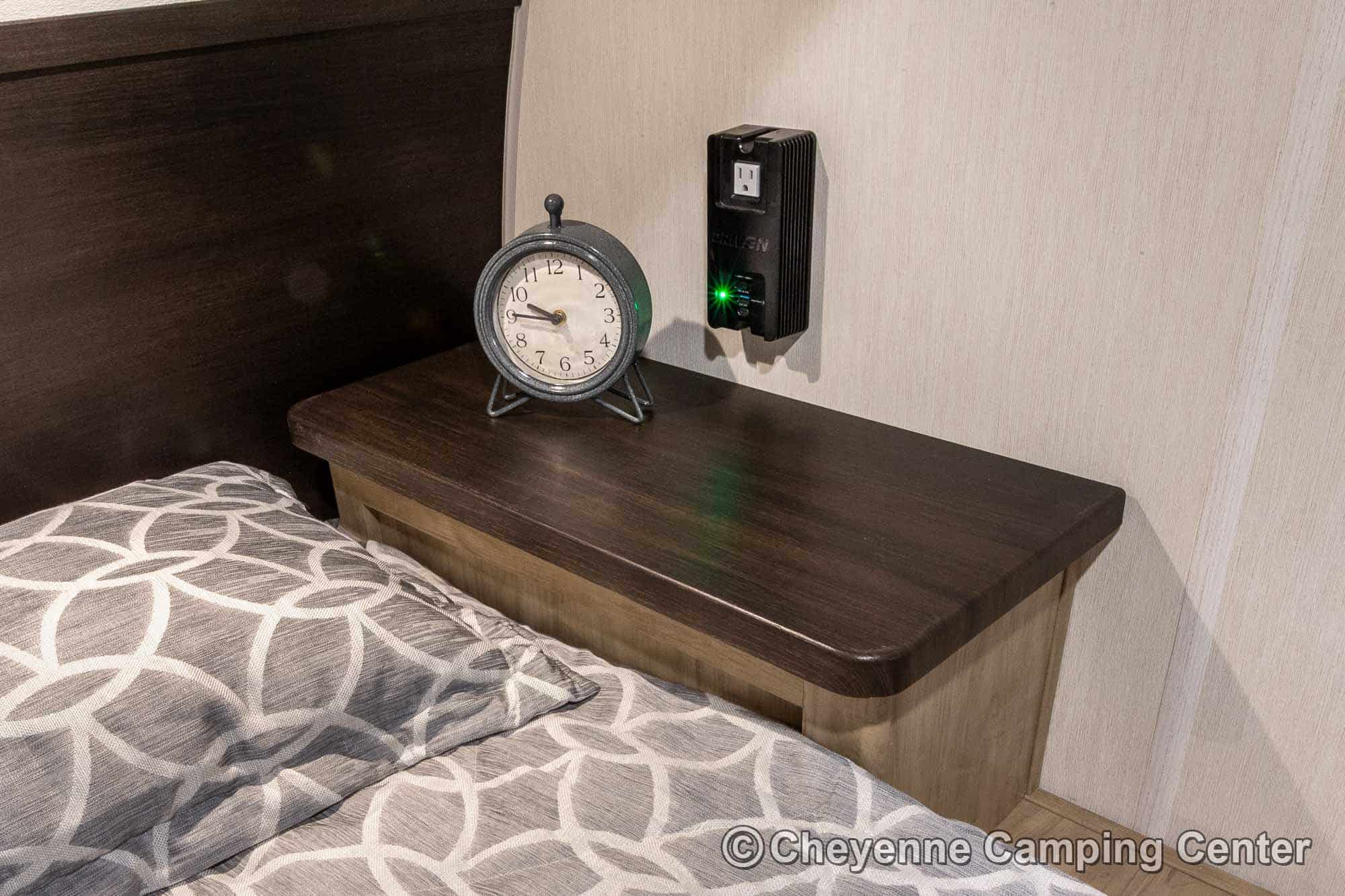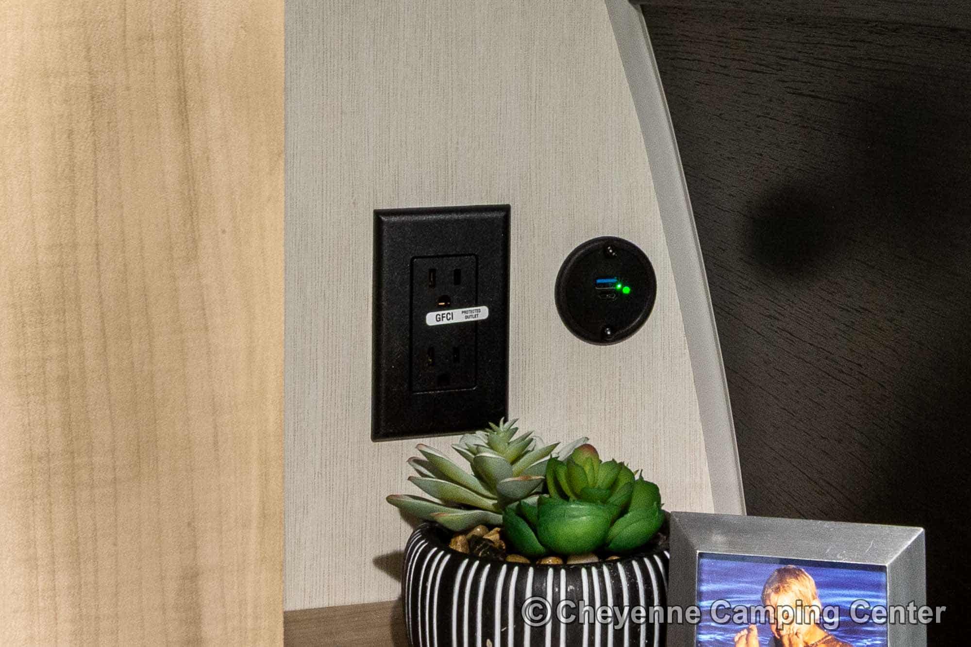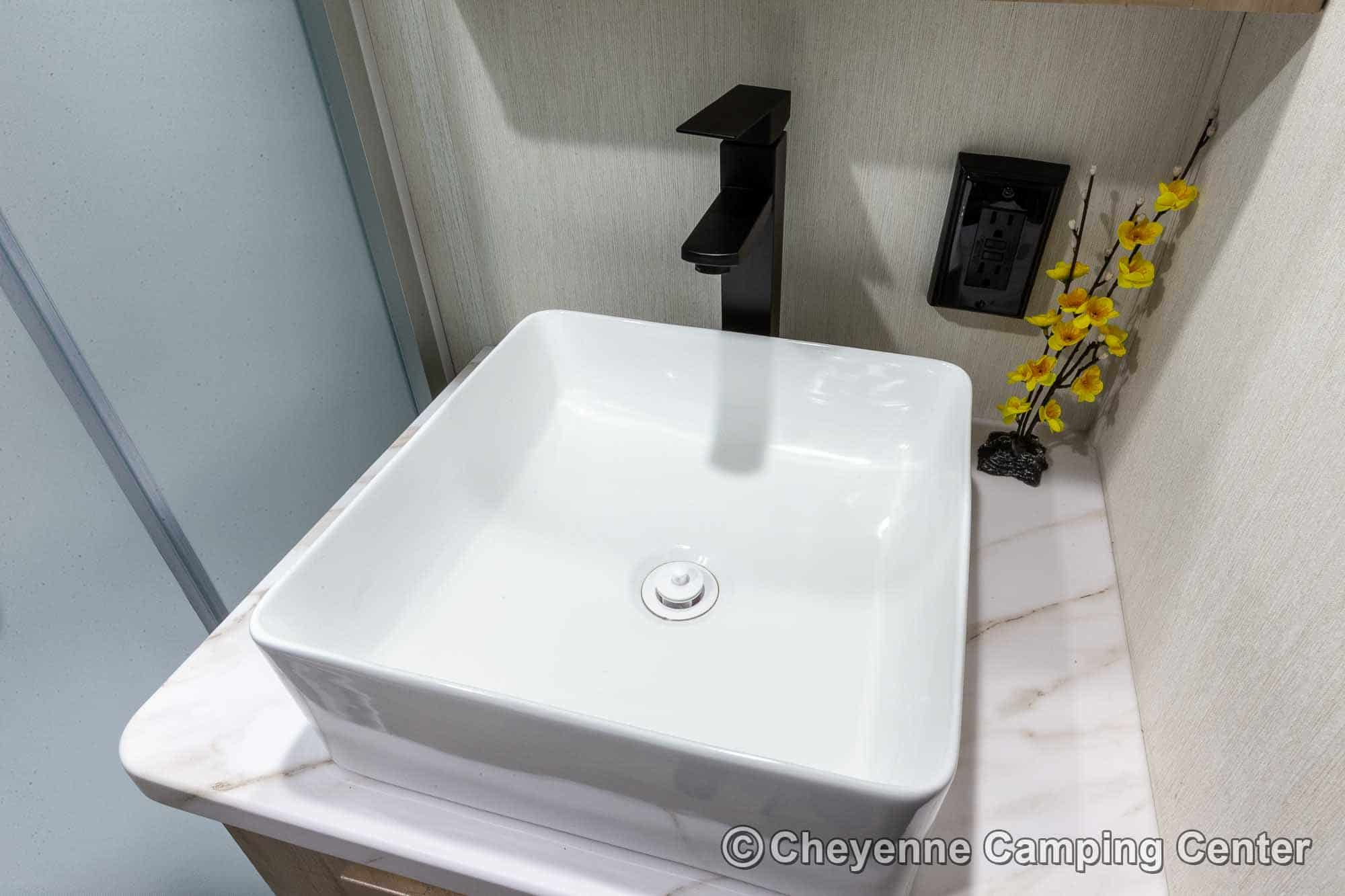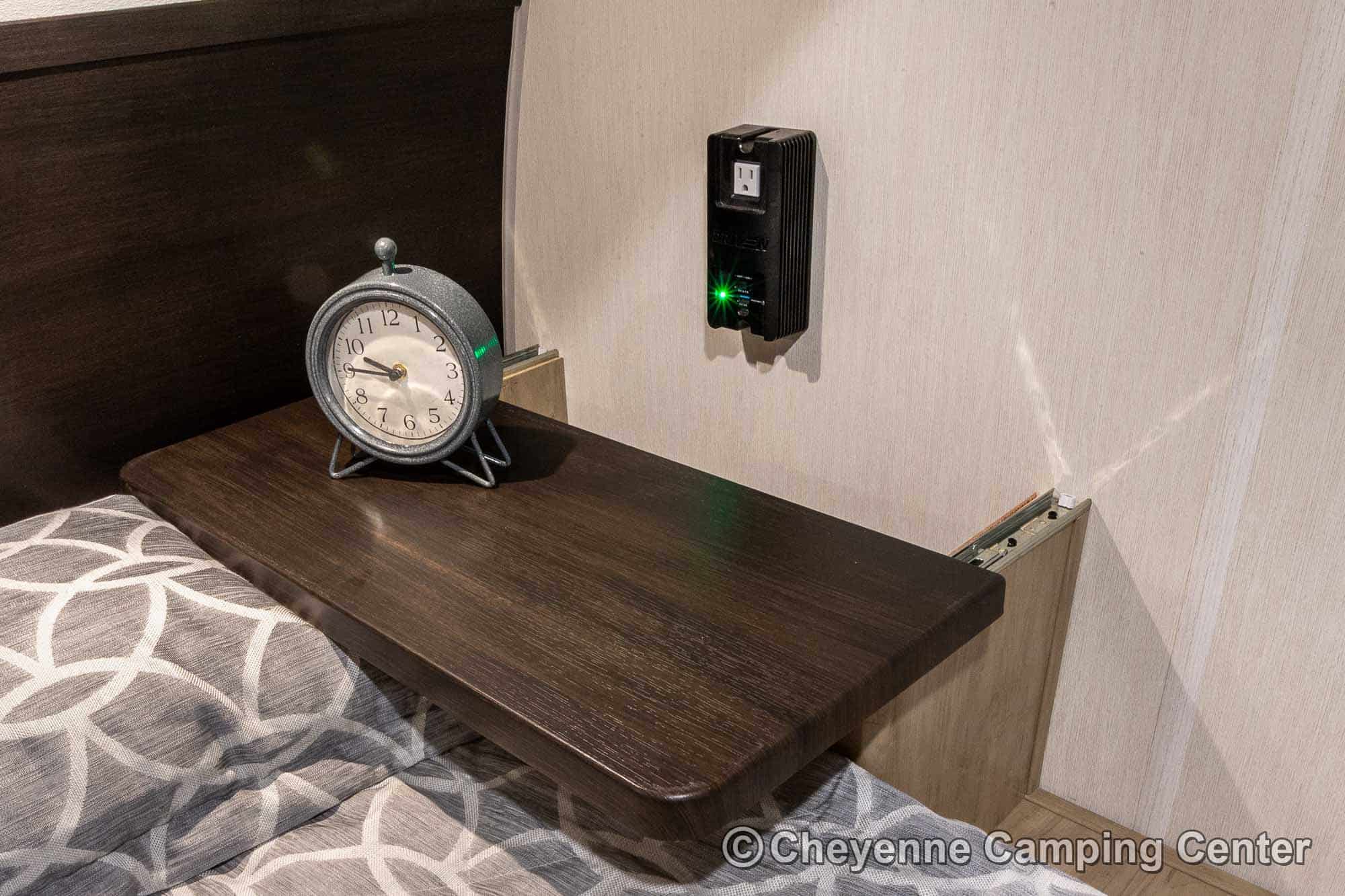 Inside, you’ll find pleated window shades, a microwave/convection oven with air fryer, a large pantry, 10 cu. ft. refrigerator, and a full bath with shower, foot-flush toilet, and premium vent fan. It’s also equipped with a Bluetooth receiver and TV hookups and comes with a one-year manufacturer’s warranty and one year of complimentary roadside assistance.
