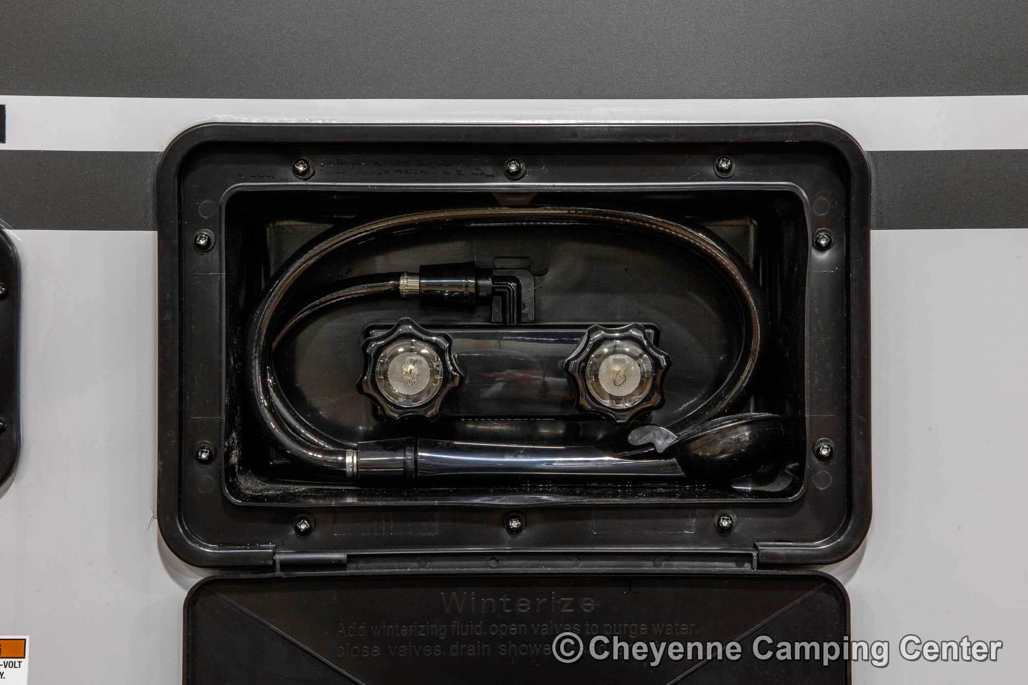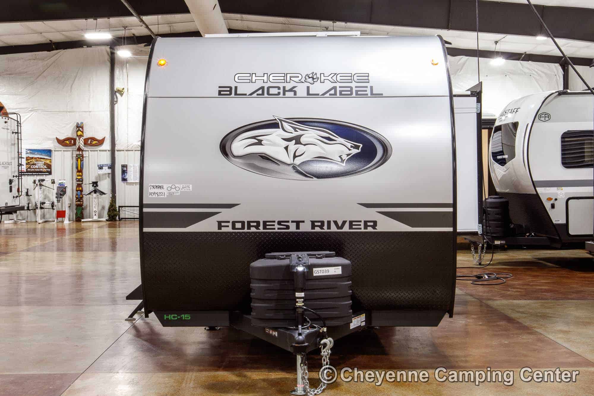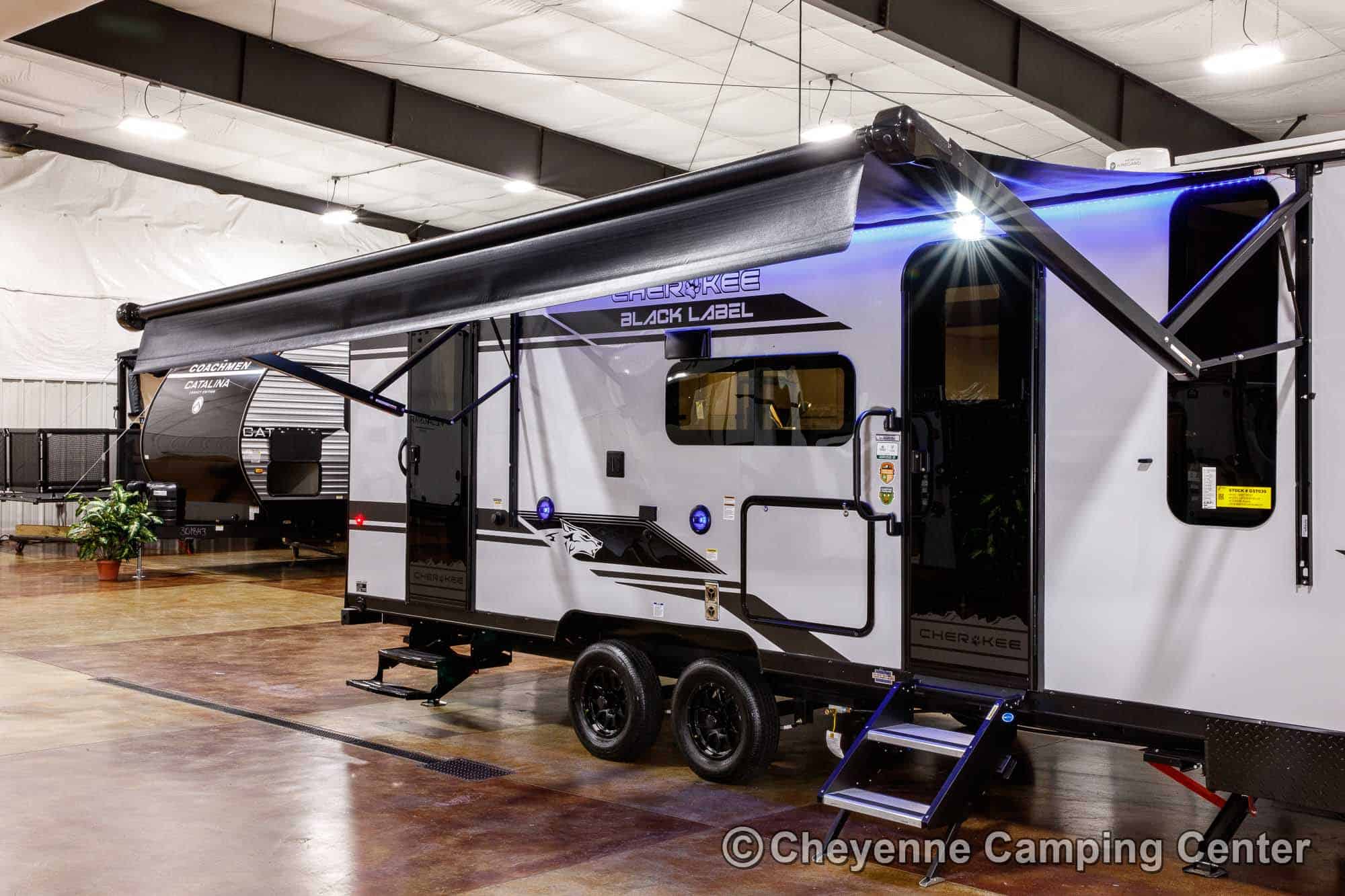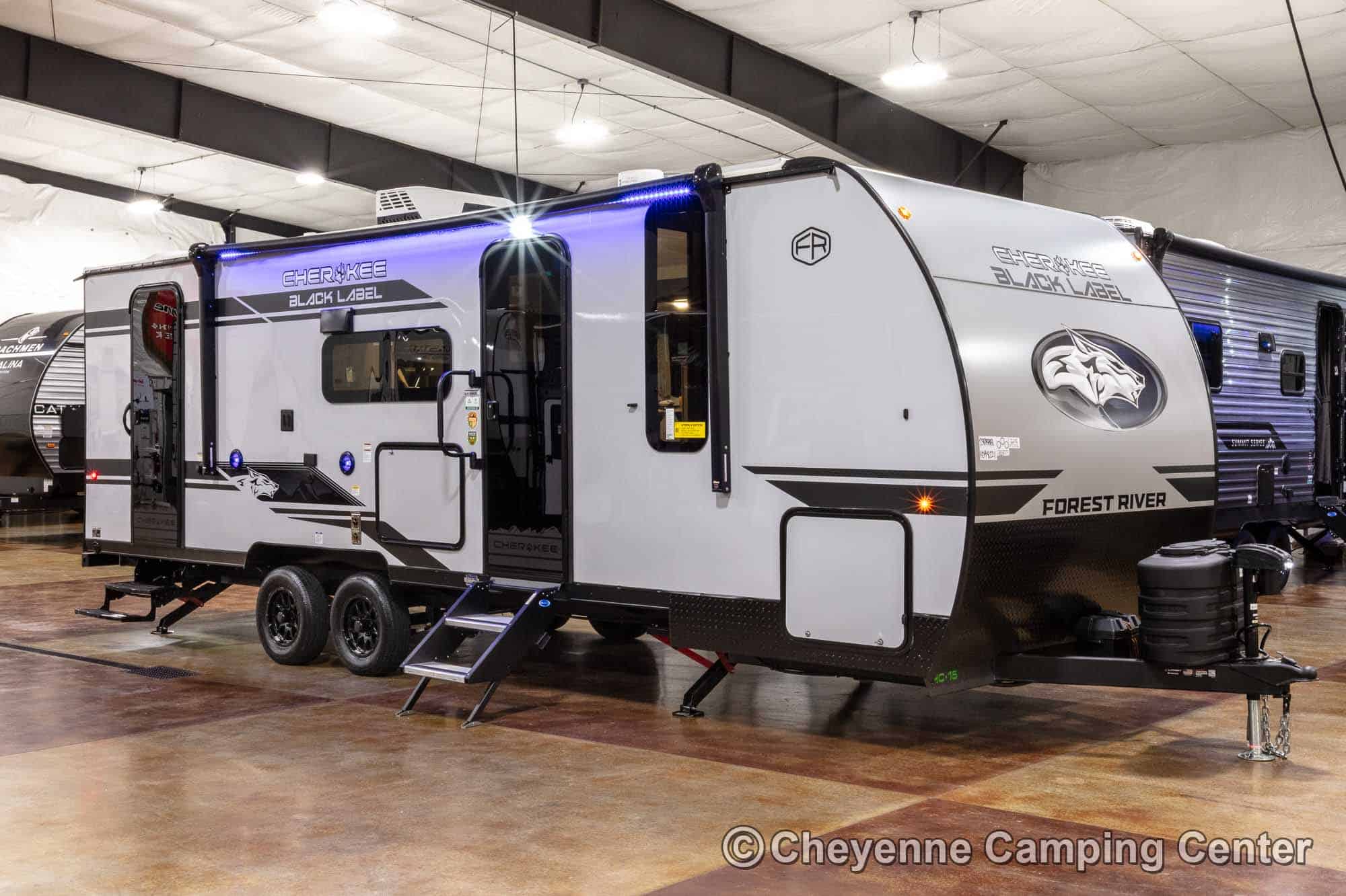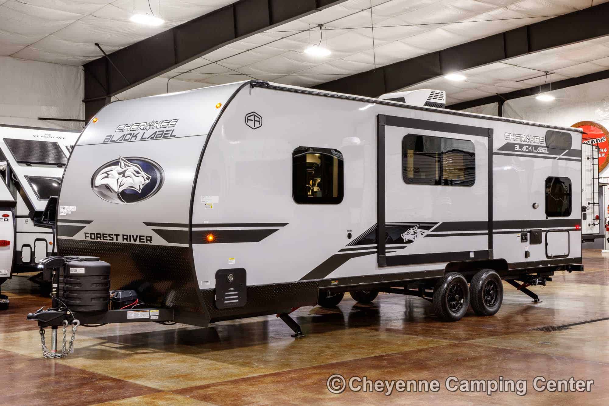 Other features include designer window shades, seamless countertops, battery disconnect, filled LP tanks, a 12V deep cycle battery, large “U” dinette, one year complimentary roadside assistance, one year manufacturer warranty, and much more! The Forest River Cherokee Grey Wolf Black Label 23DBHBL for sale at Cheyenne Camping Center is the ideal mid-sized family camper, combining style, comfort, and practicality for unforgettable adventures.