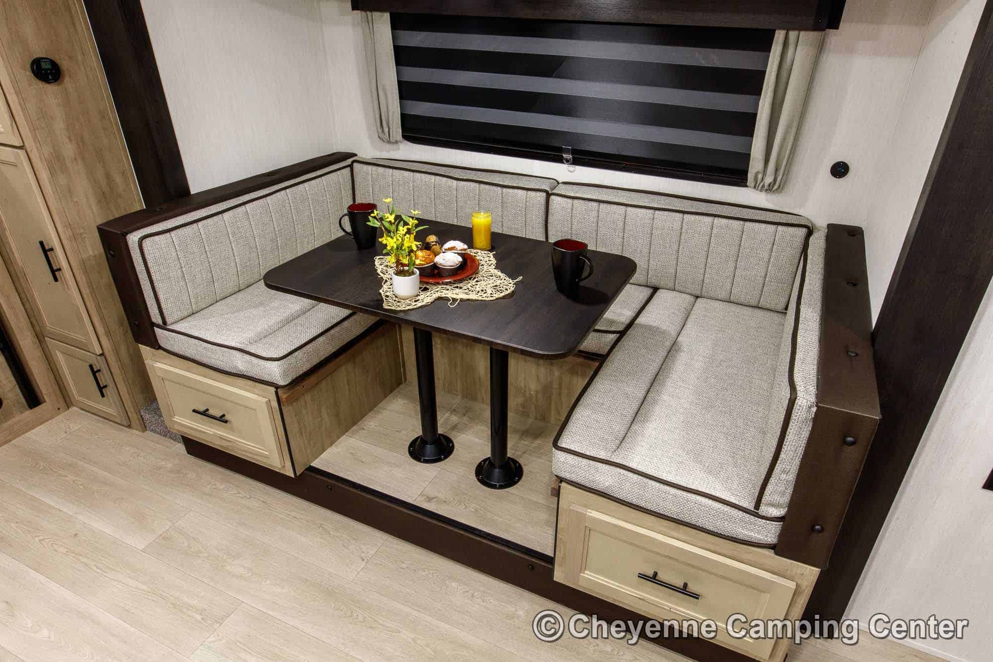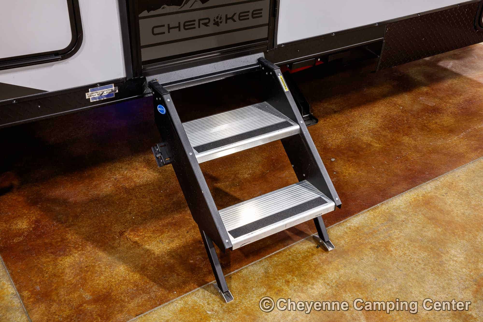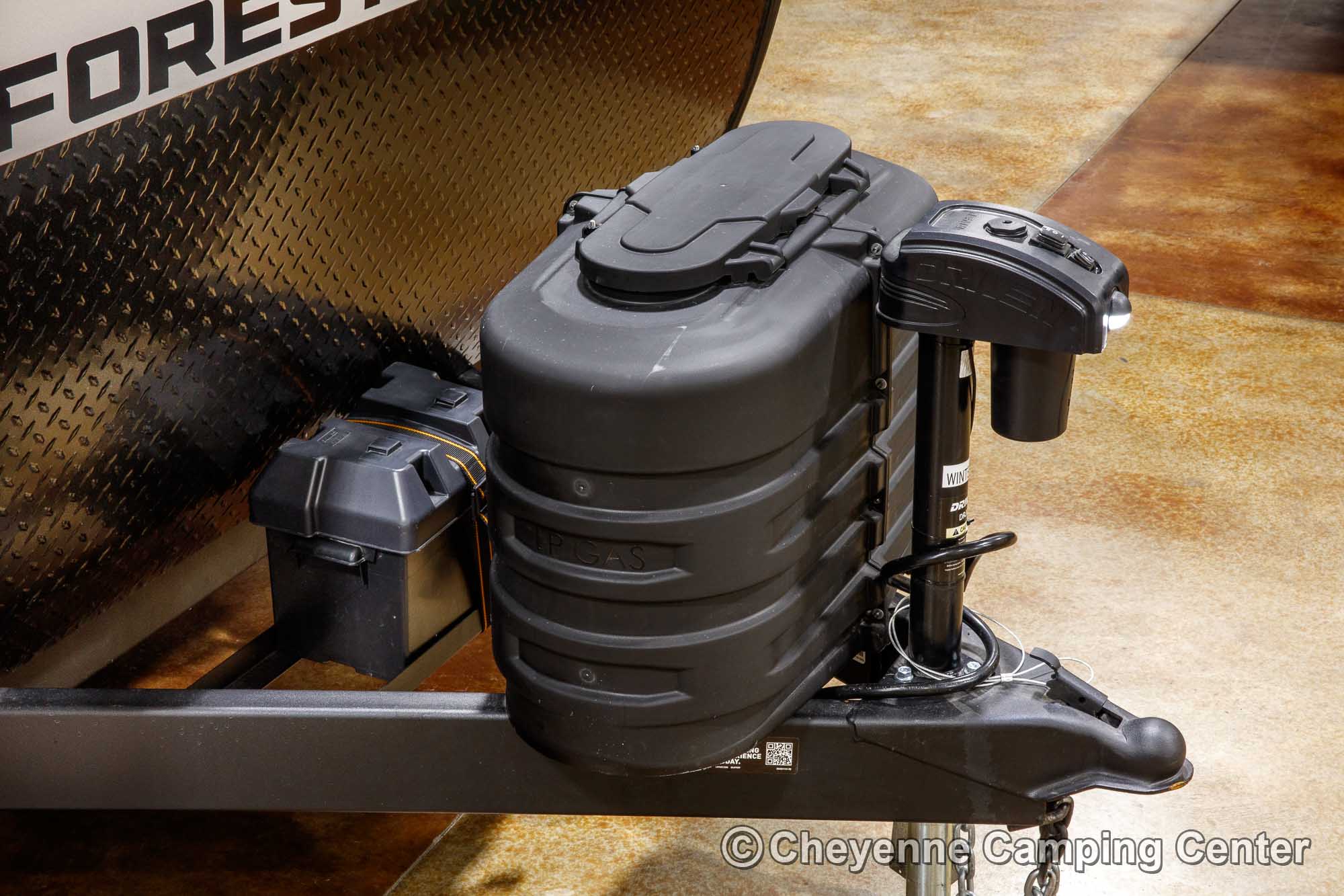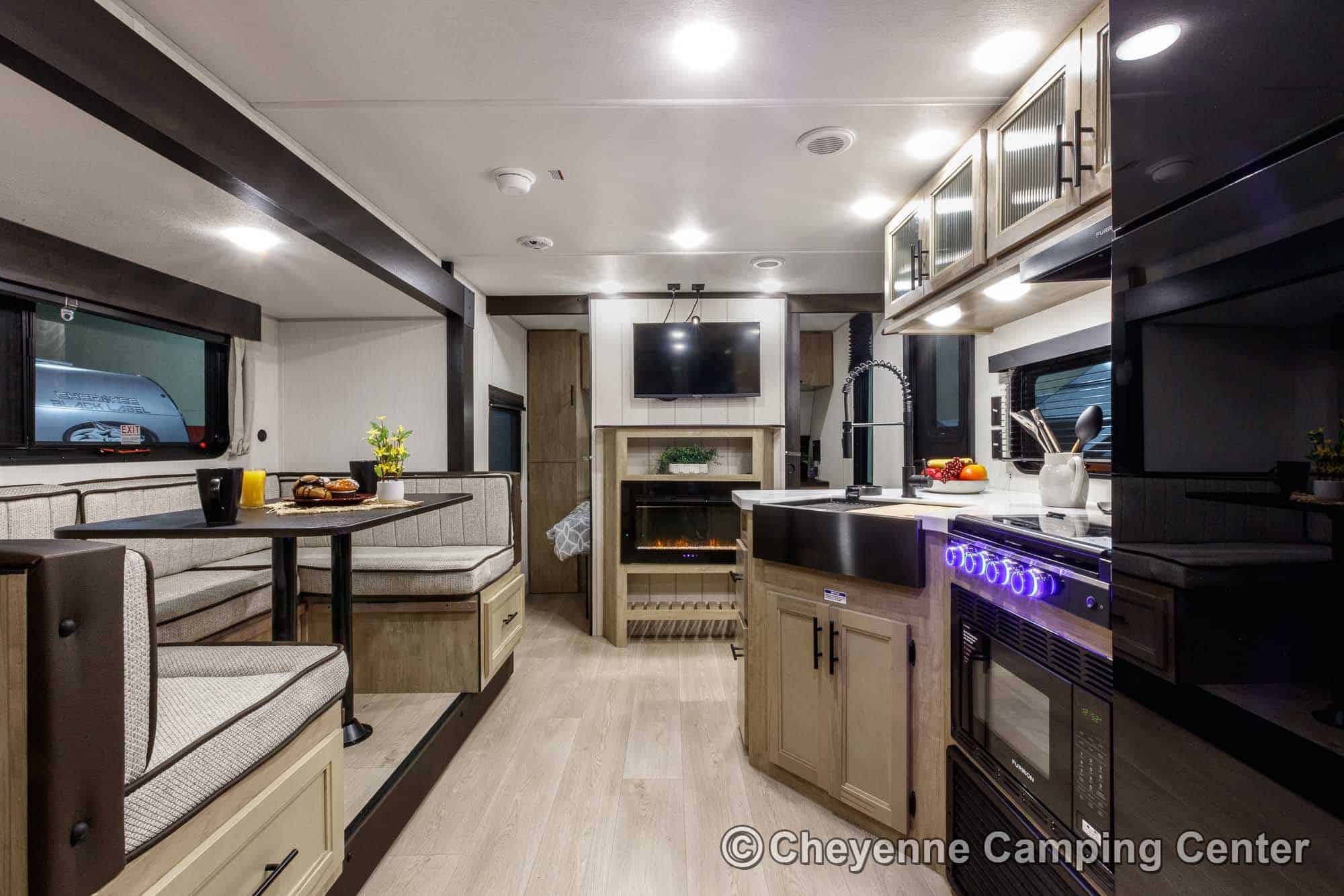 Other features include designer window shades, seamless countertops, battery disconnect, filled LP tanks, a 12V deep cycle battery, large “U” dinette, one year complimentary roadside assistance, one year manufacturer warranty, and much more! The Forest River Cherokee Grey Wolf Black Label 23DBHBL for sale at Cheyenne Camping Center is the ideal mid-sized family camper, combining style, comfort, and practicality for unforgettable adventures.