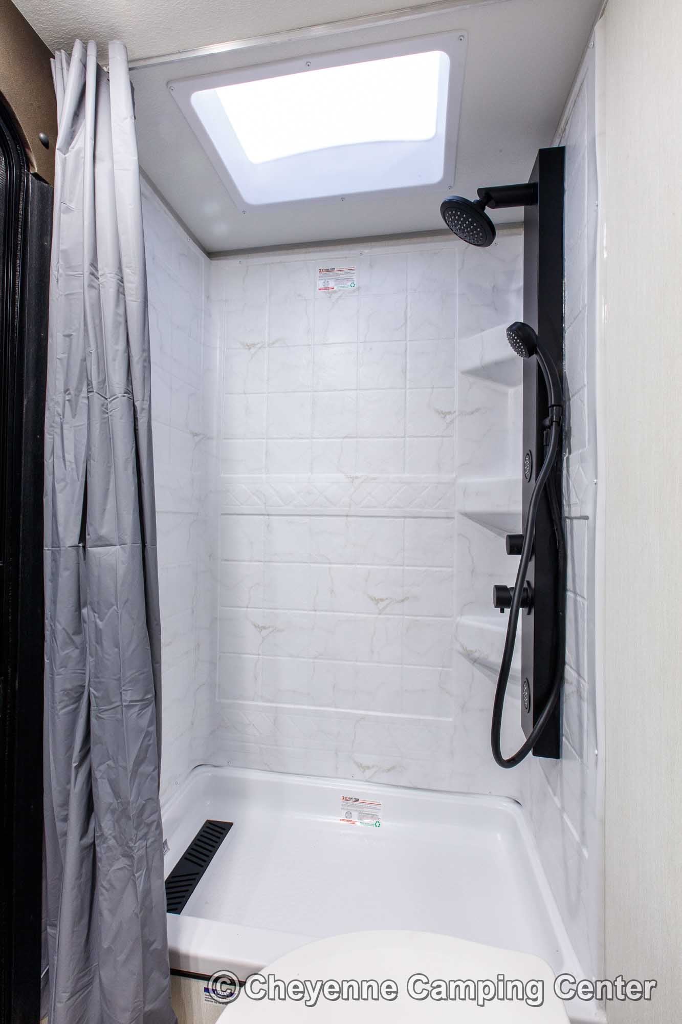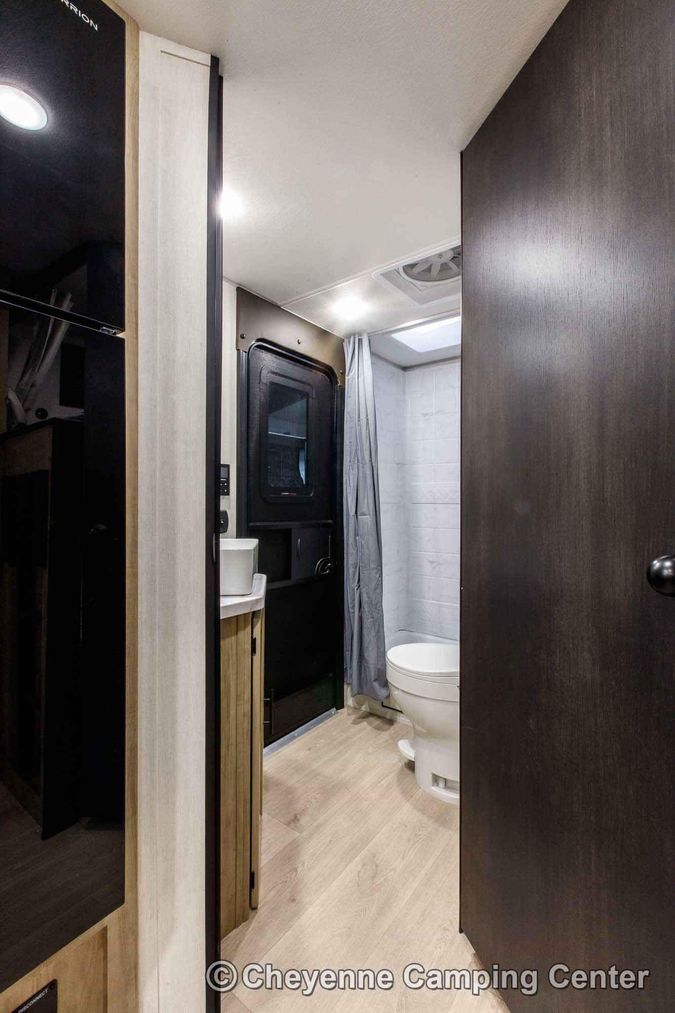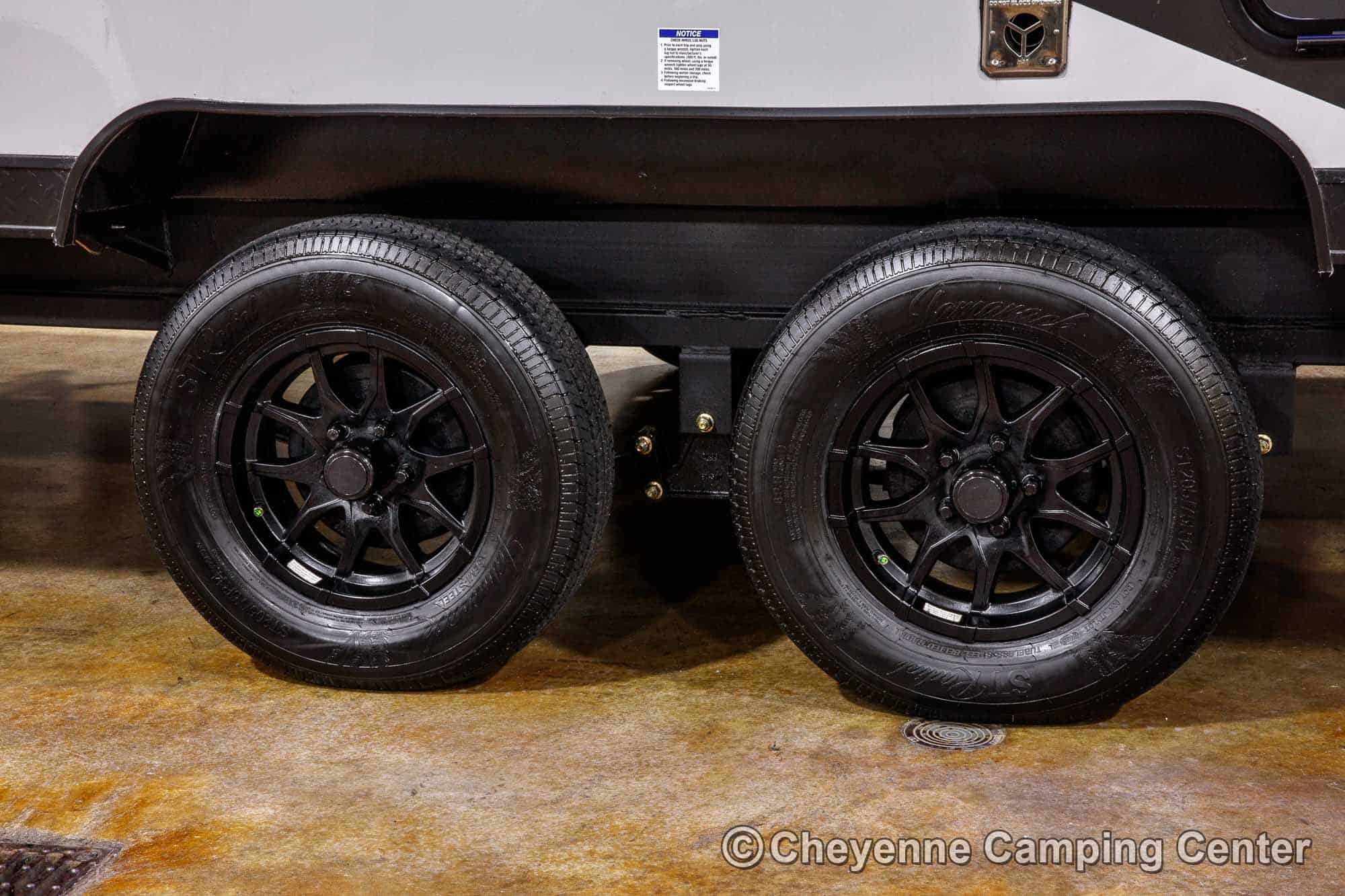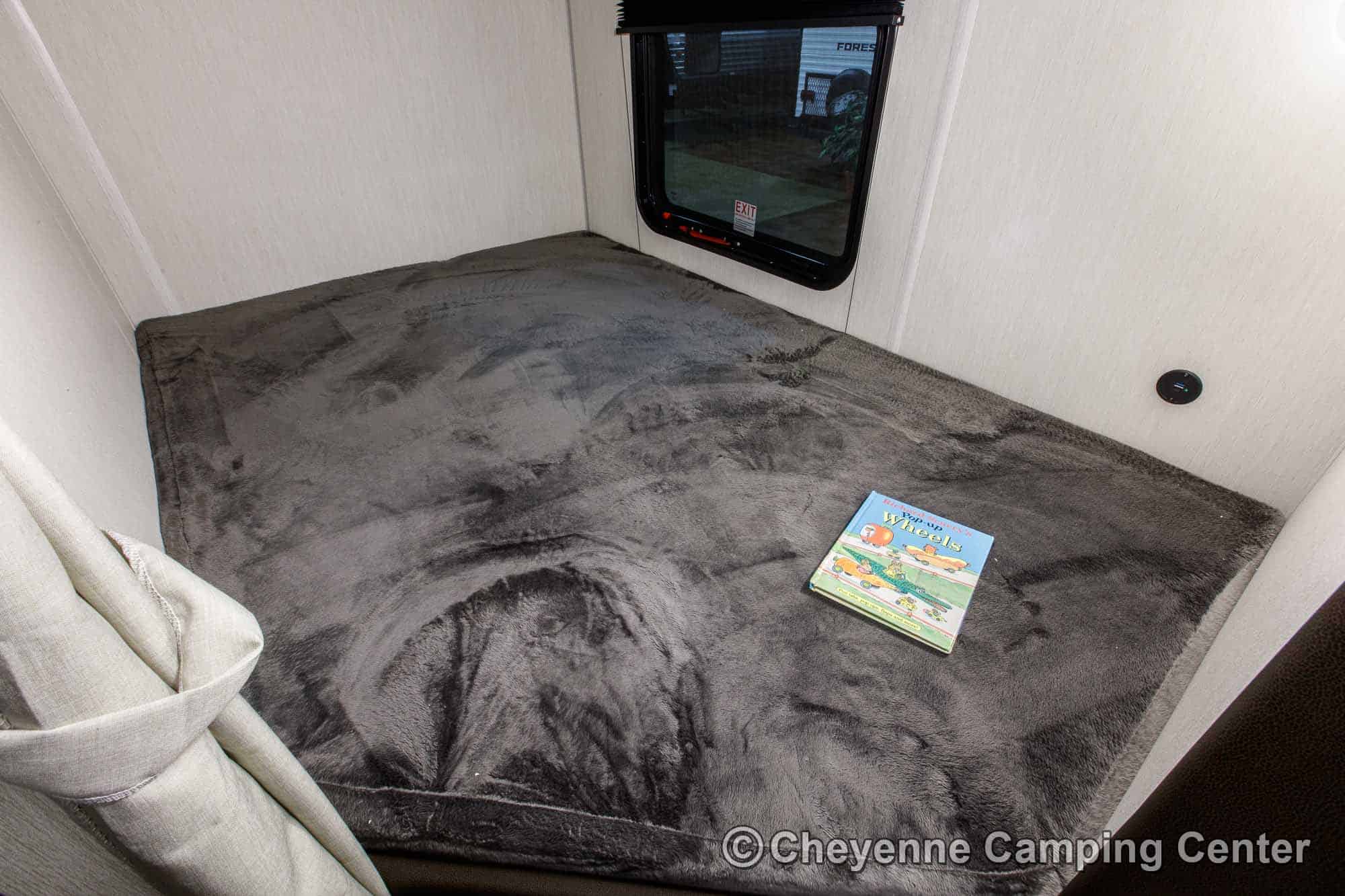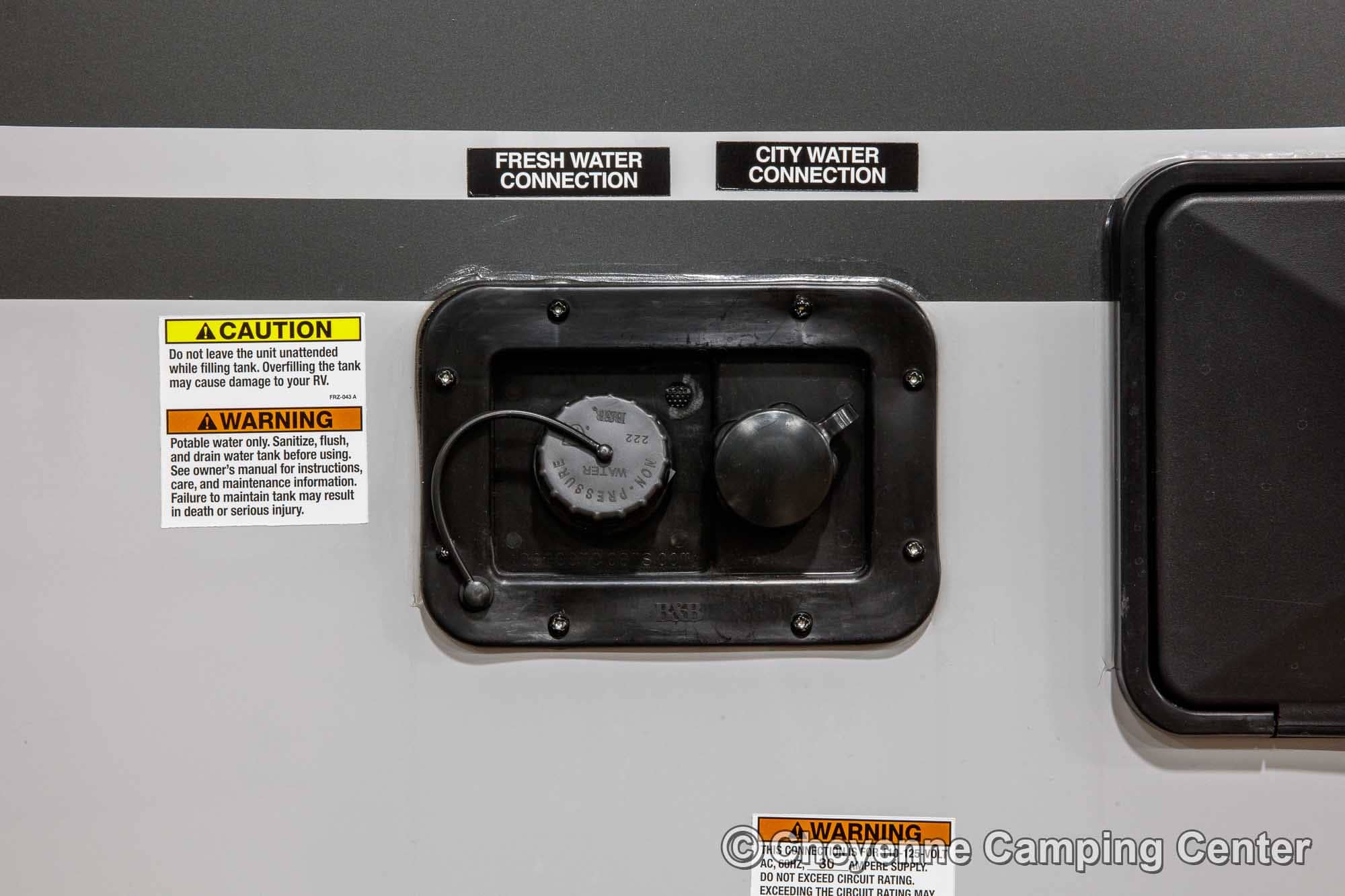 Other features include designer window shades, seamless countertops, battery disconnect, filled LP tanks, a 12V deep cycle battery, large “U” dinette, one year complimentary roadside assistance, one year manufacturer warranty, and much more! The Forest River Cherokee Grey Wolf Black Label 23DBHBL for sale at Cheyenne Camping Center is the ideal mid-sized family camper, combining style, comfort, and practicality for unforgettable adventures.