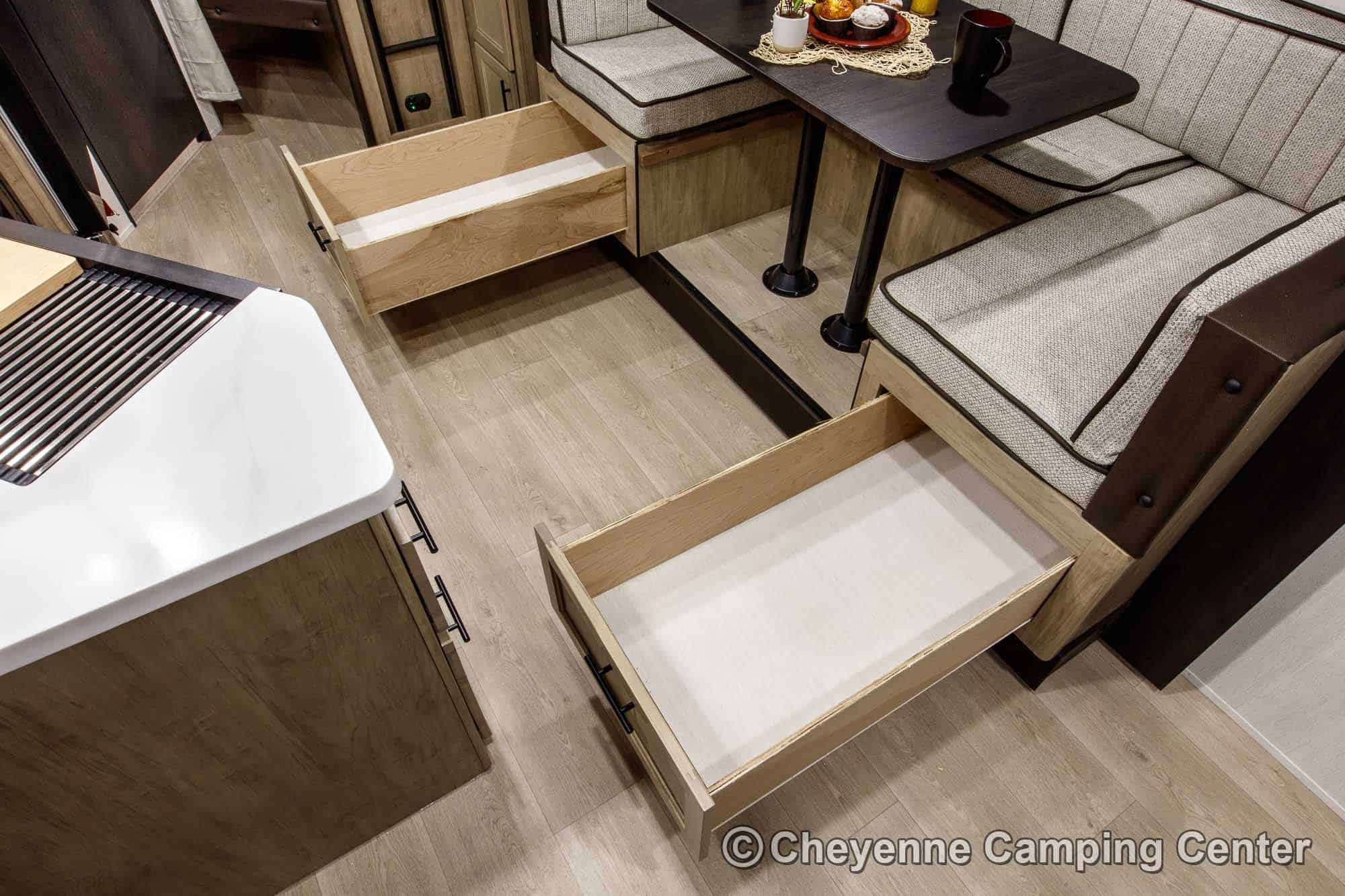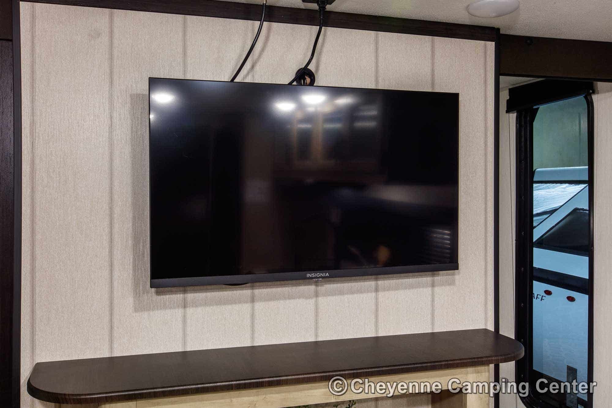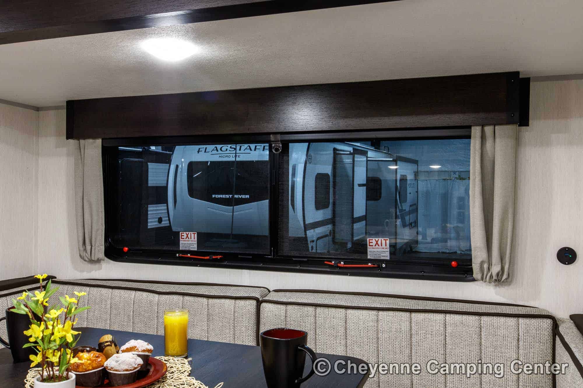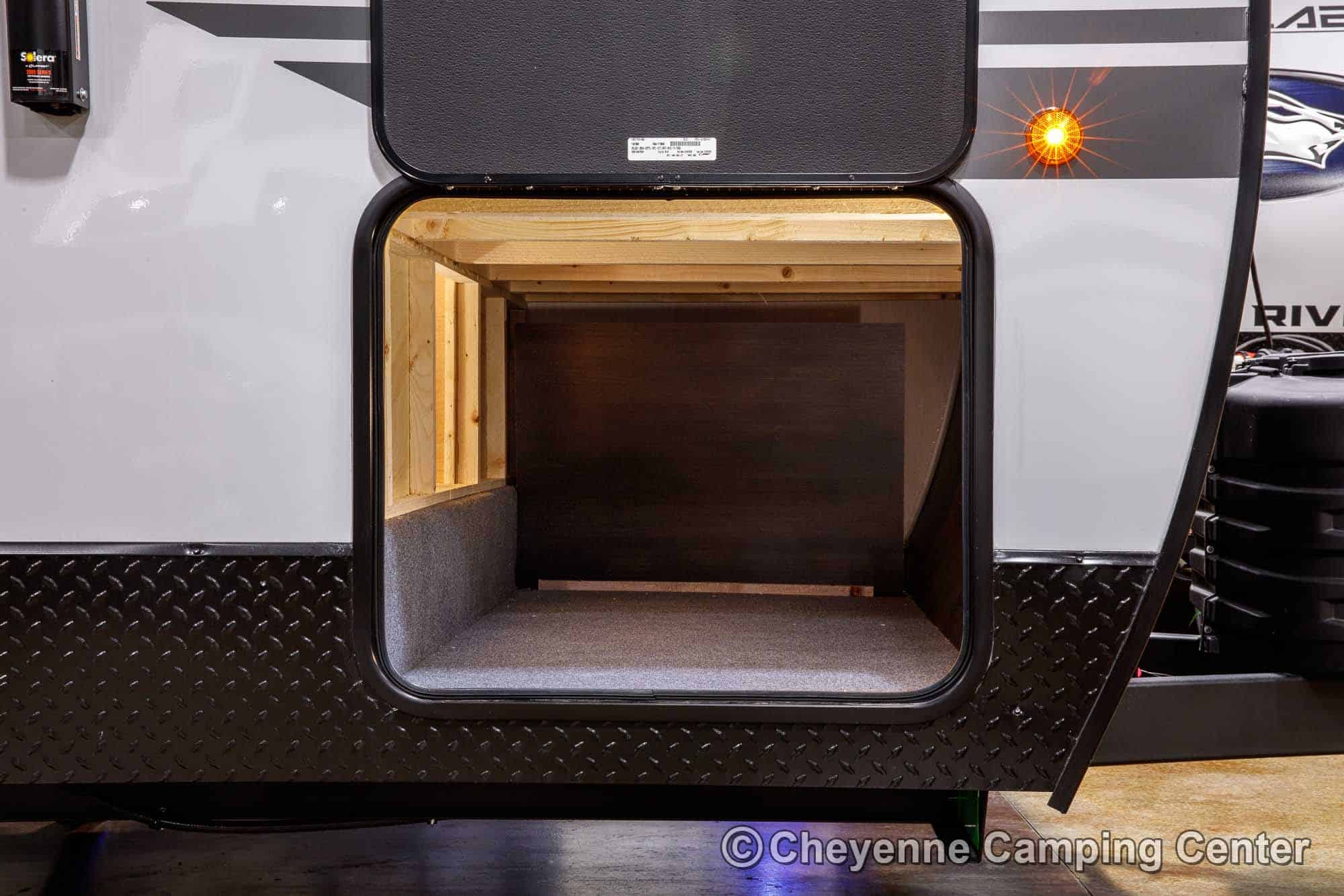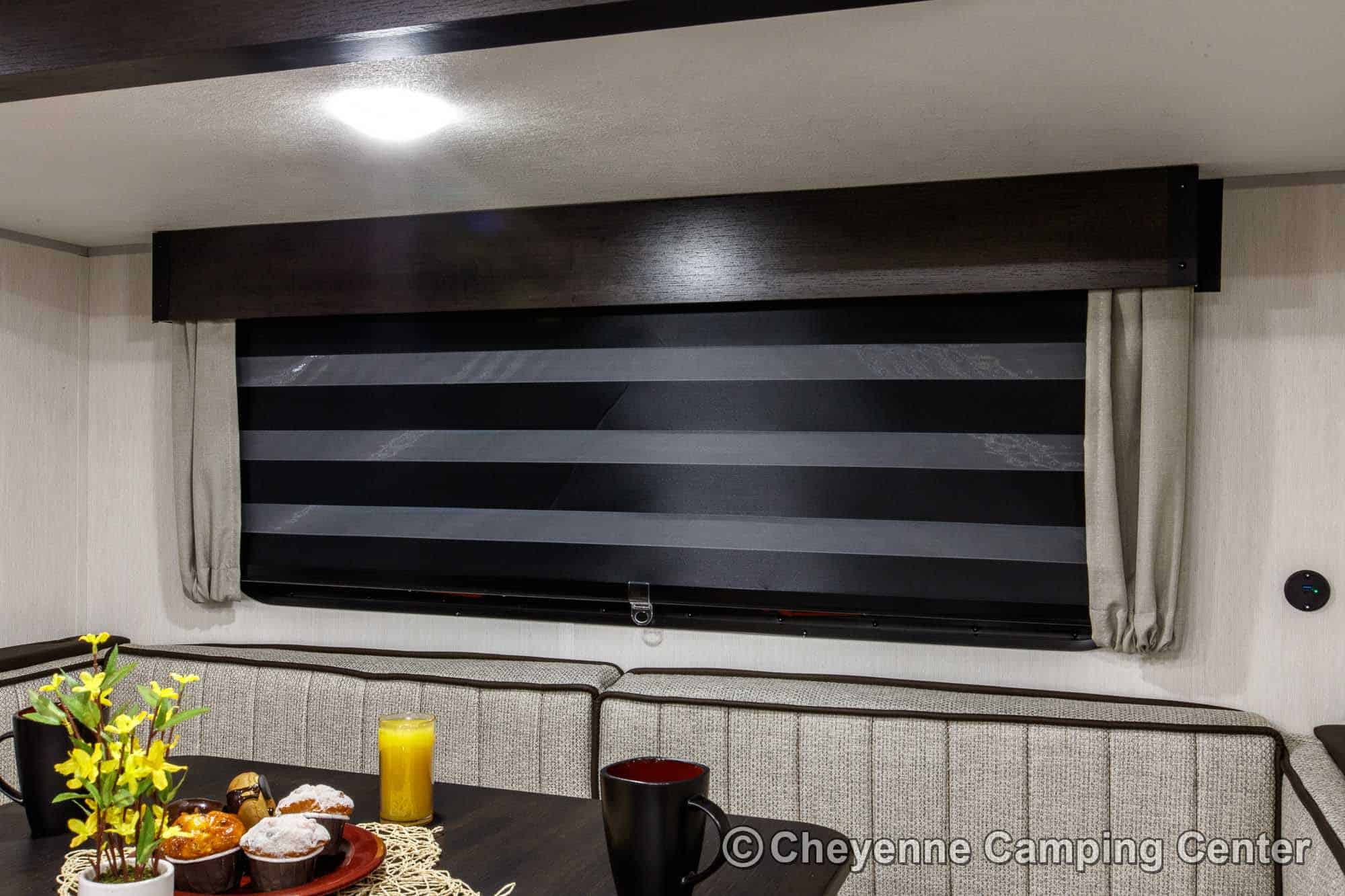 Other features include designer window shades, seamless countertops, battery disconnect, filled LP tanks, a 12V deep cycle battery, large “U” dinette, one year complimentary roadside assistance, one year manufacturer warranty, and much more! The Forest River Cherokee Grey Wolf Black Label 23DBHBL for sale at Cheyenne Camping Center is the ideal mid-sized family camper, combining style, comfort, and practicality for unforgettable adventures.
