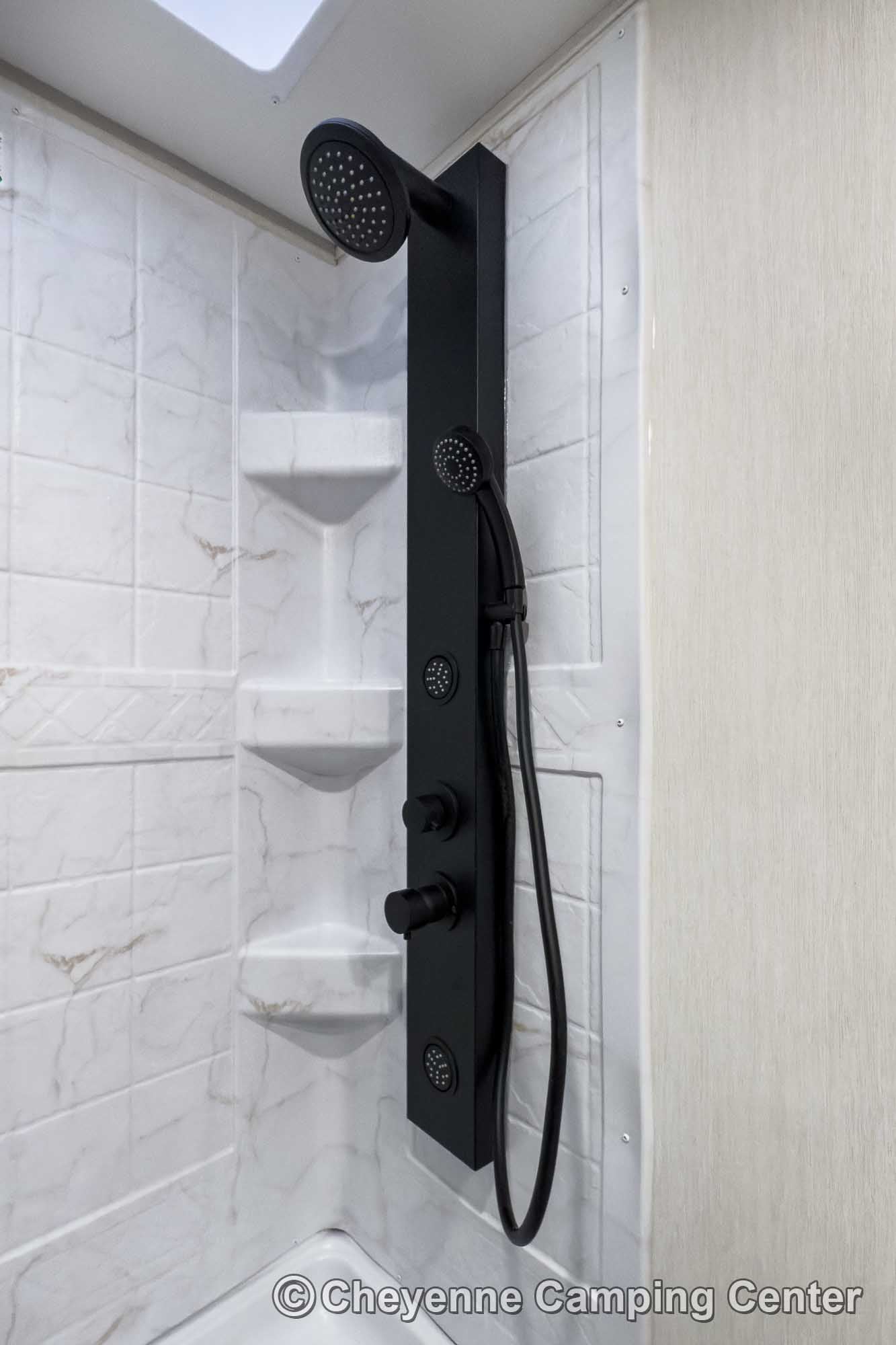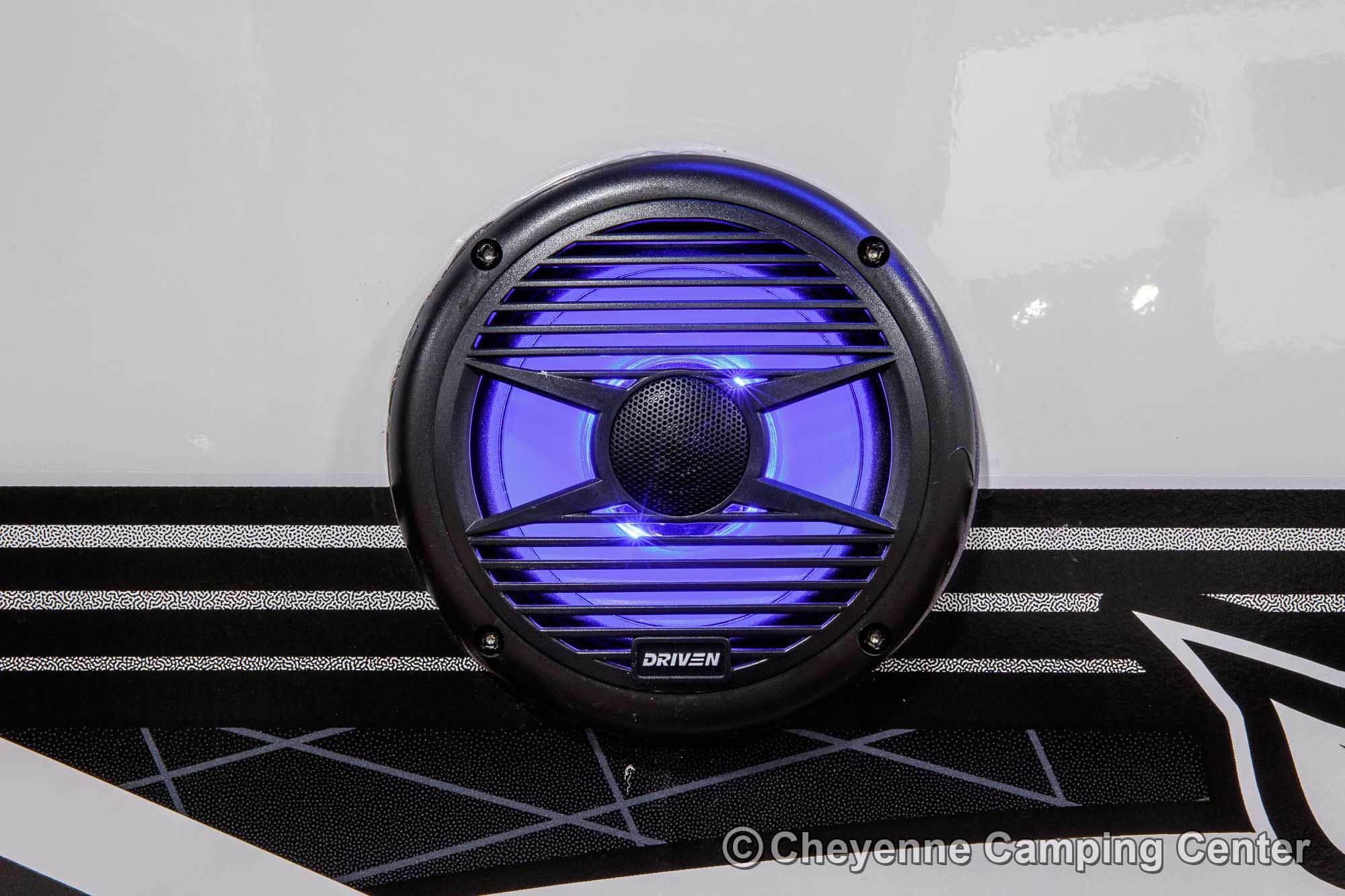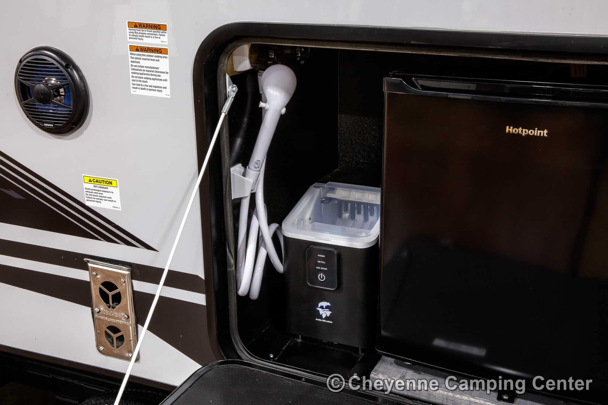 Outside, you’ll have a mini outdoor kitchen (refrigerator, ice maker, and water), two entry doors, a 200-watt solar panel, premium MorRyde entry steps at main entrance, power stabilizer jacks, a power tongue jack, Leash Latch for pets, a 15’ power awning with LED lighting, premium wheels, hot/cold shower fixture, black tank flush fixture, storage compartments, flip down rear cargo rack, marine grade speakers, 15,000 BTU ducted air conditioner, and enclosed holding tanks with heat pads.