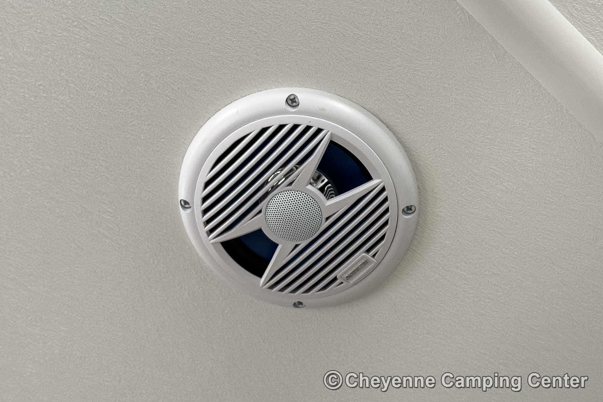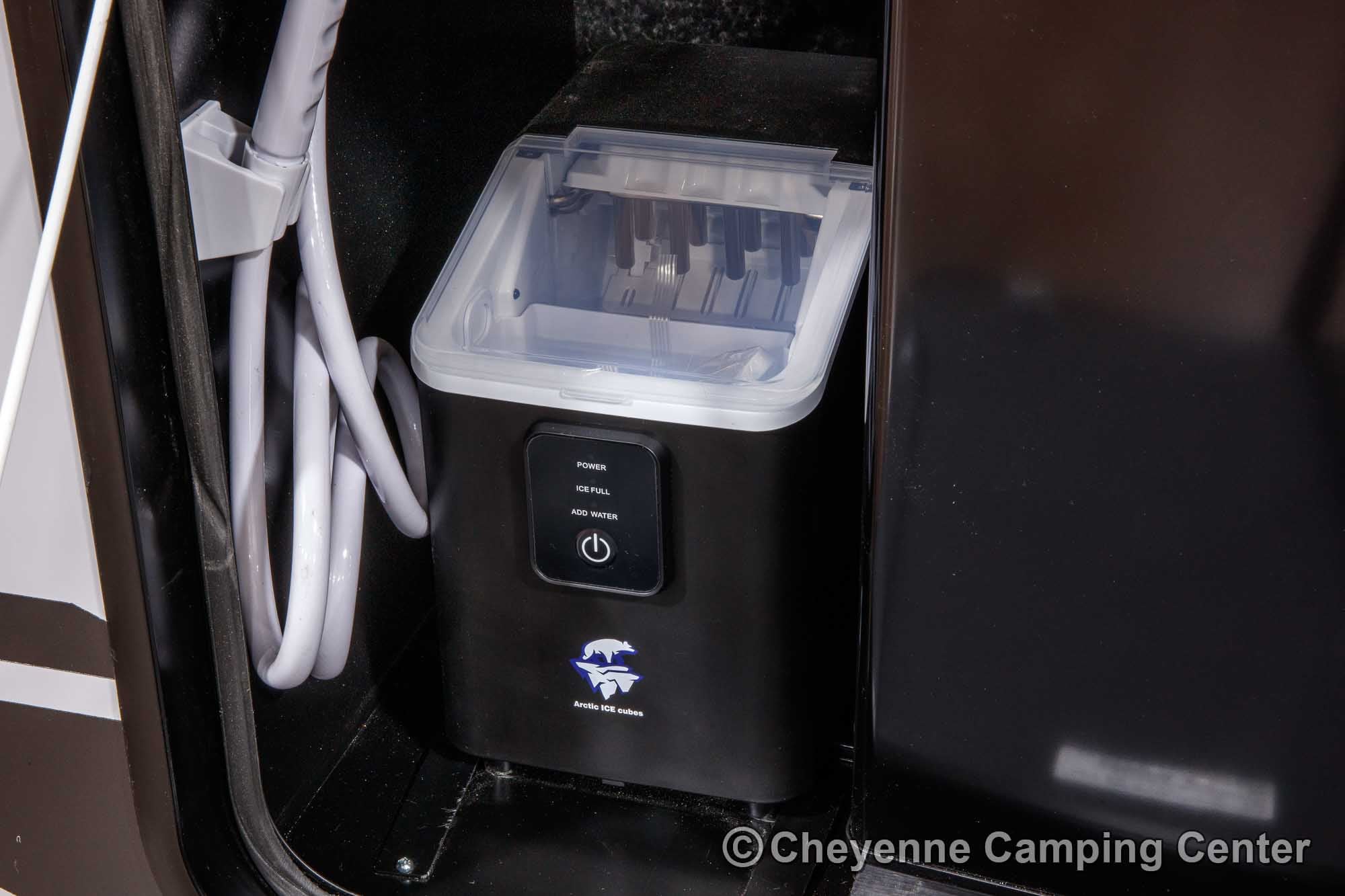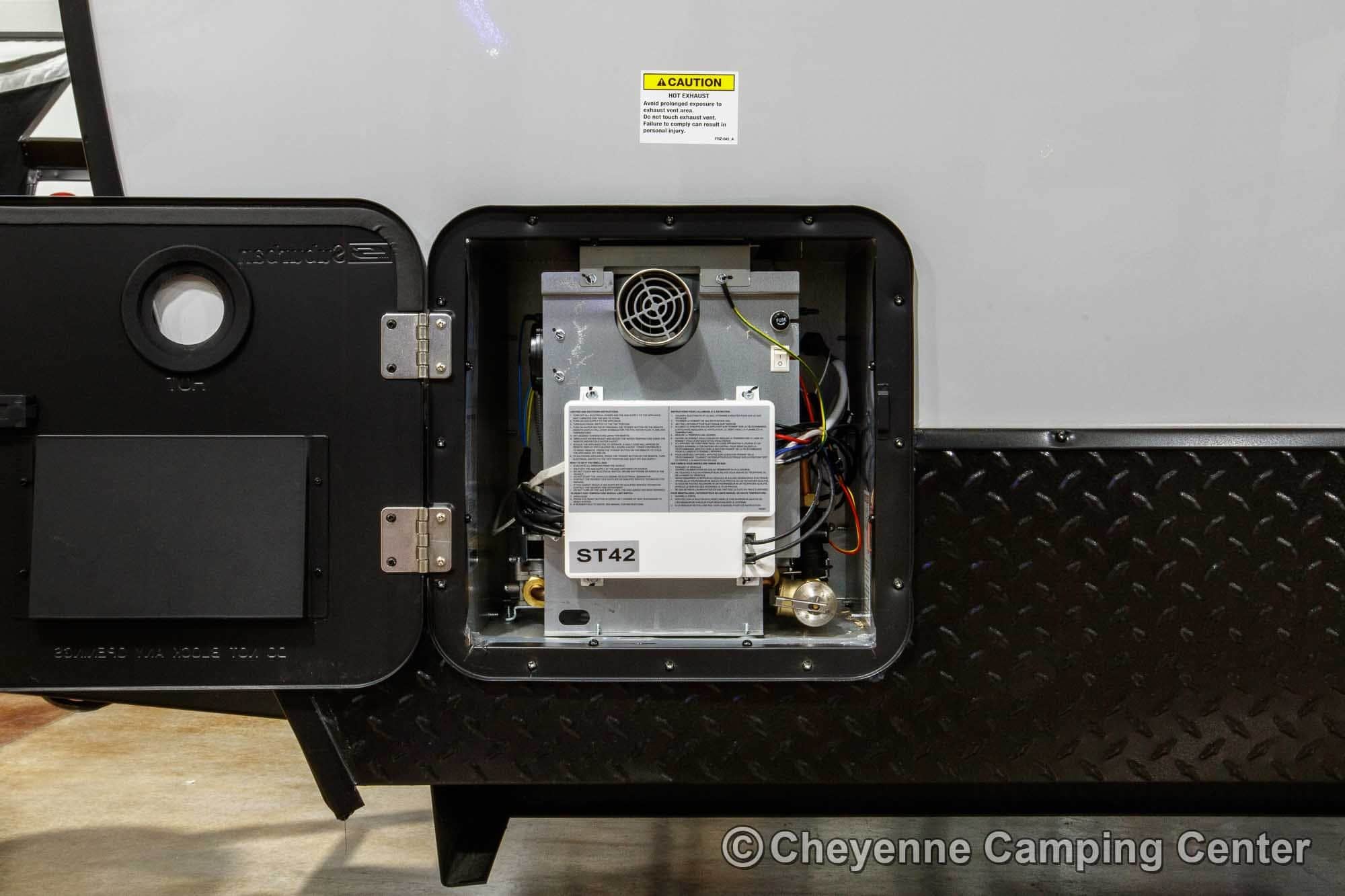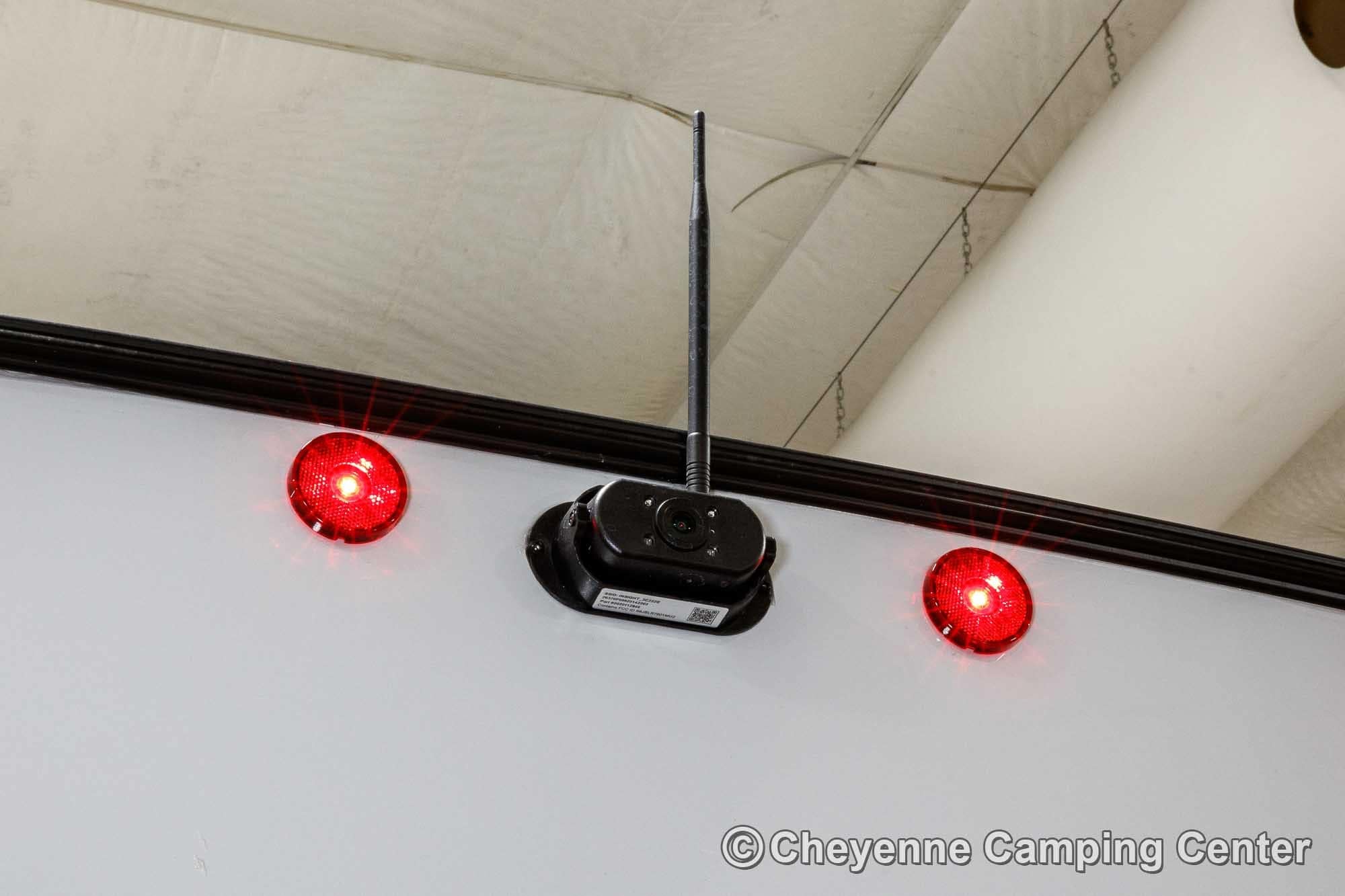 Outside, you’ll have a mini outdoor kitchen (refrigerator, ice maker, and water), two entry doors, a 200-watt solar panel, premium MorRyde entry steps at main entrance, power stabilizer jacks, a power tongue jack, Leash Latch for pets, a 15’ power awning with LED lighting, premium wheels, hot/cold shower fixture, black tank flush fixture, storage compartments, flip down rear cargo rack, marine grade speakers, 15,000 BTU ducted air conditioner, and enclosed holding tanks with heat pads.
