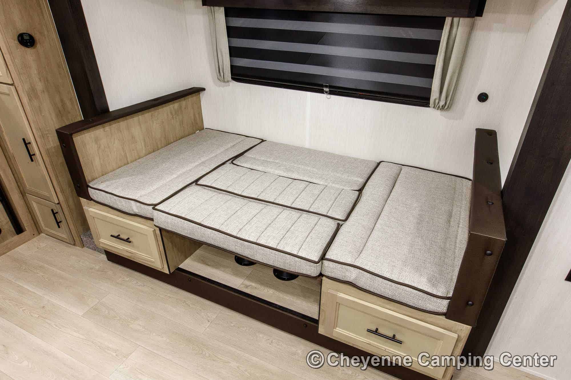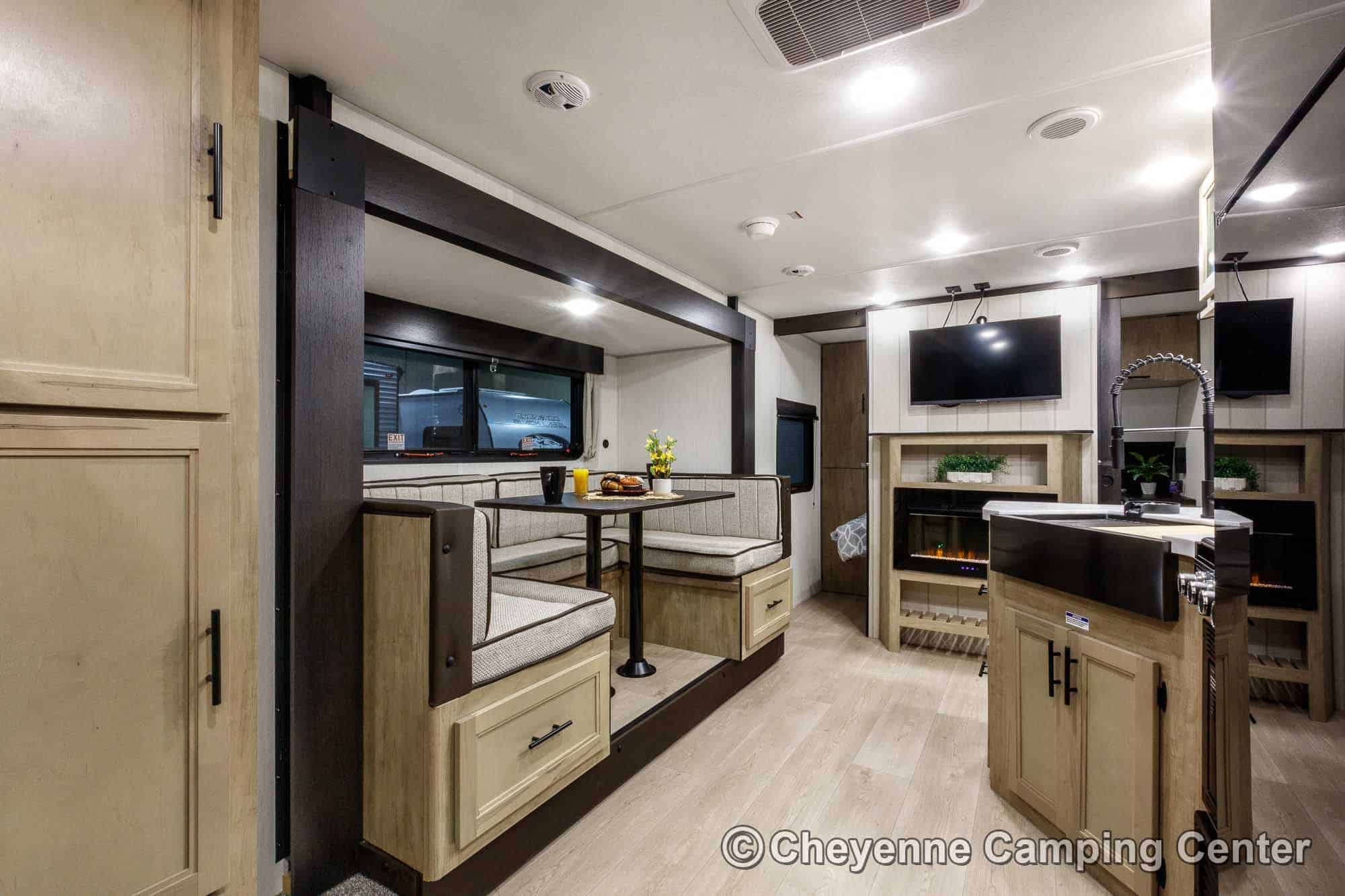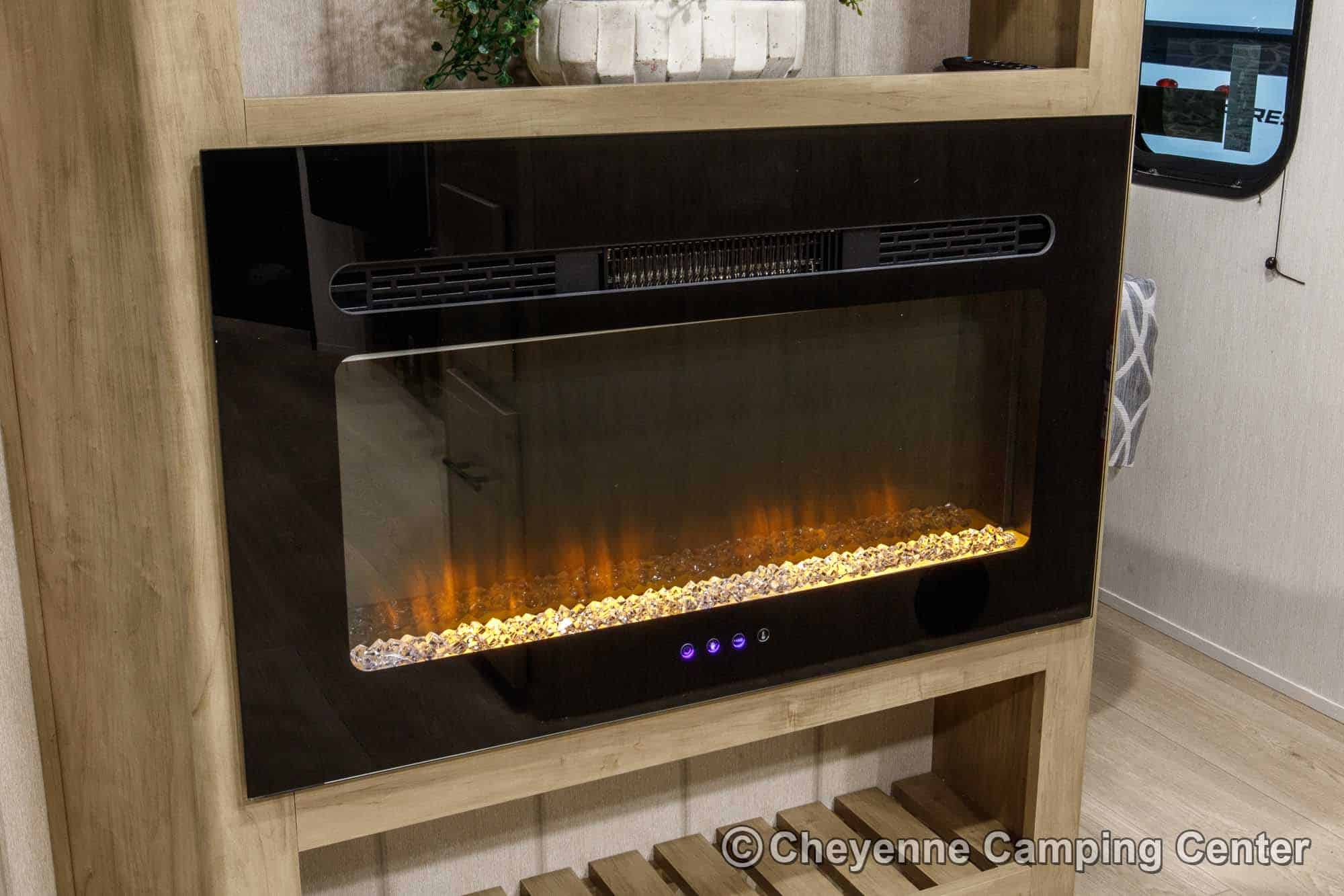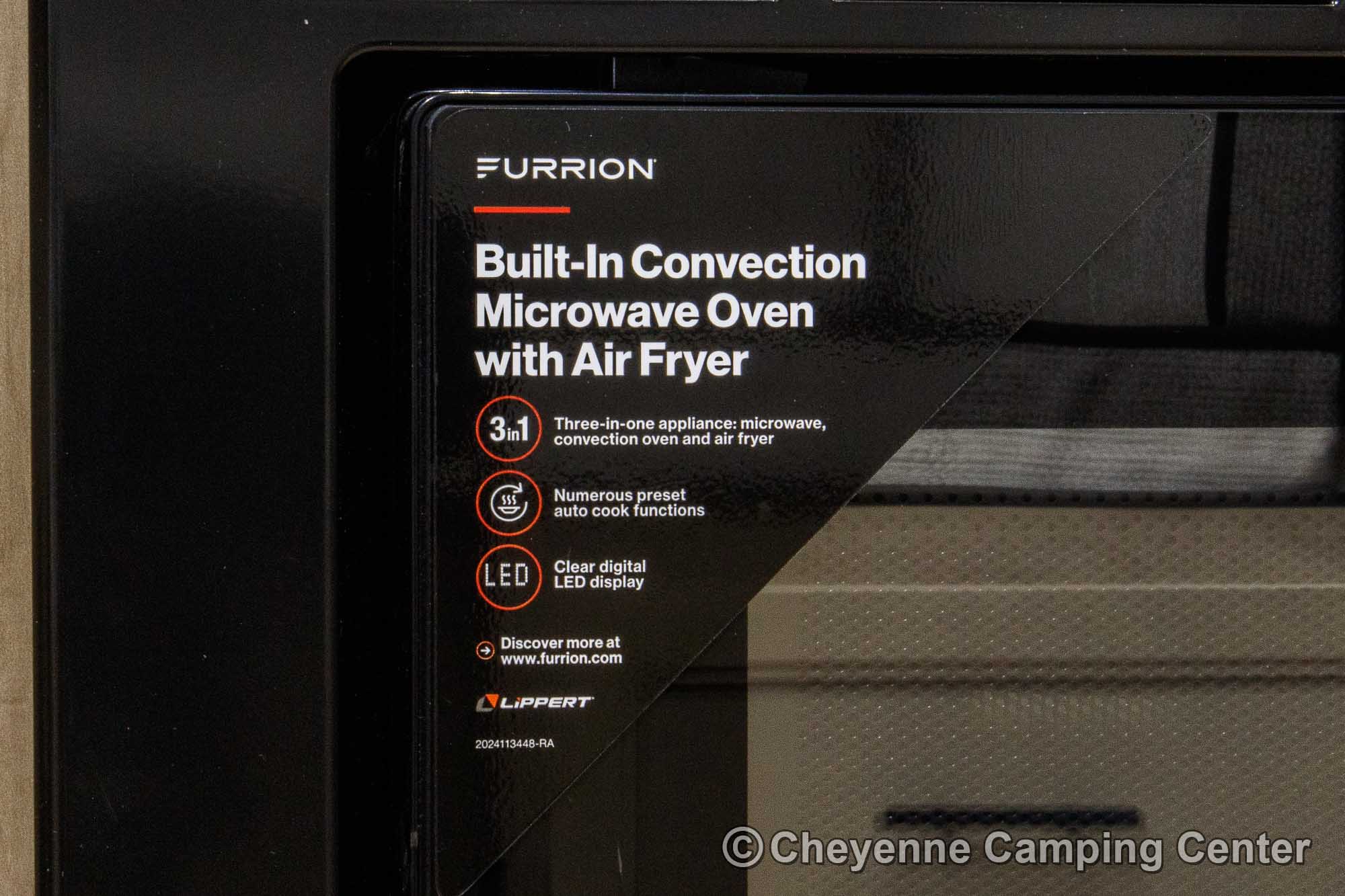 Inside, you’ll have sleeping for up to 7 with double over double bunks, a convertible dinette, and an RV king bed. The living room features an entertainment center with 32′ HD TV, Bluetooth media receiver, and fireplace. The kitchen includes a 10.6 cubic foot 12V refrigerator, a large undermount sink and residential-style faucet, glass rinsing fixture, gas cooktop, microwave/convection oven with air fryer, and large pantry.