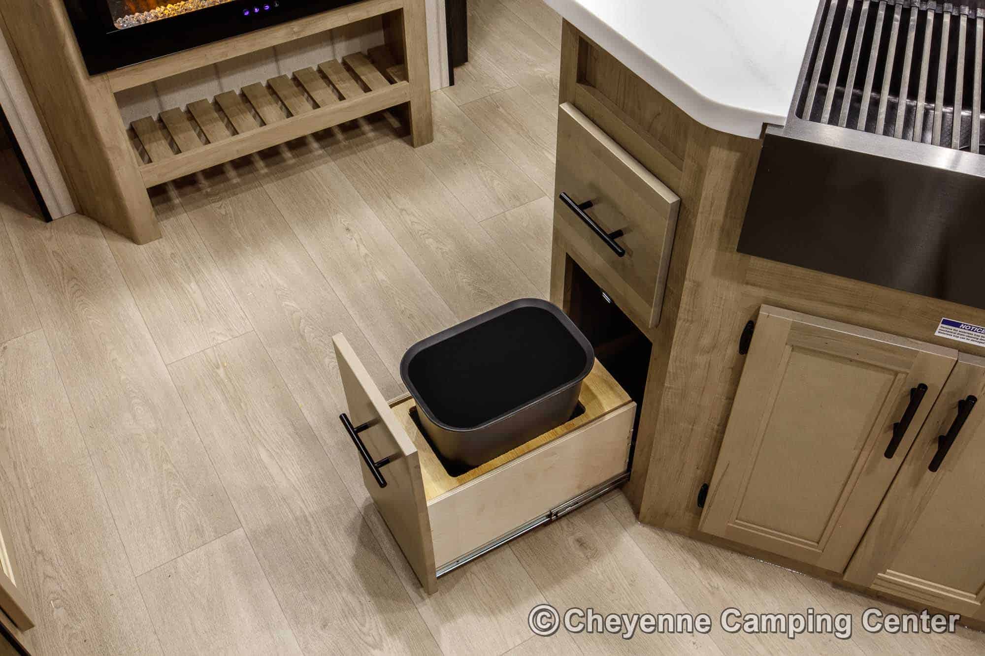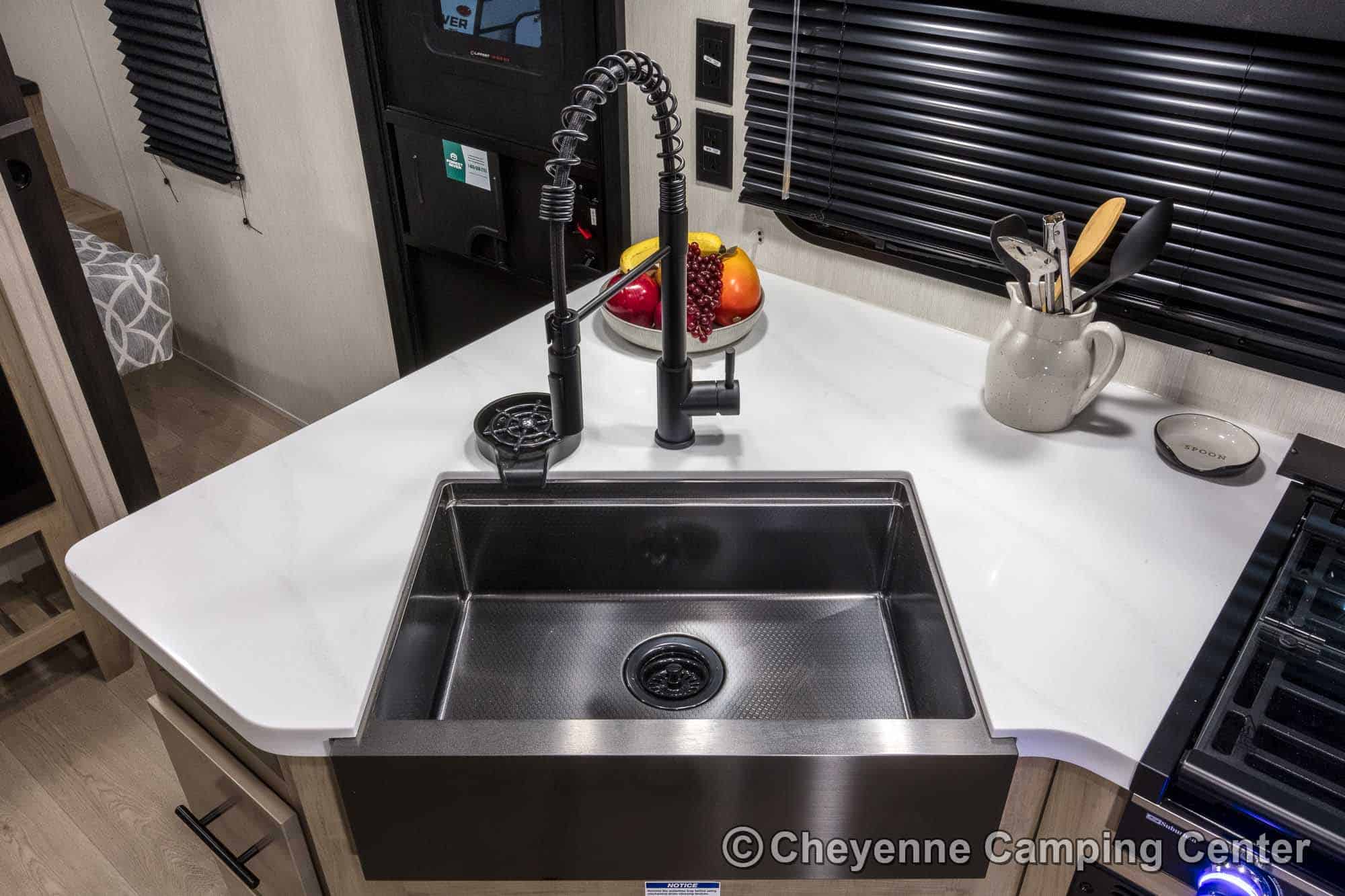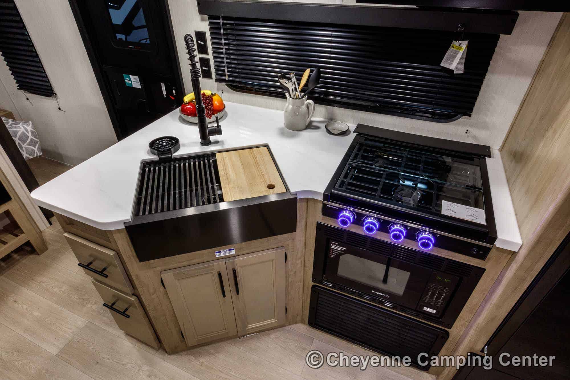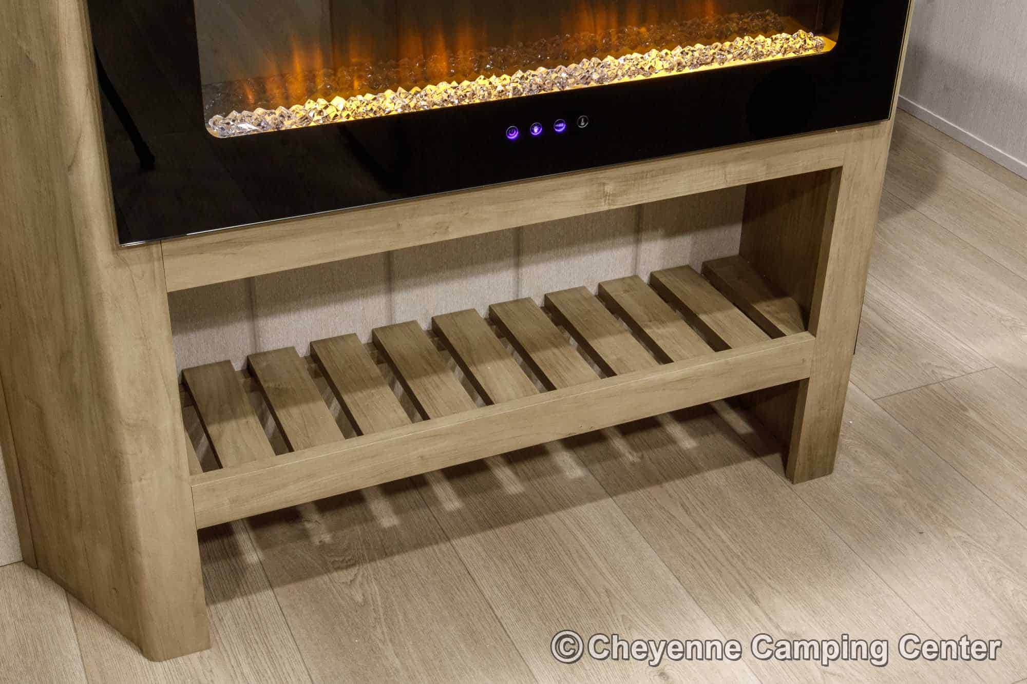 Inside, you’ll have sleeping for up to 7 with double over double bunks, a convertible dinette, and an RV king bed. The living room features an entertainment center with 32′ HD TV, Bluetooth media receiver, and fireplace. The kitchen includes a 10.6 cubic foot 12V refrigerator, a large undermount sink and residential-style faucet, glass rinsing fixture, gas cooktop, microwave/convection oven with air fryer, and large pantry.