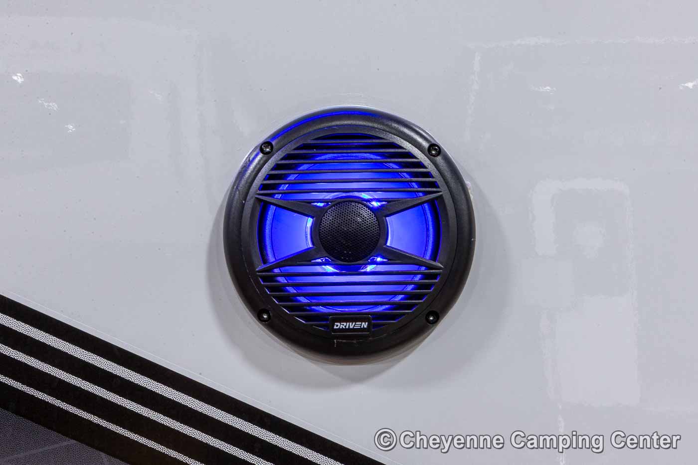 Outside, the 23MKBL features marine-grade speakers, a folding rear cargo rack, an exterior hot/cold shower, a black tank flush, a 200-watt solar system, a power awning with integrated LED lighting, MORryde entry steps with a Lend-A-Hand assist handle, a spare tire, power stabilizer jacks, and a large drop-frame storage compartment.