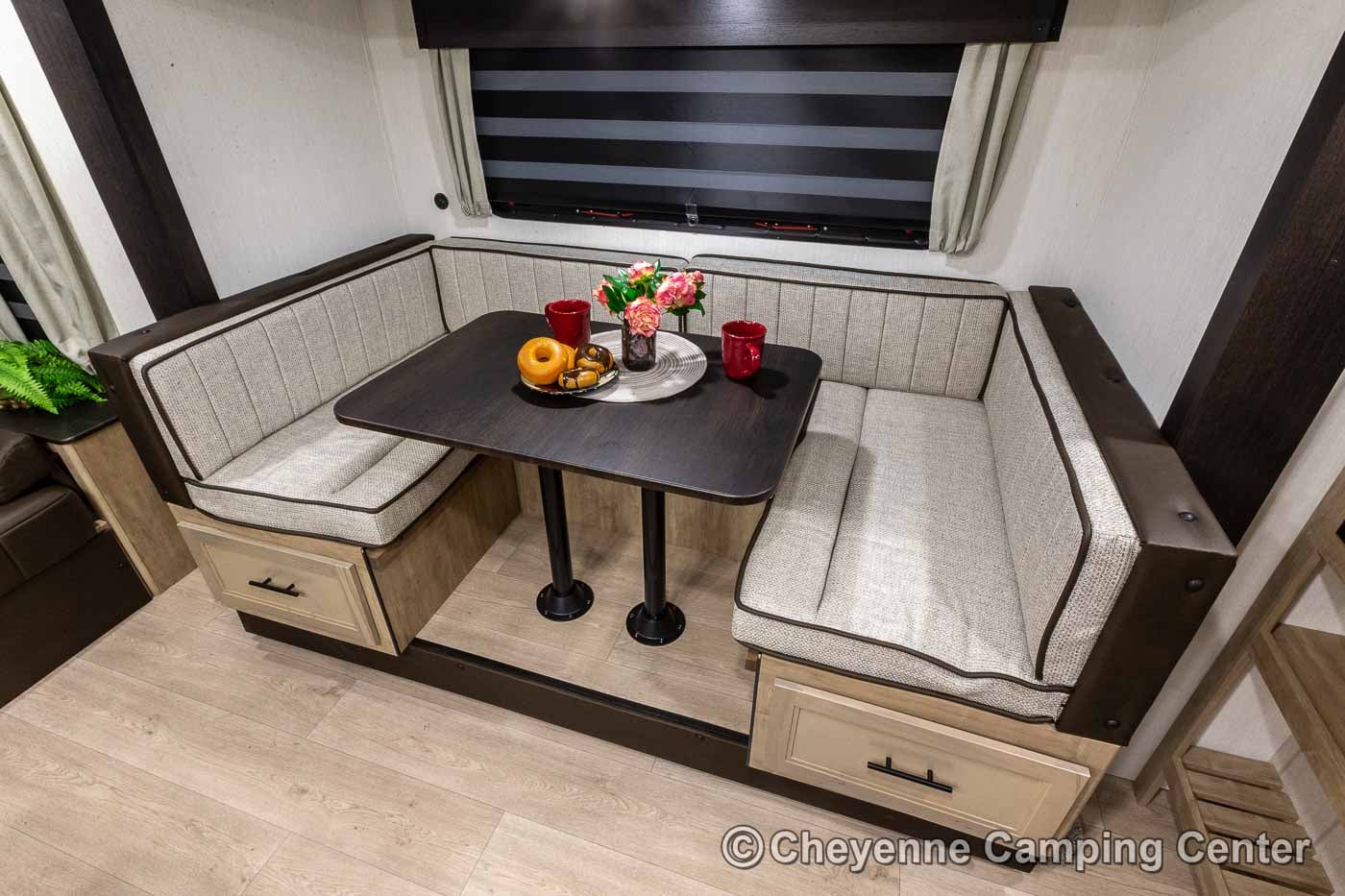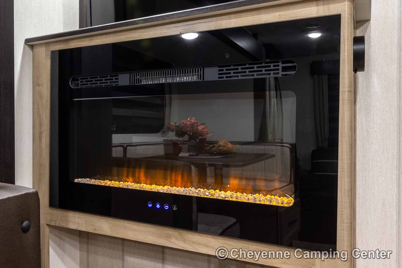 Other features include solid surface countertops, a large U-shaped dinette, and premium zebra shades, along with modern touches like USB charge ports, a Bluetooth stereo, and interior LED accent lighting, a ducted 15K BTU air conditioner, an electric fireplace with heat, and a premium vent fan.
