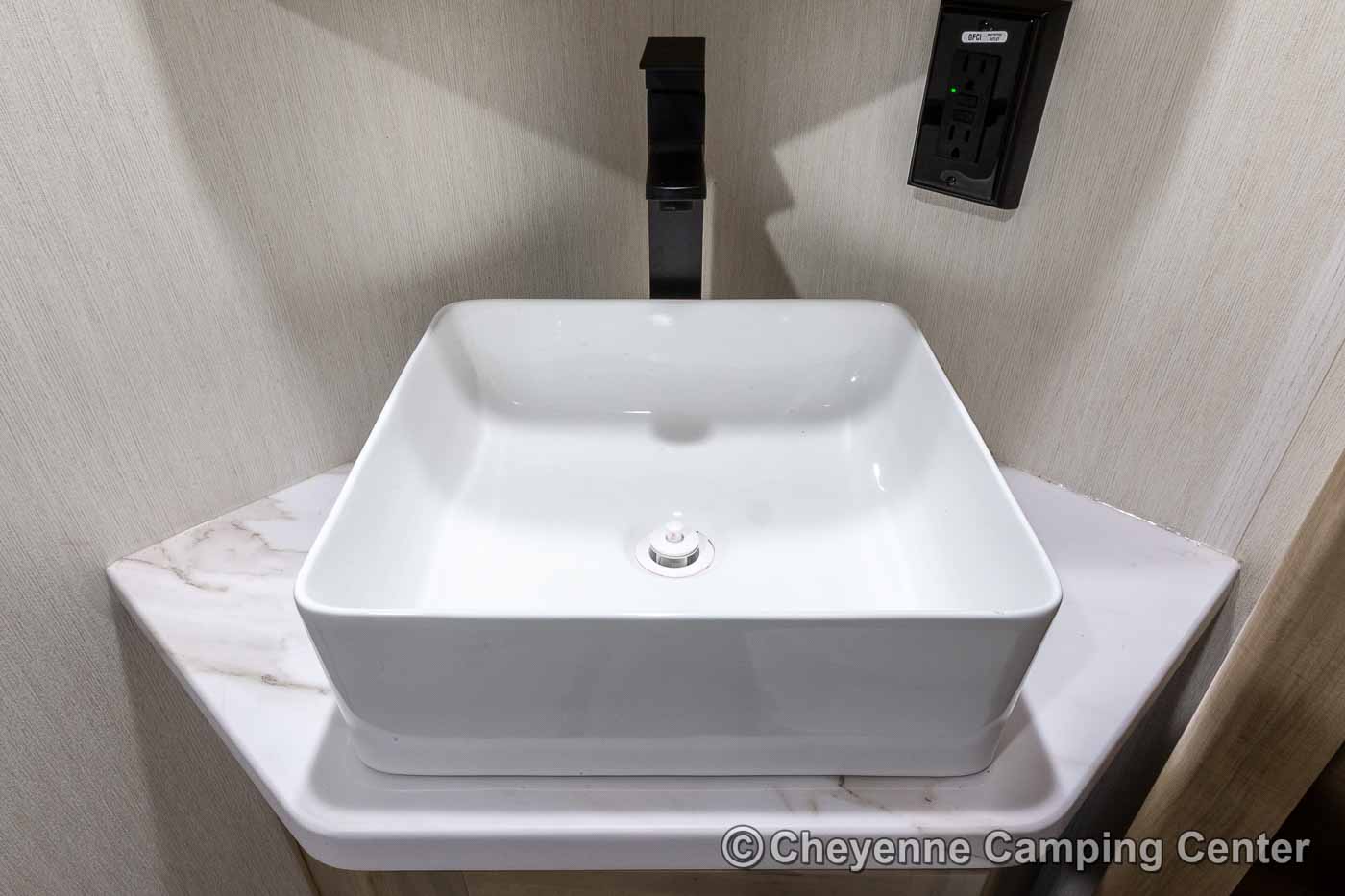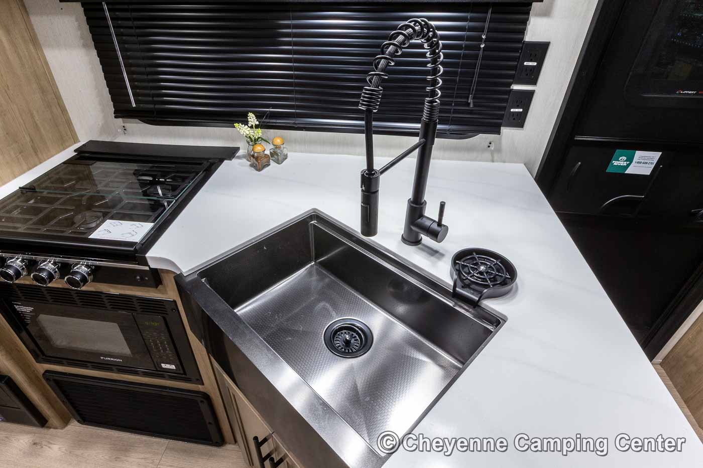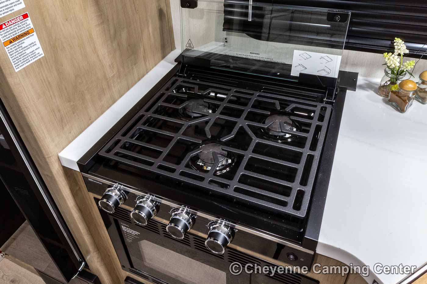 The Black Label Edition features premium fiberglass siding and frameless windows for a sleek look, while the Thermo Foil insulation keeps you cozy. The hands-free magnetic baggage door catch offers yet another level of convenience. You’ll also enjoy solid surface countertops, a beautifully upgraded shower fixture, designer cushion fabric, and upgraded reading lights that enhance your camping experience.