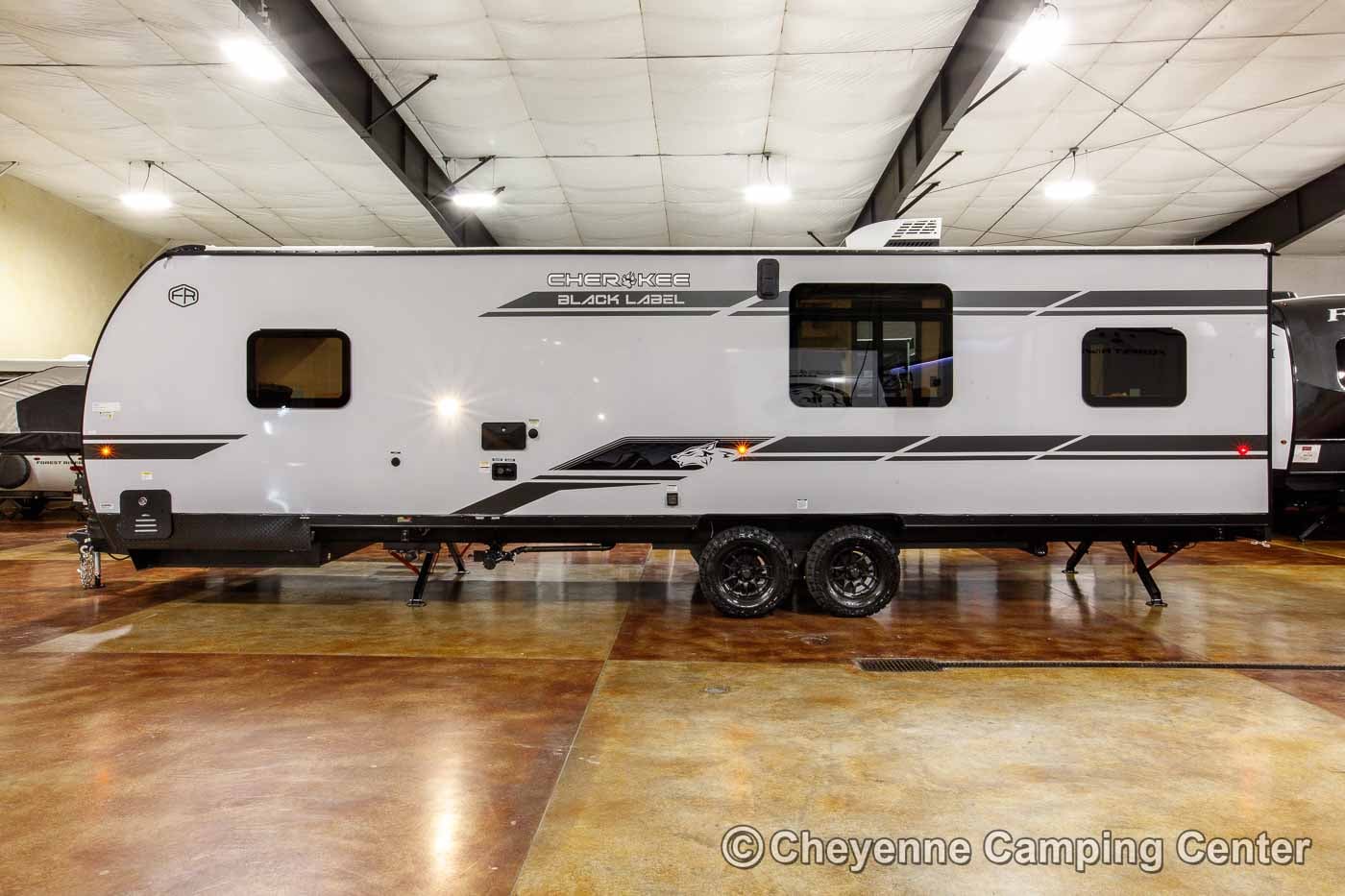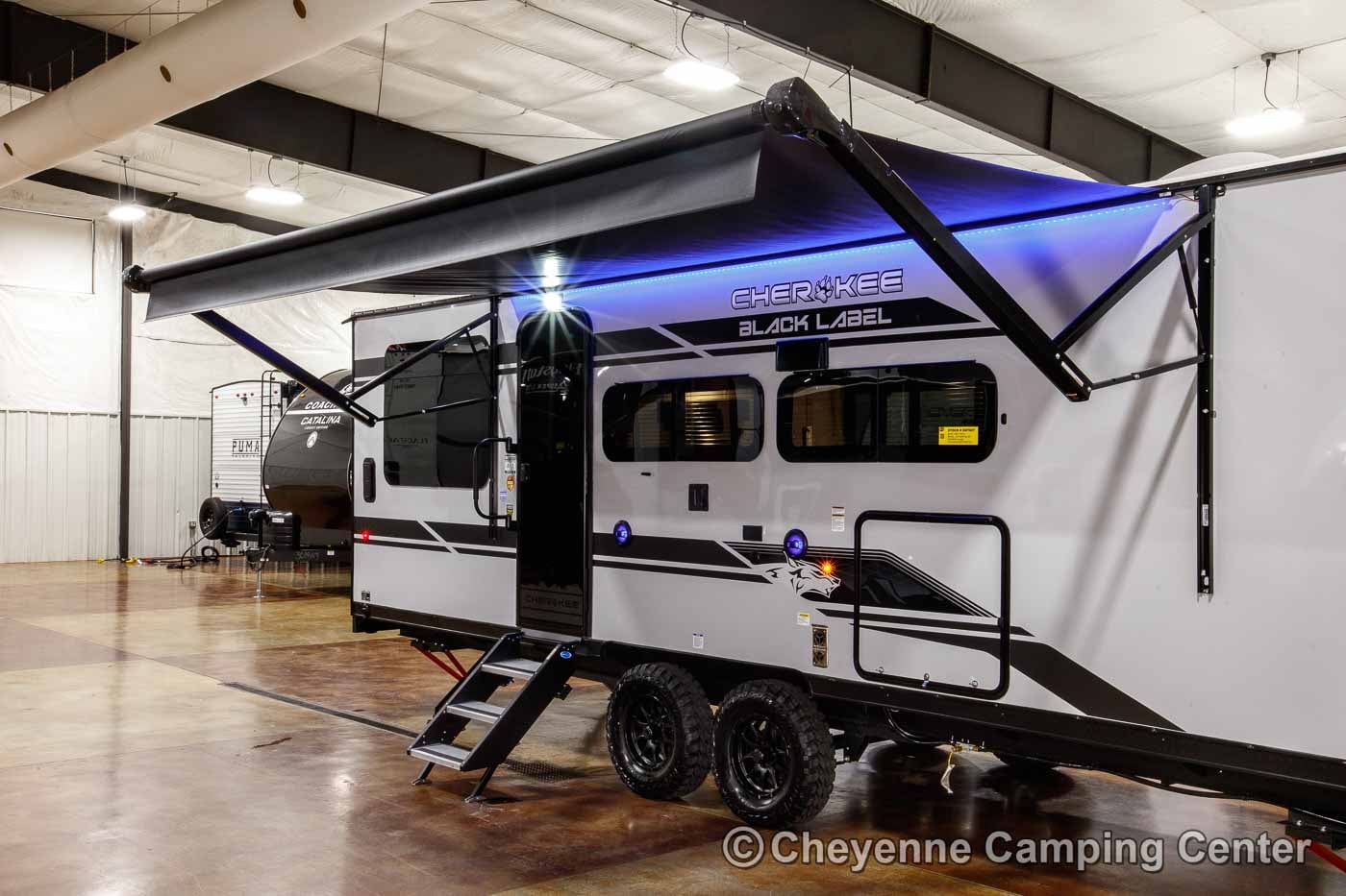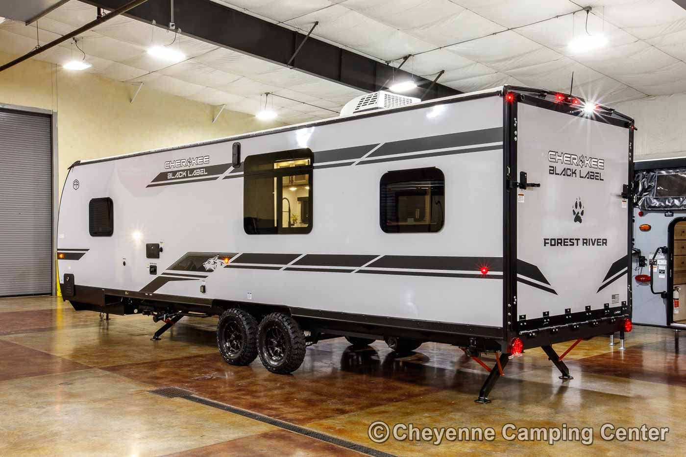 The 2026 Forest River Cherokee Grey Wolf Black Label 24RRTBL features a 13′ x 60” cargo area with a large door, screen enclosure, and ramp patio deck! The Black Label Edition includes a fiberglass exterior, frameless windows, solid surface counters, upgraded fixtures, and more!