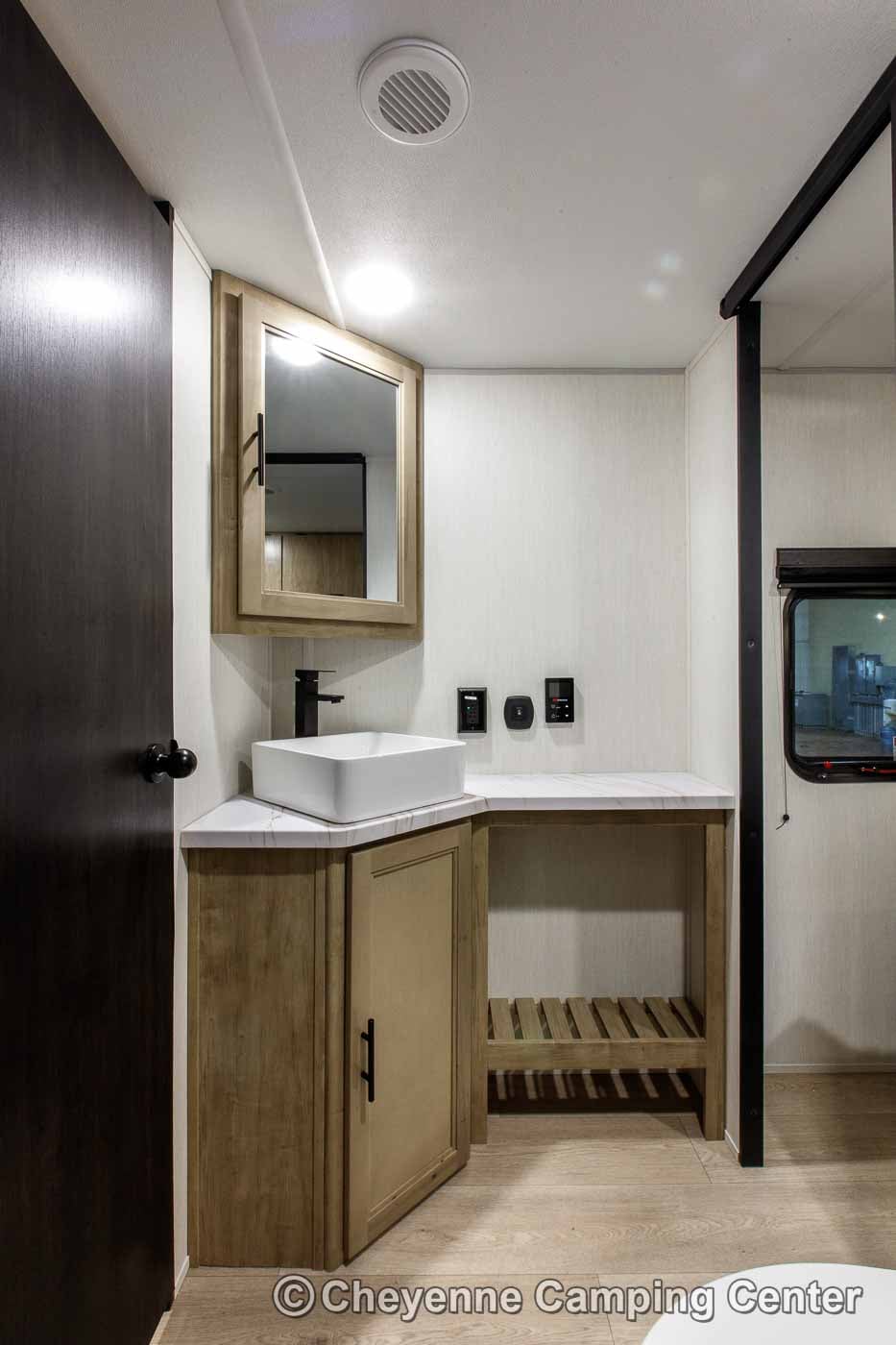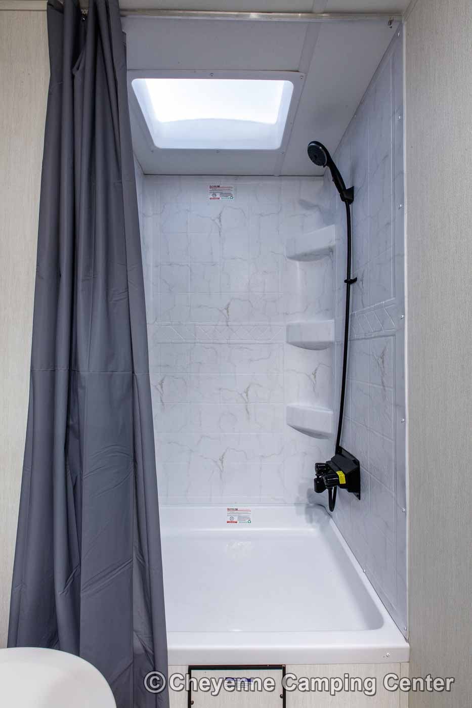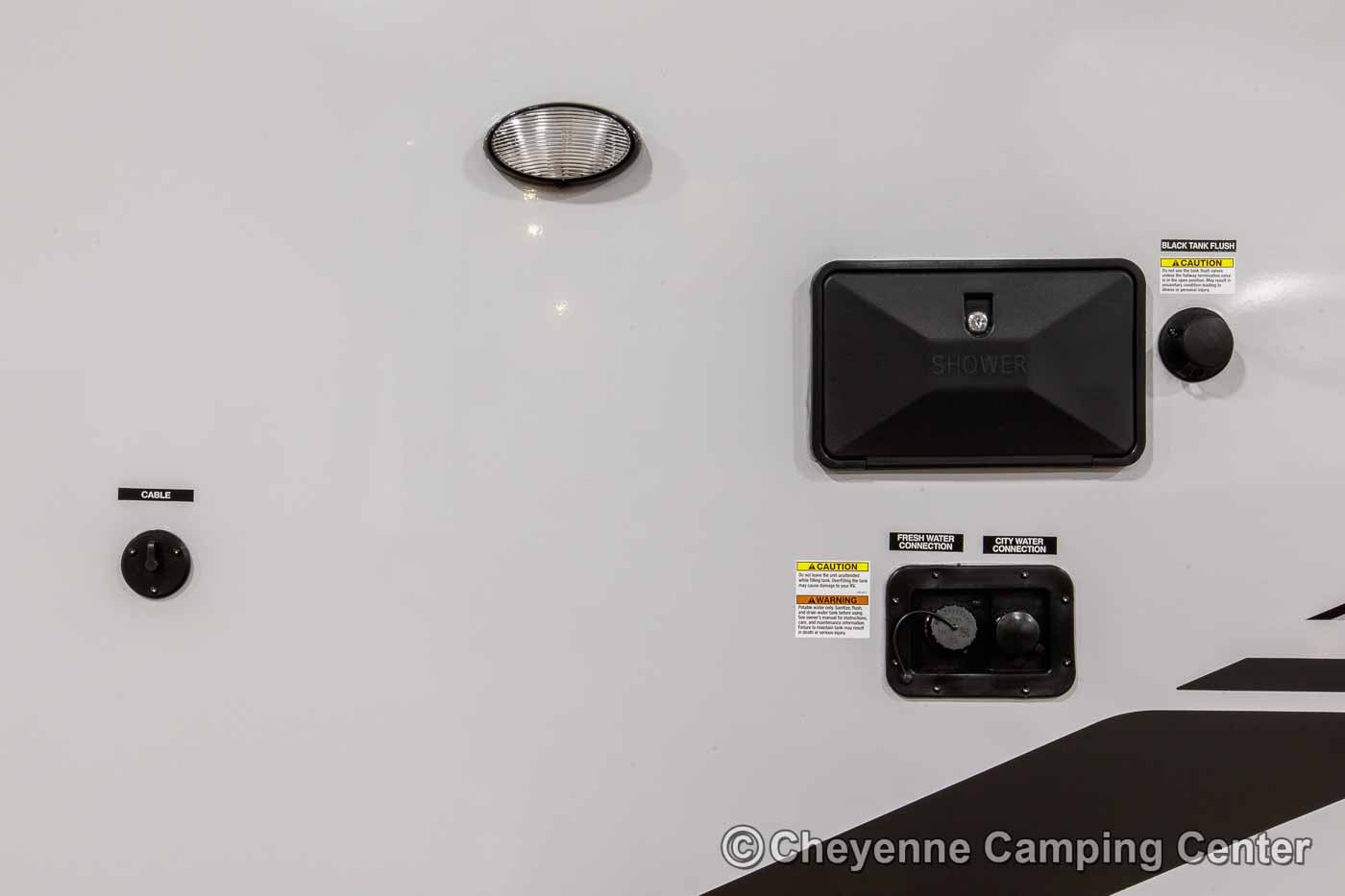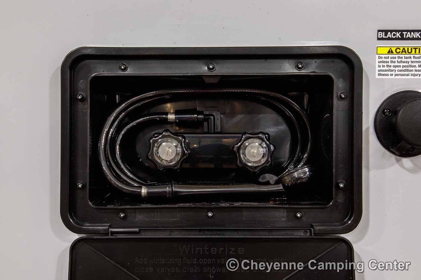 The full bathroom includes a shower, foot-flush toilet, vanity, and a high-output vent fan. The private front bedroom with an RV king bed provides a cozy retreat after a long day of adventure. You’ll also enjoy peace of mind with a backup camera, black tank flush, and the security of a one-year manufacturer’s warranty plus one year of complimentary roadside assistance.