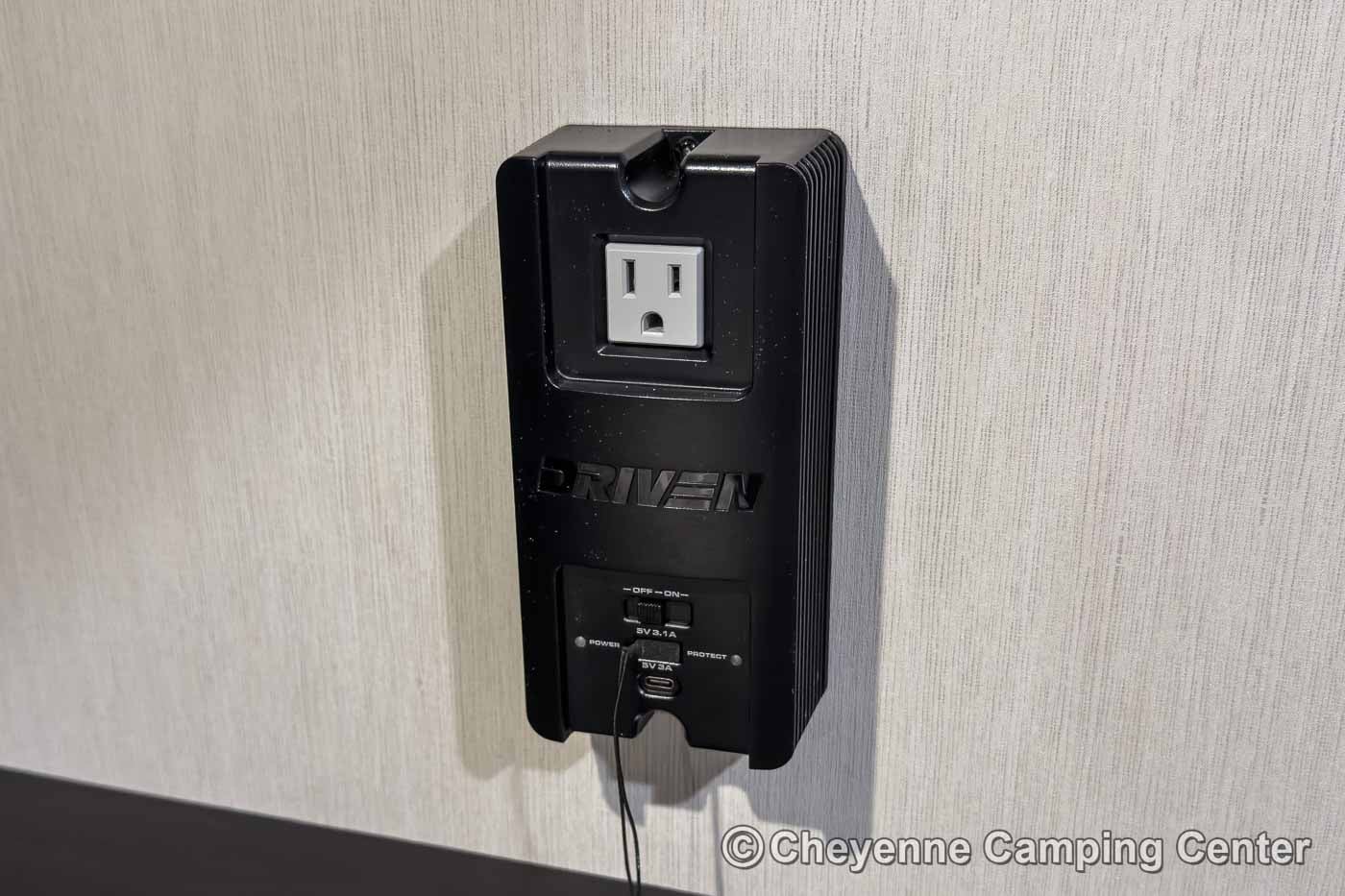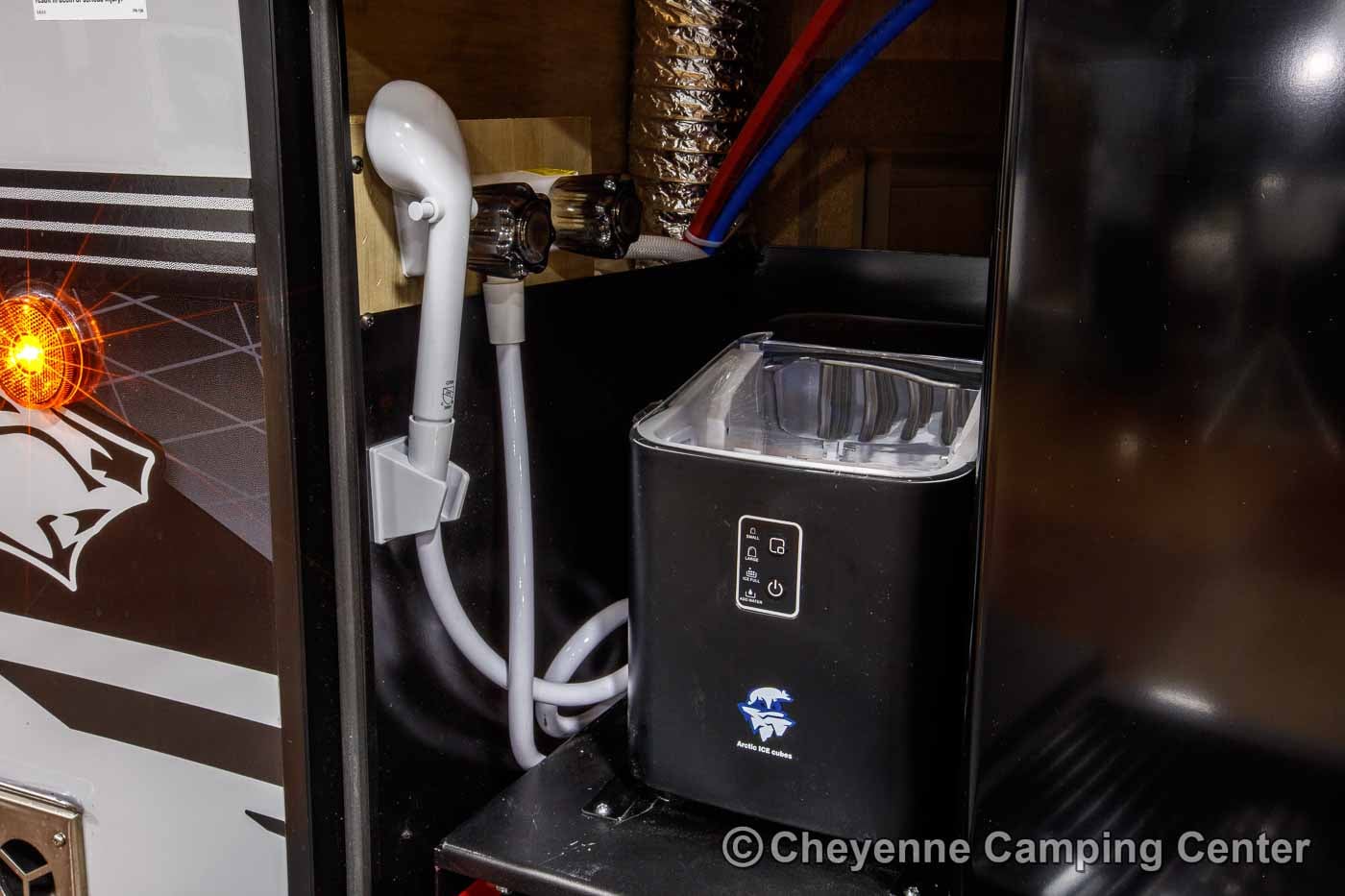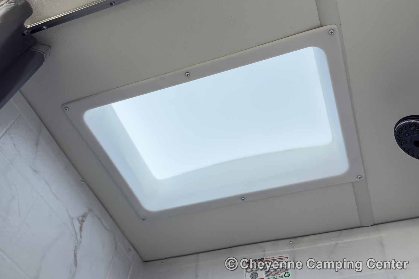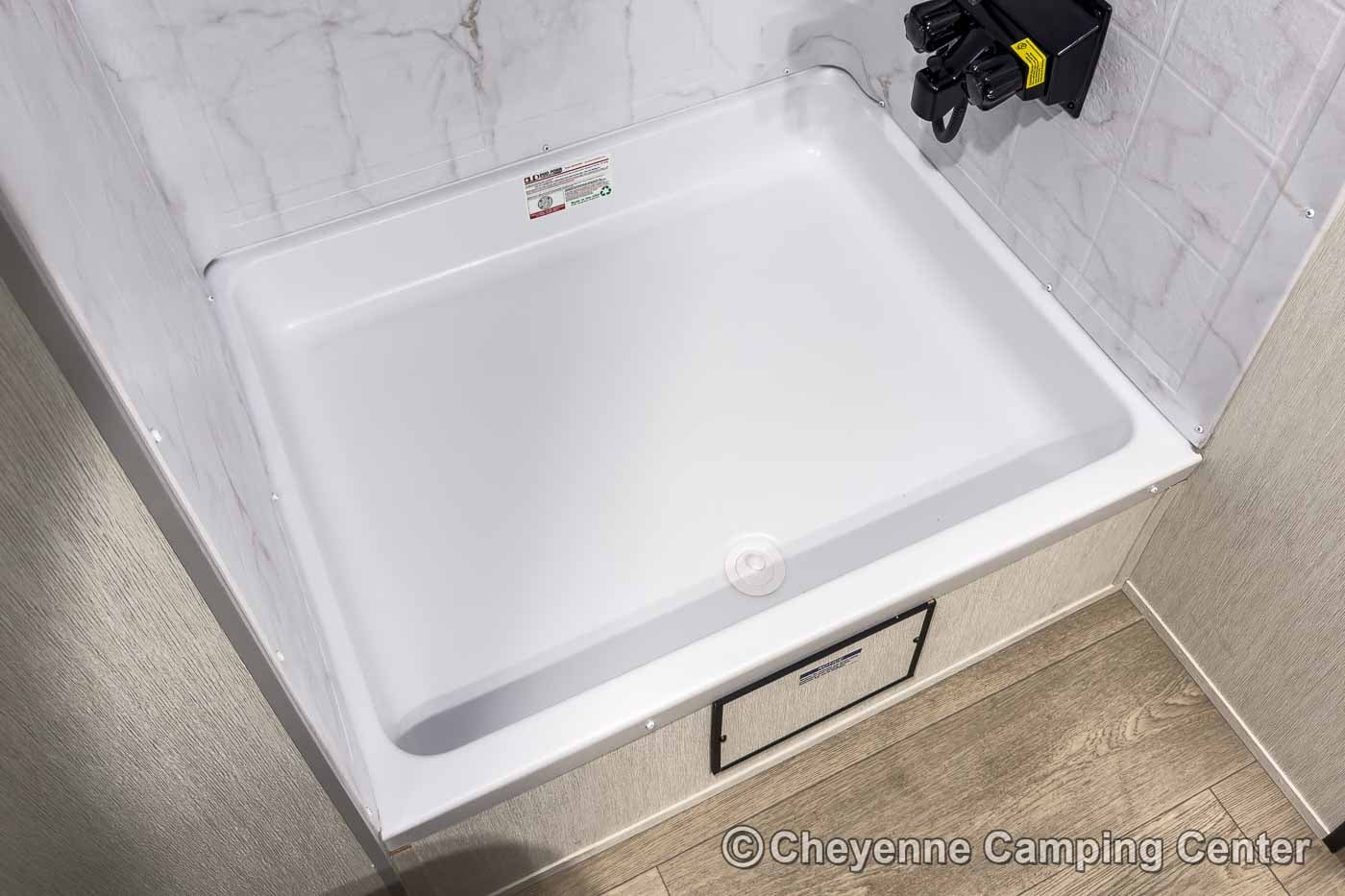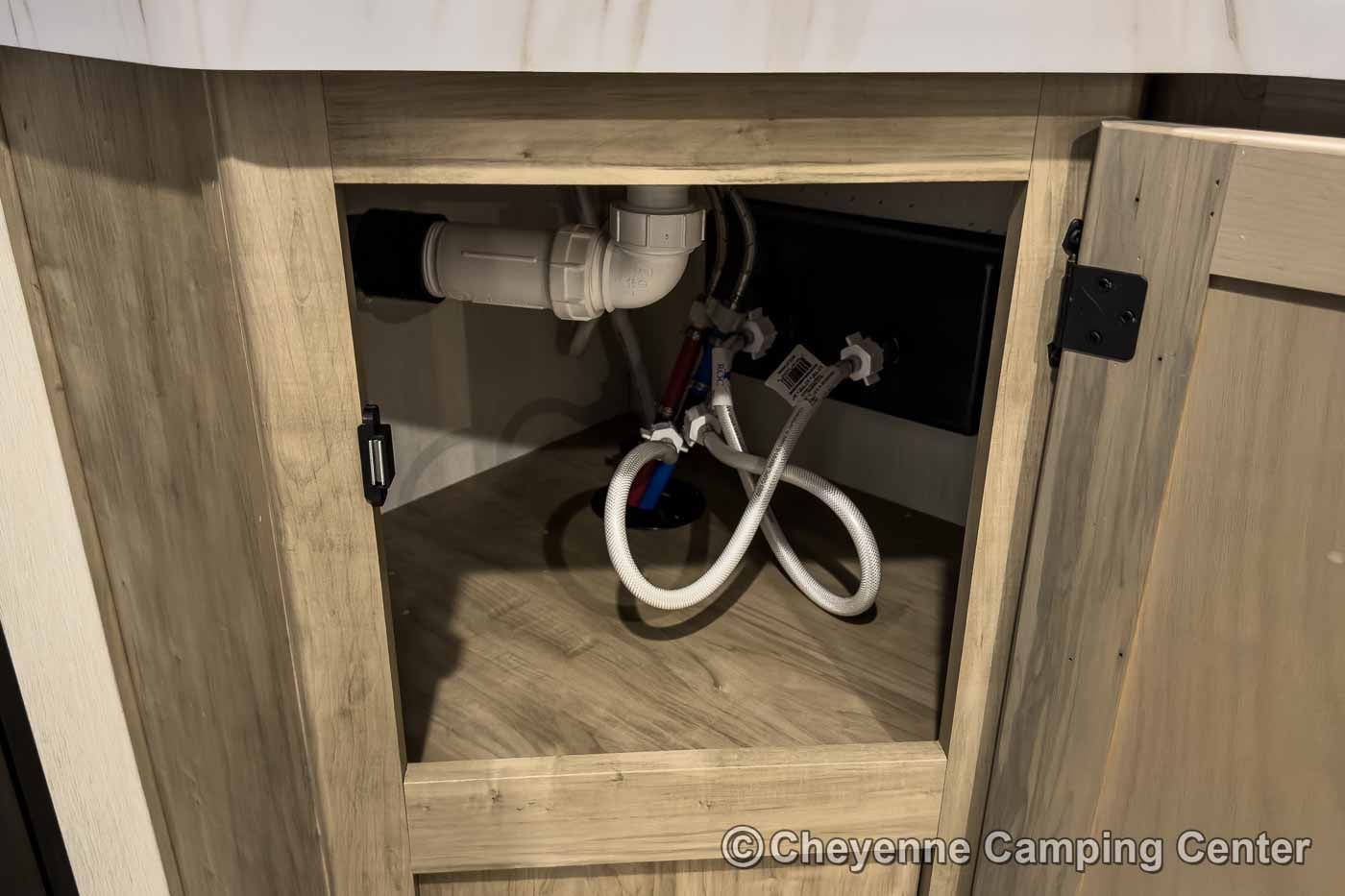 The full bathroom includes a shower, foot-flush toilet, vanity, and a high-output vent fan. The private front bedroom with an RV king bed provides a cozy retreat after a long day of adventure. You’ll also enjoy peace of mind with a backup camera, black tank flush, and the security of a one-year manufacturer’s warranty plus one year of complimentary roadside assistance.