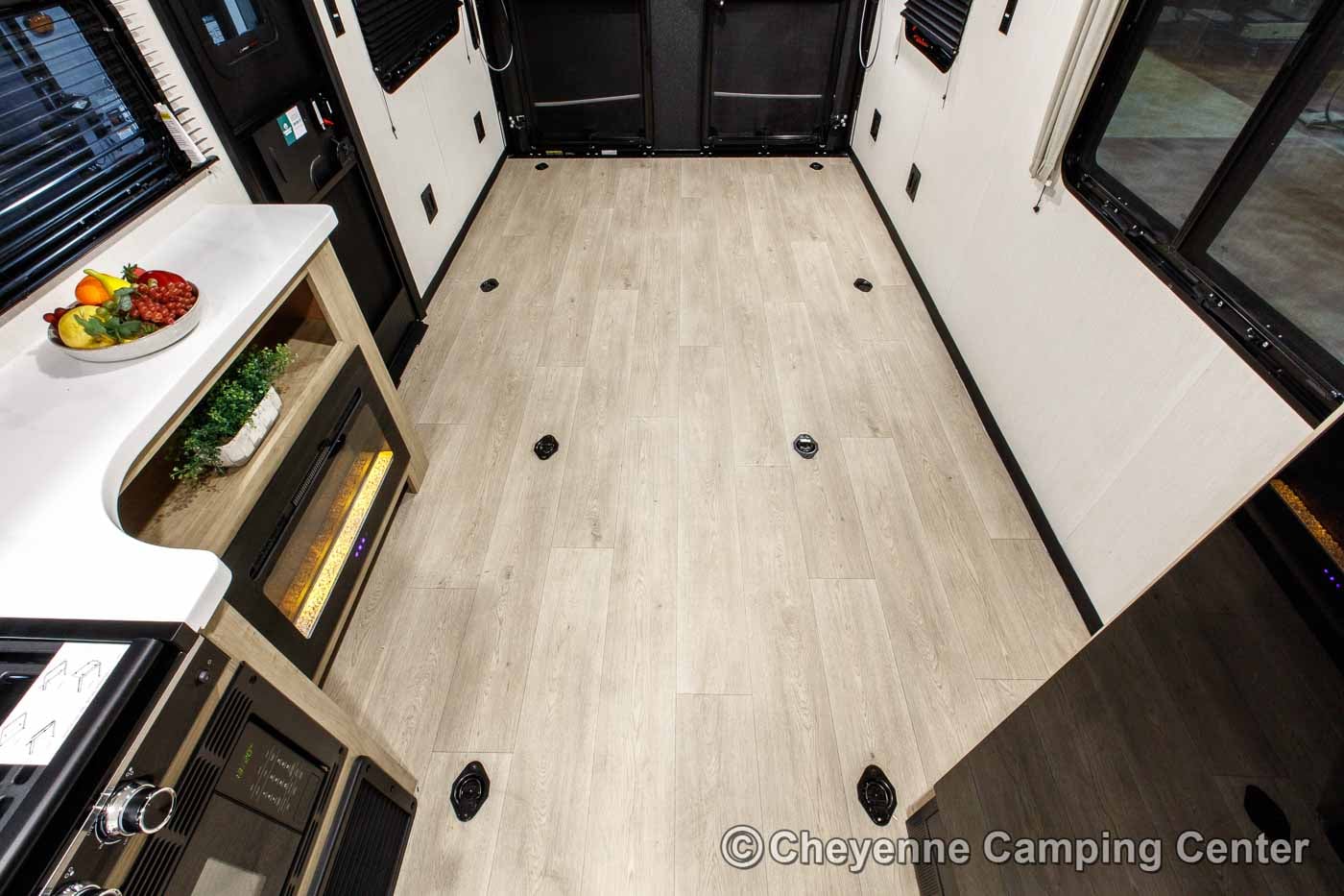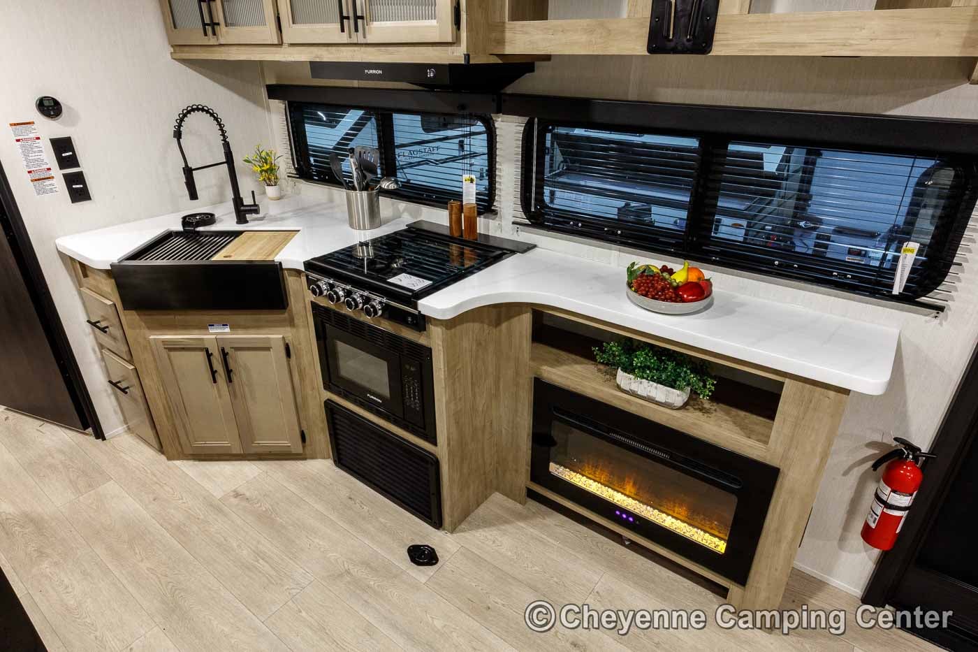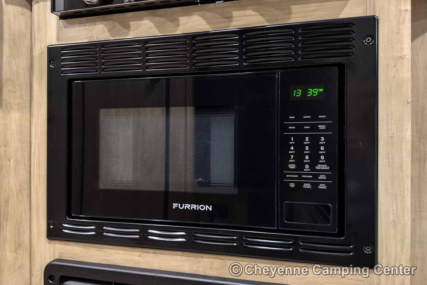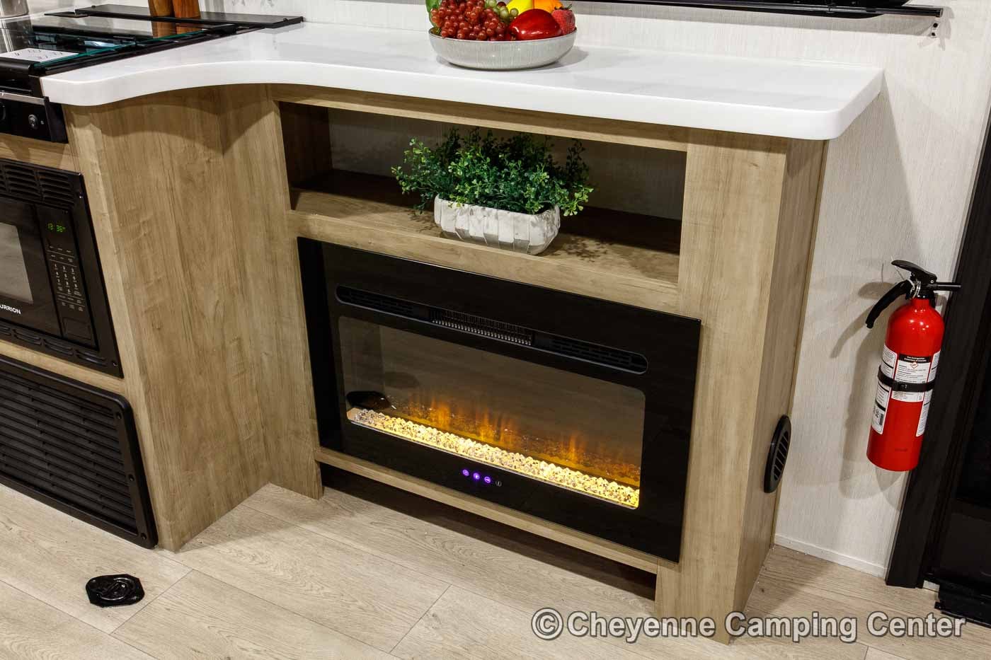 You’ll have premium features like a 15K BTU ducted air conditioner, tankless water heater, pleated window shades, a Bluetooth media receiver, and an electric fireplace. The spacious kitchen offers a large pantry and a 10 cu. ft. refrigerator, a microwave/convection oven with air fryer, an LP gas cooktop, and solid surface countertops.
