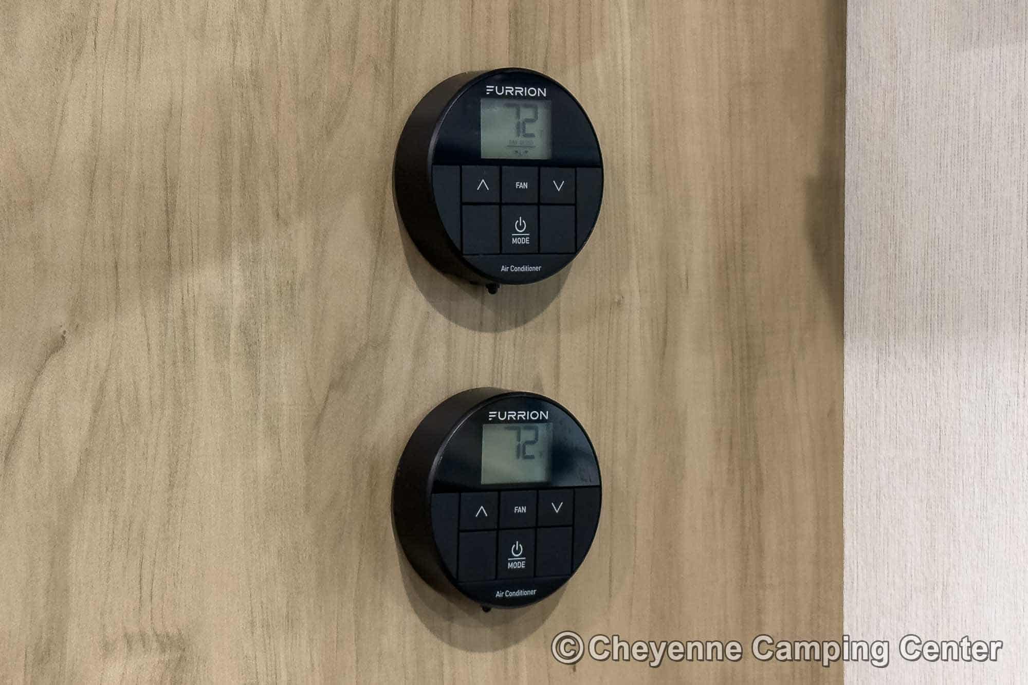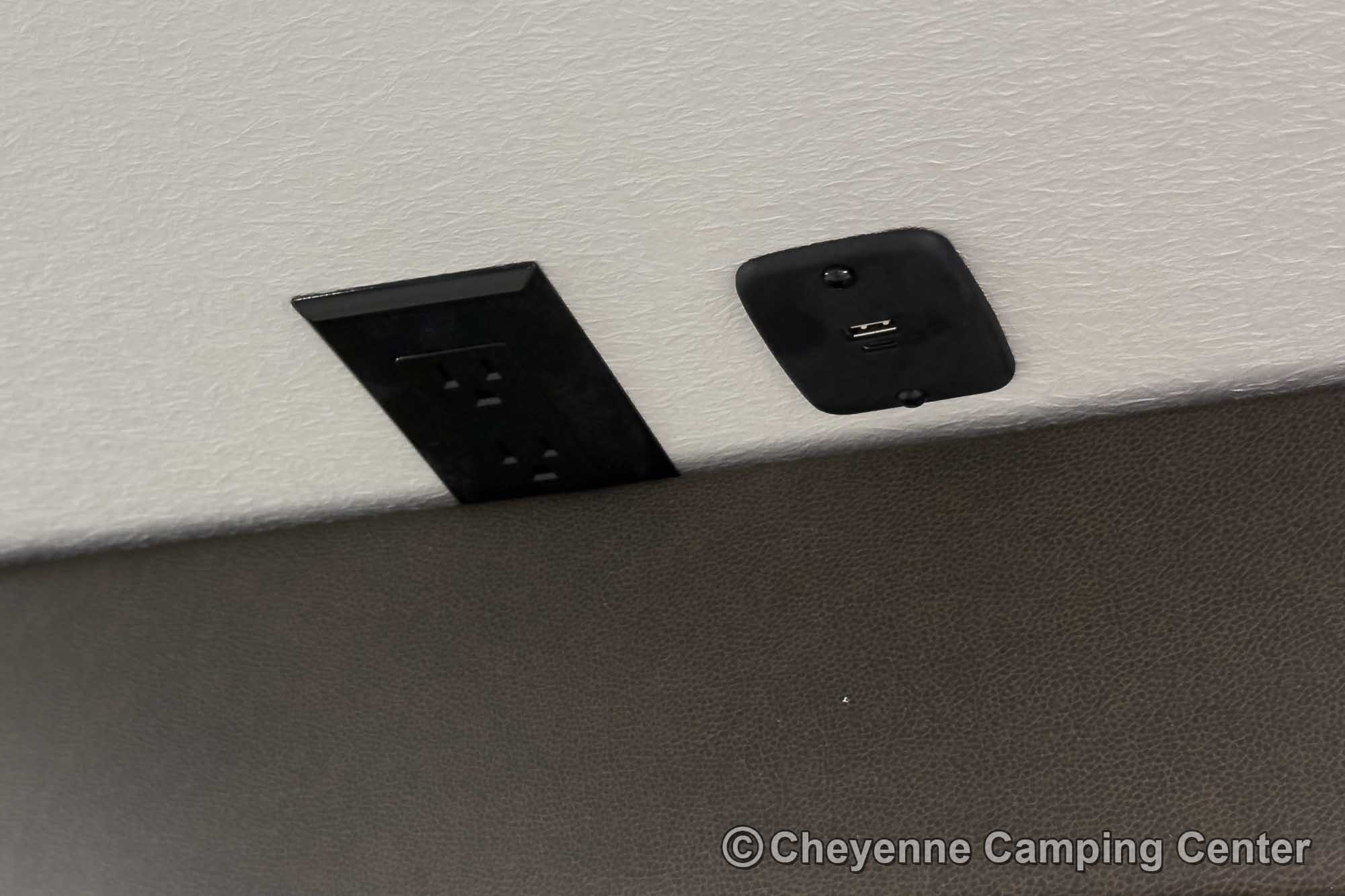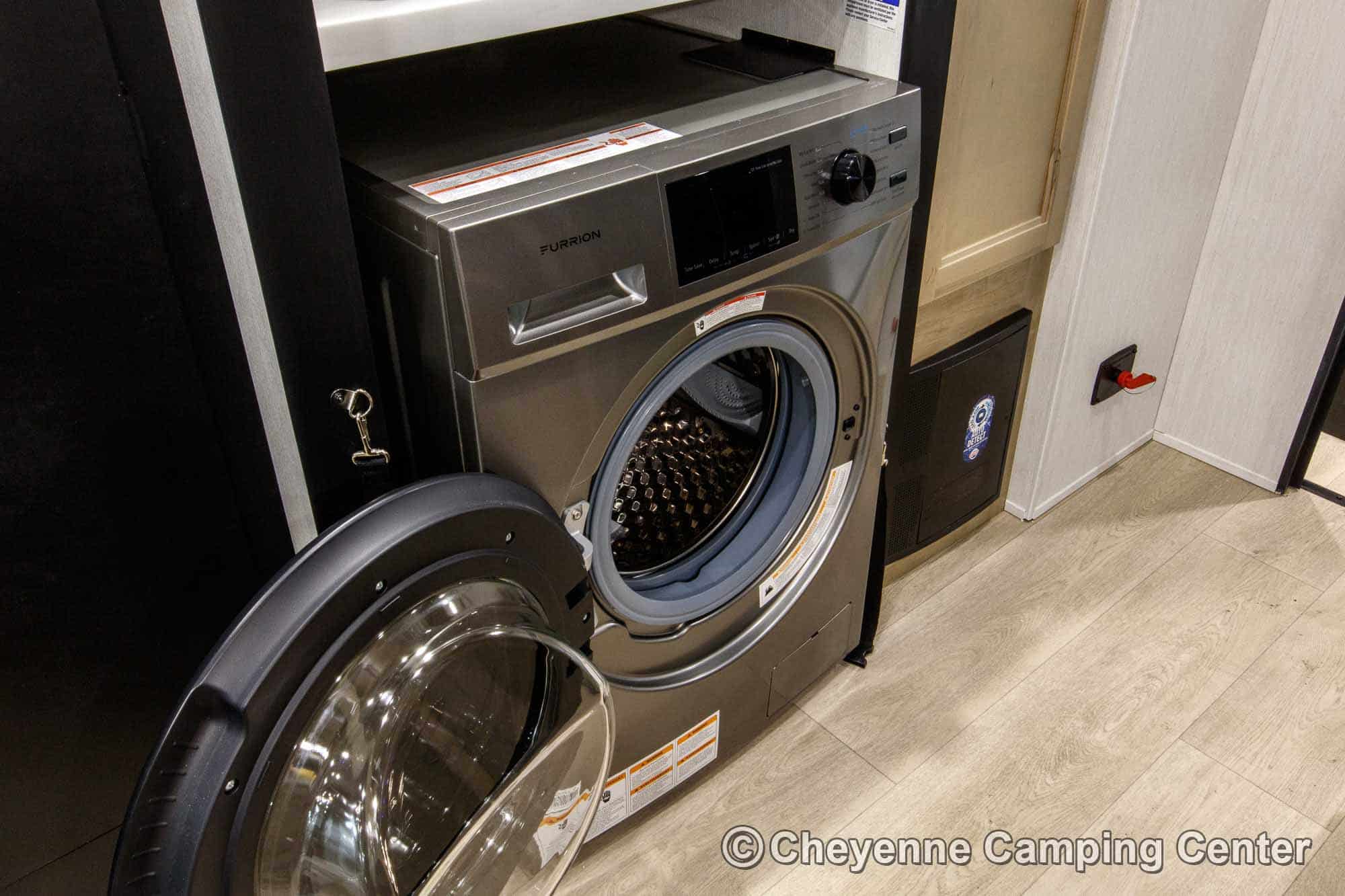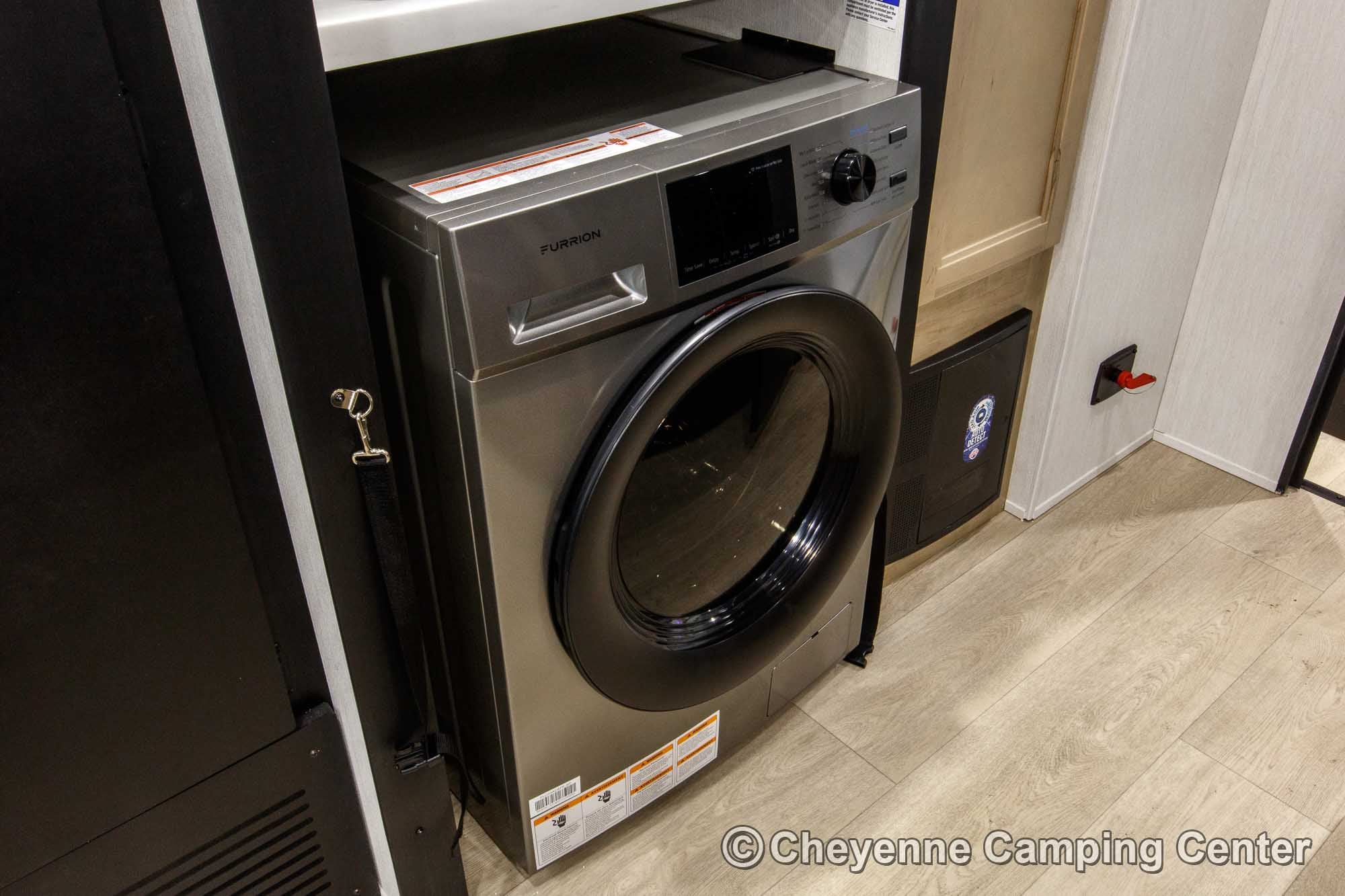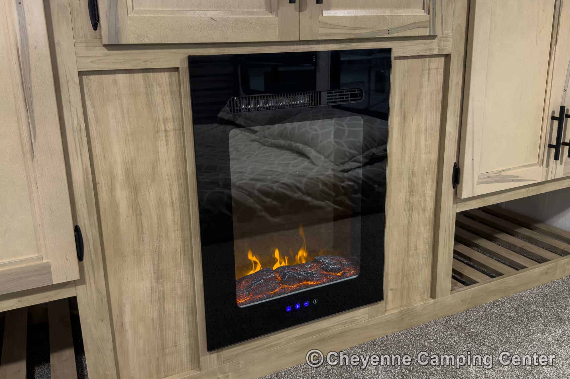 This extended-season RV includes heated holding tanks, two air conditioners, an LP gas furnace, a ceiling fan, and an electric fireplace for your comfort. Additional features include a washer/dryer combo, tankless water heater, Bluetooth media receiver, and USB charging ports.