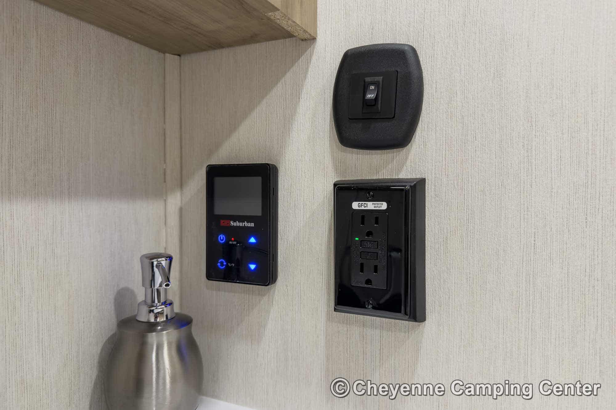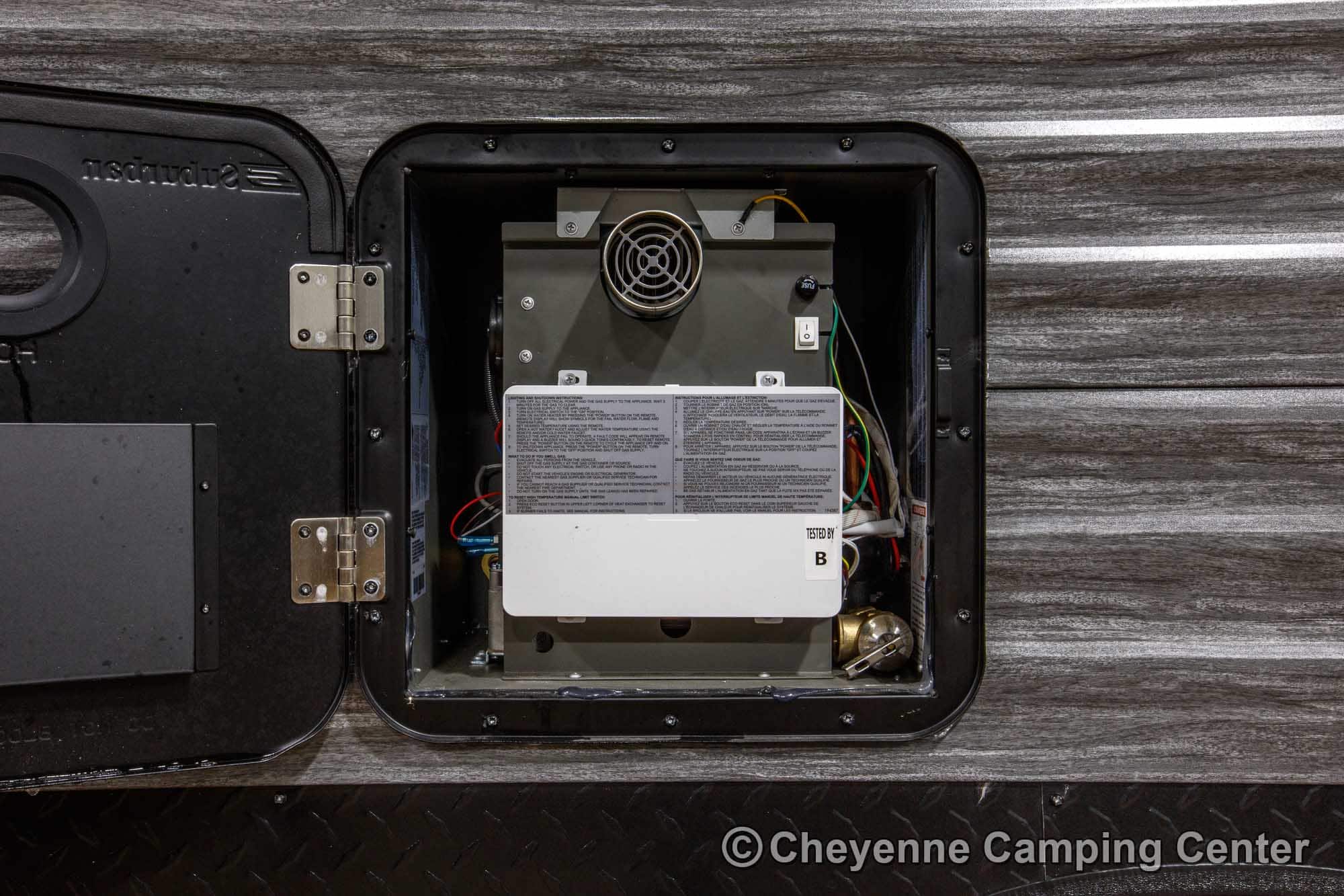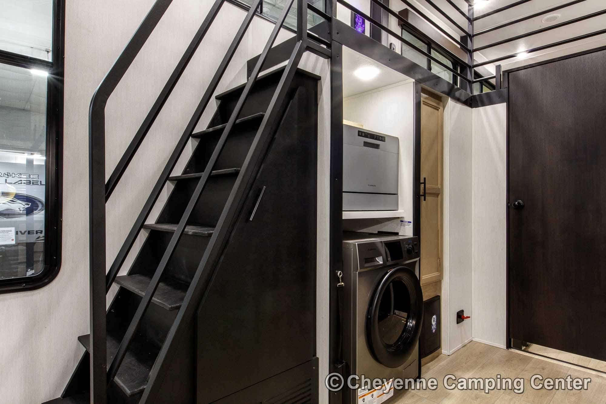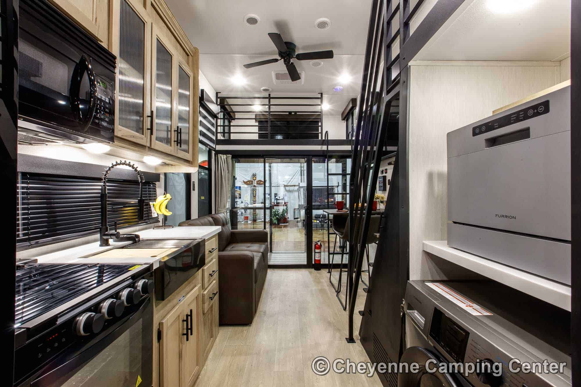 This extended-season RV includes heated holding tanks, two air conditioners, an LP gas furnace, a ceiling fan, and an electric fireplace for your comfort. Additional features include a washer/dryer combo, tankless water heater, Bluetooth media receiver, and USB charging ports.