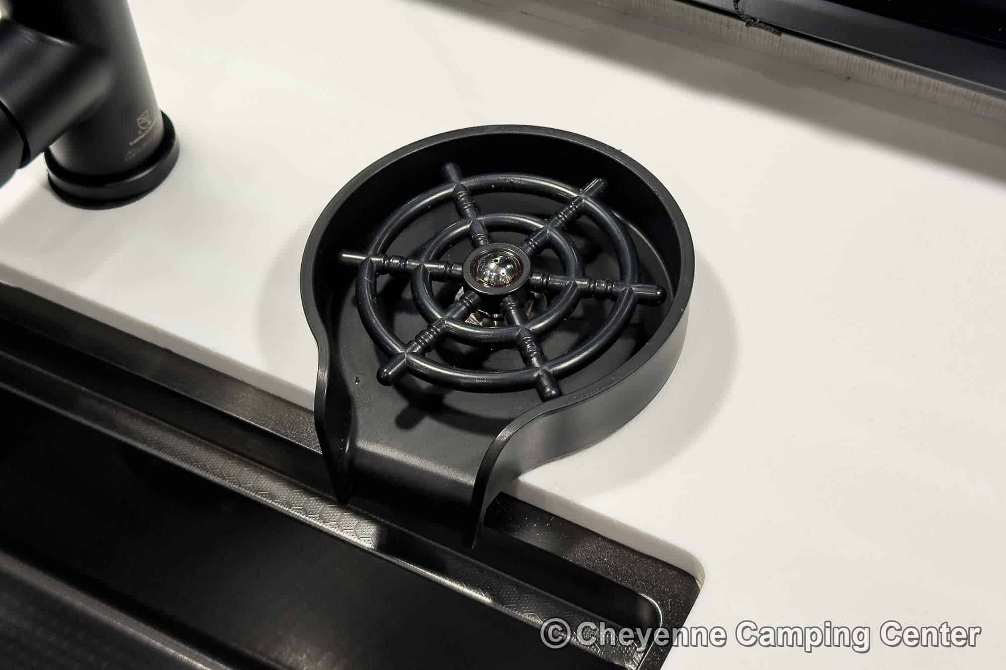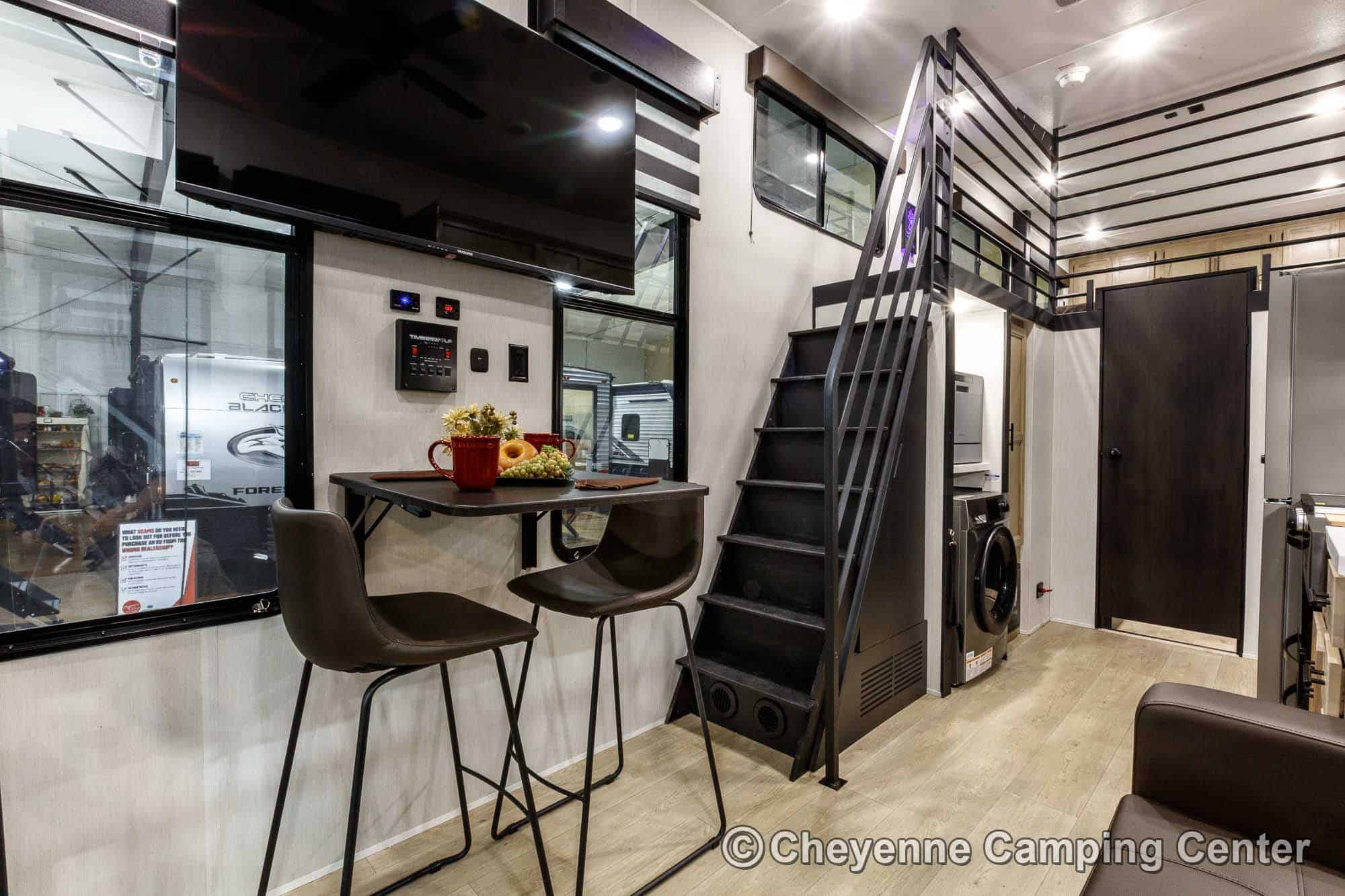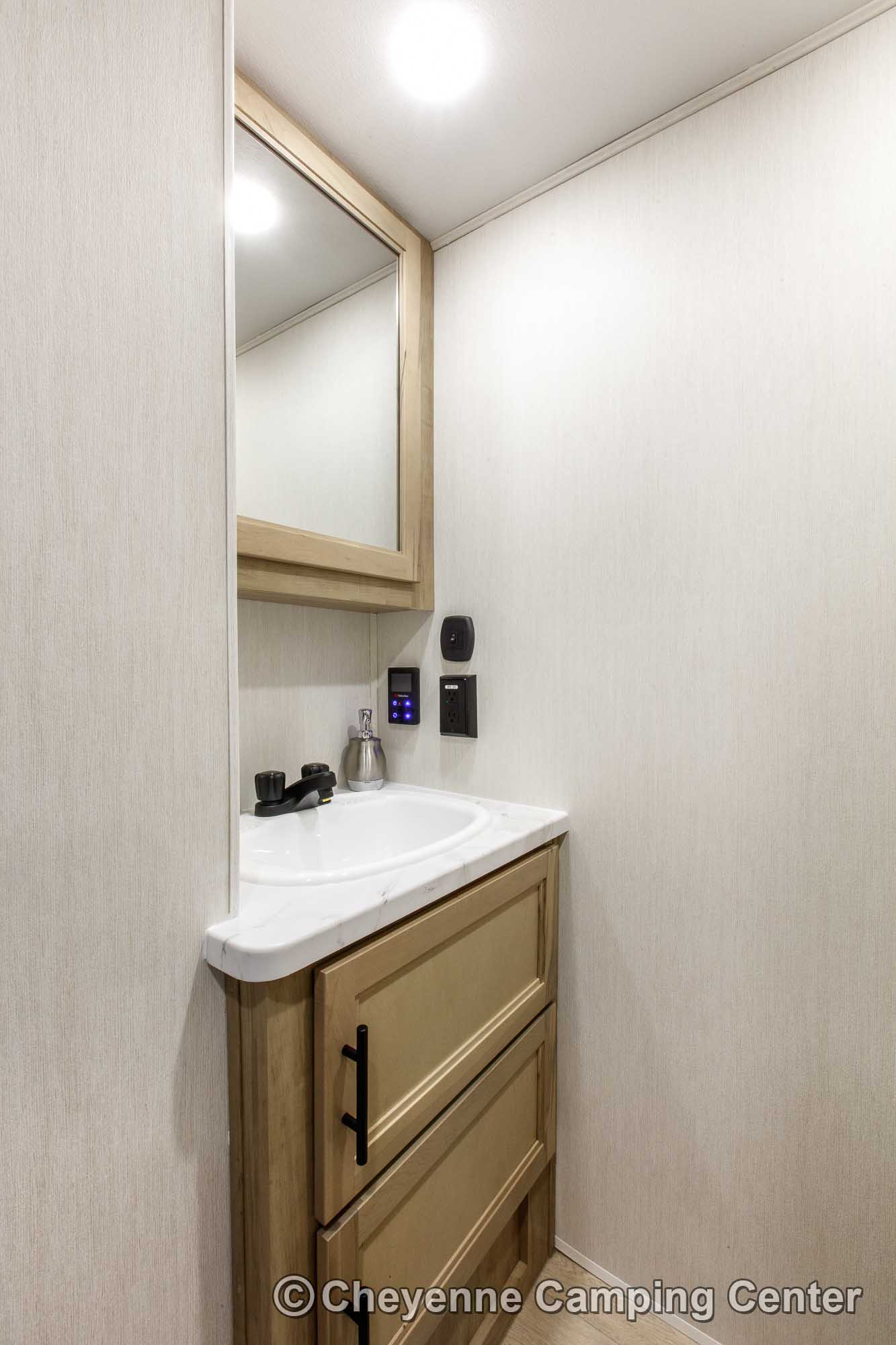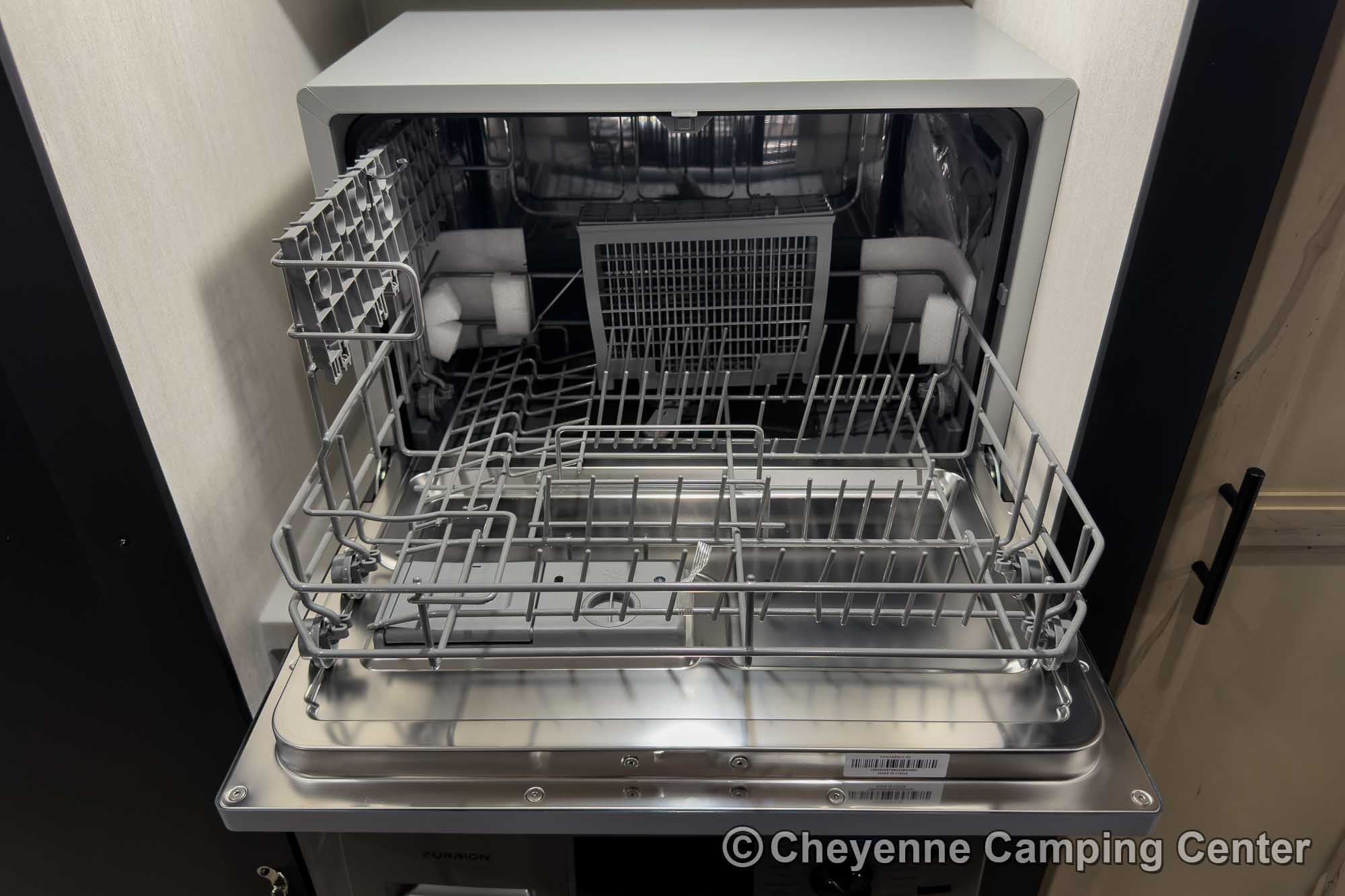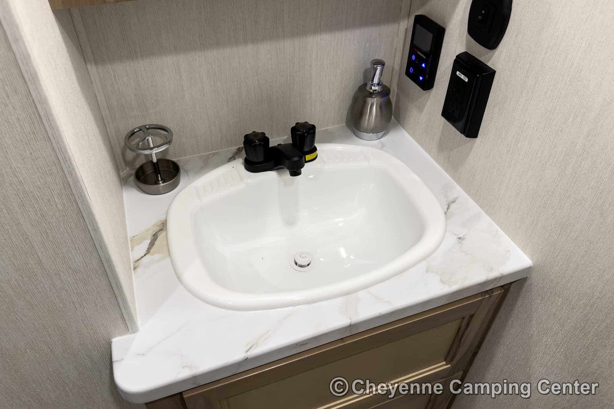 This extended-season RV includes heated holding tanks, two air conditioners, an LP gas furnace, a ceiling fan, and an electric fireplace for your comfort. Additional features include a washer/dryer combo, tankless water heater, Bluetooth media receiver, and USB charging ports.