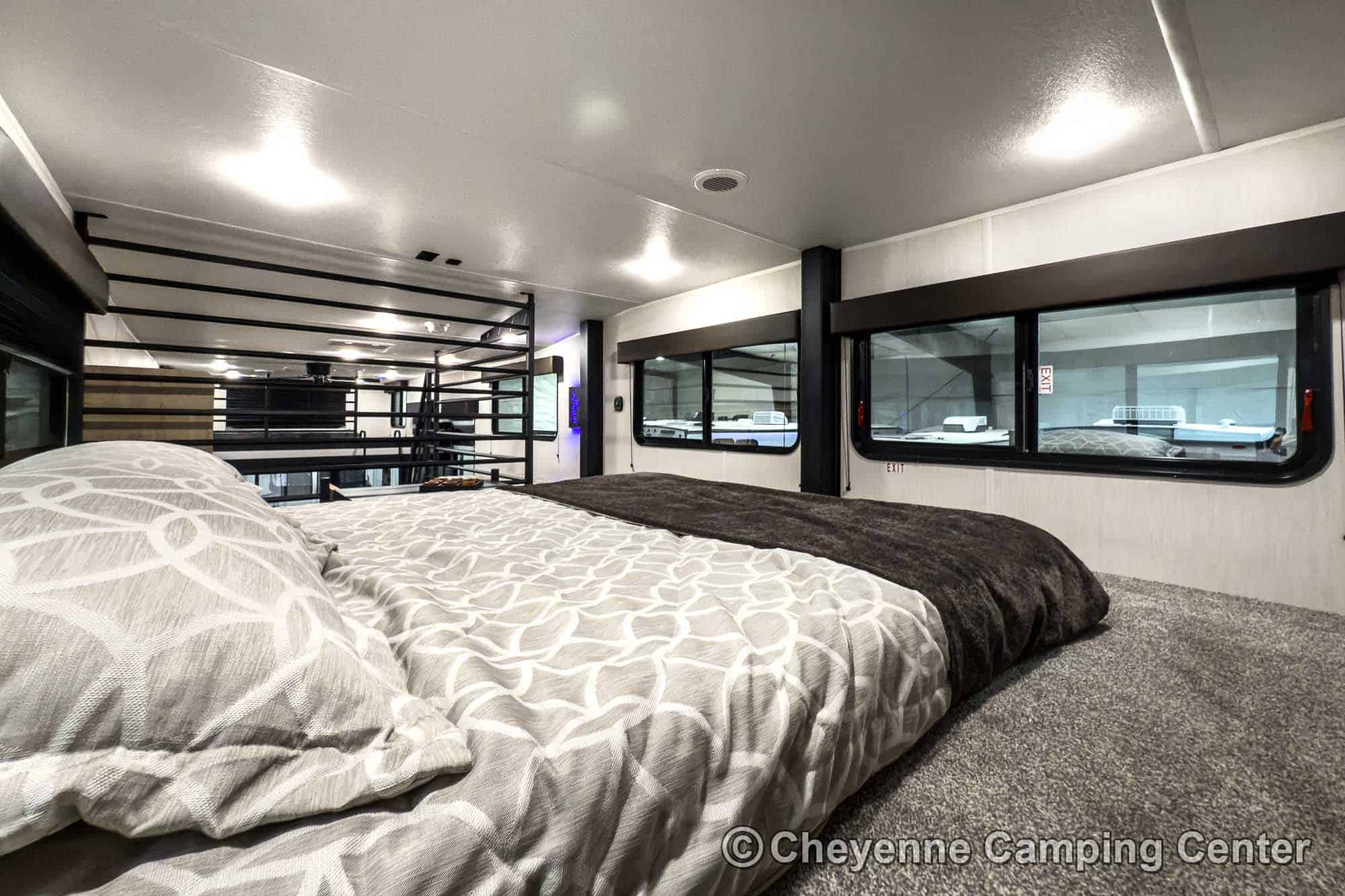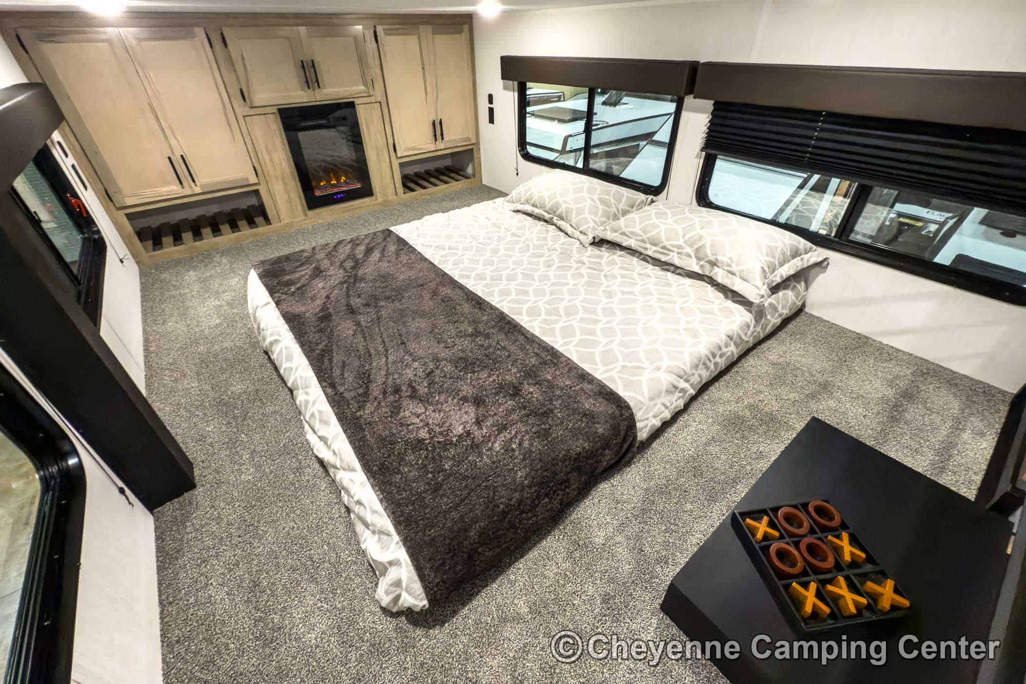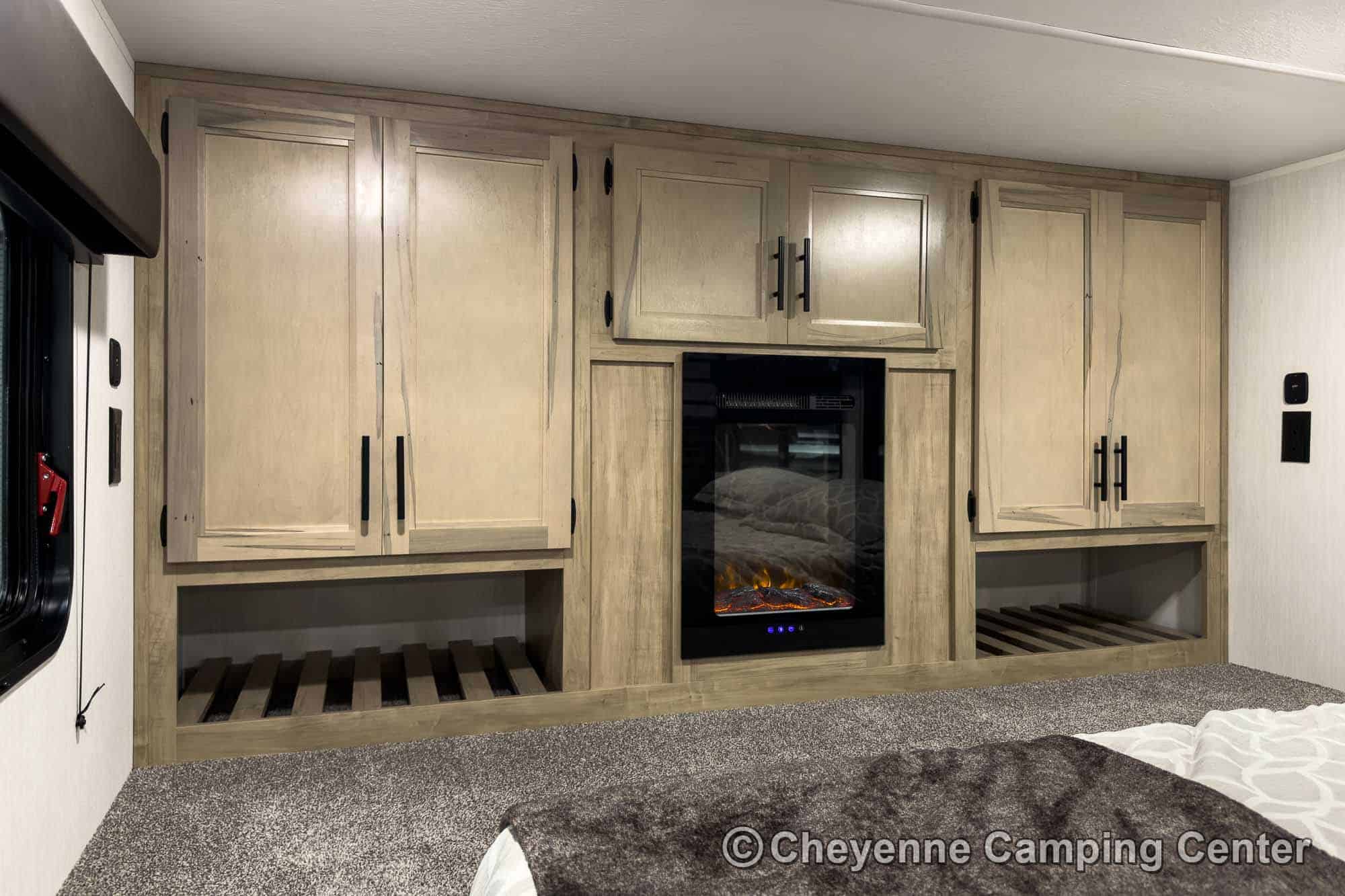 The private front bedroom includes an RV king bed with overhead cabinets, a wardrobe, and under-bed storage. Above it, the front loft offers a queen mattress, ample storage, and an electric fireplace for added warmth and ambiance. A second loft at the rear provides even more sleeping or storage options. The bathroom has a residential-style shower, a mirrored medicine cabinet, a vanity, and a foot-flush toilet.