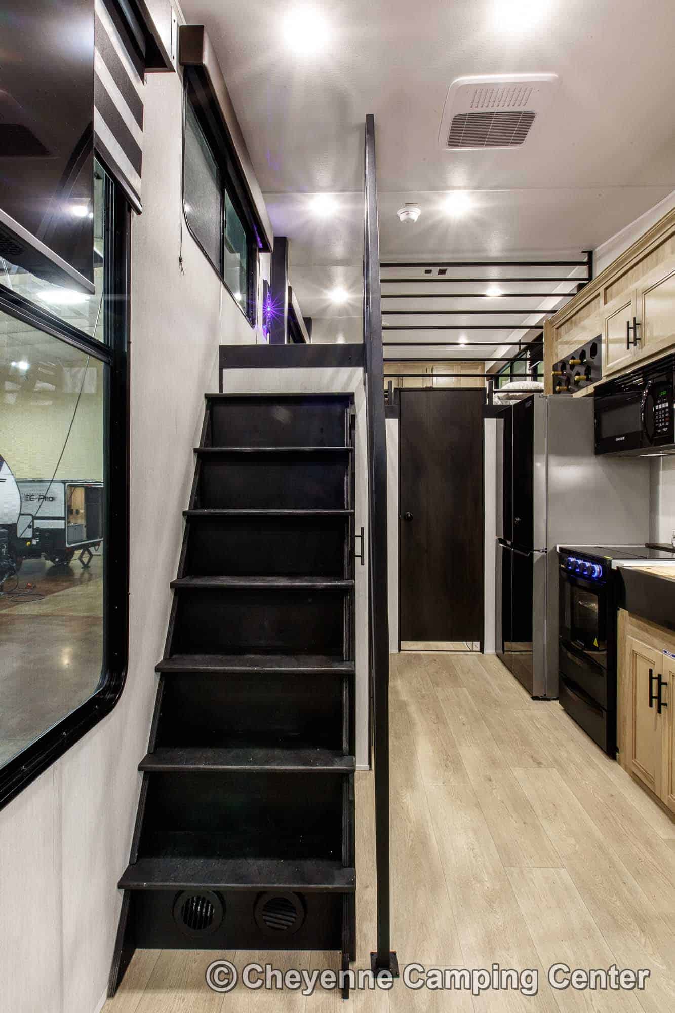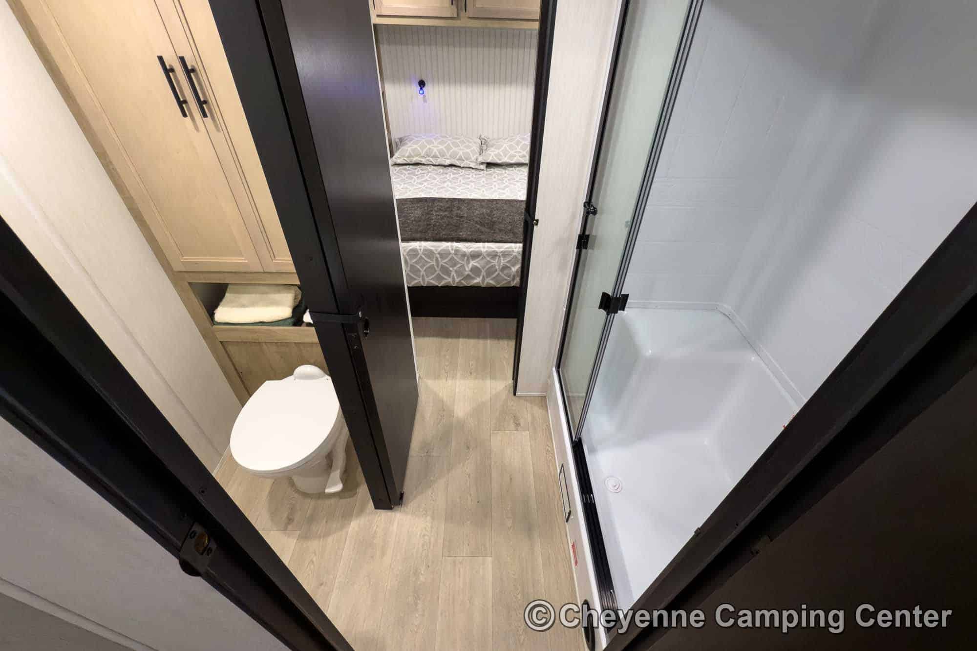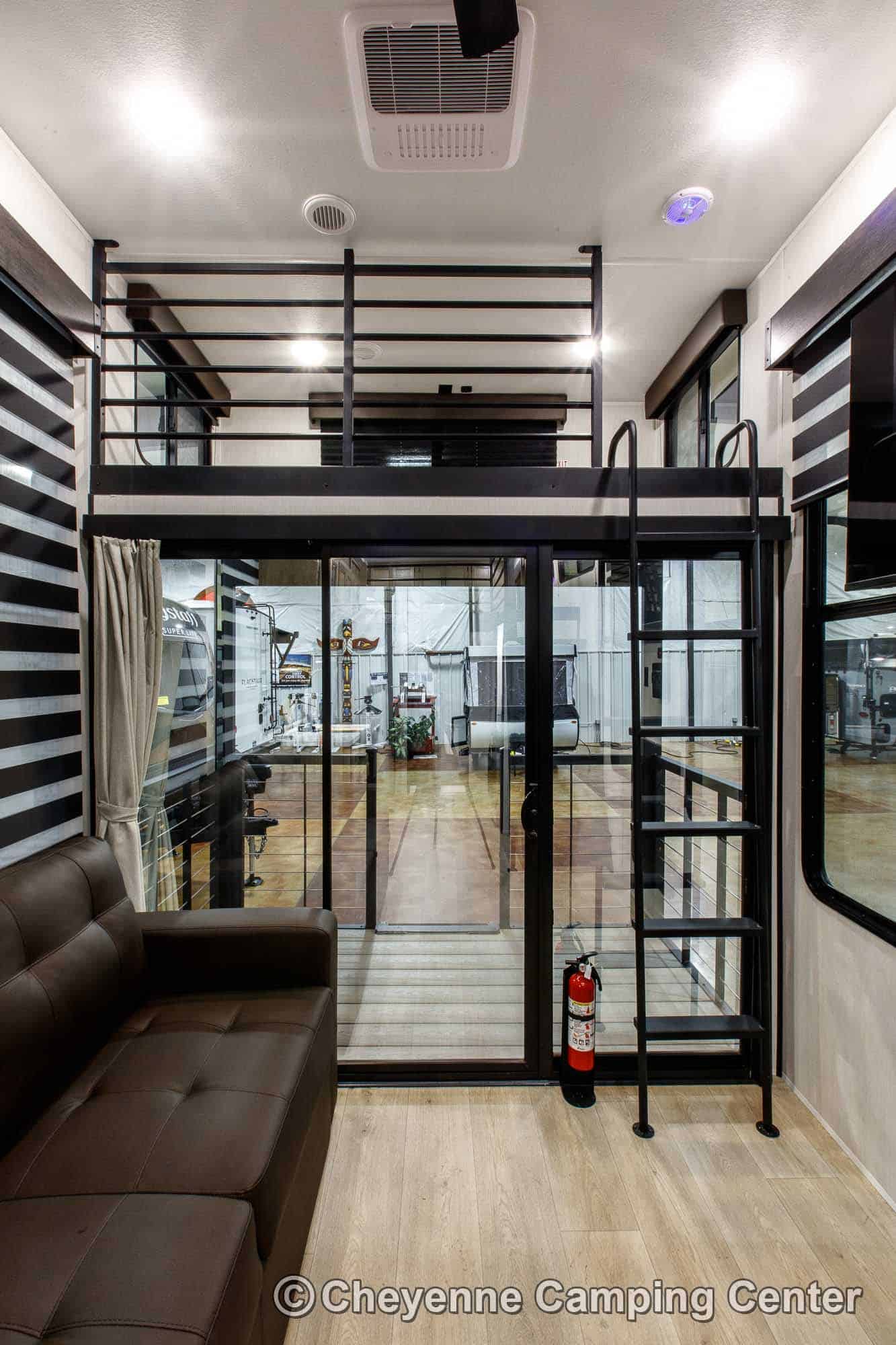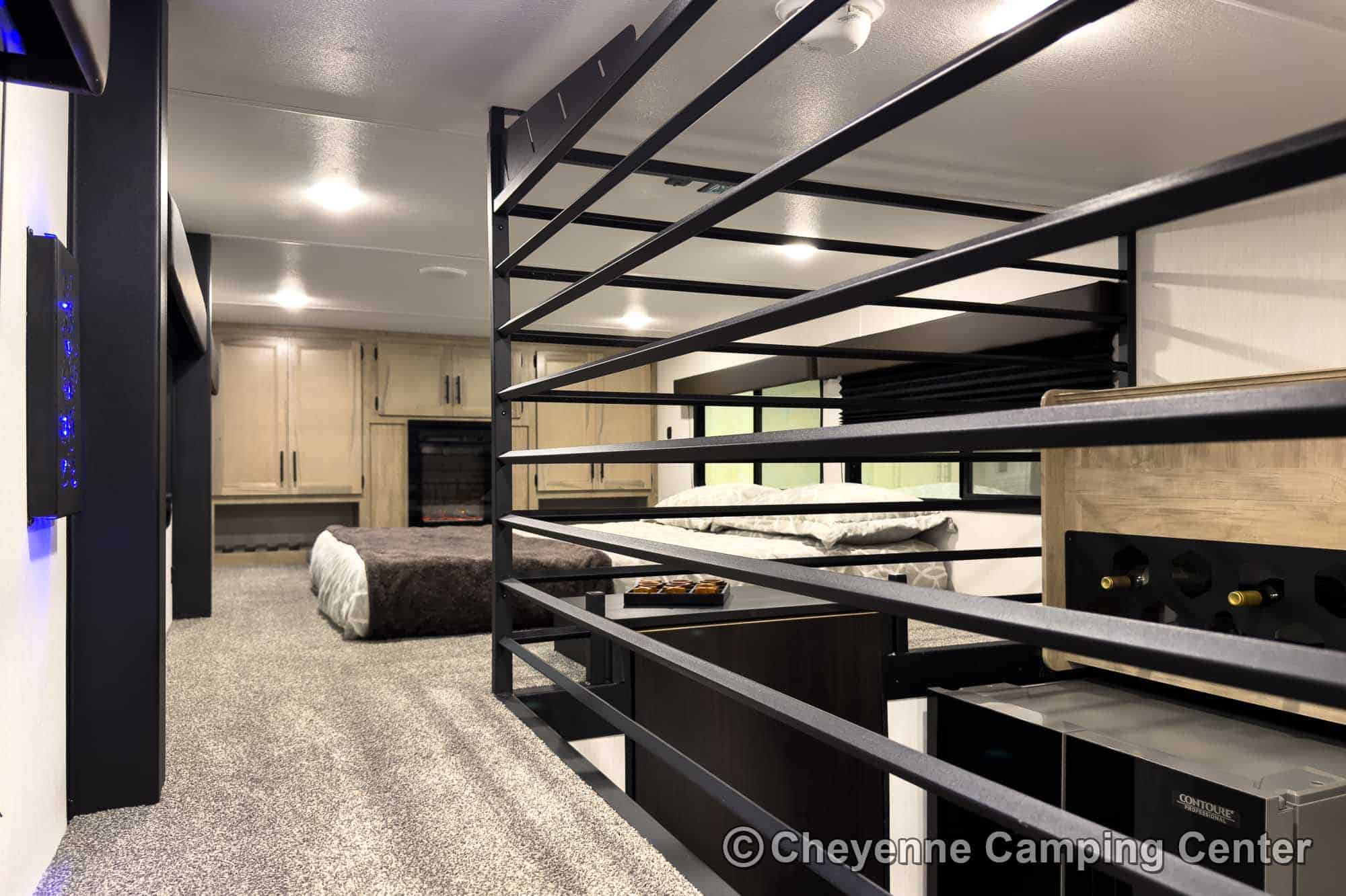 The private front bedroom includes an RV king bed with overhead cabinets, a wardrobe, and under-bed storage. Above it, the front loft offers a queen mattress, ample storage, and an electric fireplace for added warmth and ambiance. A second loft at the rear provides even more sleeping or storage options. The bathroom has a residential-style shower, a mirrored medicine cabinet, a vanity, and a foot-flush toilet.