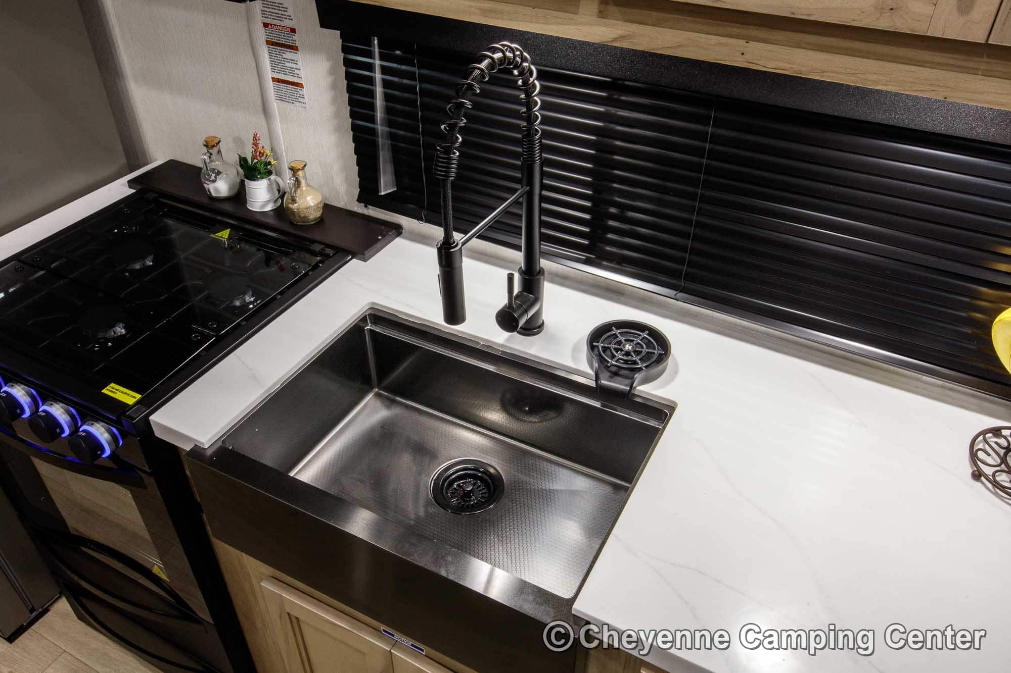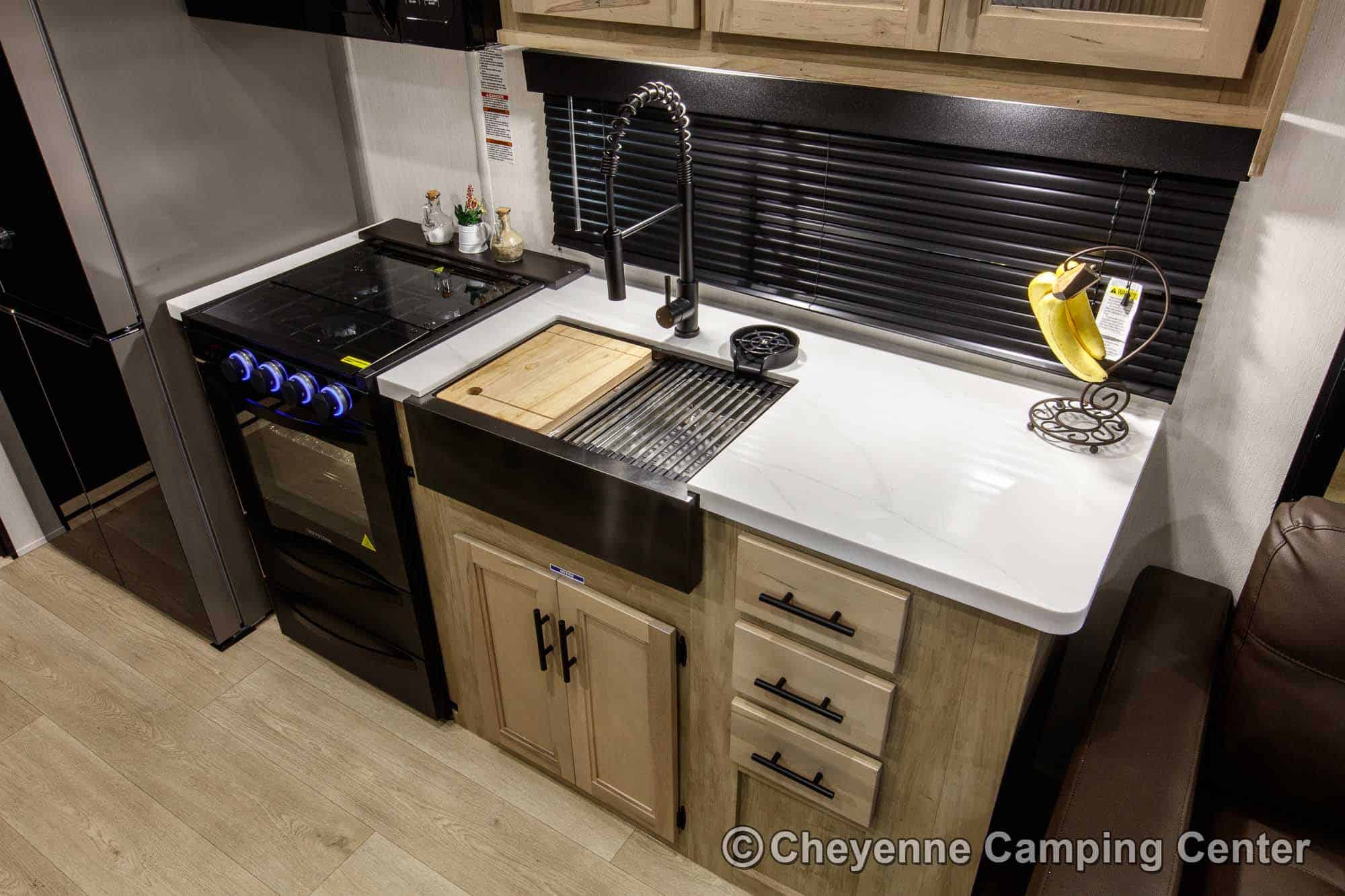 The main living area features a tri-fold sleeper sofa, collapsible dining table, 55″ TV, LED lighting, and ceiling fan. The well-appointed kitchen includes a 15 cu. ft. residential-style refrigerator, cooktop, oven, microwave, deep stainless steel workstation sink, solid surface countertops, dishwasher, portable ice maker, wine rack, and generous storage.