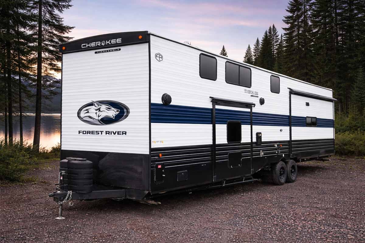 The 2026 Forest River Cherokee Timberwolf 39JM is a spacious destination trailer designed for extended stays, combining residential comfort with smart, family-friendly features. With multiple sleeping areas, including a private bedroom and loft space, the 39JM offers flexible accommodations for family and guests.