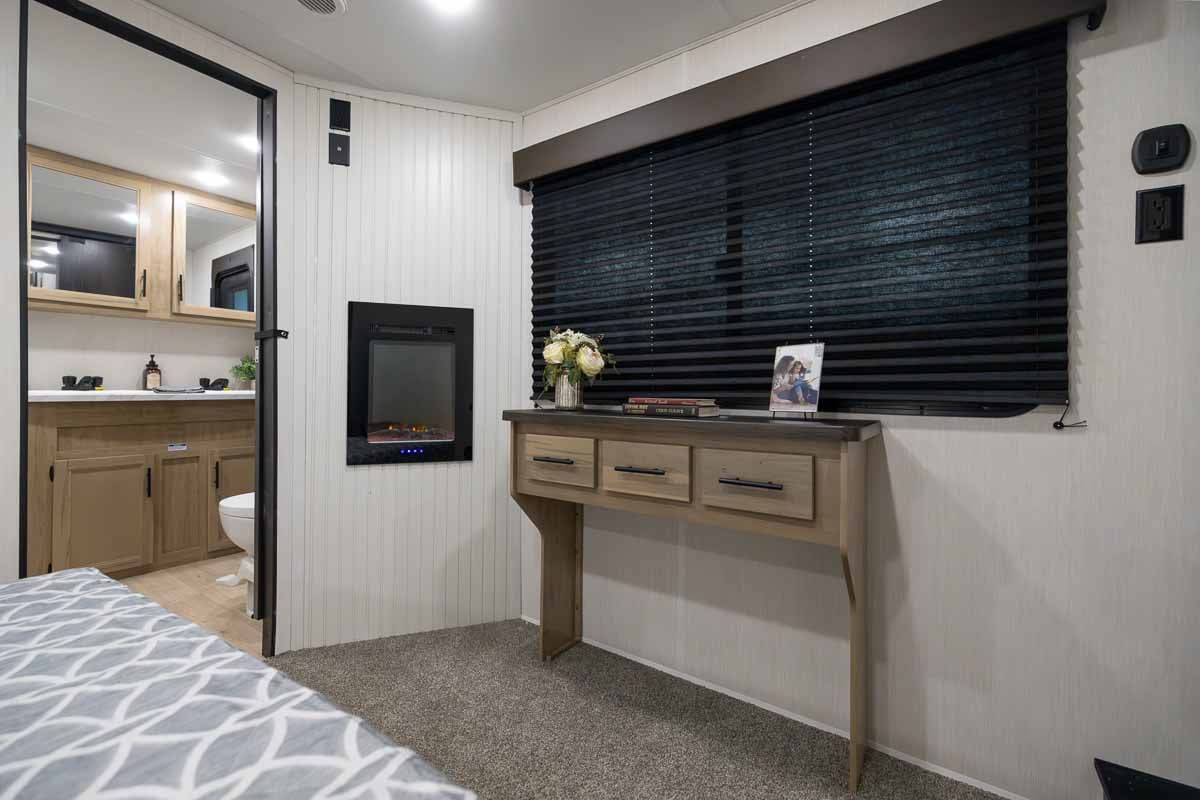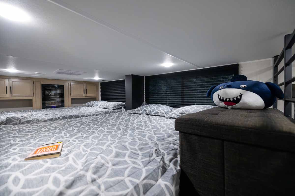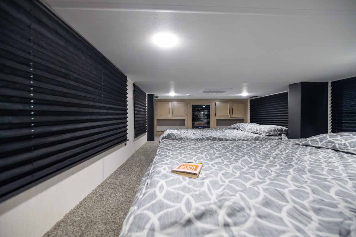 The private primary bedroom includes a king bed, electric fireplace, wardrobe storage, and overhead cabinetry, creating a comfortable retreat. Two queen beds and a play area in the loft provides a perfect area for kids or guests, maximizing the trailer’s overall usability.