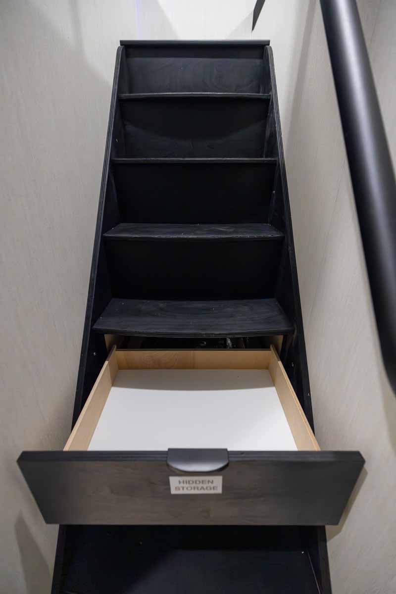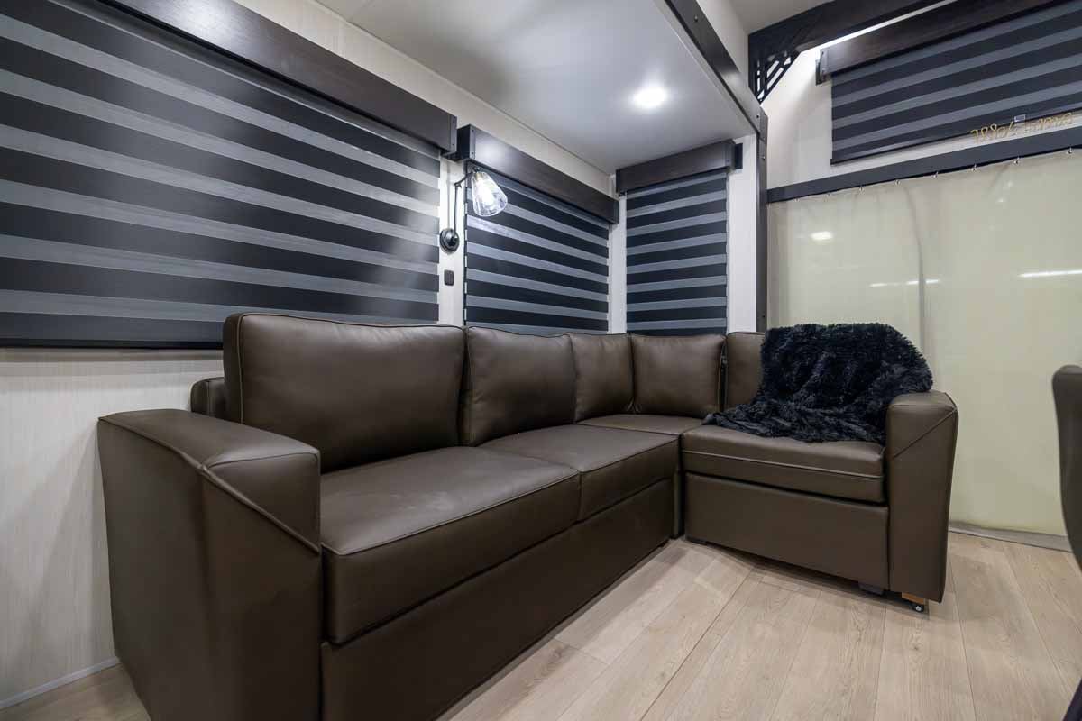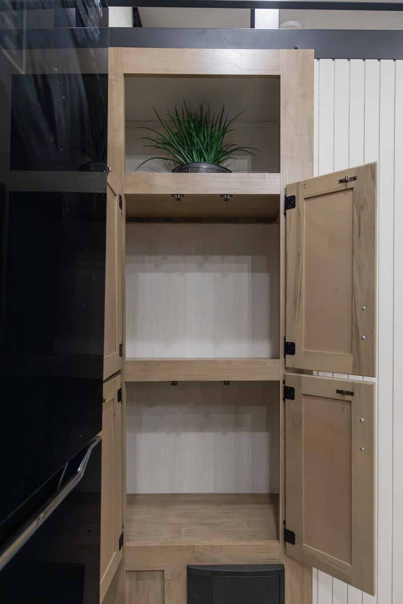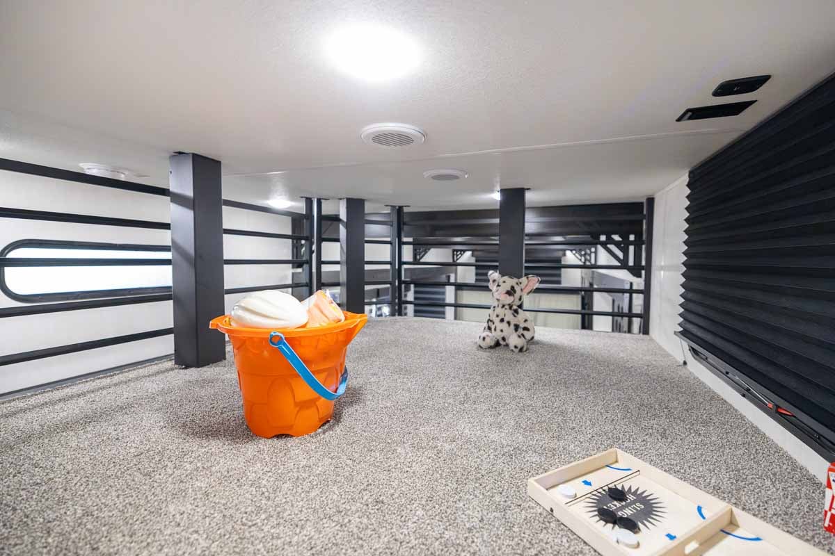 The private primary bedroom includes a king bed, electric fireplace, wardrobe storage, and overhead cabinetry, creating a comfortable retreat. Two queen beds and a play area in the loft provides a perfect area for kids or guests, maximizing the trailer’s overall usability.