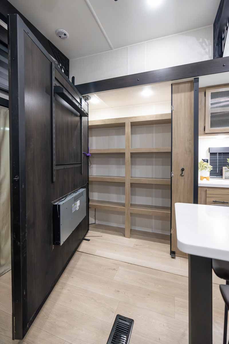 The main living area is designed for both comfort and smart functionality, featuring a large sofa, an entertainment center with a 55″ Smart TV, and a hidden pantry tucked neatly behind. LED lighting and a ceiling fan enhance the space, while rear patio doors and expansive windows bring in natural light and create an open, inviting feel.