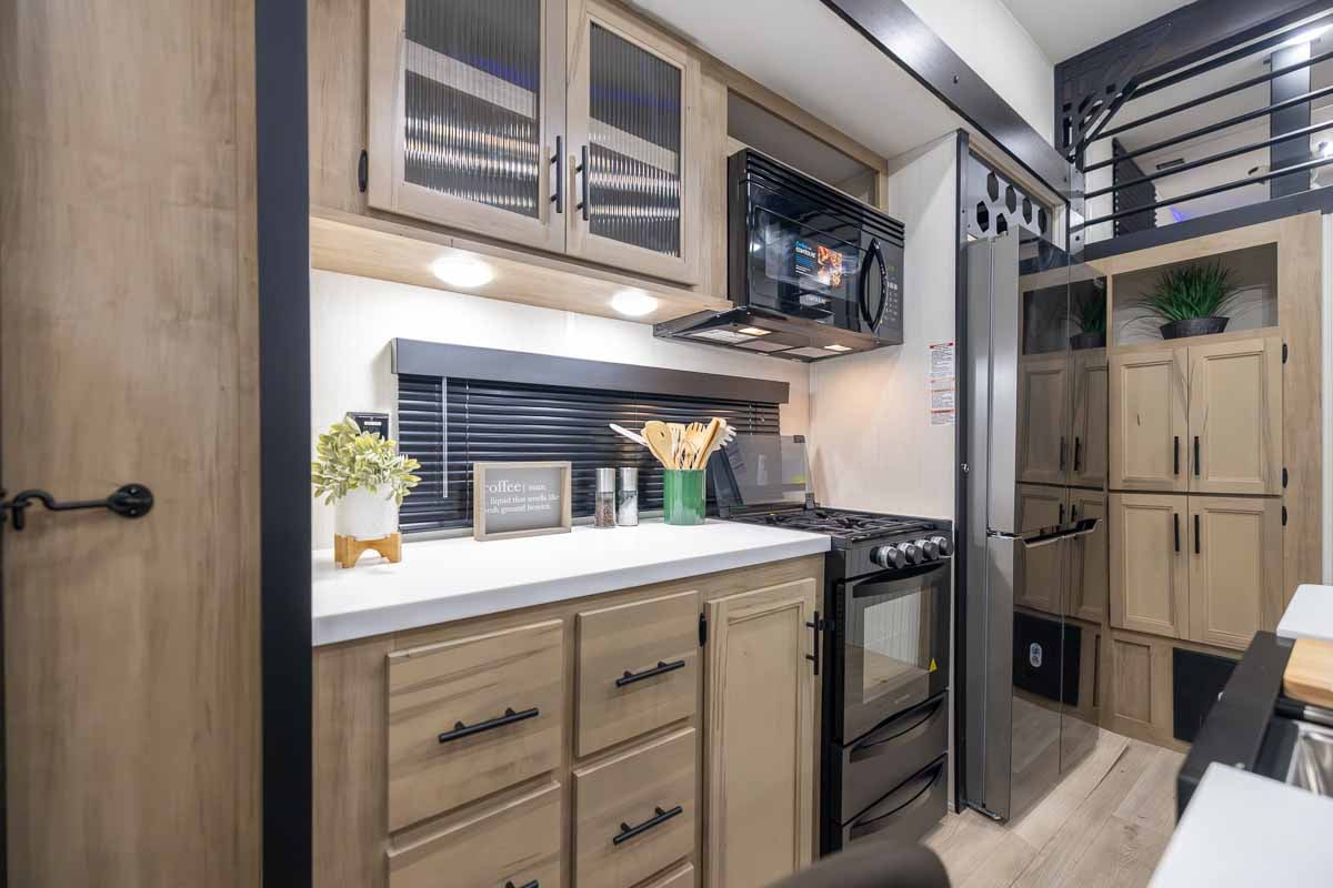 The kitchen offers true residential-style convenience with an 18 cu. ft. refrigerator, range and oven, large microwave, deep stainless-steel sink, and solid-surface countertops. Generous storage throughout, including a dedicated pantry, ensures you have plenty of space for extended stays.