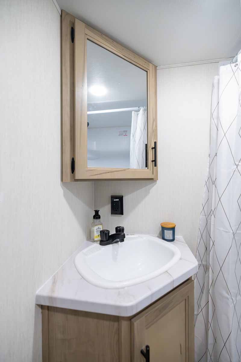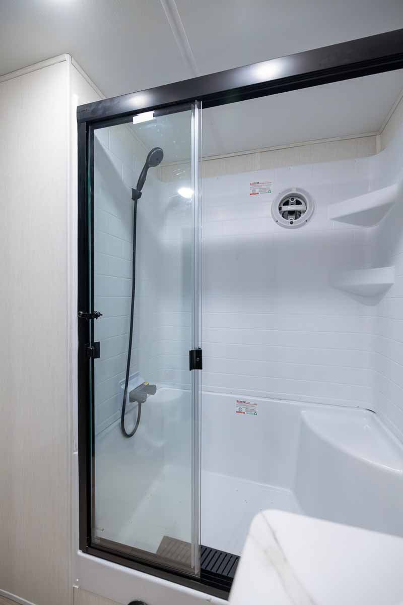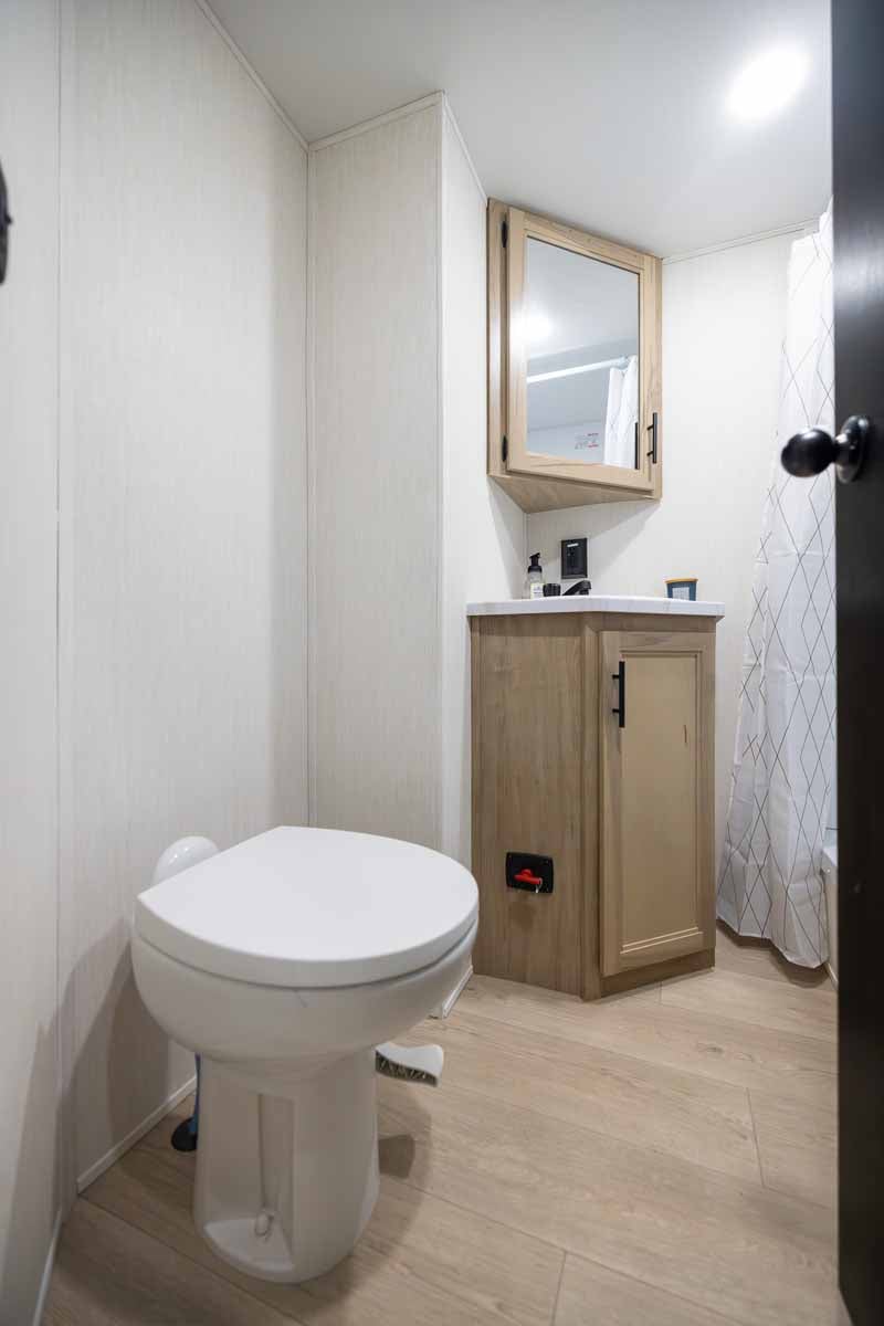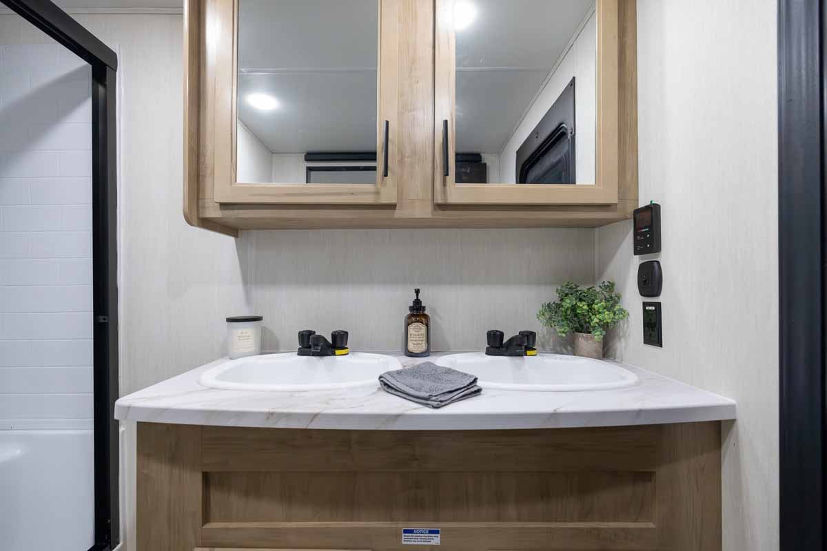 The front bathroom is well-appointed with a spacious residential-style shower, a double sink vanity, mirrored medicine cabinet, and foot-flush toilet.