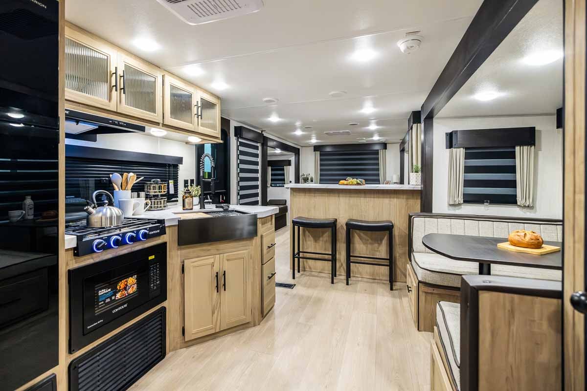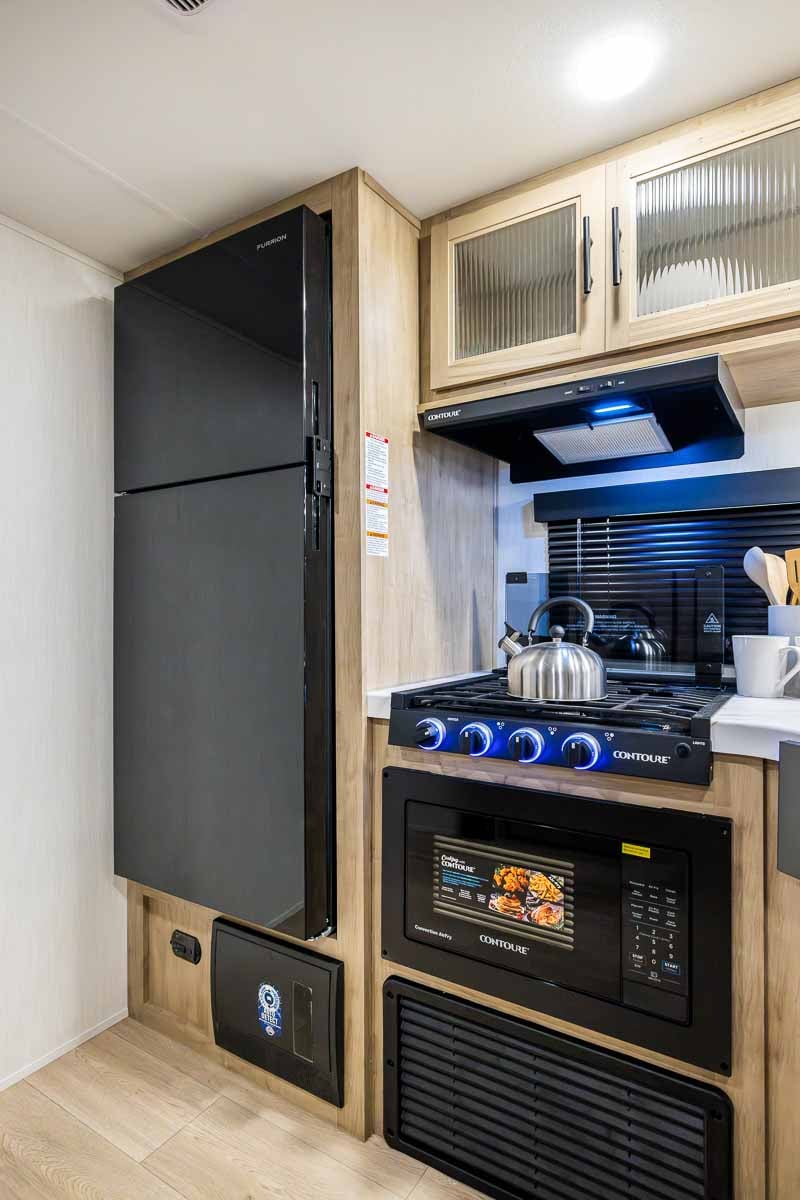Outside, you’ll find features built for relaxing at the campsite. A 15’ power awning creates a shaded outdoor living space, while the fully equipped outdoor kitchen, complete with a pull-out grill, refrigerator, ice maker, and water fixture, makes cooking outside easy. Additional exterior highlights include a 200-watt solar panel, an outdoor shower, a power tongue jack, power stabilizer jacks, MORryde steps at the main entry, a foldable cargo rack, exterior TV hookups, and stereo speakers.