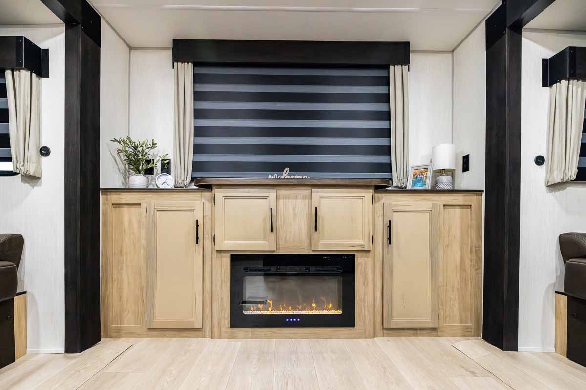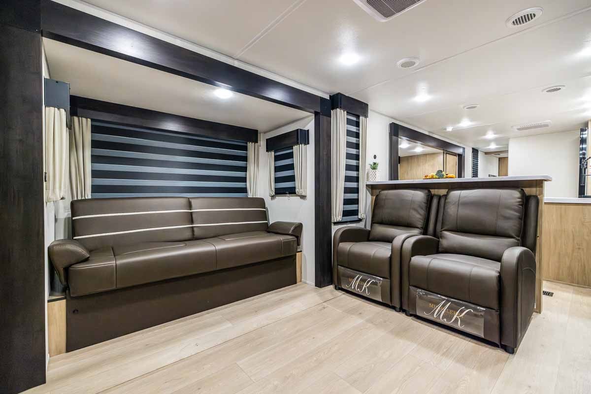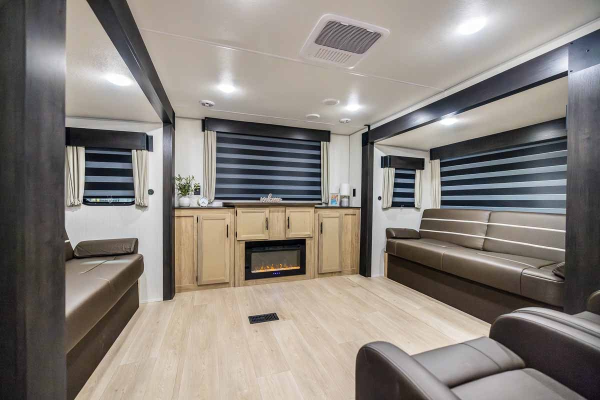 Inside, the rear living room offers a true residential feel with opposing slide-outs that open up the space. Dual sofa sleepers provide extra sleeping capacity or can function as a guest sleeping area, complemented by two comfortable recliners. The entertainment center features a 39” LED TV, Bluetooth stereo, and electric fireplace, all surrounded by large windows that bring in natural light.