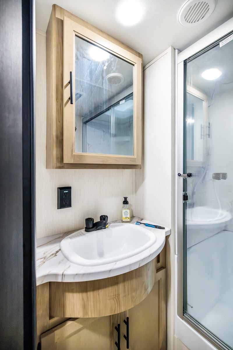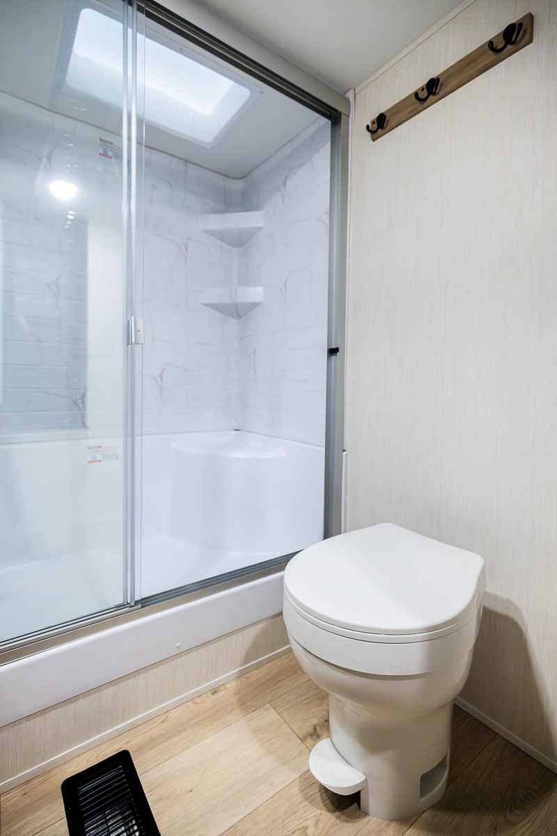 The spacious bathroom includes a large shower with a seat, premium vent fan, foot-flush toilet, vanity, and medicine cabinet—giving you the comfort and functionality of home.