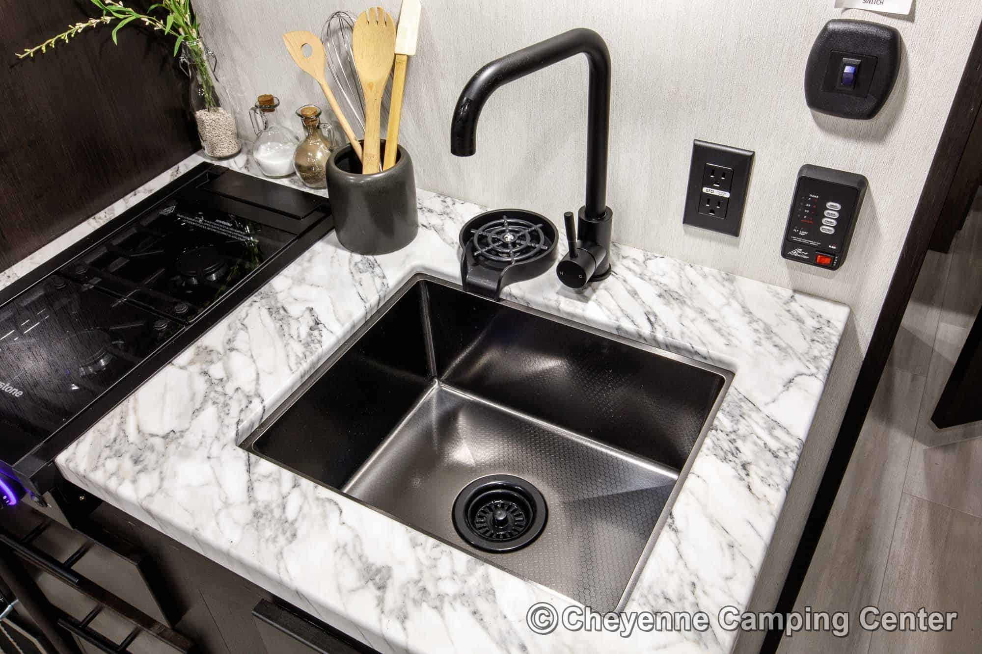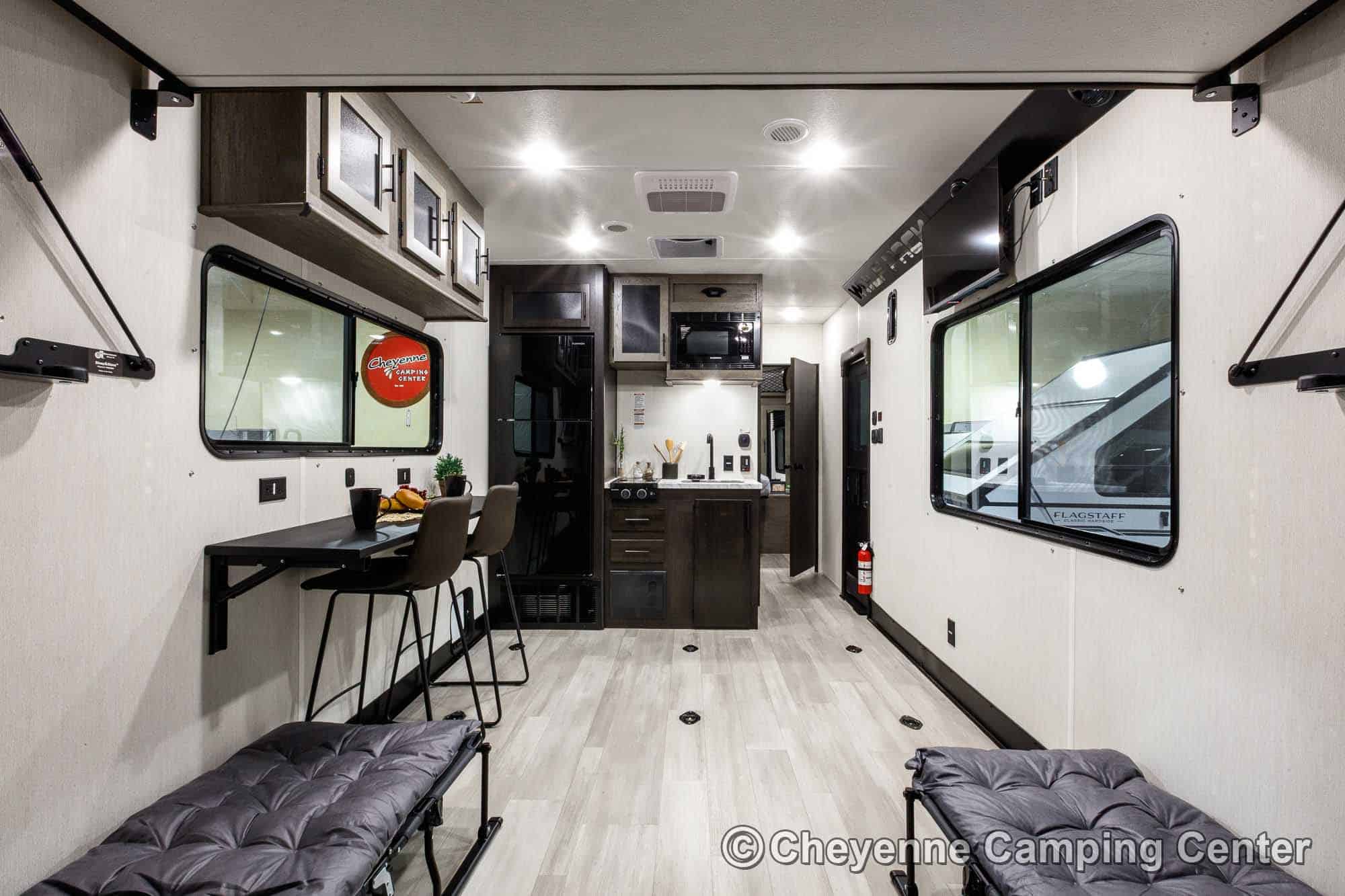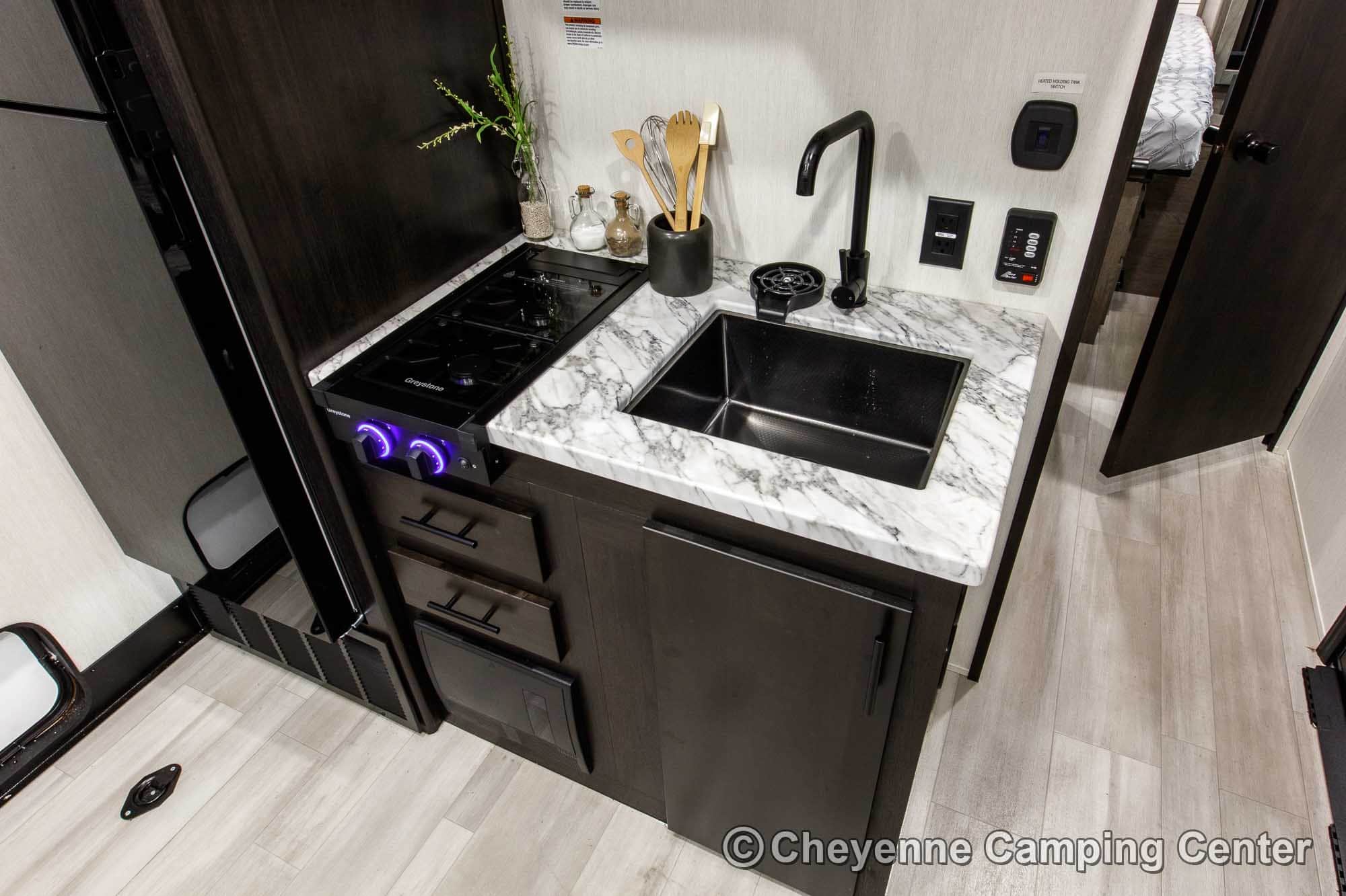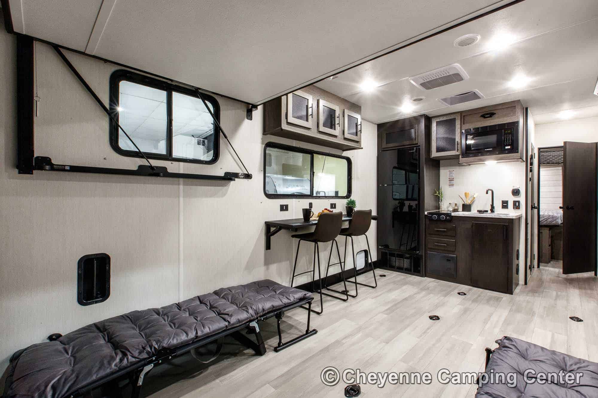 Relax in the lounge chairs while watching the 39″ LED TV, or move out on the deck and enjoy nature. The chairs convert into cots, and you’ll have a Sleep & Store queen bed in the garage area for extra sleeping space. The kitchen is fully equipped with a large 12V refrigerator, microwave/air fryer/convection oven combo, gas cooktop, black stainless steel sink with a glass washing fixture, residential-style faucet, and a folding dining bar.