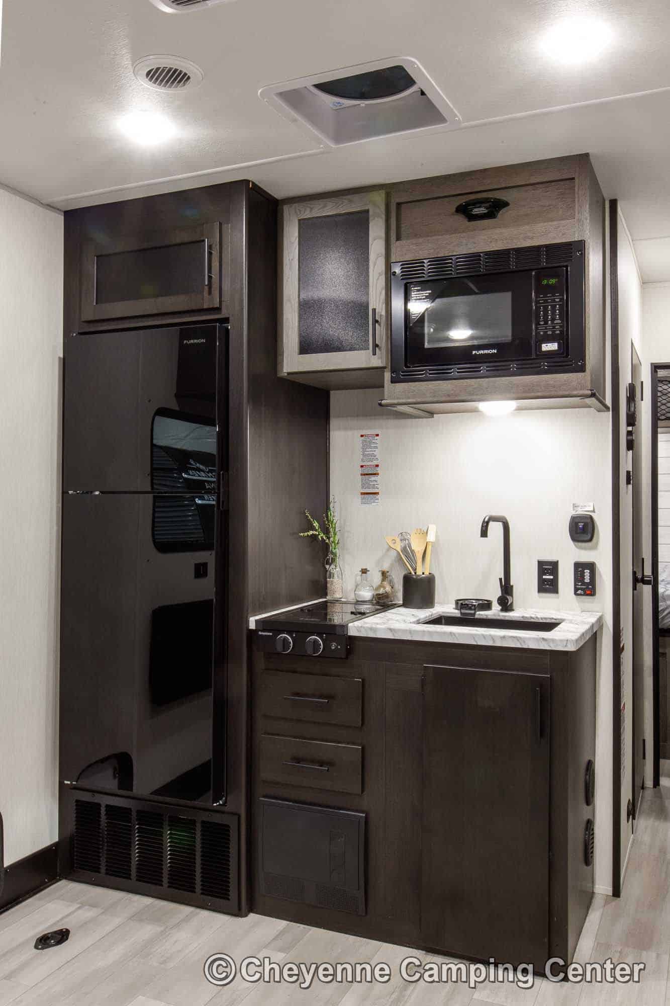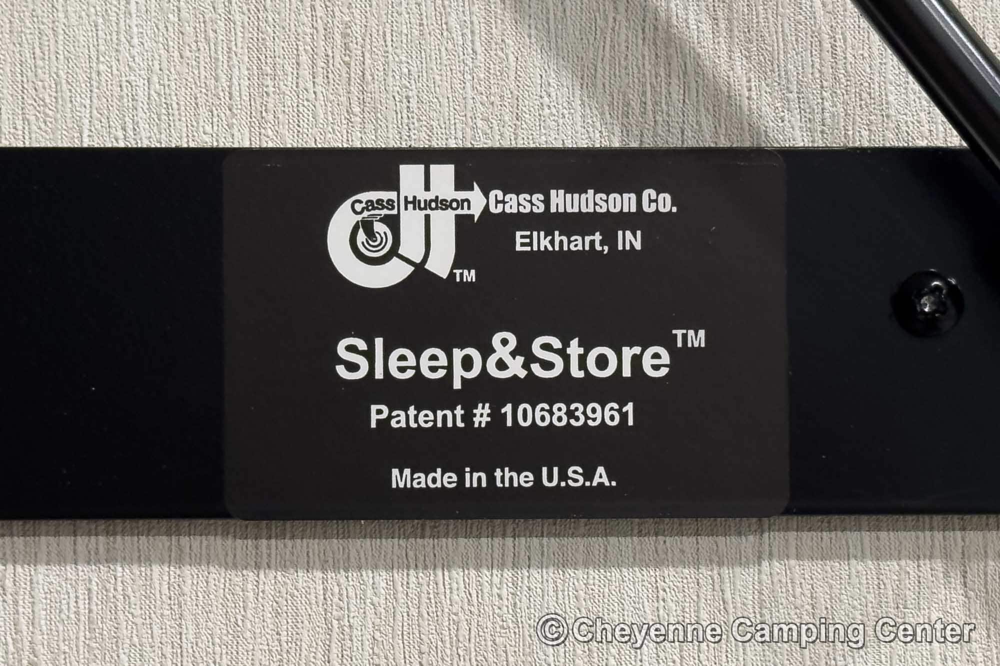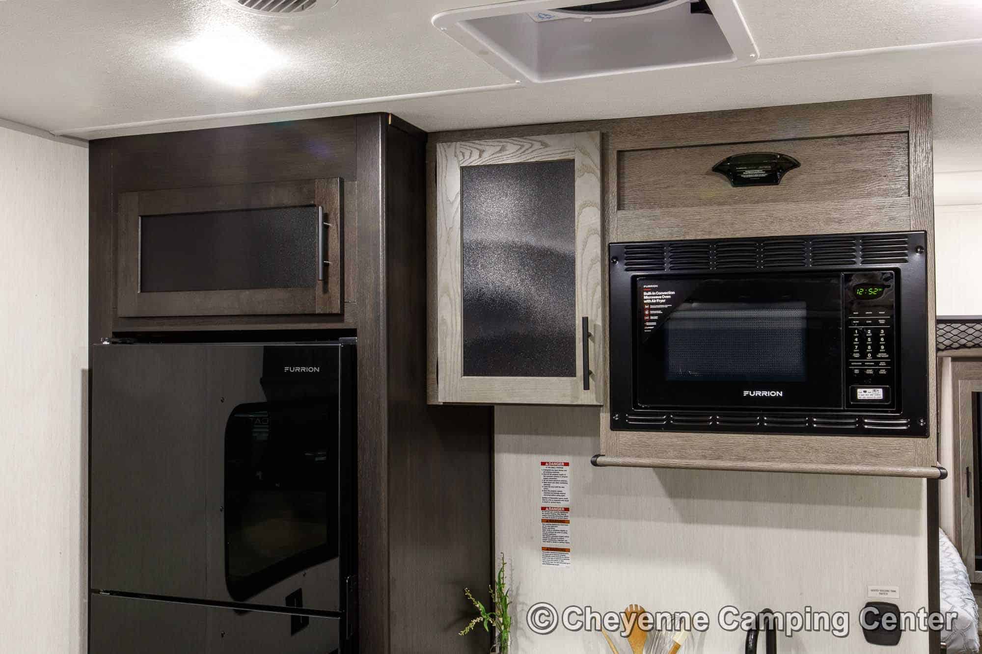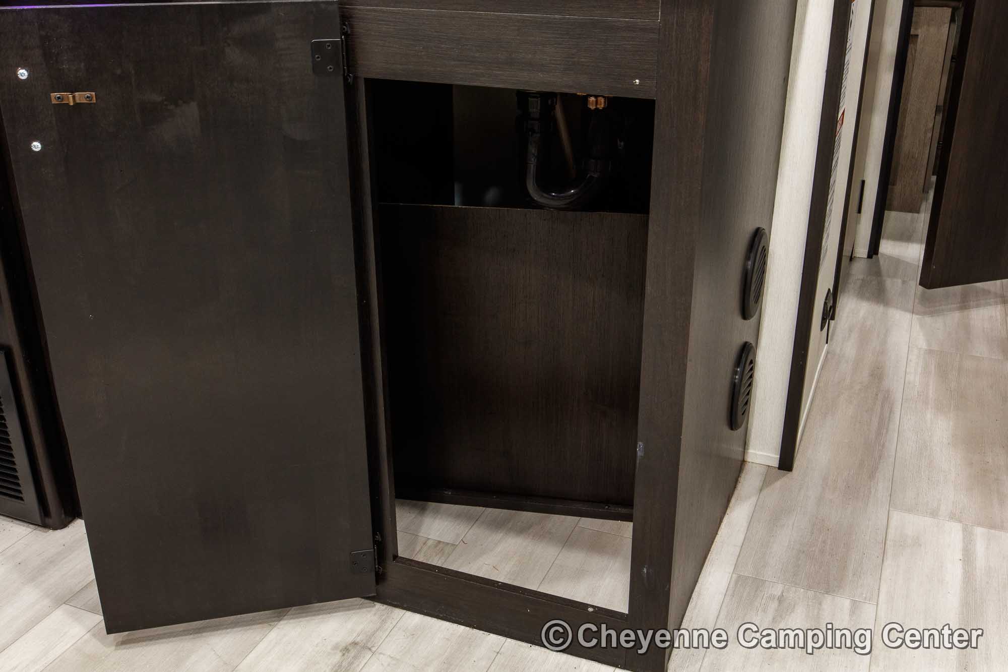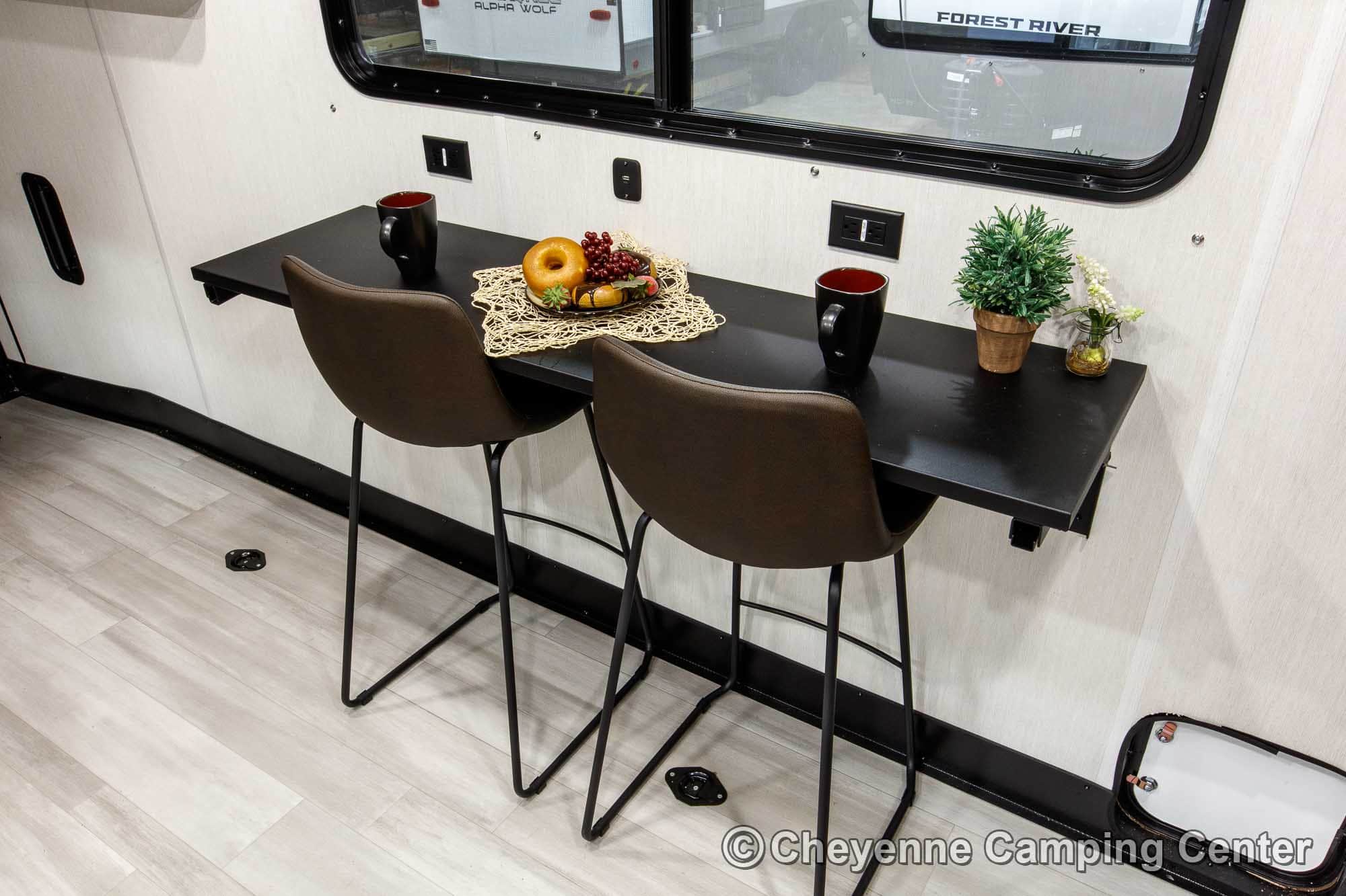 Relax in the lounge chairs while watching the 39″ LED TV, or move out on the deck and enjoy nature. The chairs convert into cots, and you’ll have a Sleep & Store queen bed in the garage area for extra sleeping space. The kitchen is fully equipped with a large 12V refrigerator, microwave/air fryer/convection oven combo, gas cooktop, black stainless steel sink with a glass washing fixture, residential-style faucet, and a folding dining bar.