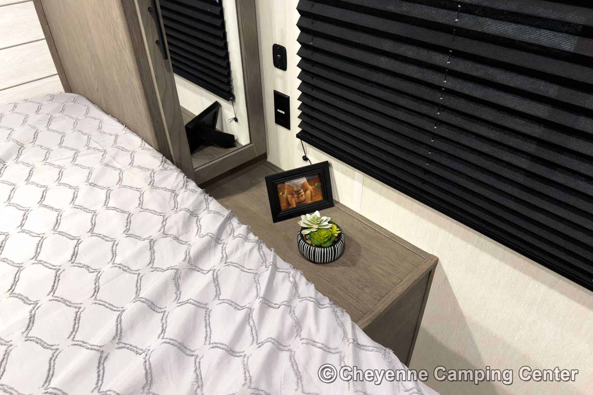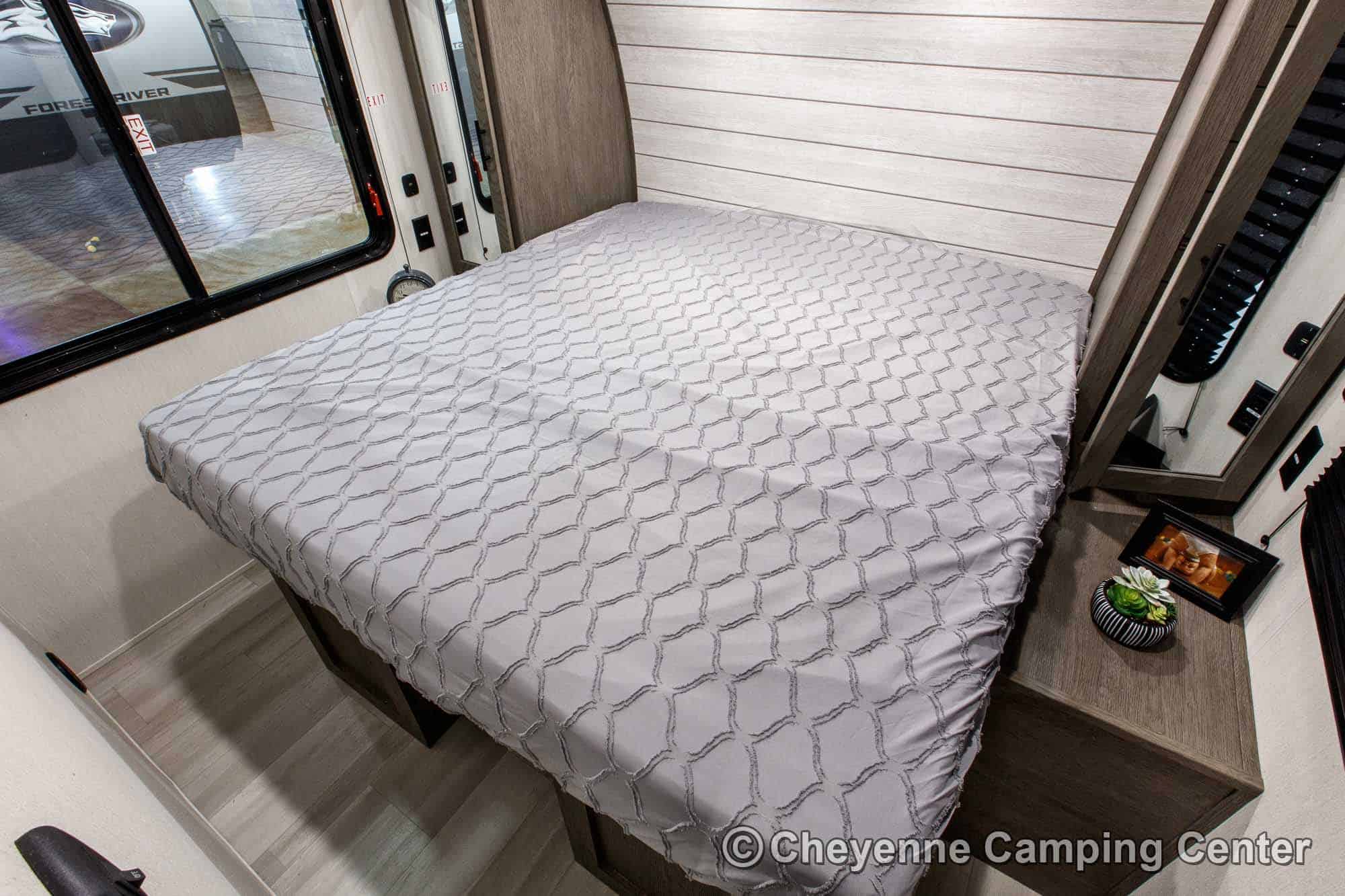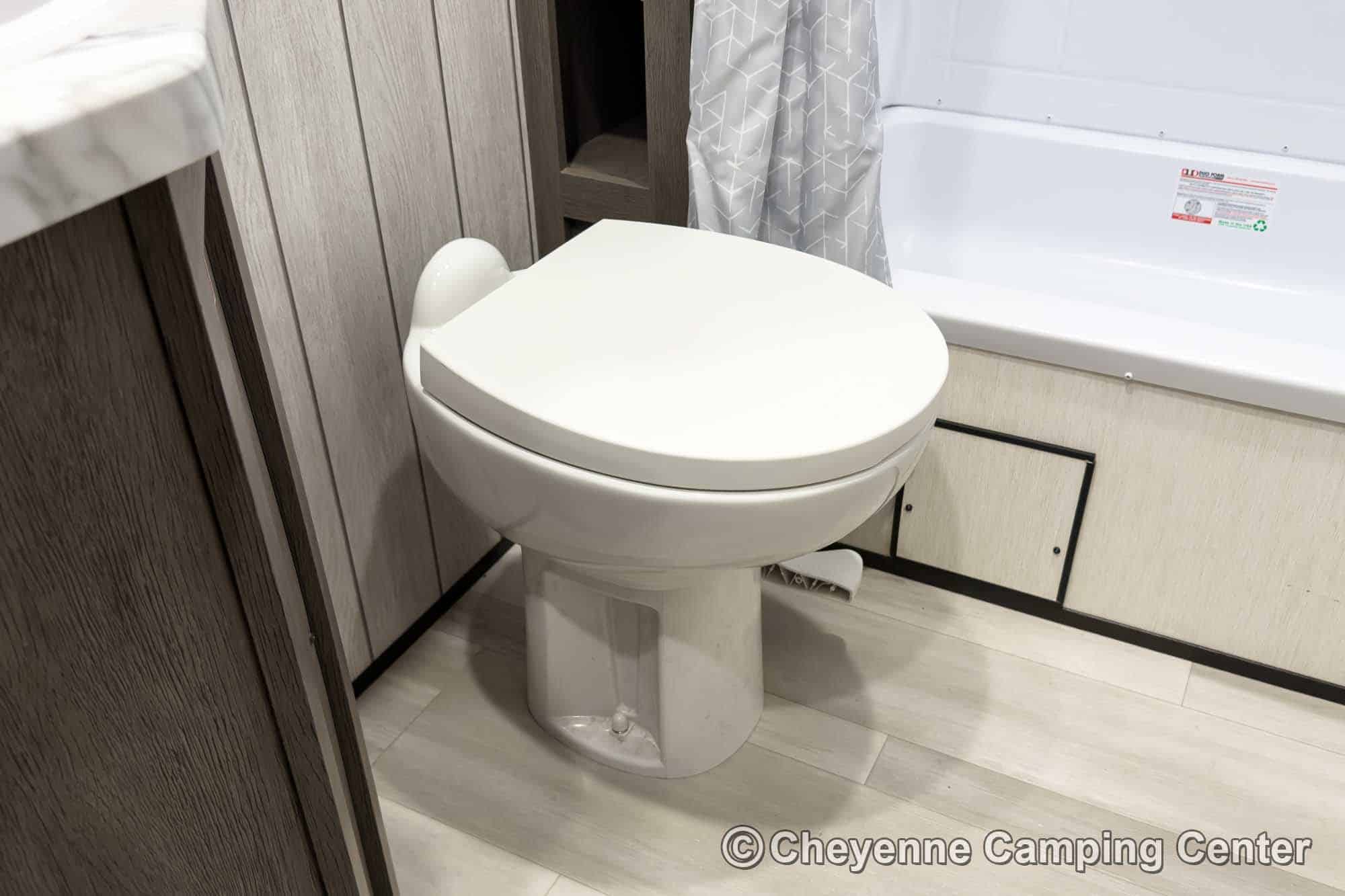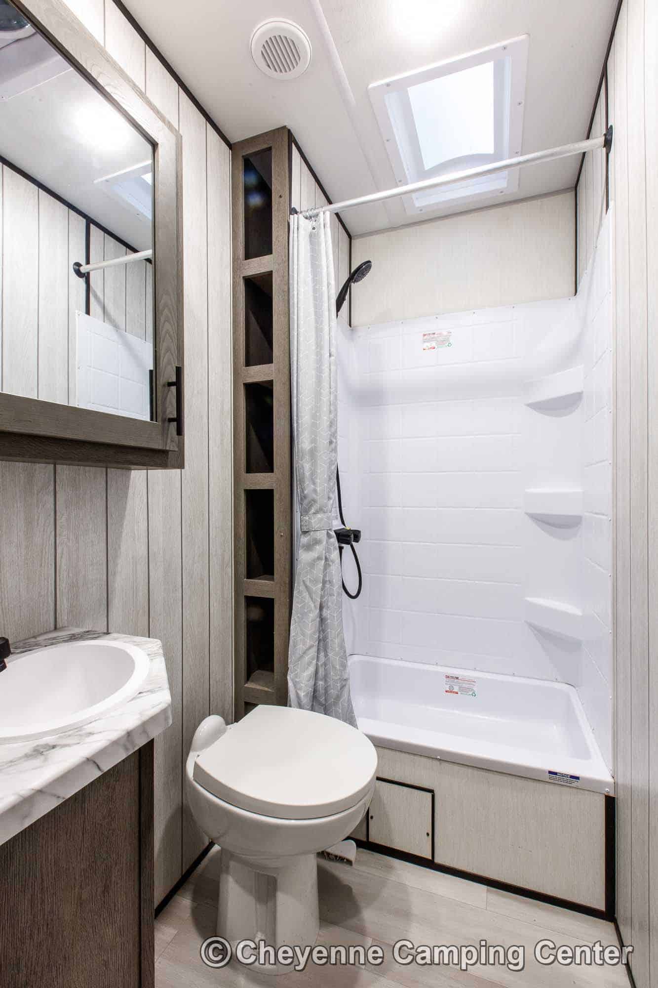 The private bedroom features an RV king bed with storage under, wardrobes, and TV hookups. The bathroom offers a large shower with skylight, vanity with medicine cabinet, porcelain foot-flush toilet, and a premium whole-coach vent fan for added comfort. Enjoy peace of mind with a one-year manufacturer’s warranty and one year of complimentary roadside assistance.