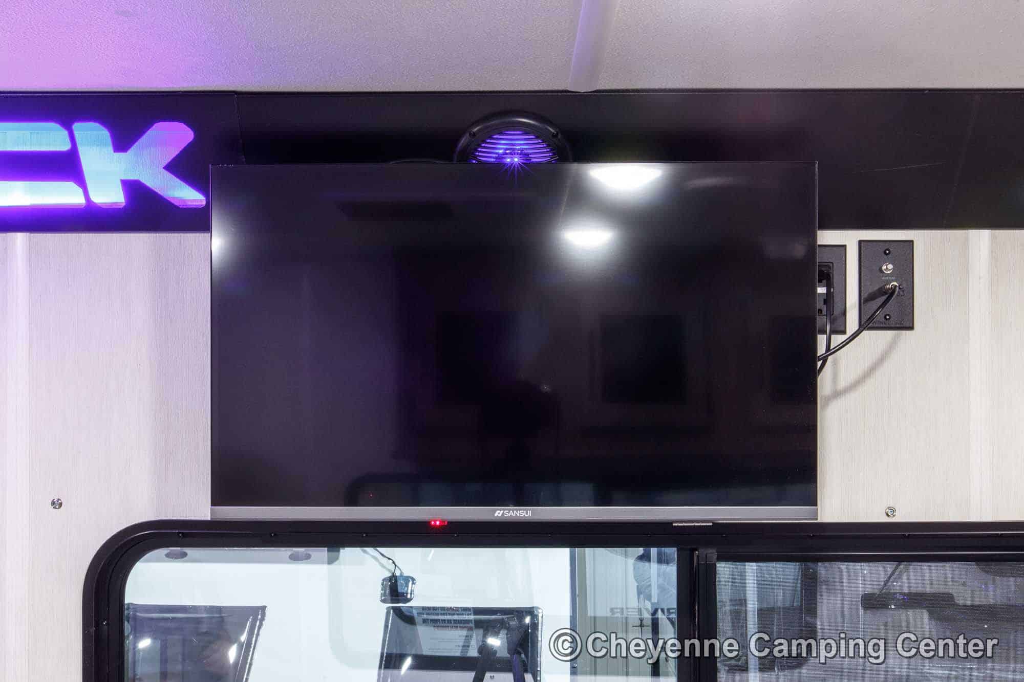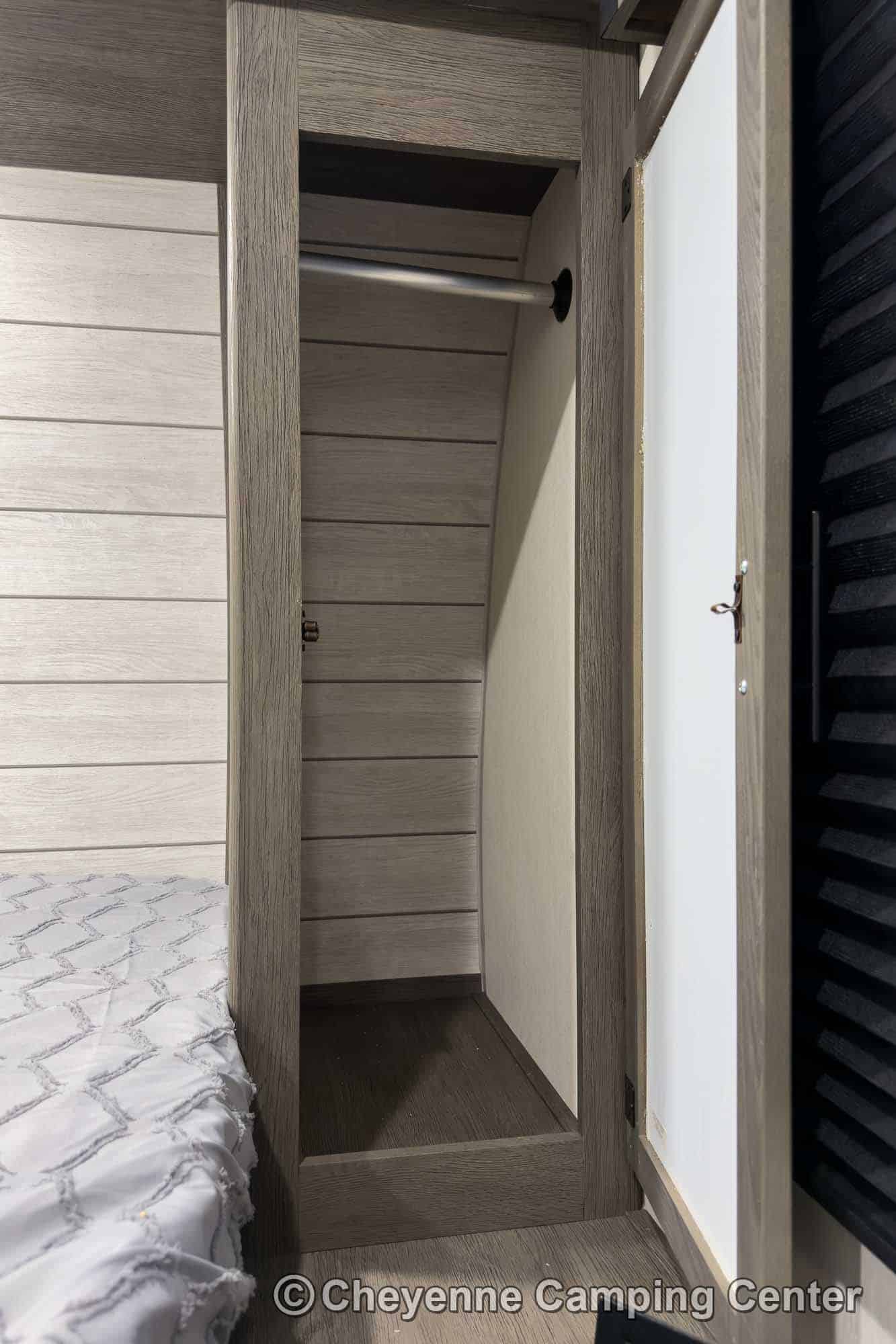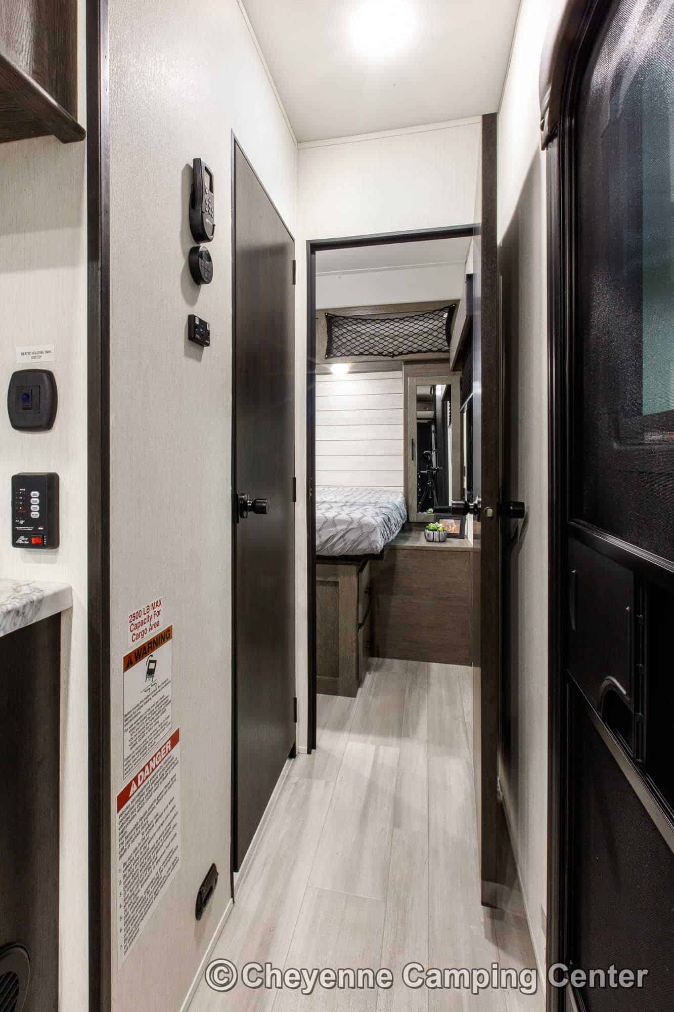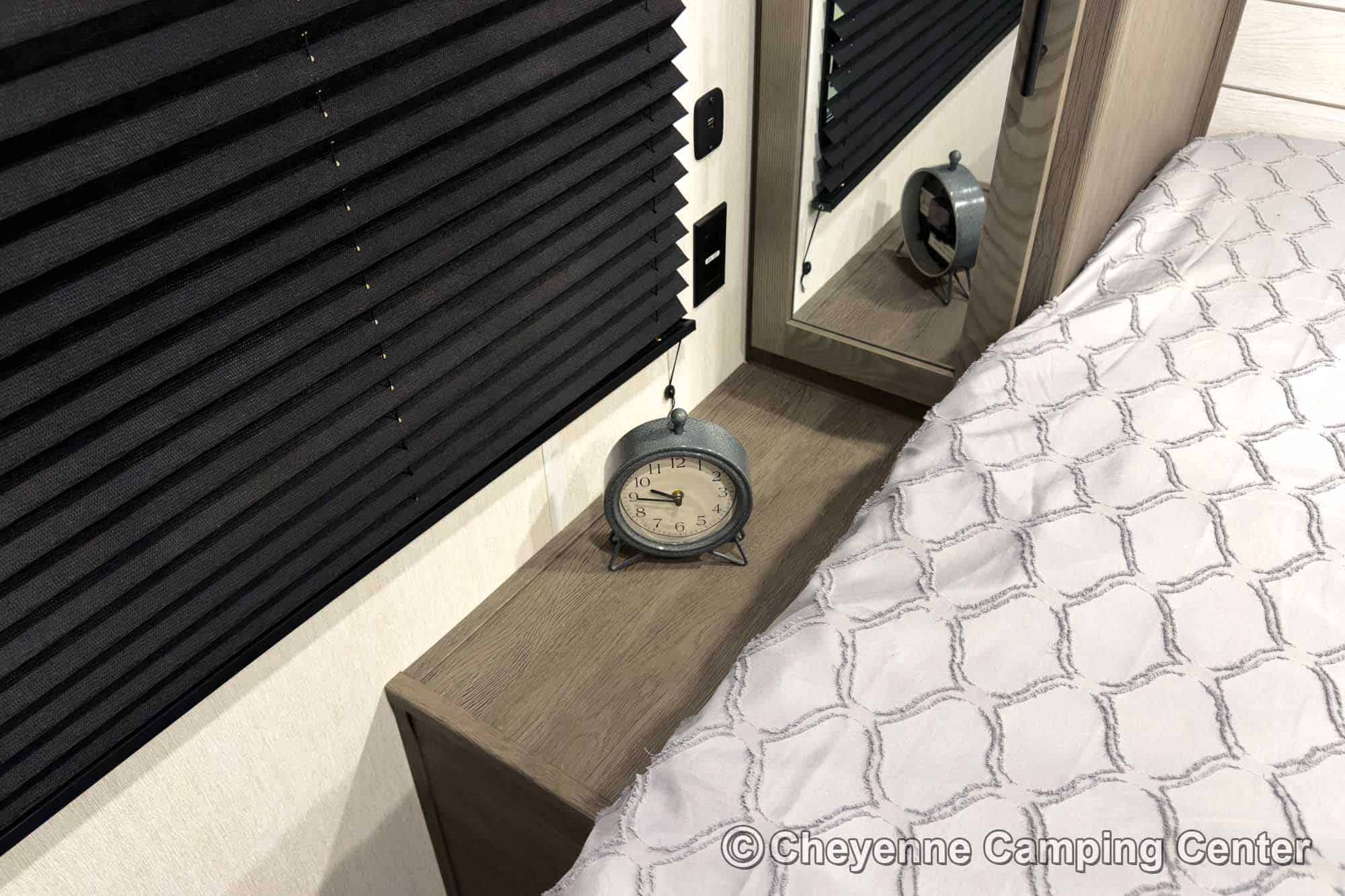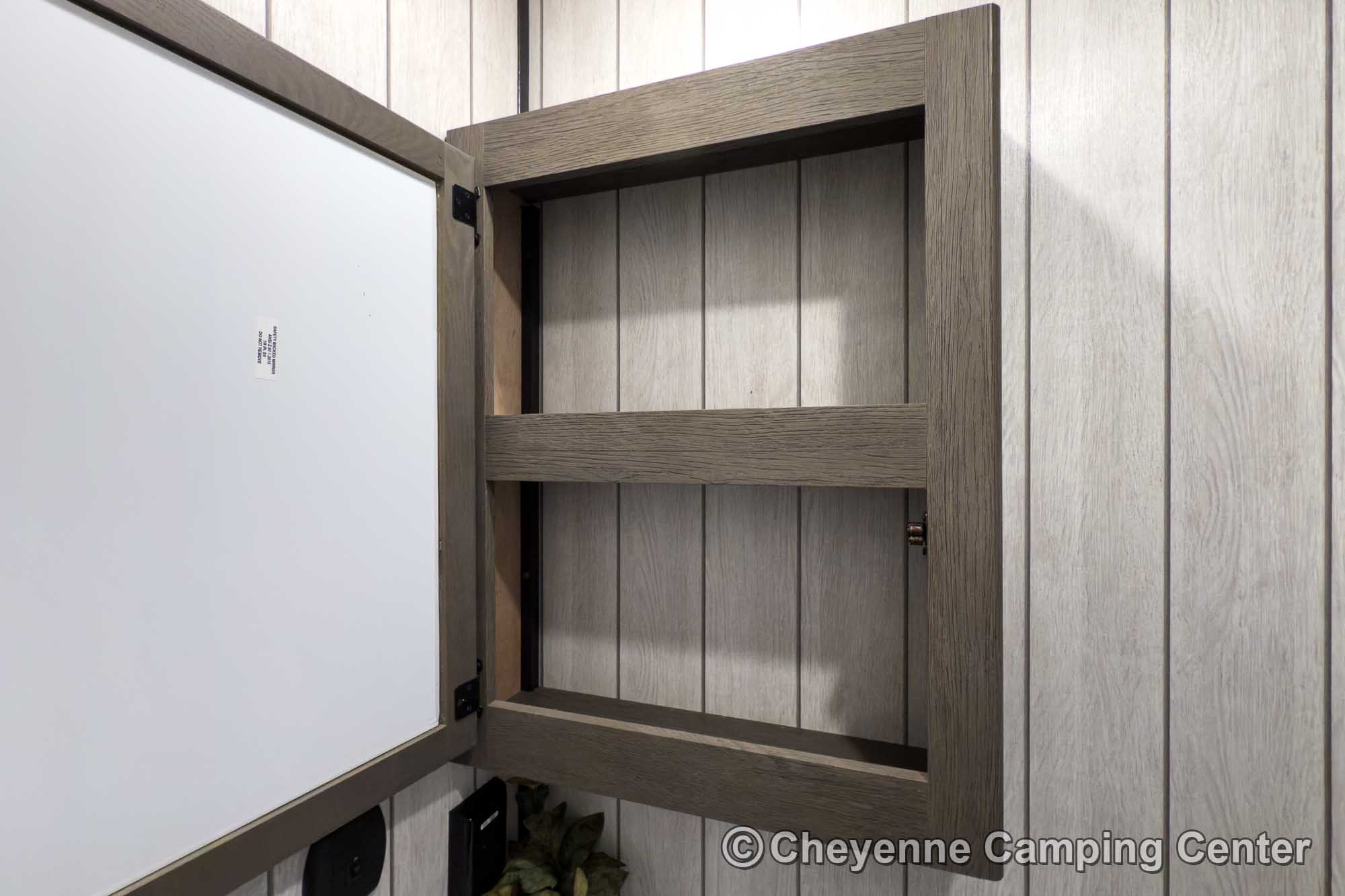 The private bedroom features an RV king bed with storage under, wardrobes, and TV hookups. The bathroom offers a large shower with skylight, vanity with medicine cabinet, porcelain foot-flush toilet, and a premium whole-coach vent fan for added comfort. Enjoy peace of mind with a one-year manufacturer’s warranty and one year of complimentary roadside assistance.