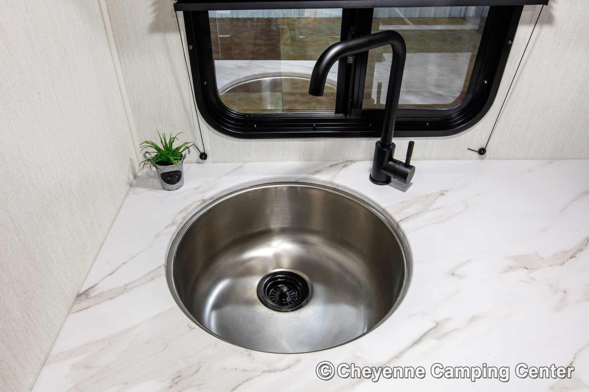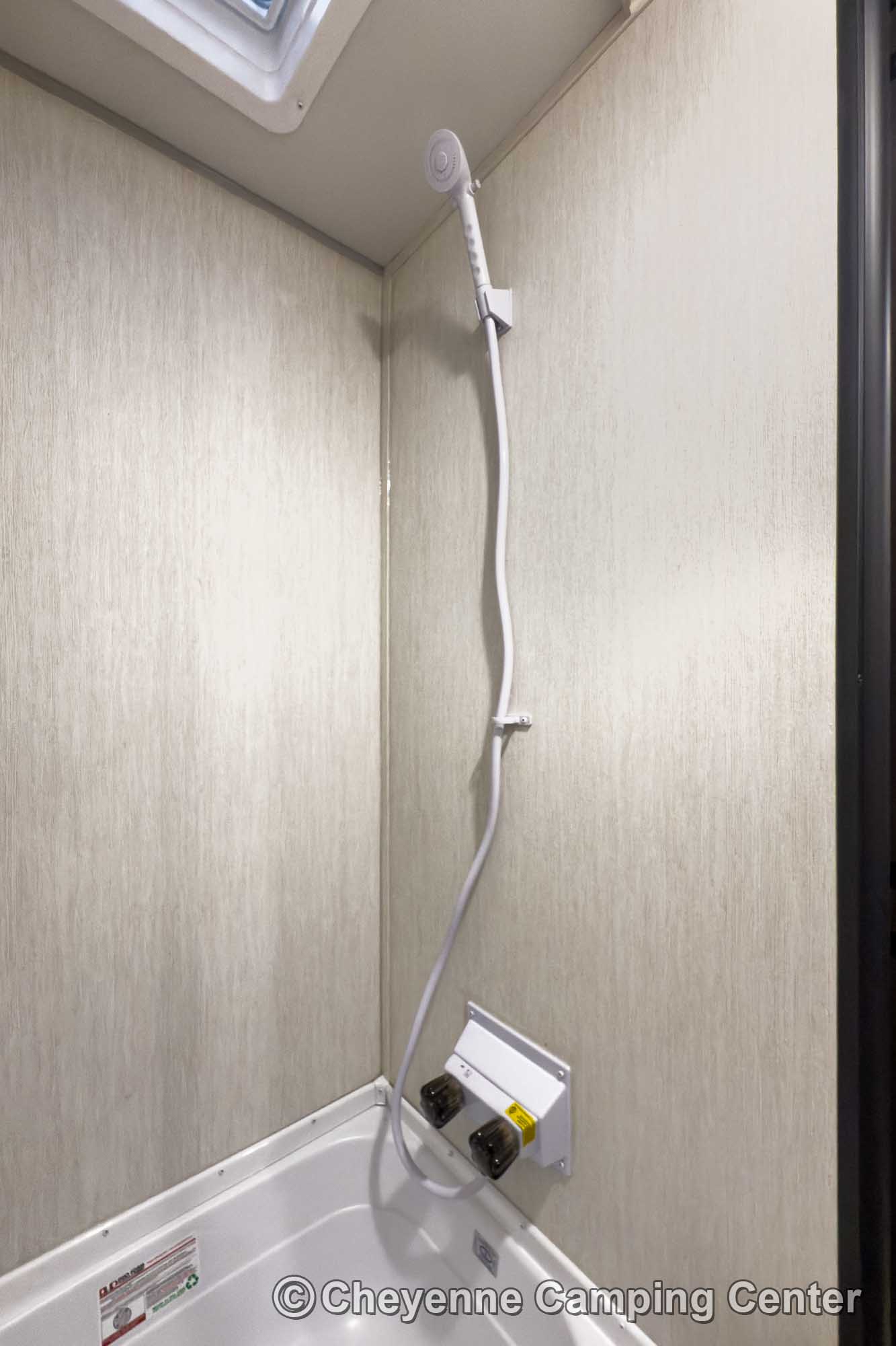 Inside, the well-planned layout features a front queen bed, a rear kitchen, and a convertible sofa. Ample storage is available throughout, including cabinets and easy-access compartments under the bed, perfect for organizing camping gear in storage tubs. The kitchen comes fully equipped with a 12V refrigerator, microwave, cooktop, stainless sink, and a residential-style faucet. The bathroom includes a shower and toilet for the privacy and convenience of home on the road.