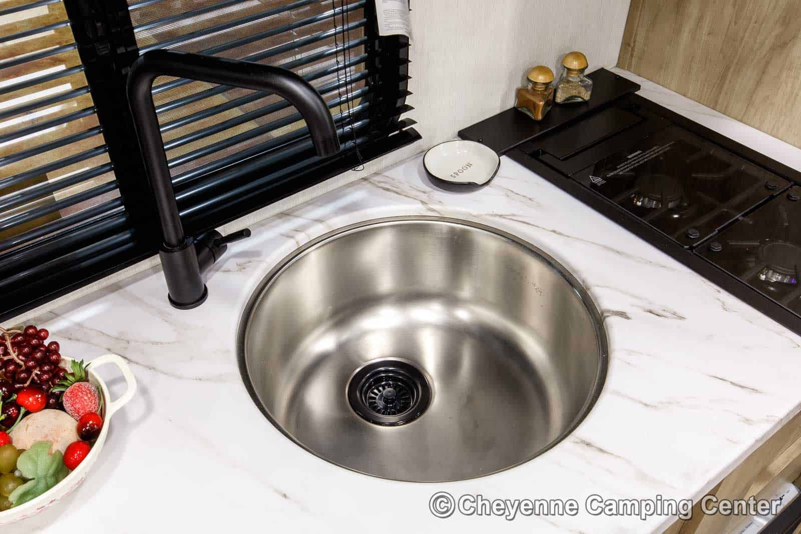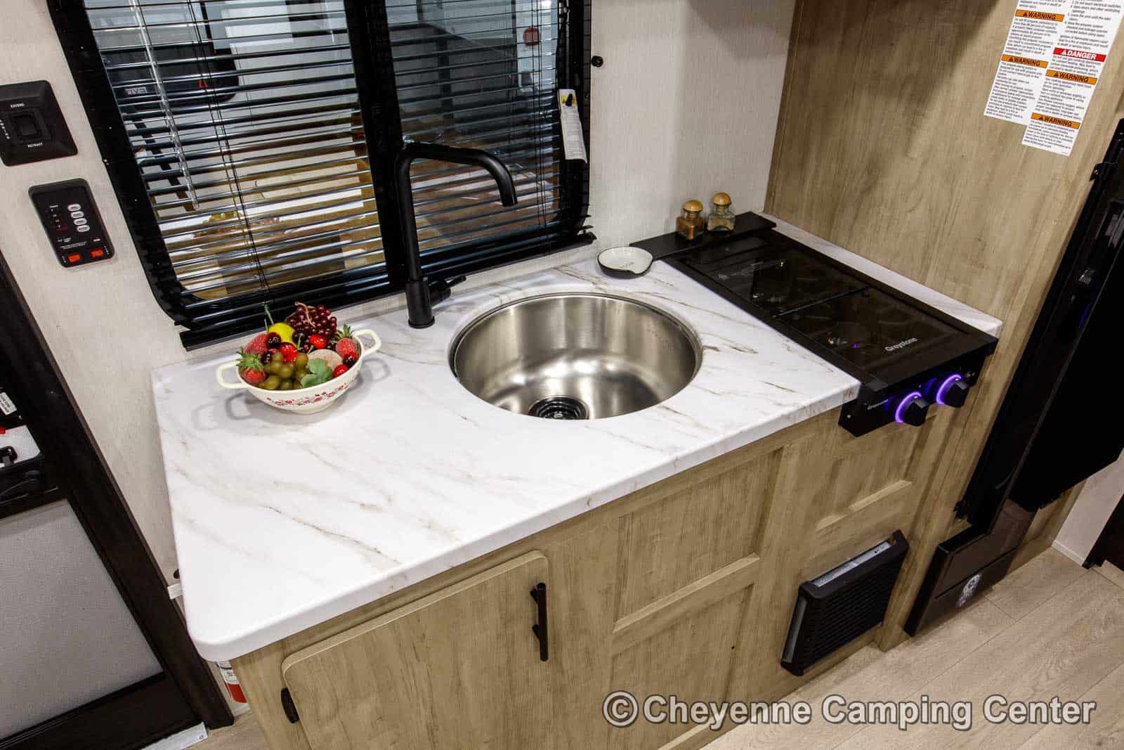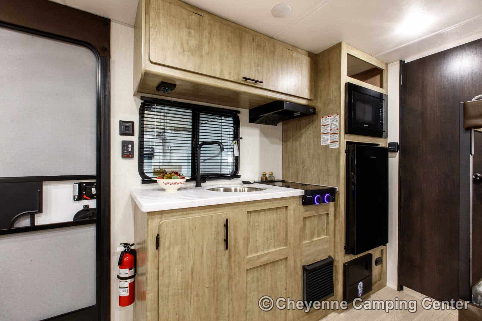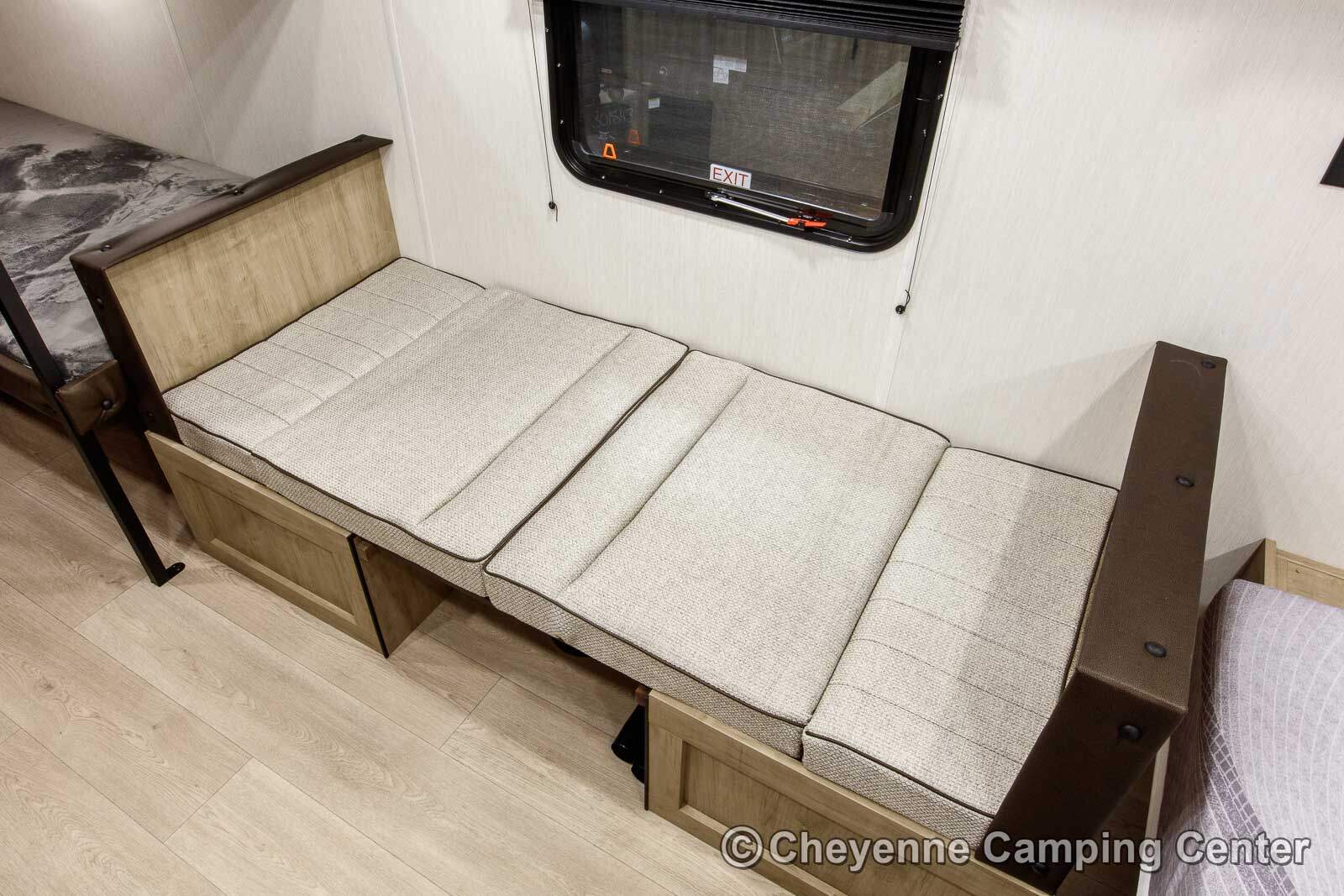 Inside, the well-planned layout features a front queen bed, rear bunk beds, and a convertible dinette, providing comfortable sleeping space for the whole family. Ample storage is available throughout, including cabinets and easy-access compartments under the bed and bunks, perfect for organizing camping gear in storage tubs. The kitchen comes fully equipped with a 12V refrigerator, microwave, cooktop, a round stainless sink, and a residential-style faucet. The bathroom includes a shower and toilet for the privacy and convenience of home on the road.