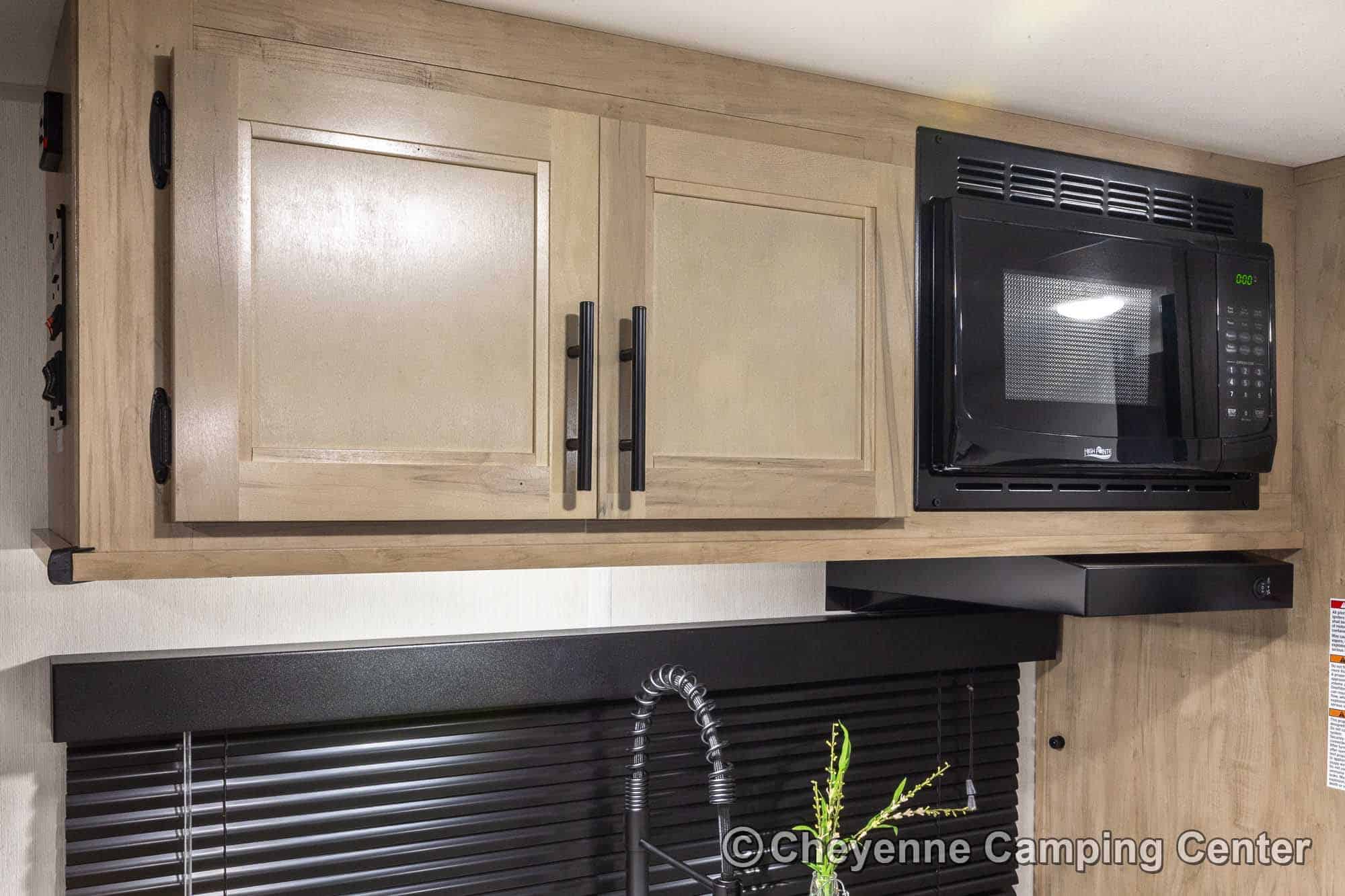 The Wolf Pup 16KHWBL has a full kitchen, including a spacious 10.6 cu. ft. 12V refrigerator, a cooktop, and a microwave that makes meal preparation a breeze. The convertible dinette offers extra sleeping space for a guest, while the front queen bed ensures a restful night under the stars.