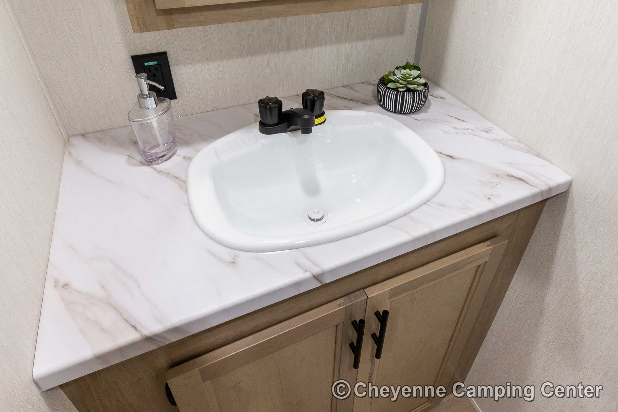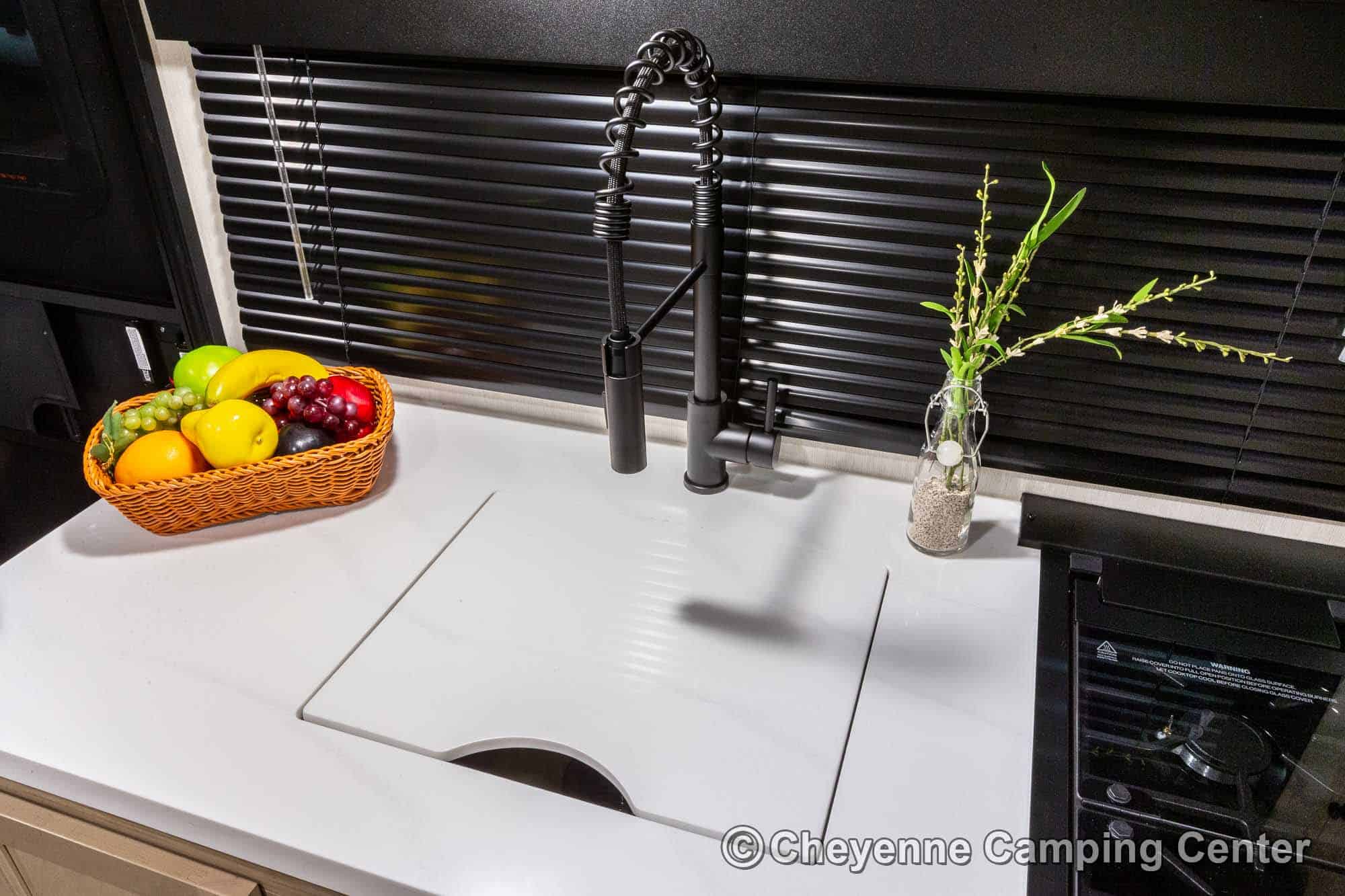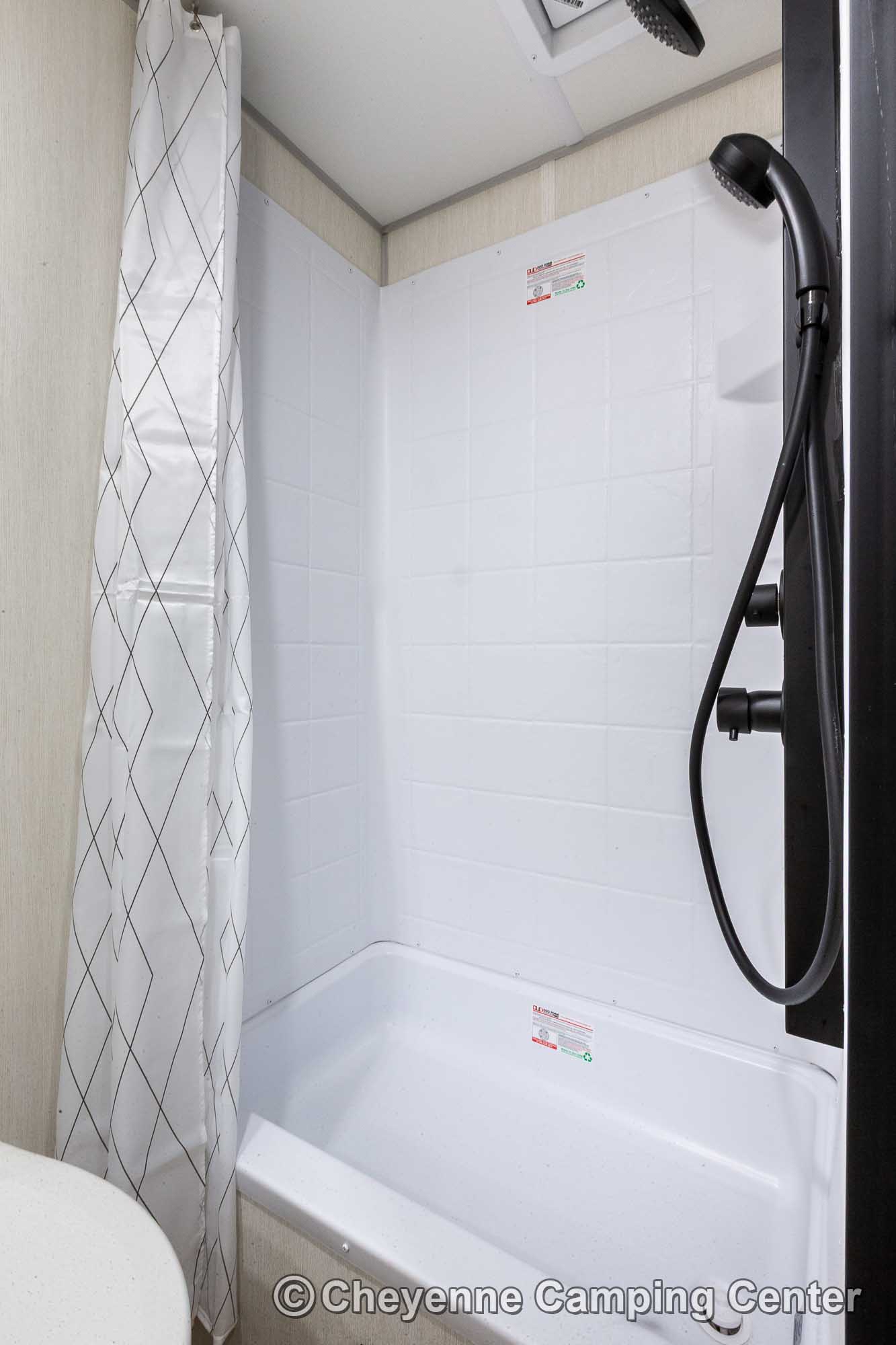 The Black Label Edition features premium fiberglass siding and frameless windows for a sleek look, while the Thermo Foil insulation keeps you cozy. The hands-free magnetic baggage door catch offers yet another level of convenience. Inside, enjoy solid surface countertops, a beautifully upgraded shower fixture, designer cushion fabric, and upgraded reading lights that enhance your camping experience.