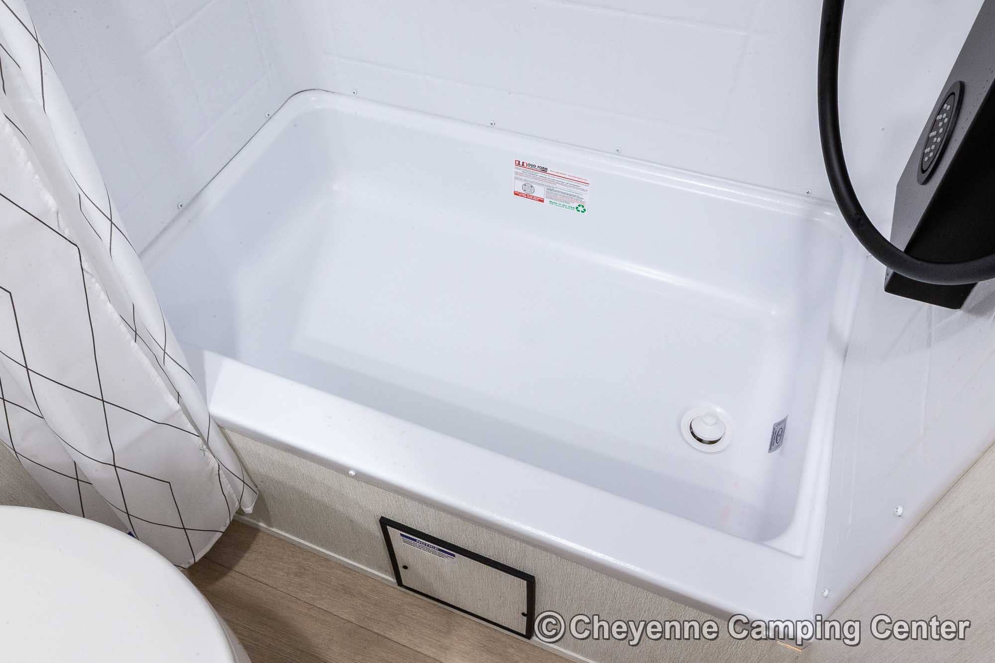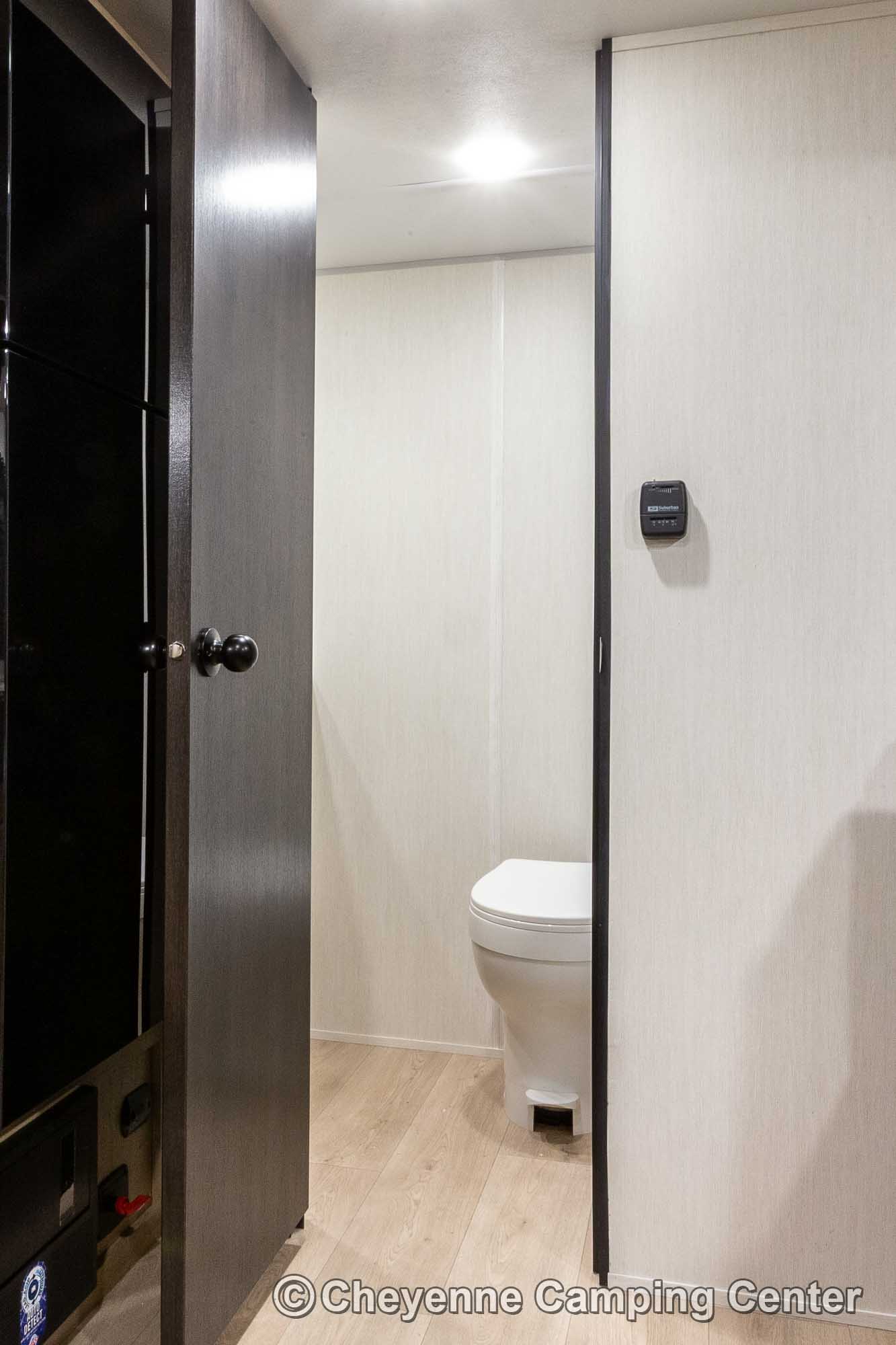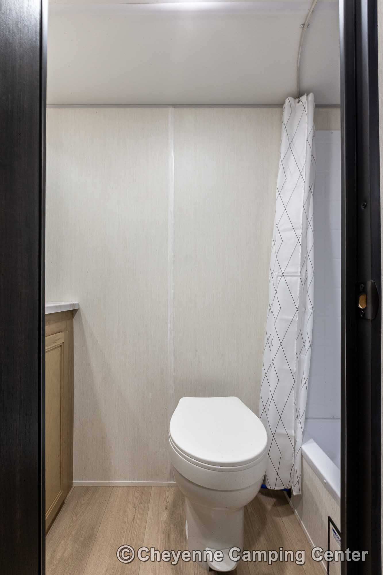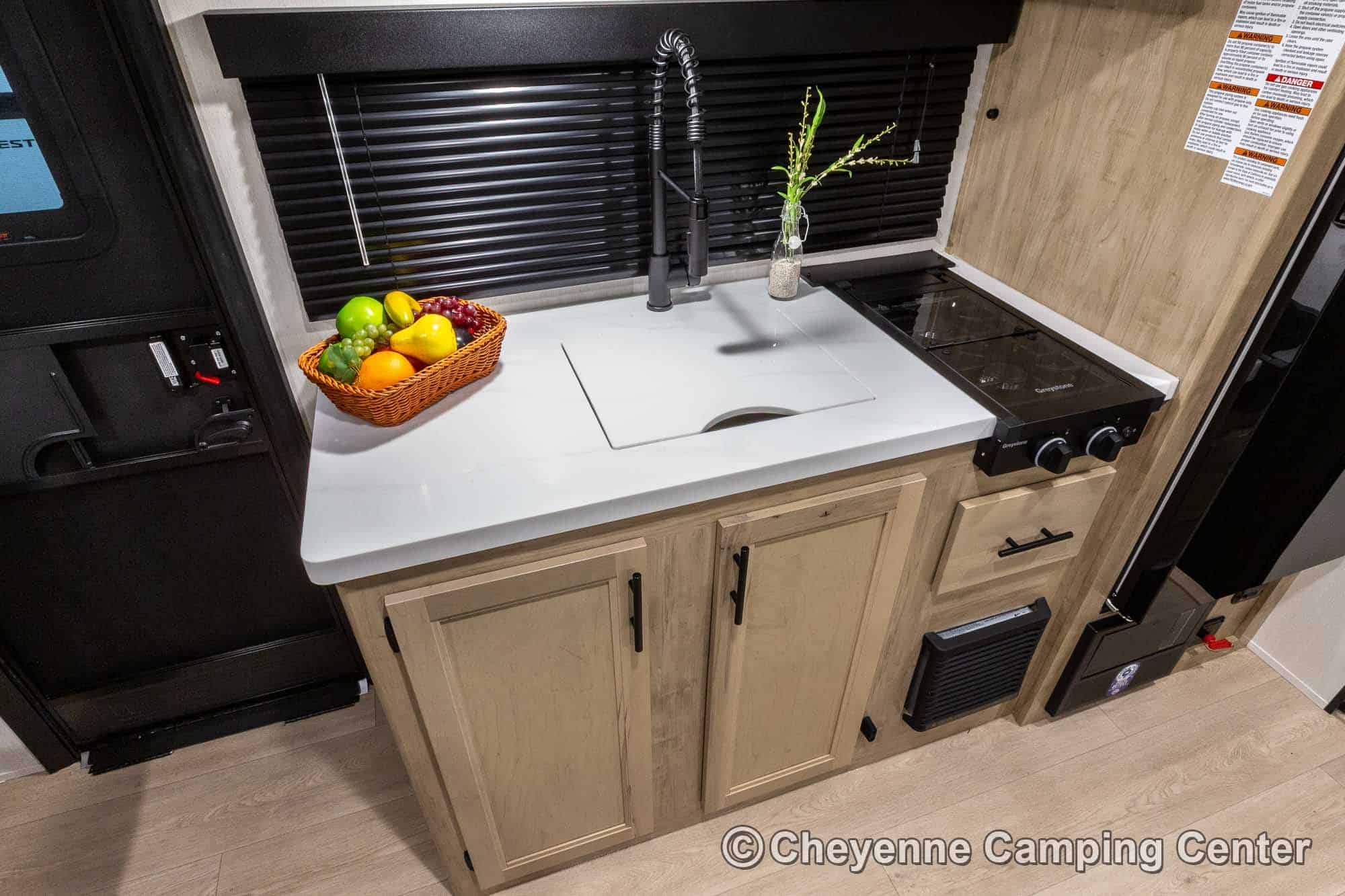 The Black Label Edition features premium fiberglass siding and frameless windows for a sleek look, while the Thermo Foil insulation keeps you cozy. The hands-free magnetic baggage door catch offers yet another level of convenience. Inside, enjoy solid surface countertops, a beautifully upgraded shower fixture, designer cushion fabric, and upgraded reading lights that enhance your camping experience.