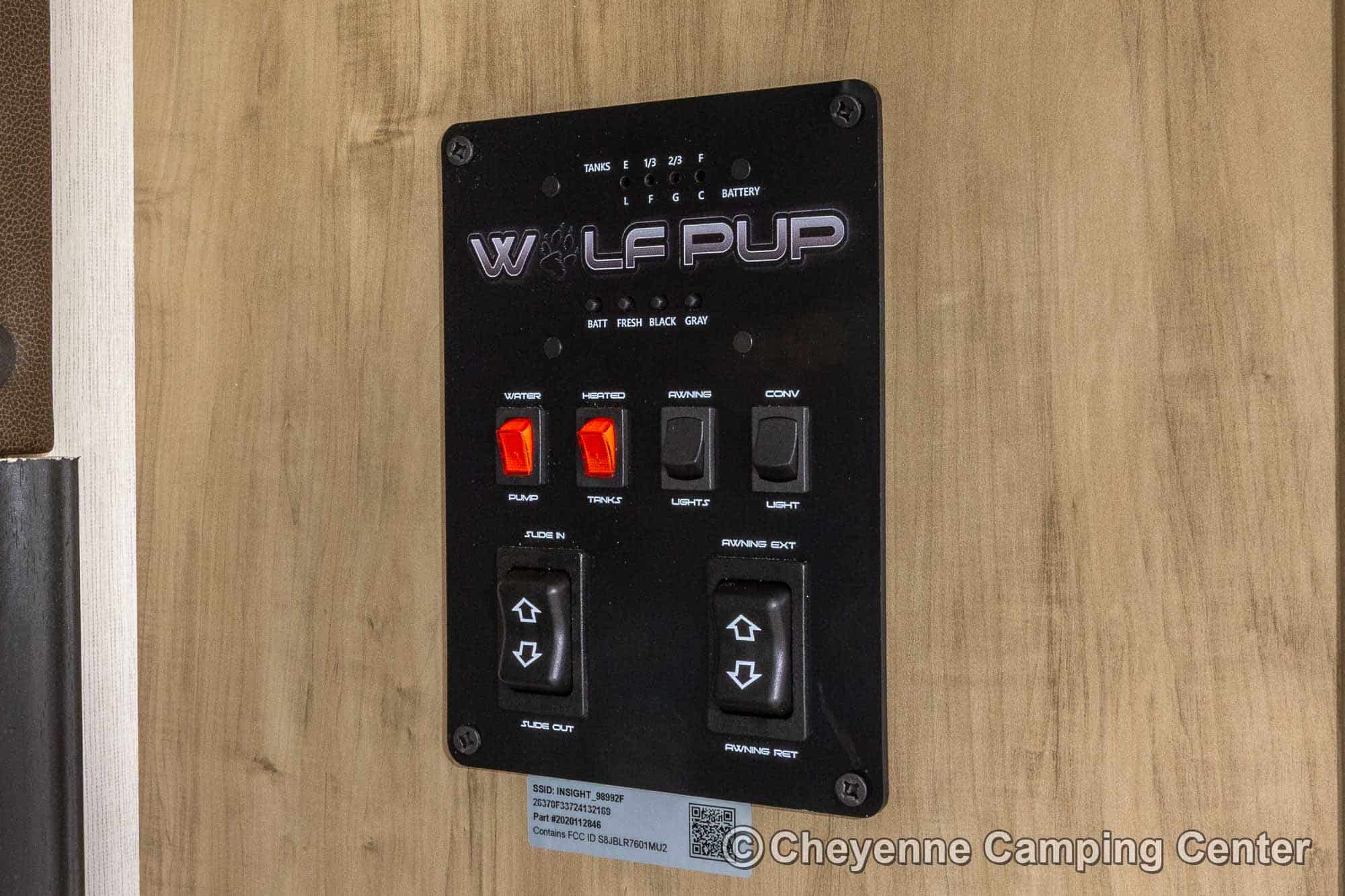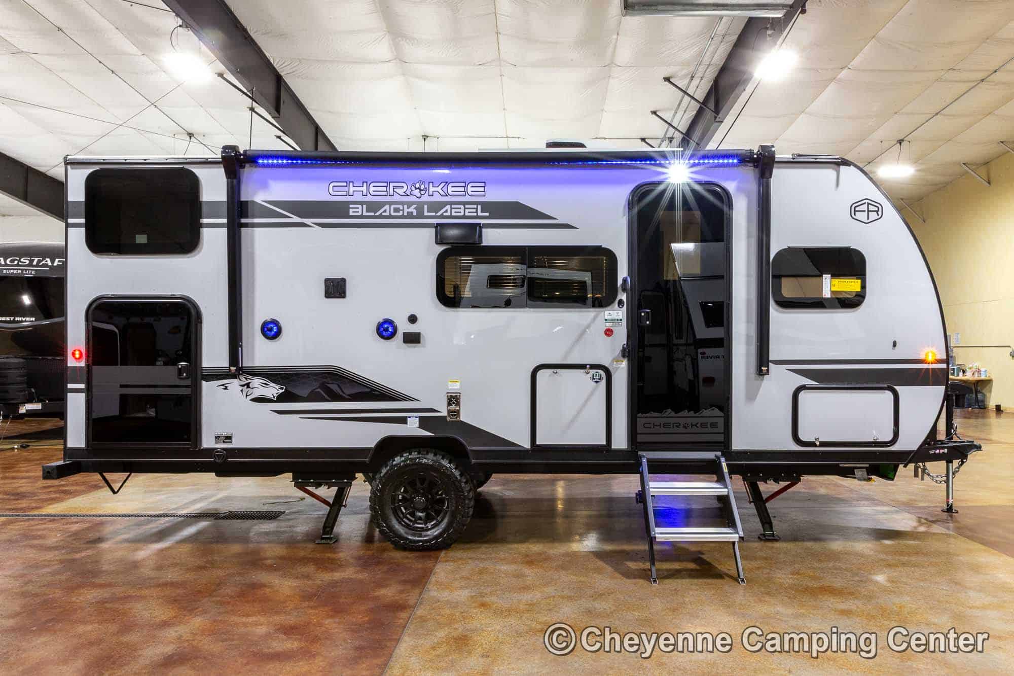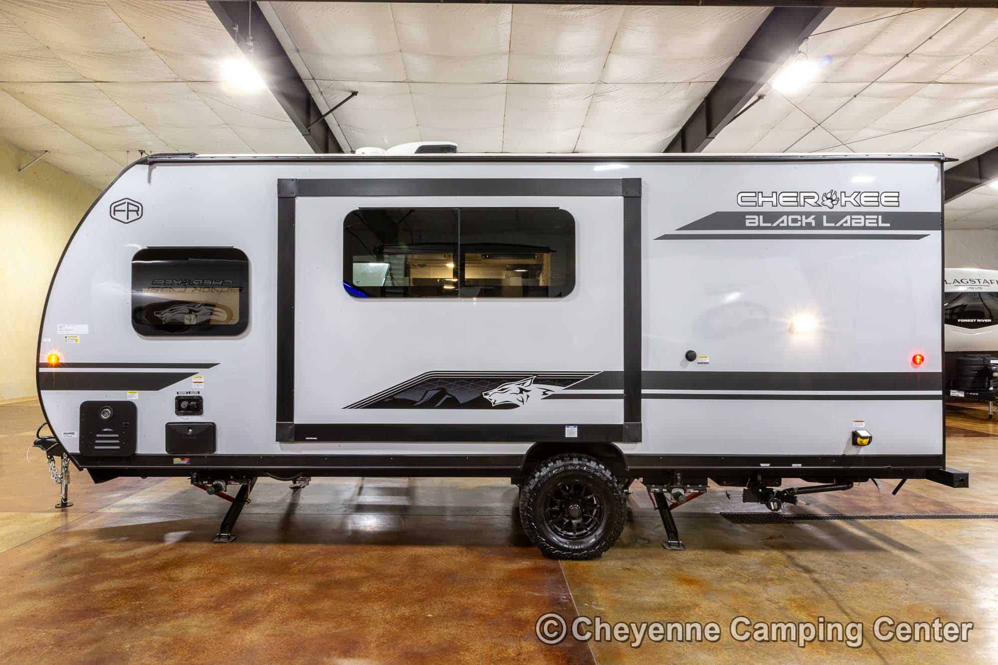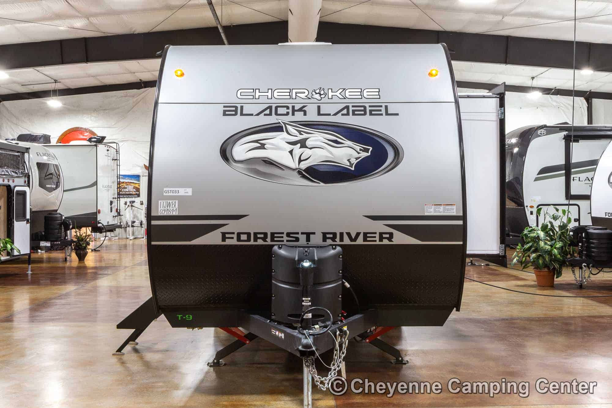 The 2026 Cherokee Wolf Pup Black Label 17JWBL bunkhouse travel trailer is a small family camper with big features! This upgraded model enhances the standard Wolf Pup 17JW with a gel coat fiberglass exterior, frameless windows, power tongue jack, solid-surface countertops, upgraded shower head, Thermo-Foil arctic insulation, and designer fabric!