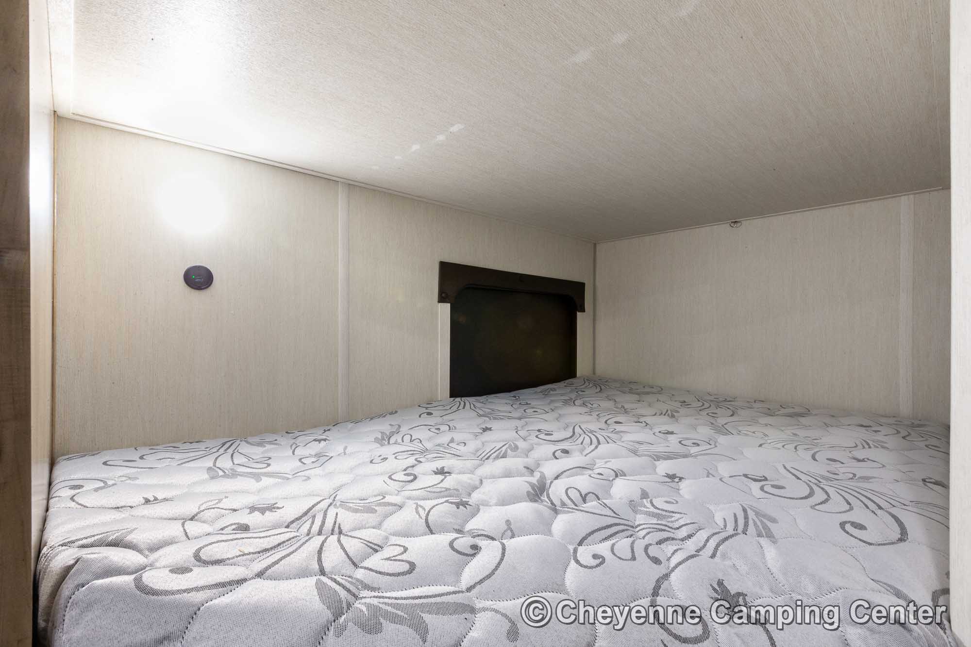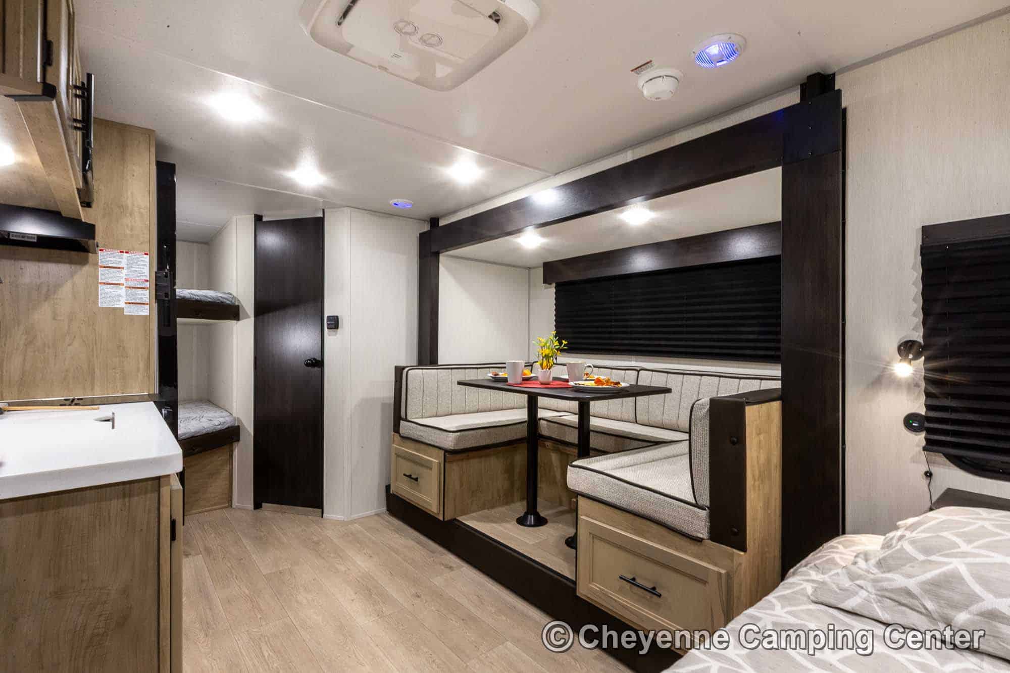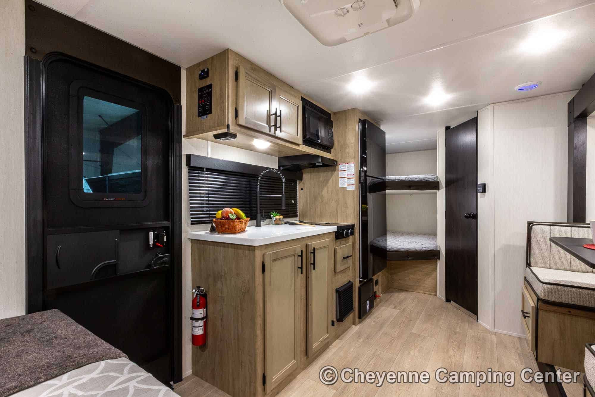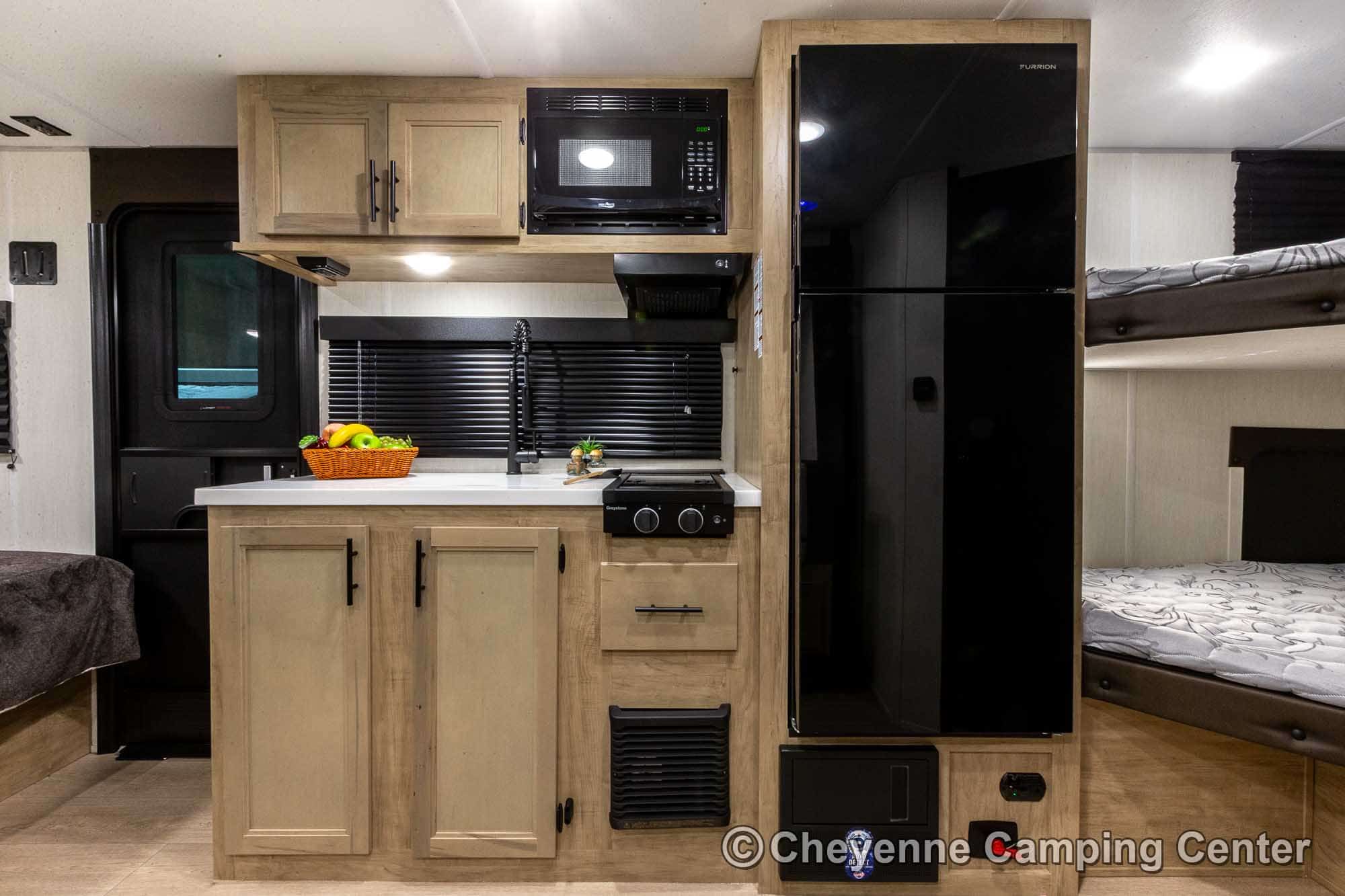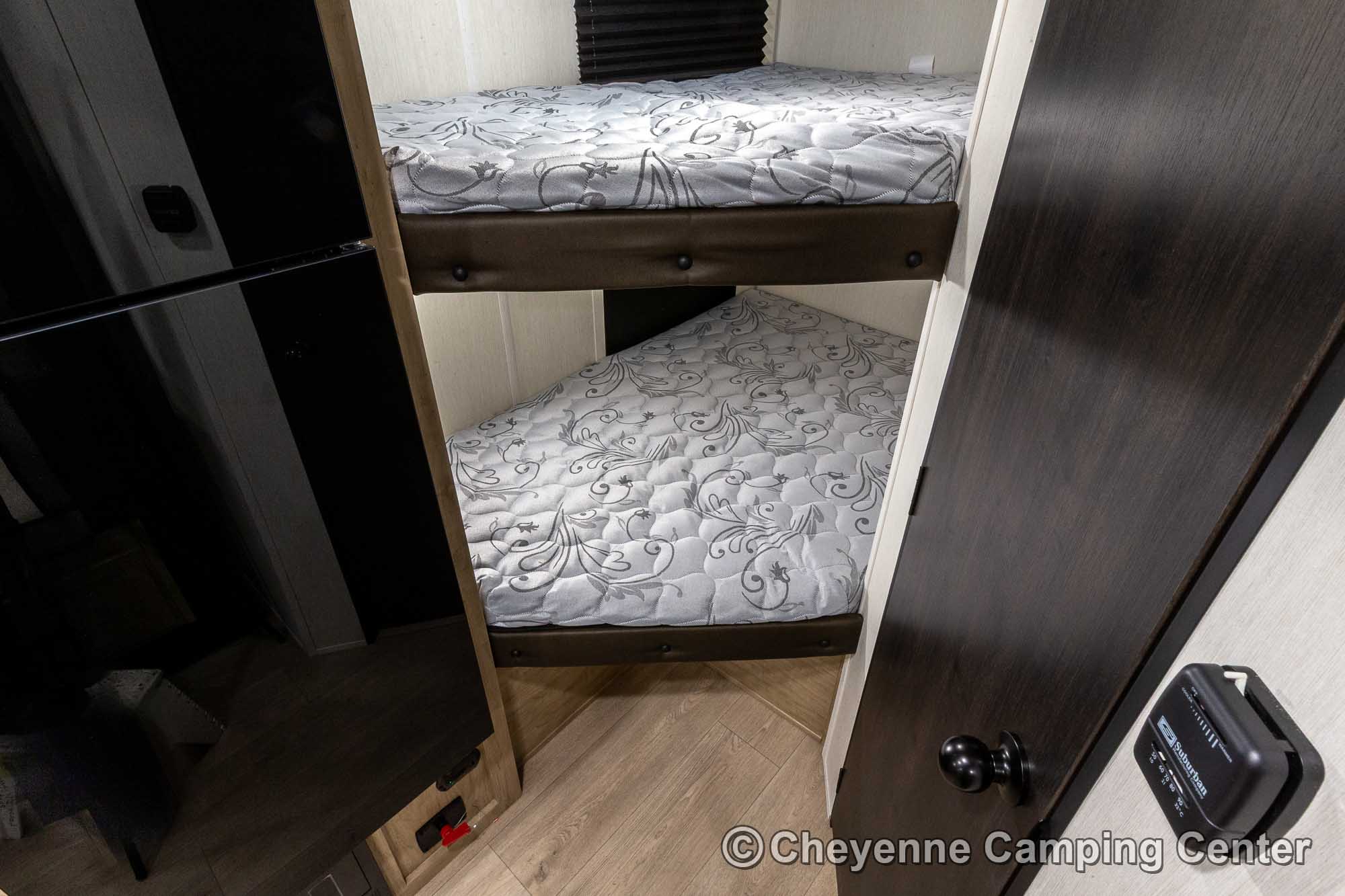 Lightweight, yet fully equipped, the 17JWBL sleeps five and offers abundant storage, including a large front compartment, rear door access to under-bunk/bike storage, and overhead cabinets. The 17JWBL features rear bunk beds with storage, a rear bath, mid-kitchen, a slide-out dinette, front queen bed, a Bluetooth media receiver, exterior marine grade speakers, an 8 cu. ft. refrigerator, outdoor shower, power stabilizer jacks, a roof-mounted RV air conditioner, an LP gas furnace, a 12′ power awning with LED lighting, an outdoor refrigerator, deluxe wheels, a wireless backup camera, black glass entry door, a 200 watt solar panel, solar charge controller, 12V RV battery, one-year manufacturer’s warranty, one-year complimentary 24/7 roadside assistance, and much more!