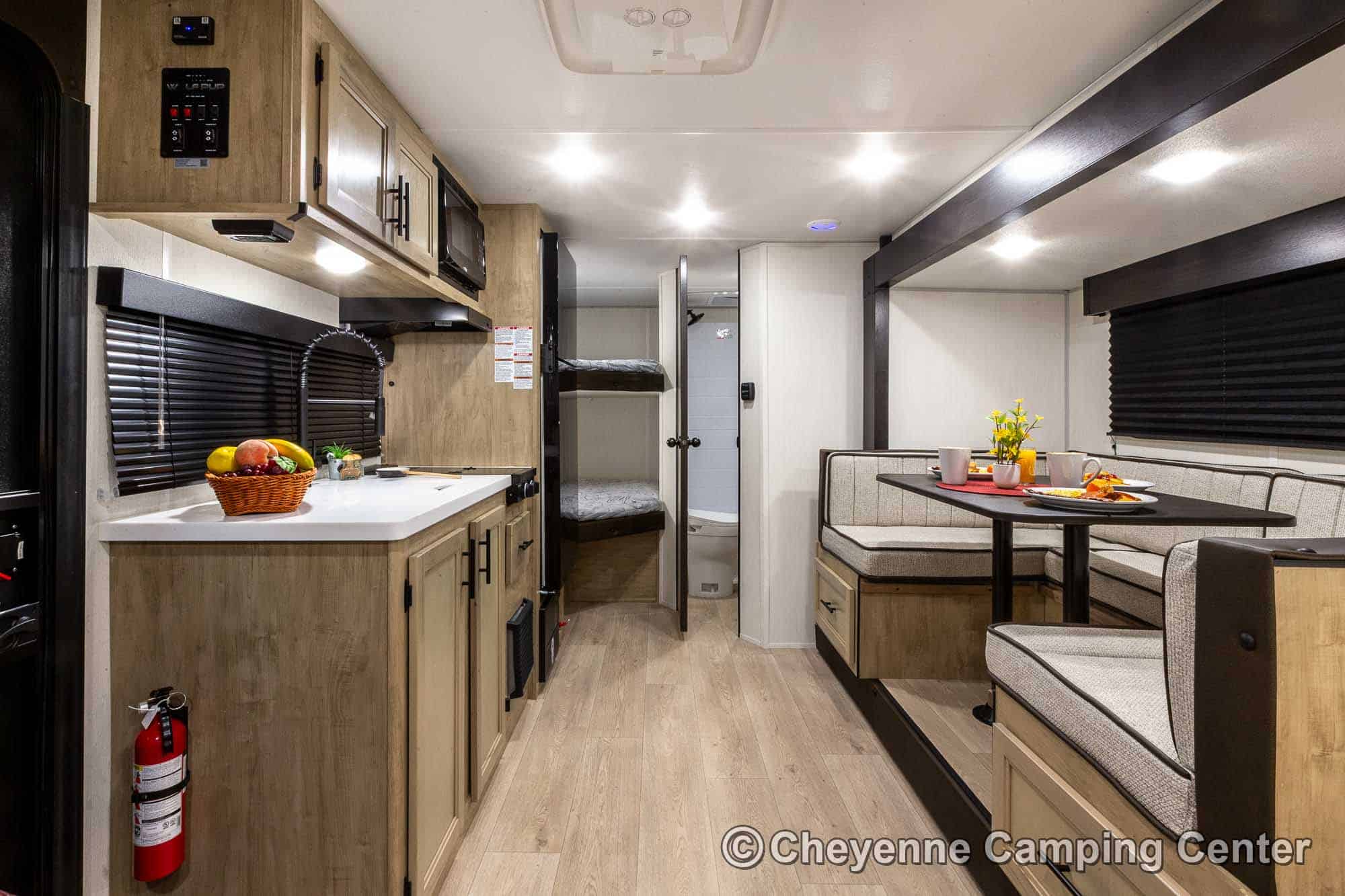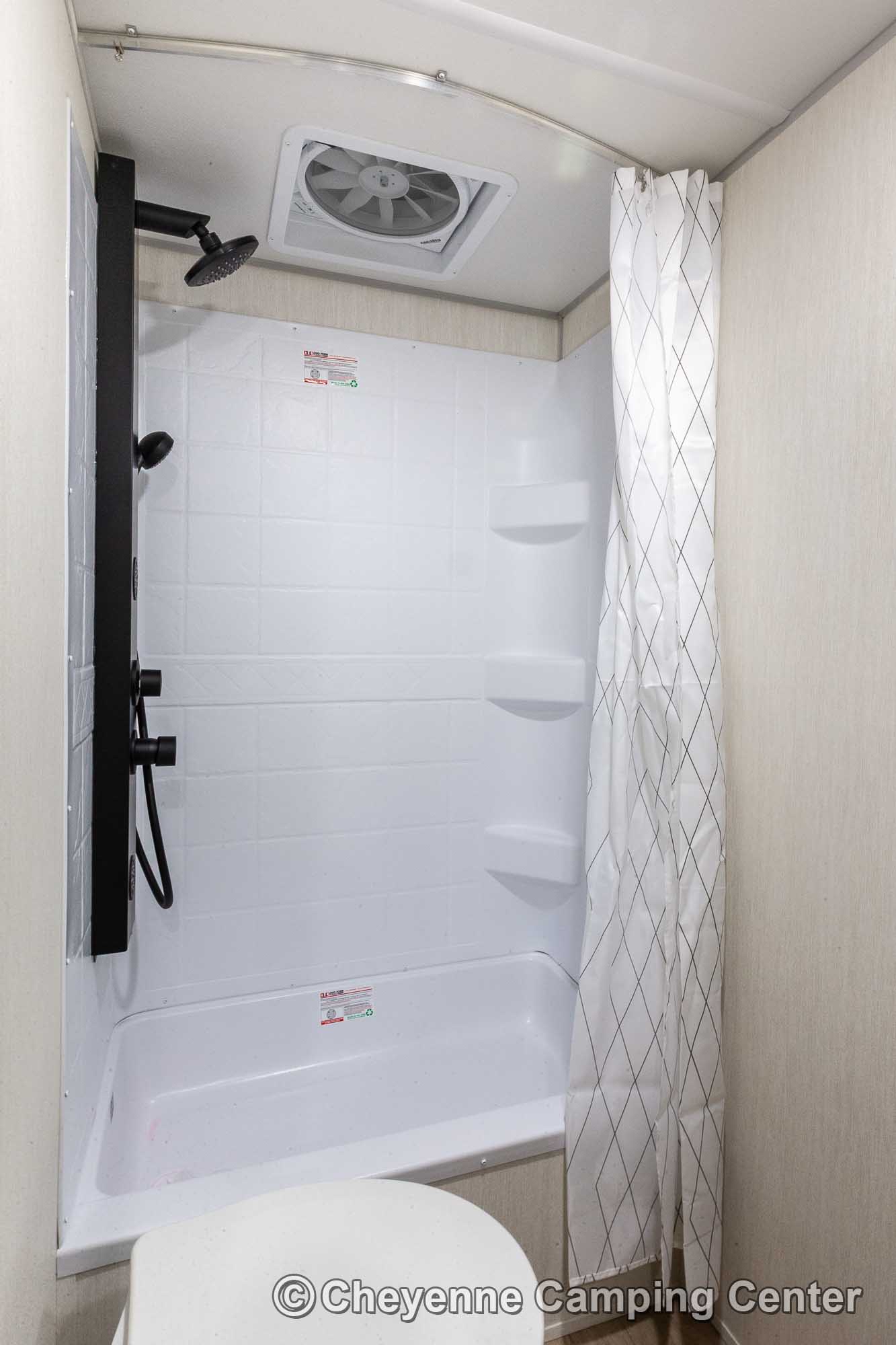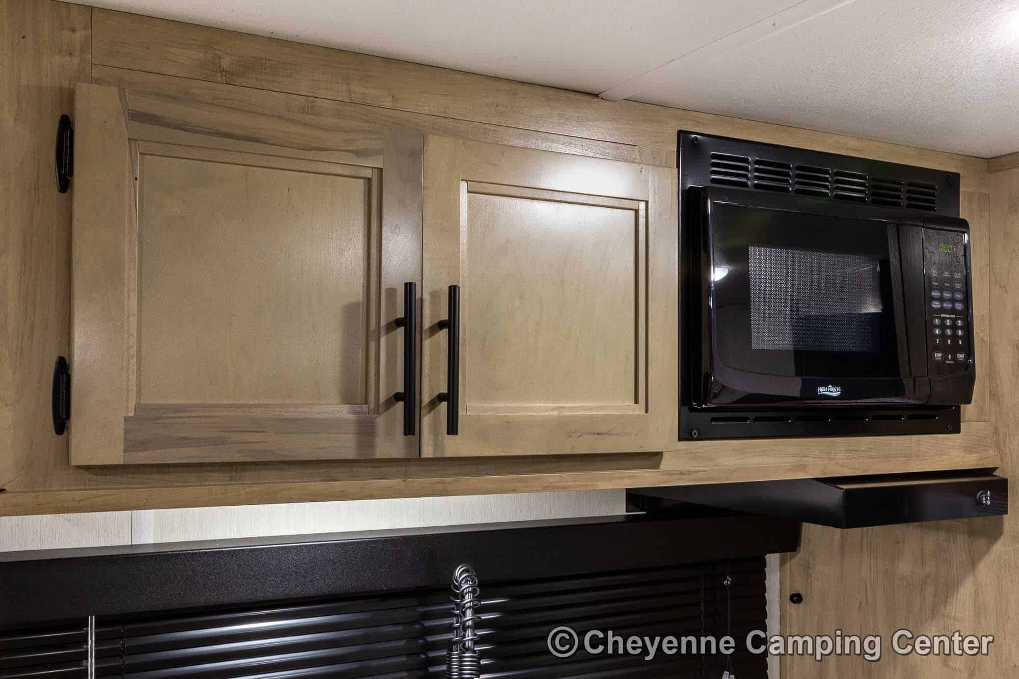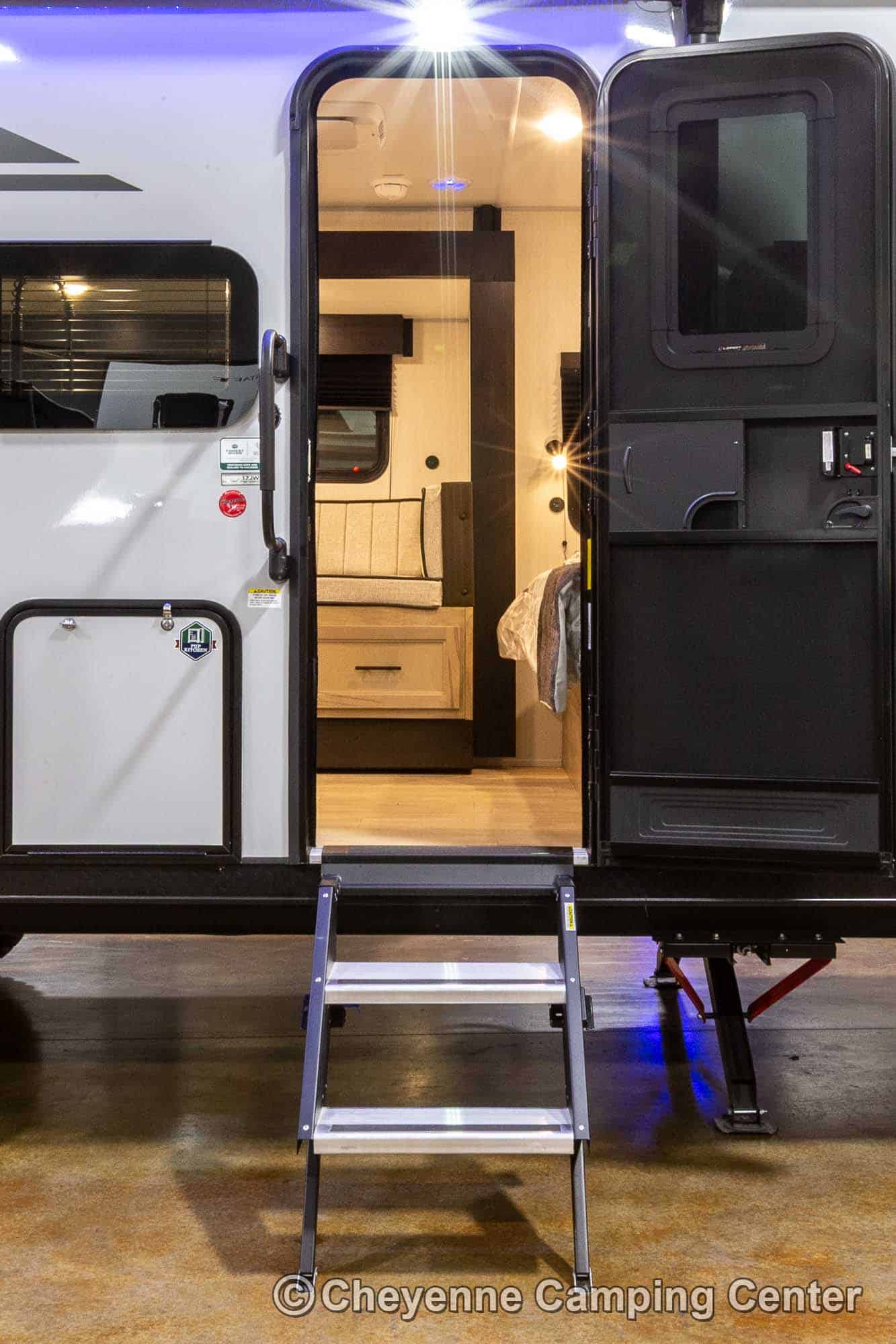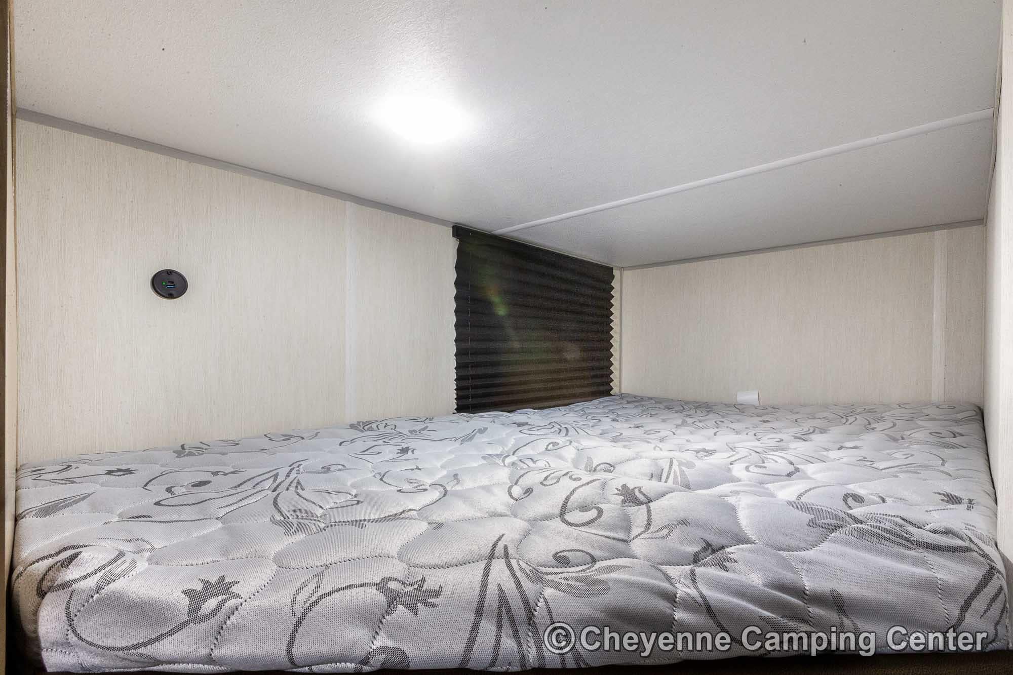 Lightweight, yet fully equipped, the 17JWBL sleeps five and offers abundant storage, including a large front compartment, rear door access to under-bunk/bike storage, and overhead cabinets. The 17JWBL features rear bunk beds with storage, a rear bath, mid-kitchen, a slide-out dinette, front queen bed, a Bluetooth media receiver, exterior marine grade speakers, an 8 cu. ft. refrigerator, outdoor shower, power stabilizer jacks, a roof-mounted RV air conditioner, an LP gas furnace, a 12′ power awning with LED lighting, an outdoor refrigerator, deluxe wheels, a wireless backup camera, black glass entry door, a 200 watt solar panel, solar charge controller, 12V RV battery, one-year manufacturer’s warranty, one-year complimentary 24/7 roadside assistance, and much more!