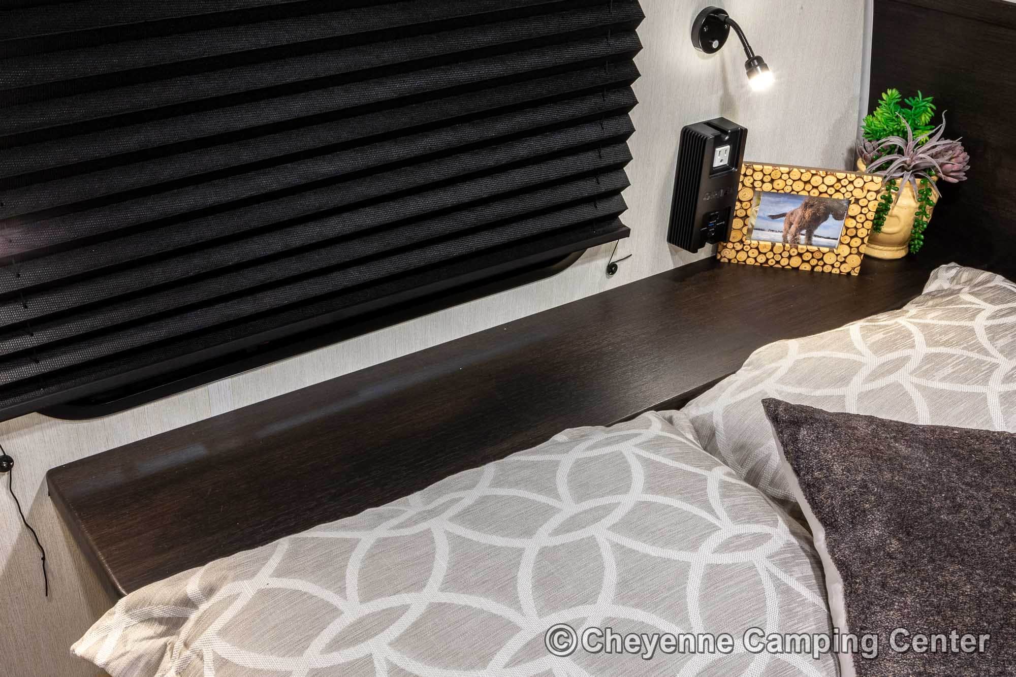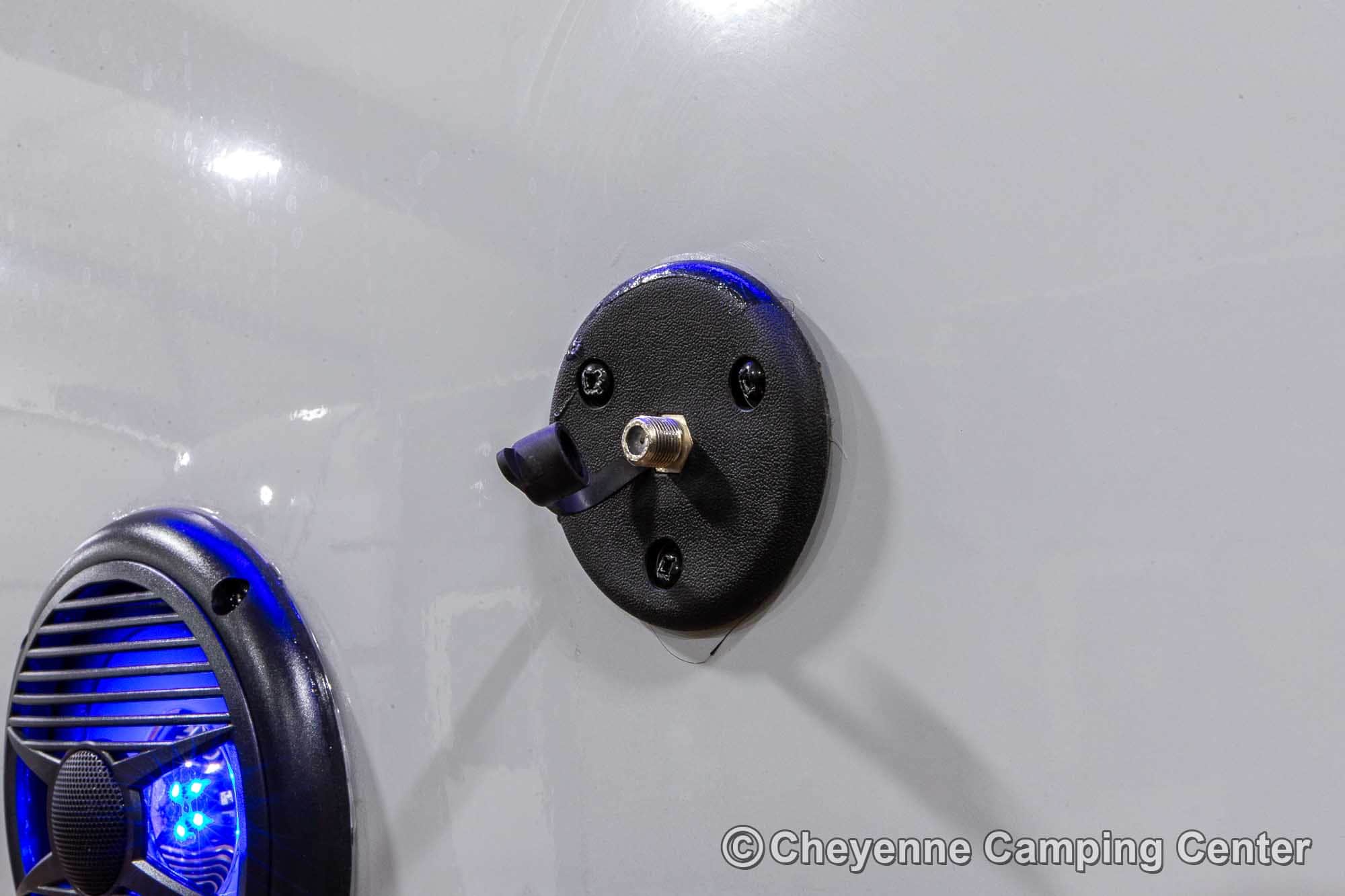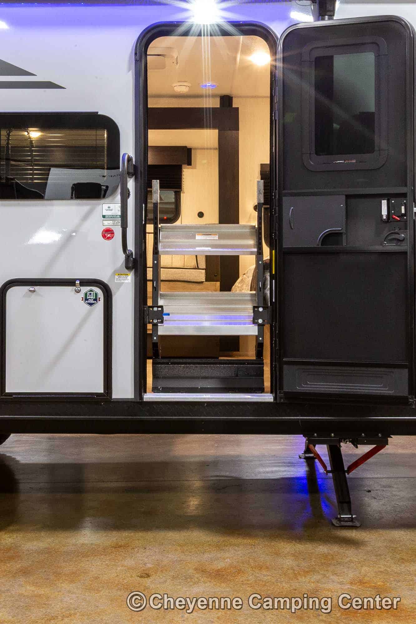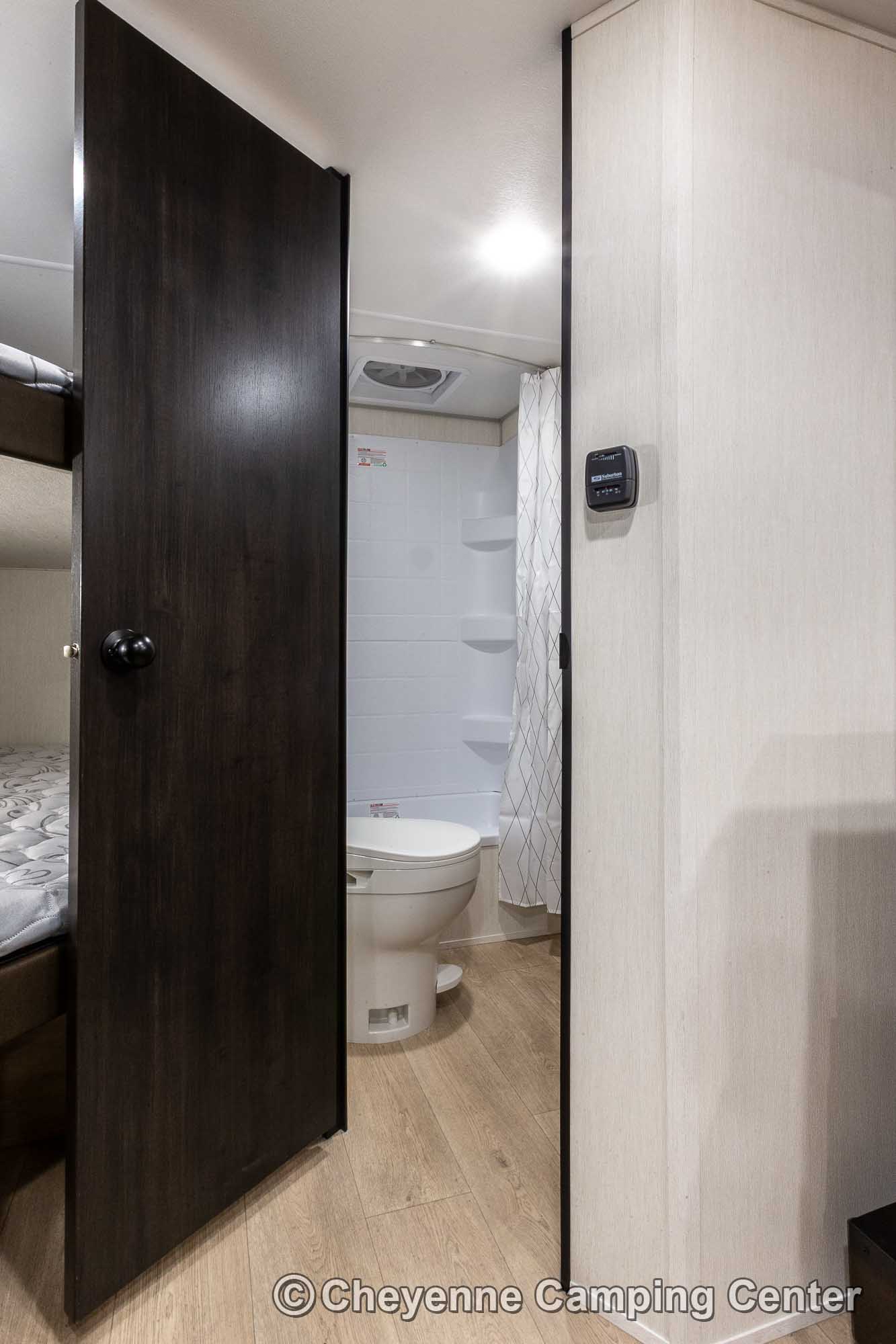 Lightweight, yet fully equipped, the 17JWBL sleeps five and offers abundant storage, including a large front compartment, rear door access to under-bunk/bike storage, and overhead cabinets. The 17JWBL features rear bunk beds with storage, a rear bath, mid-kitchen, a slide-out dinette, front queen bed, a Bluetooth media receiver, exterior marine grade speakers, an 8 cu. ft. refrigerator, outdoor shower, power stabilizer jacks, a roof-mounted RV air conditioner, an LP gas furnace, a 12′ power awning with LED lighting, an outdoor refrigerator, deluxe wheels, a wireless backup camera, black glass entry door, a 200 watt solar panel, solar charge controller, 12V RV battery, one-year manufacturer’s warranty, one-year complimentary 24/7 roadside assistance, and much more!