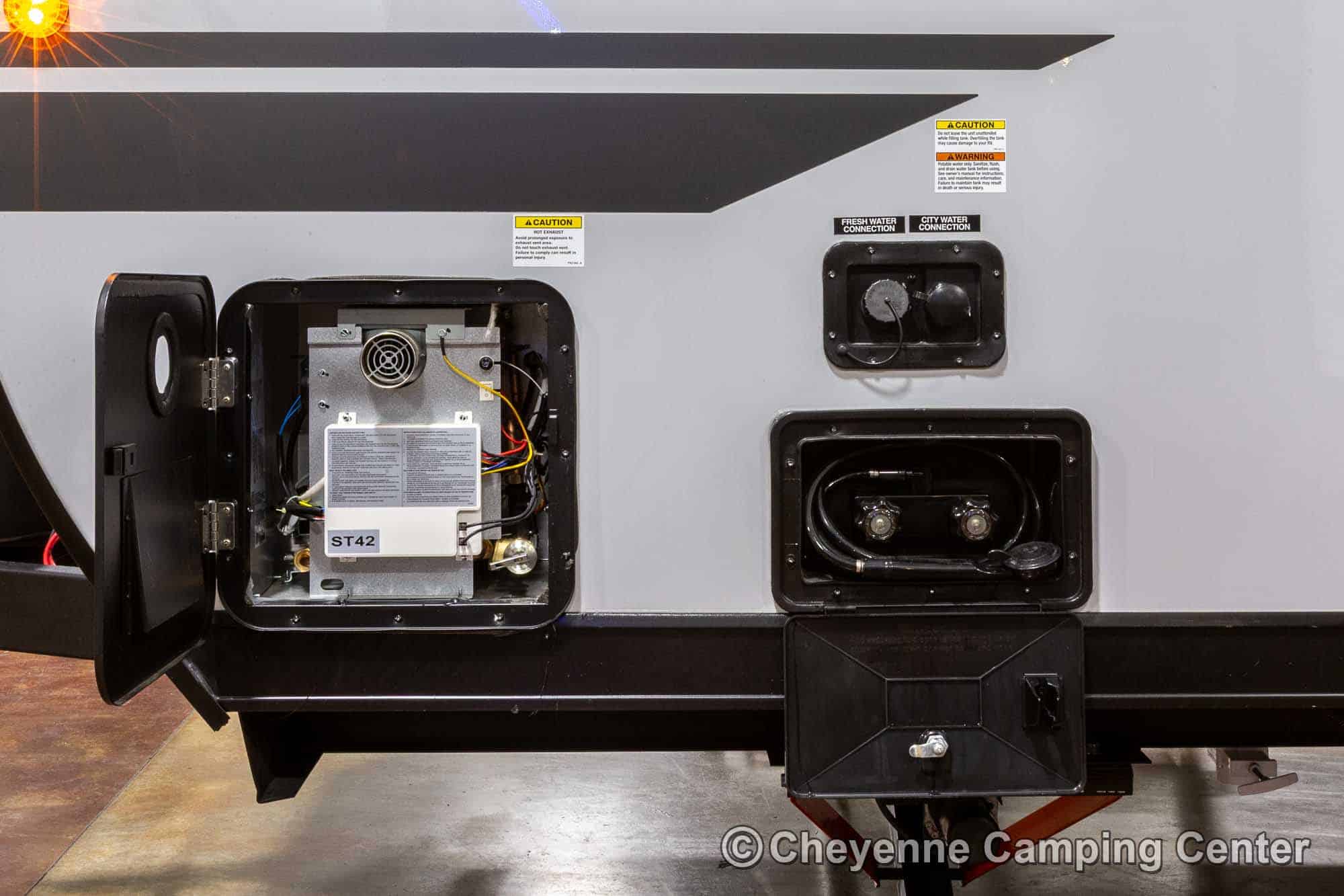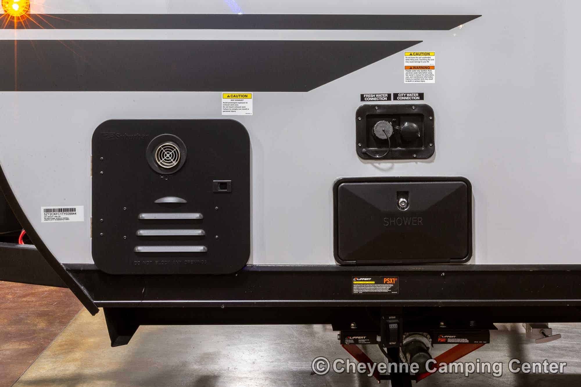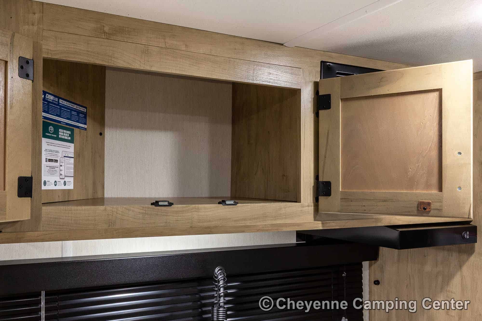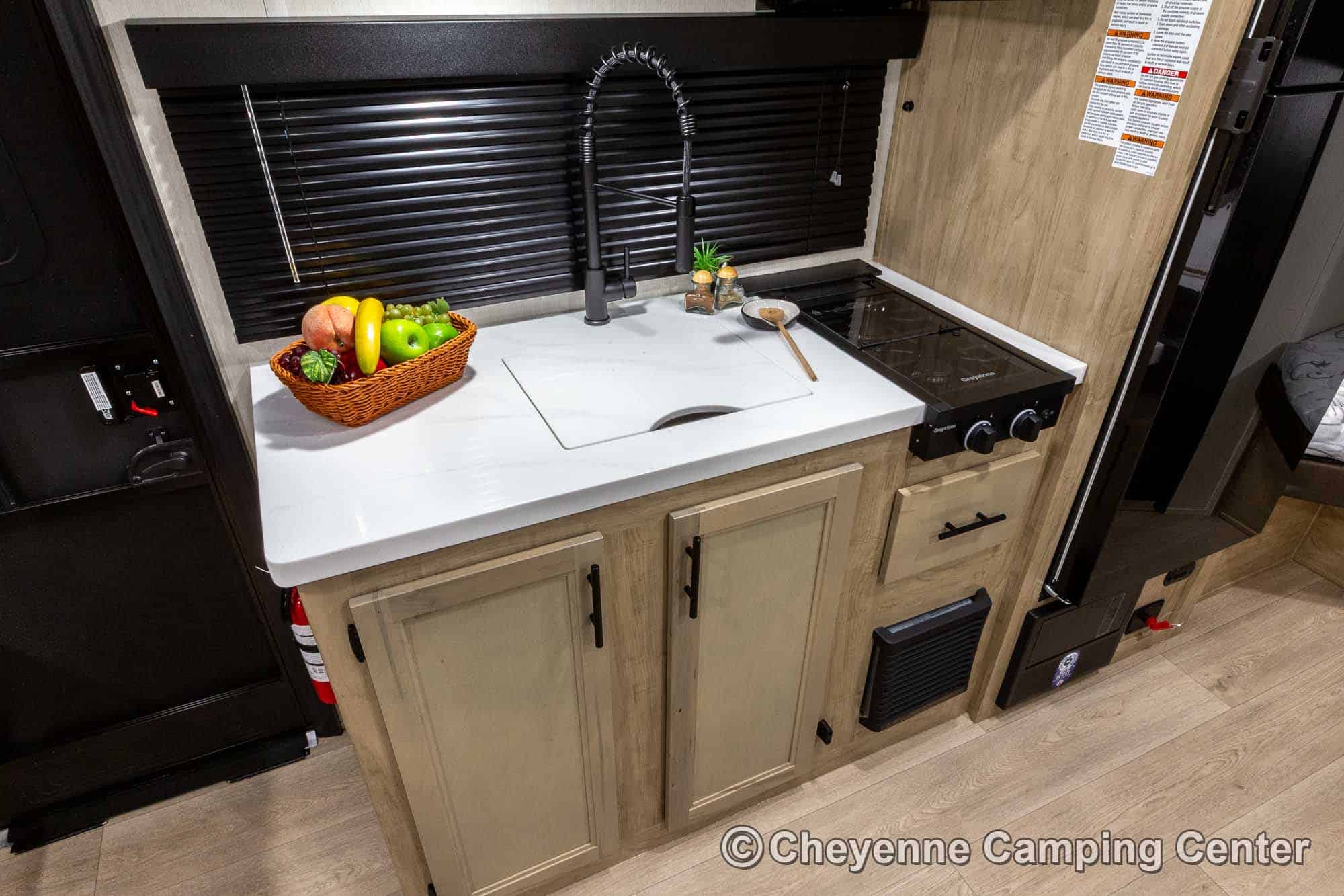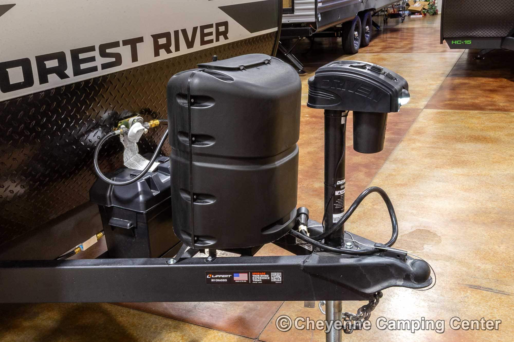 Lightweight, yet fully equipped, the 17JWBL sleeps five and offers abundant storage, including a large front compartment, rear door access to under-bunk/bike storage, and overhead cabinets. The 17JWBL features rear bunk beds with storage, a rear bath, mid-kitchen, a slide-out dinette, front queen bed, a Bluetooth media receiver, exterior marine grade speakers, an 8 cu. ft. refrigerator, outdoor shower, power stabilizer jacks, a roof-mounted RV air conditioner, an LP gas furnace, a 12′ power awning with LED lighting, an outdoor refrigerator, deluxe wheels, a wireless backup camera, black glass entry door, a 200 watt solar panel, solar charge controller, 12V RV battery, one-year manufacturer’s warranty, one-year complimentary 24/7 roadside assistance, and much more!