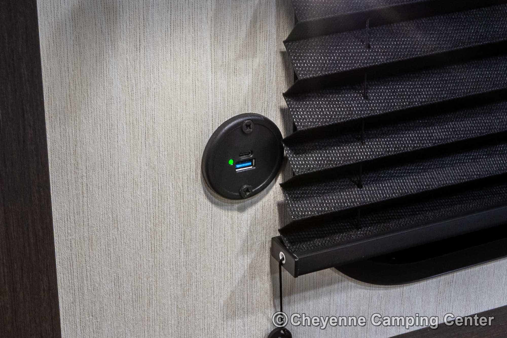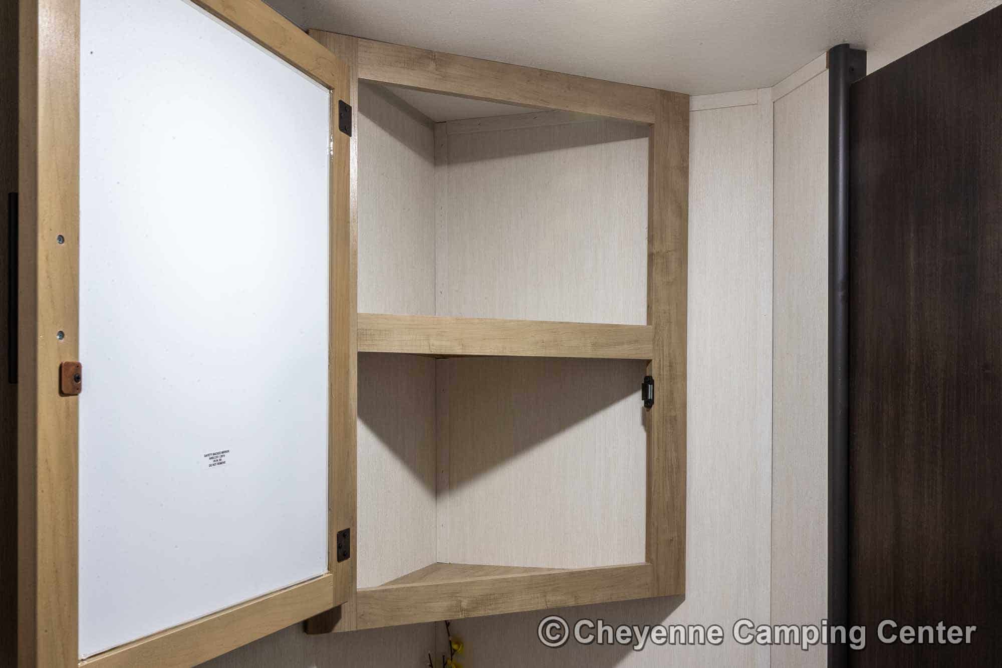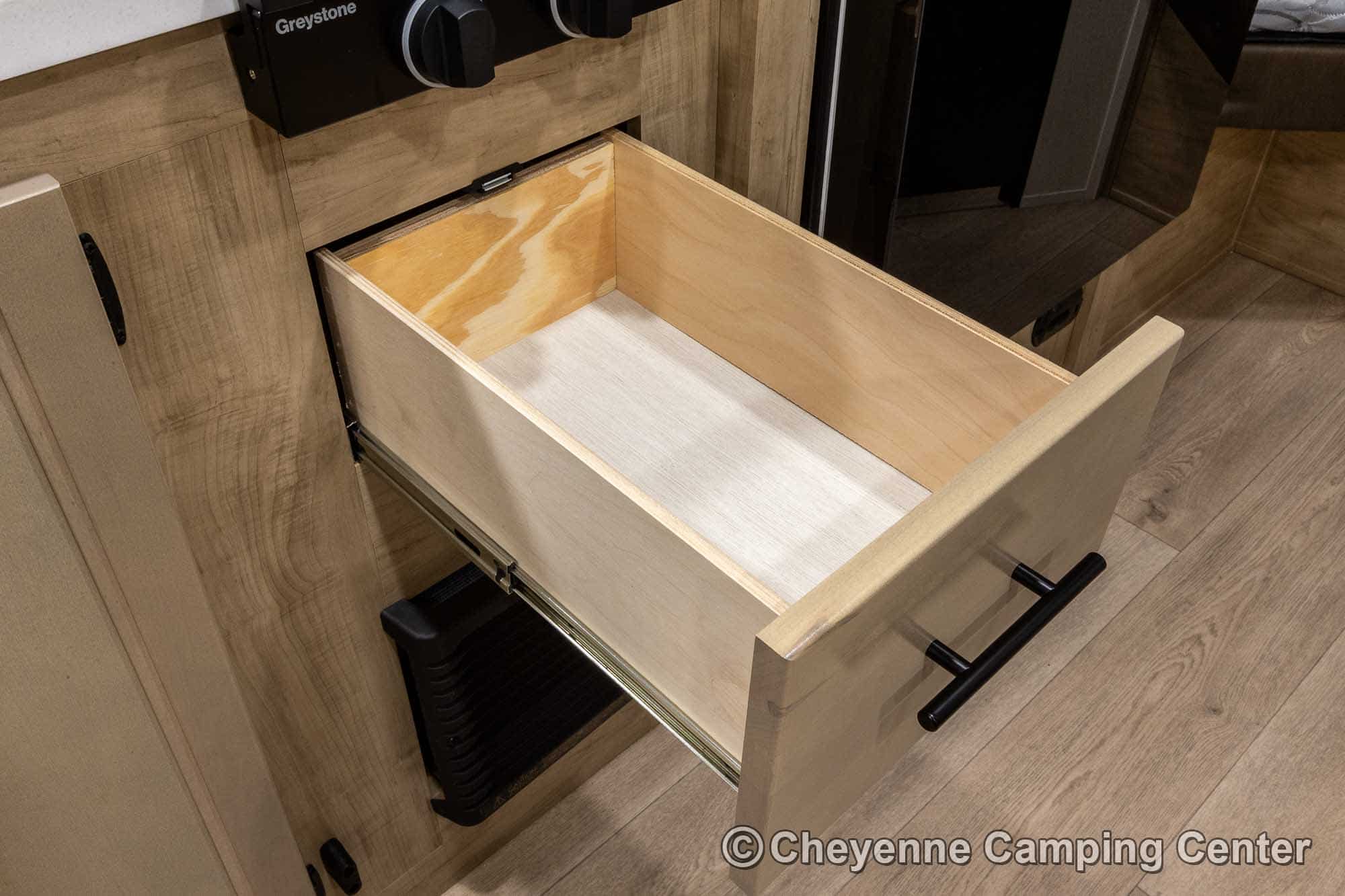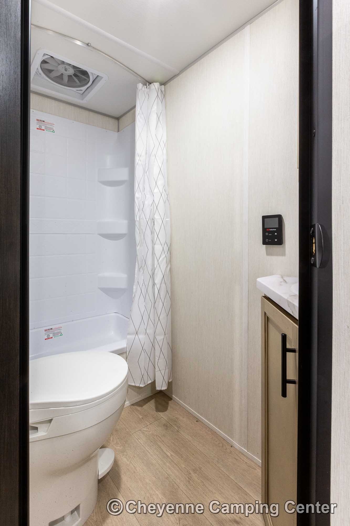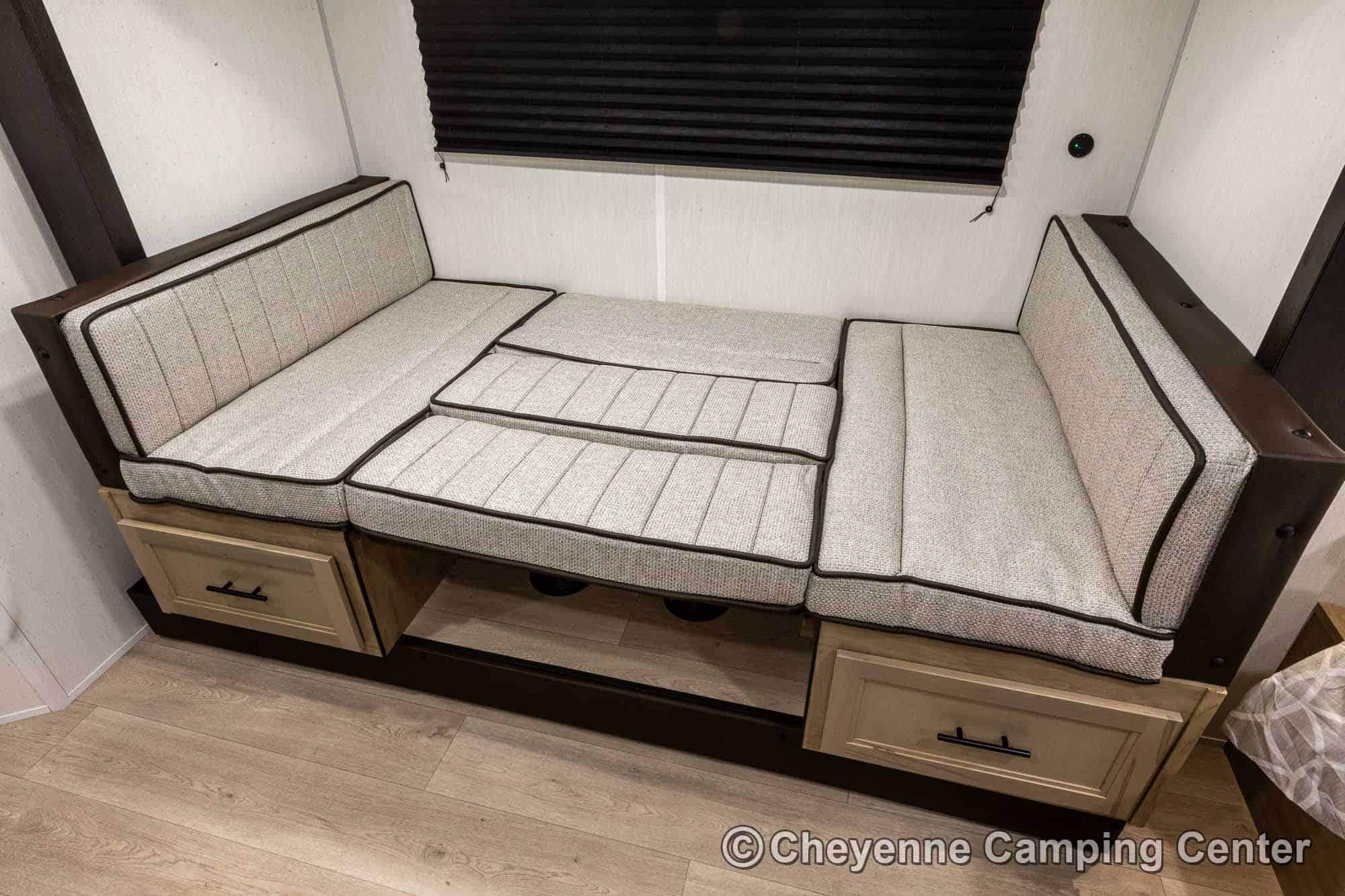 Lightweight, yet fully equipped, the 17JWBL sleeps five and offers abundant storage, including a large front compartment, rear door access to under-bunk/bike storage, and overhead cabinets. The 17JWBL features rear bunk beds with storage, a rear bath, mid-kitchen, a slide-out dinette, front queen bed, a Bluetooth media receiver, exterior marine grade speakers, an 8 cu. ft. refrigerator, outdoor shower, power stabilizer jacks, a roof-mounted RV air conditioner, an LP gas furnace, a 12′ power awning with LED lighting, an outdoor refrigerator, deluxe wheels, a wireless backup camera, black glass entry door, a 200 watt solar panel, solar charge controller, 12V RV battery, one-year manufacturer’s warranty, one-year complimentary 24/7 roadside assistance, and much more!